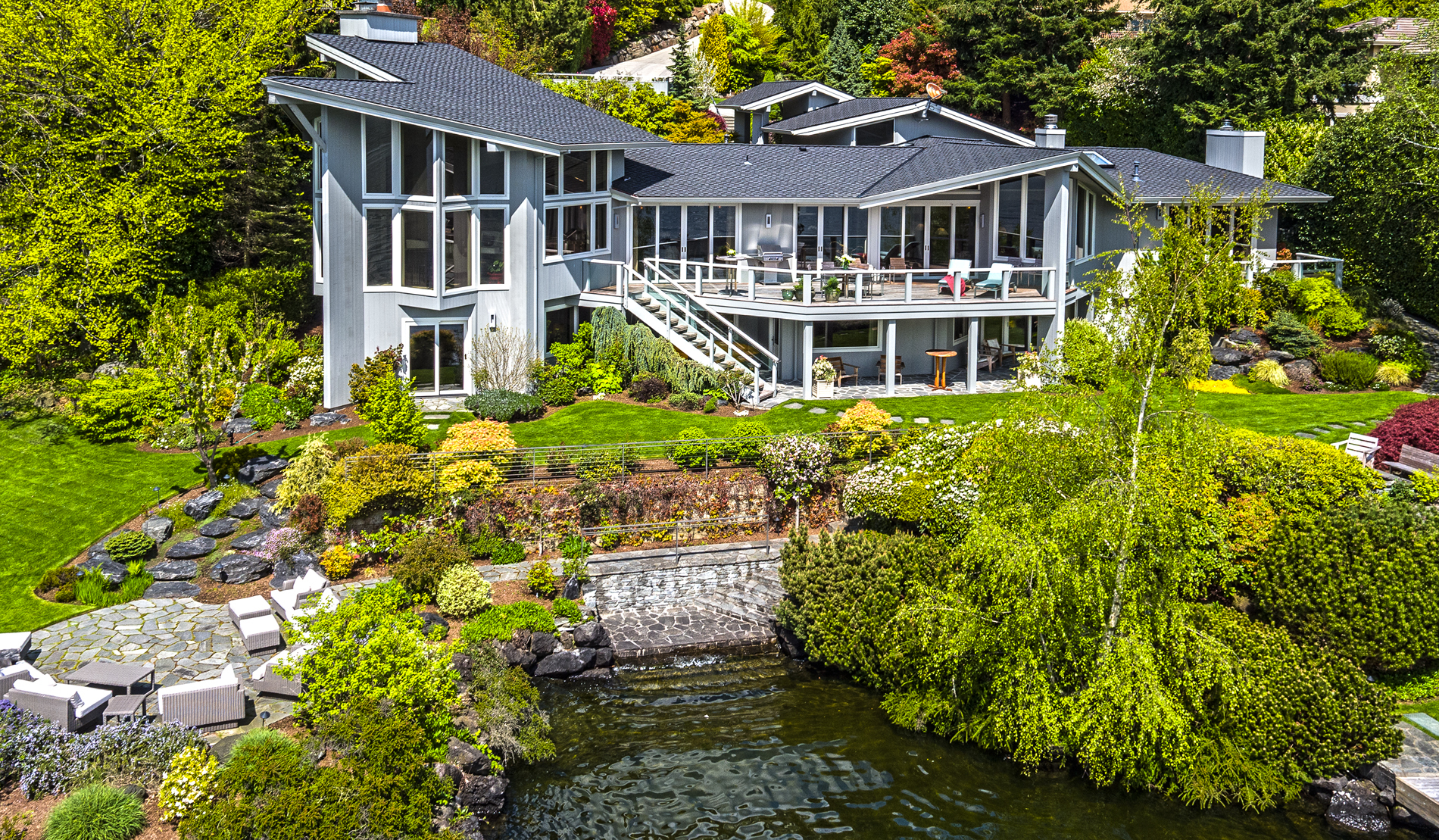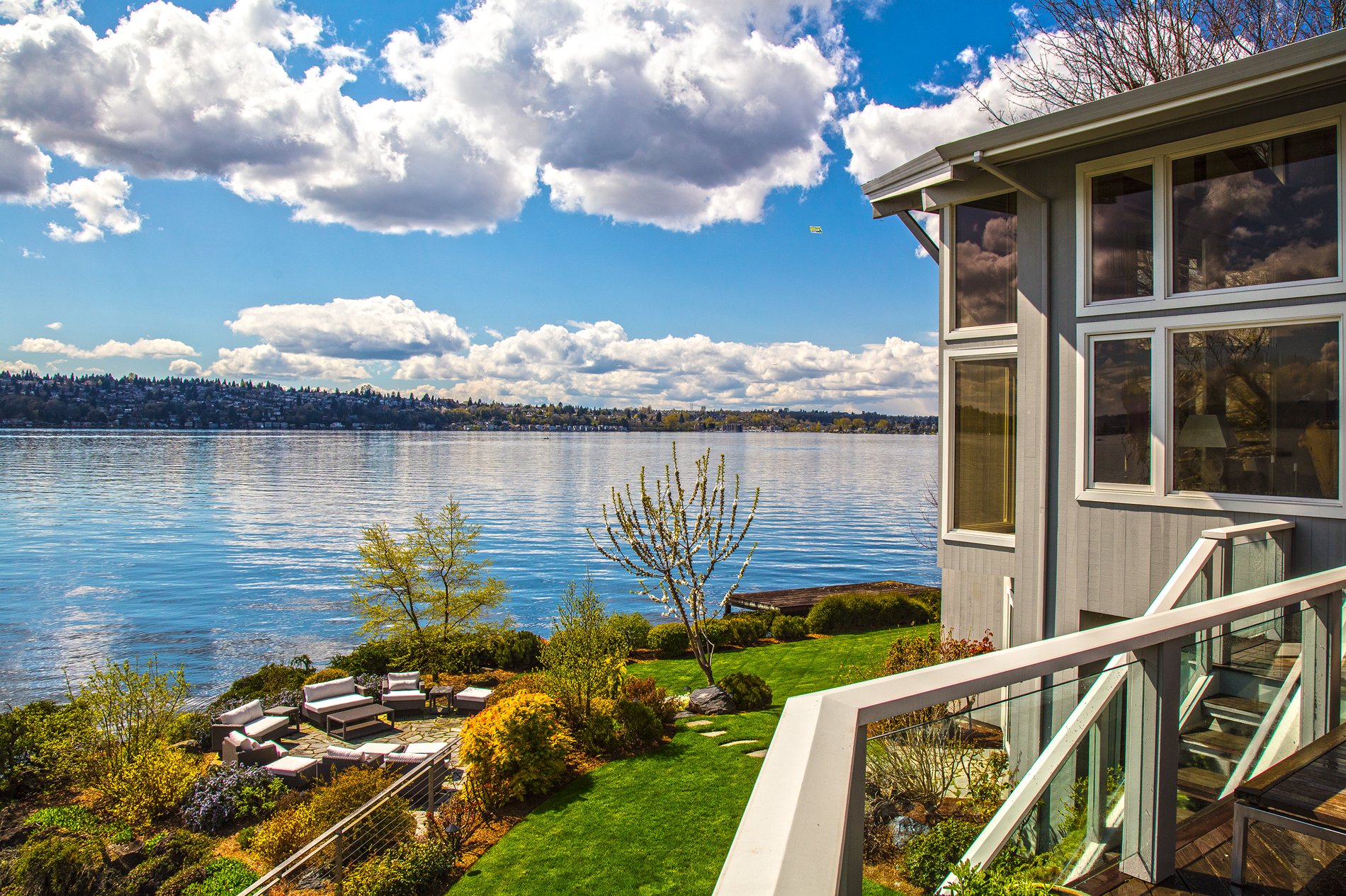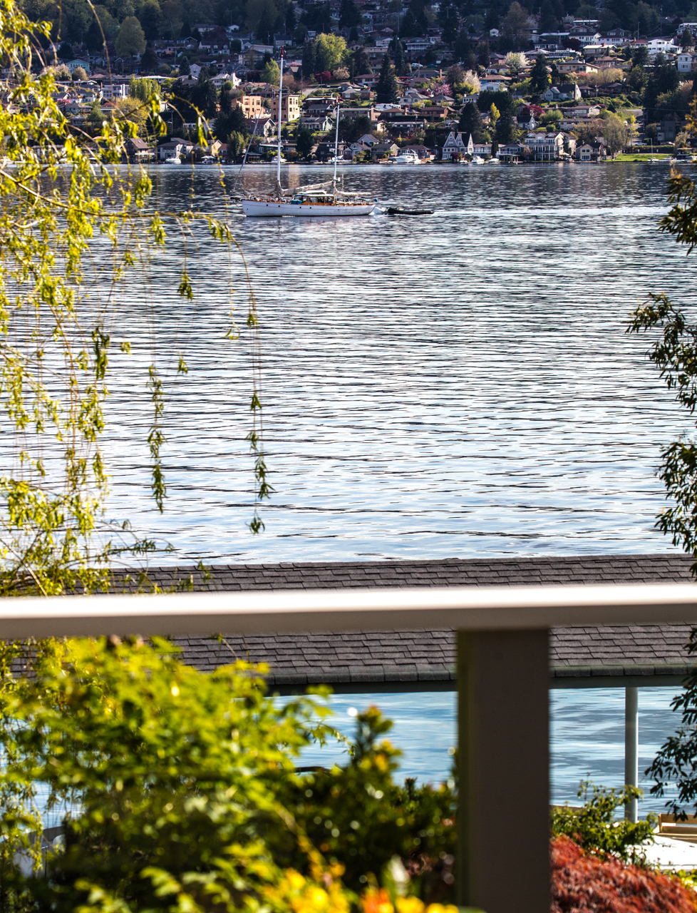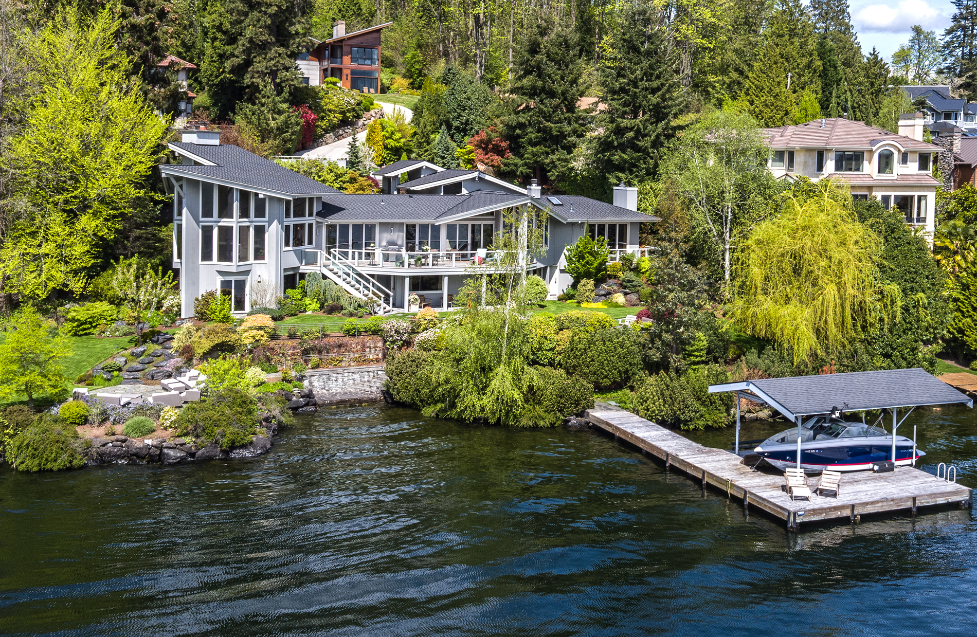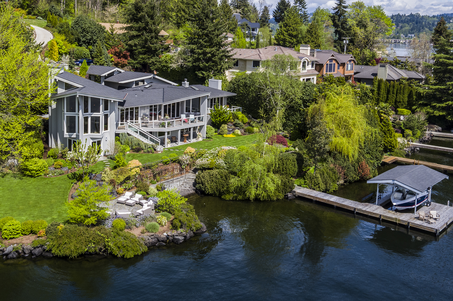 Southpointe, 1 of 20 such tips on Lk Washington. Custom contemporary 2009 home is over 100 wide, opportunistically capturing light and vistas dawn to dusk. Mt Rainier in every conceivable color, framed up dramatically in two story walls of glass. Exquisite fully appointed kitchen befitting the culinary artist. 5 full suites. Extensive guest parking. 145+ of no bank waterfront, expertly designed grounds with multiple destinations. Exclusive dock, covered moorage, multiple lifts. Brilliance!
