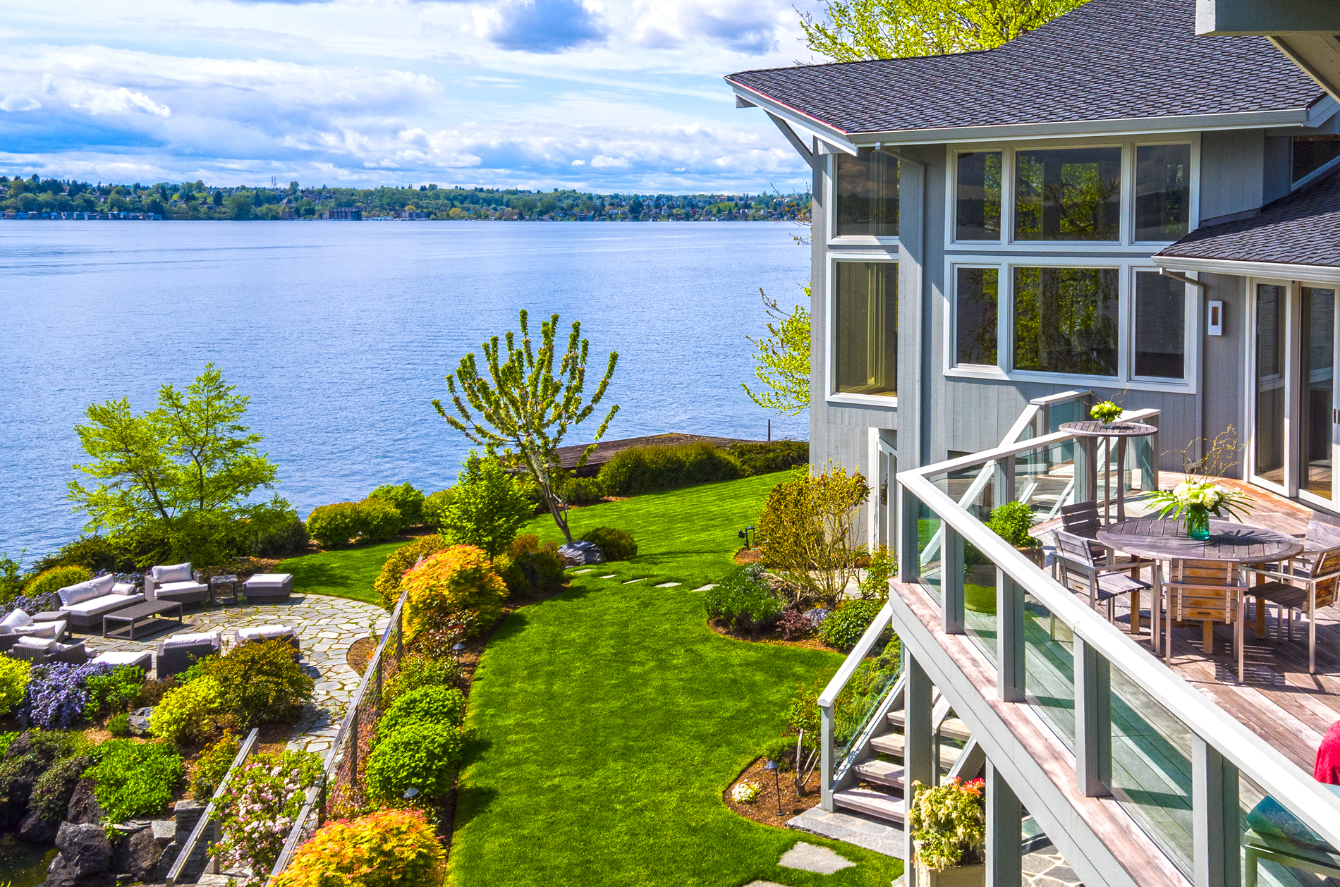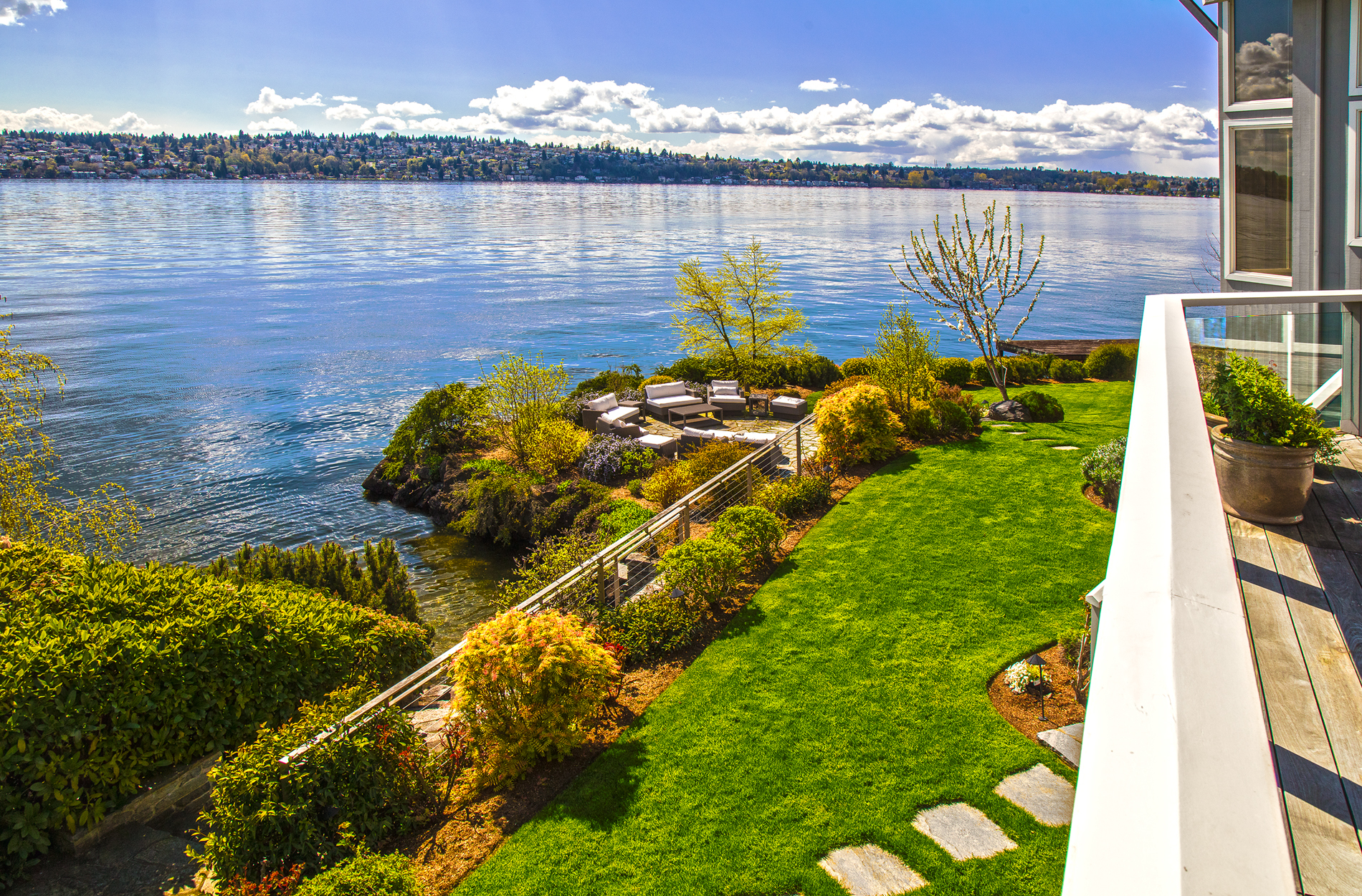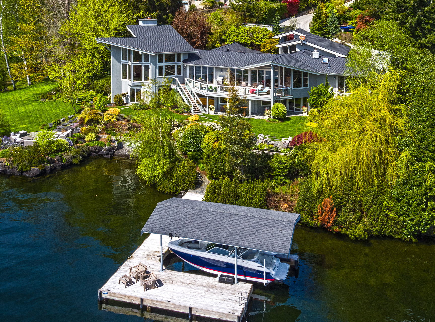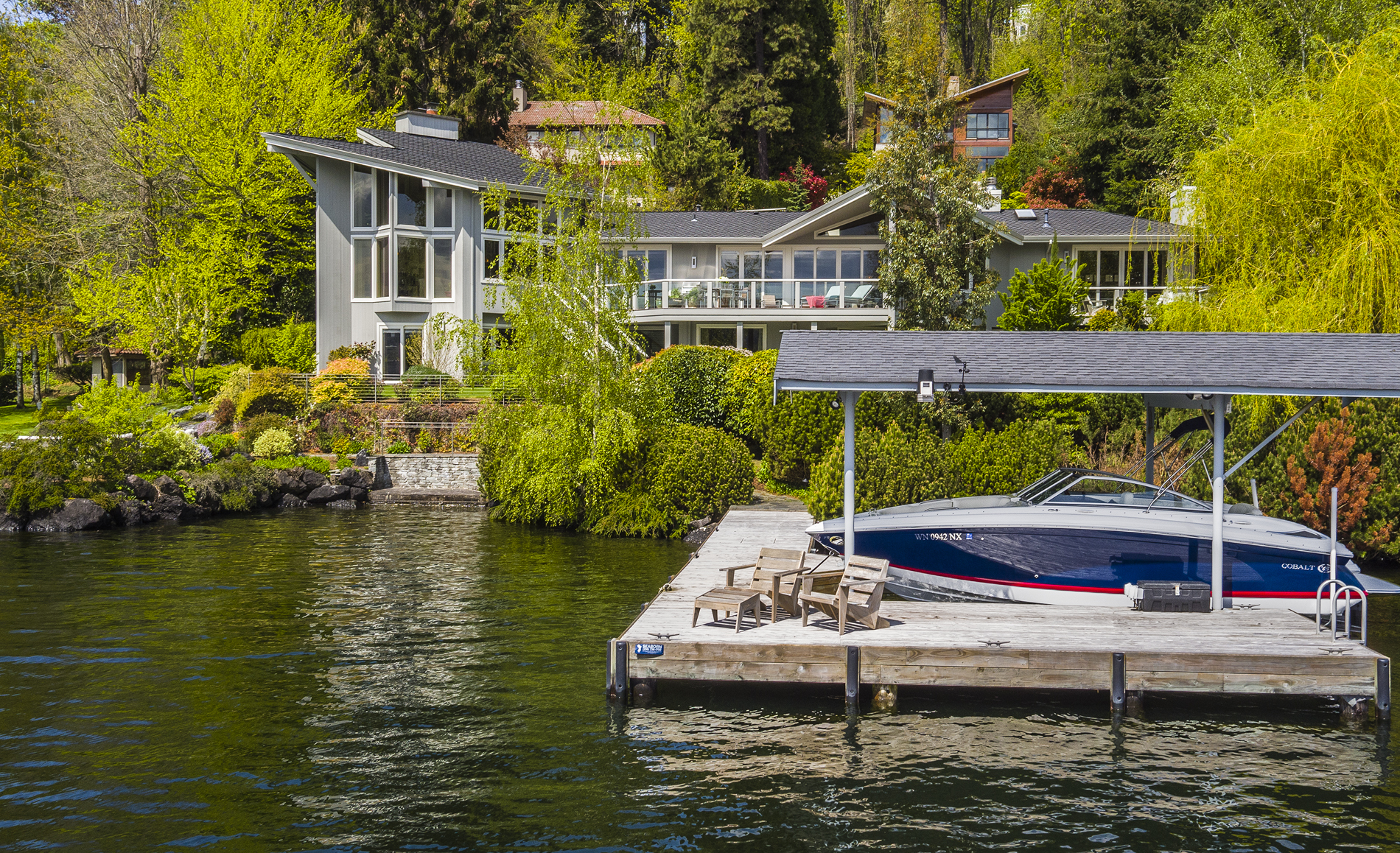Southpointe, 1 of 20 such tips on Lk Washington. Custom contemporary 2009 home is over 100 wide, opportunistically capturing light and vistas dawn to dusk. Mt Rainier in every conceivable color, framed up dramatically in two story walls of glass. Exquisite fully appointed kitchen befitting the culinary artist. 5 full suites. Extensive guest parking. 145+ of no bank waterfront, expertly designed grounds with multiple destinations. Exclusive dock, covered moorage, multiple lifts. Brilliance!
