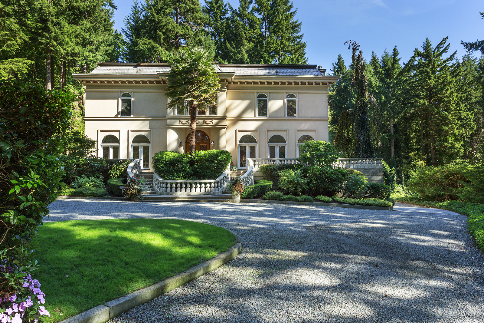 Italian Renaissance home with fine surfaces and special features. Slate roof, arched windows and wrap-around view terrace. Dramatic 2-story entry, grand staircase and stained glass skylight. Lovely formals; chefs kitchen, adjoining sunroom and family room; library; 5 bedroom suites incl main floor master; 6.25 baths; 3 frplcs; exercise room. Magical top floor glass atrium; lower level rec/media room. Beautiful grounds, formal gardens and rustic cabin. Amazing 3,300 sf, 7-car garage with shop.