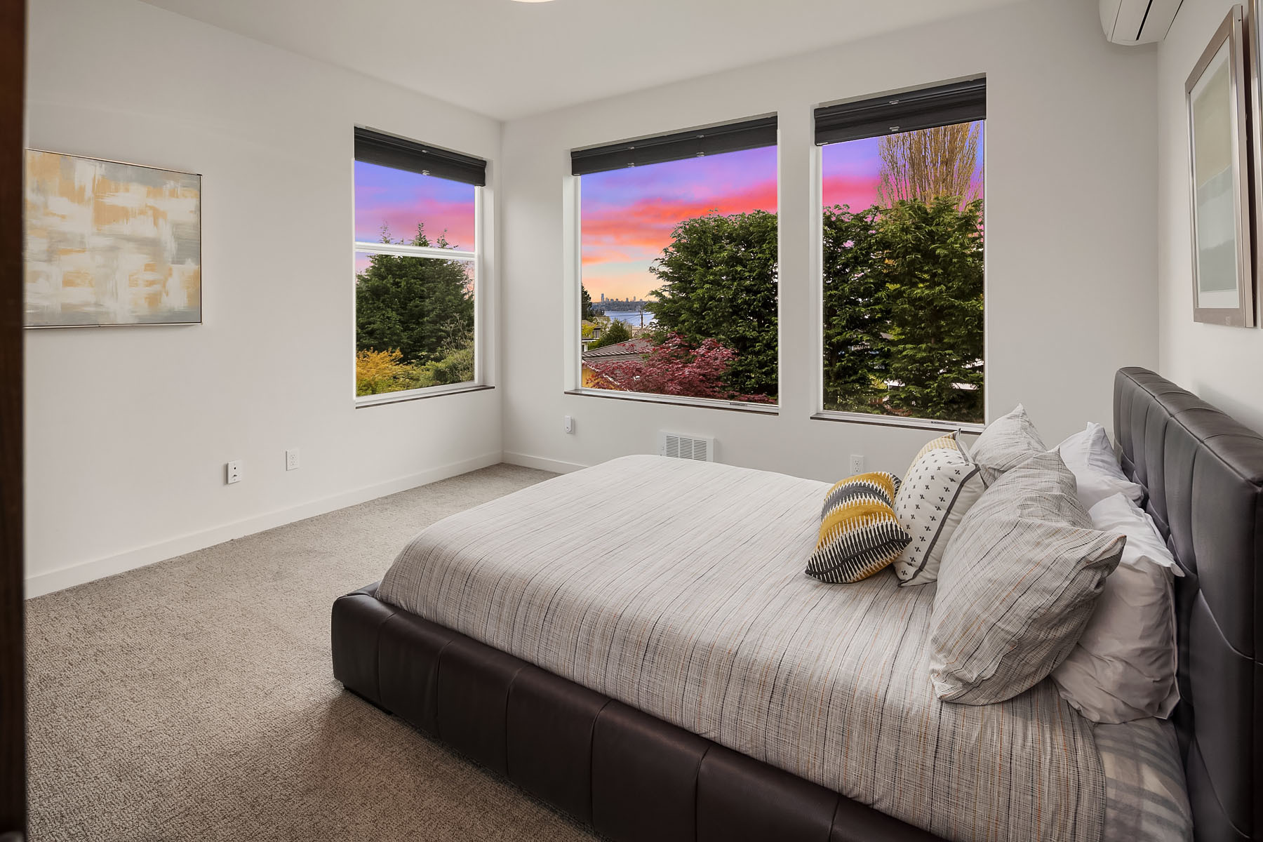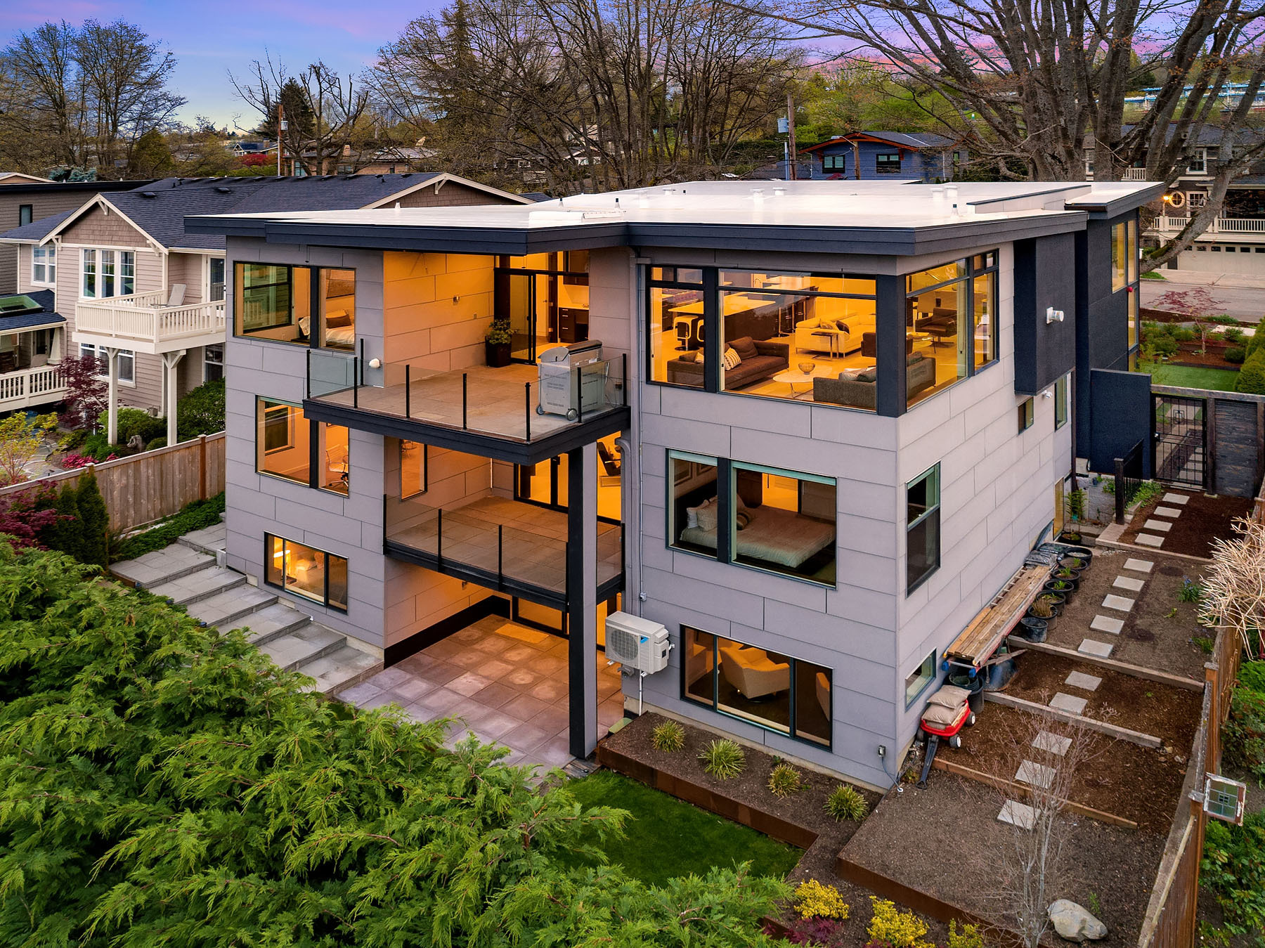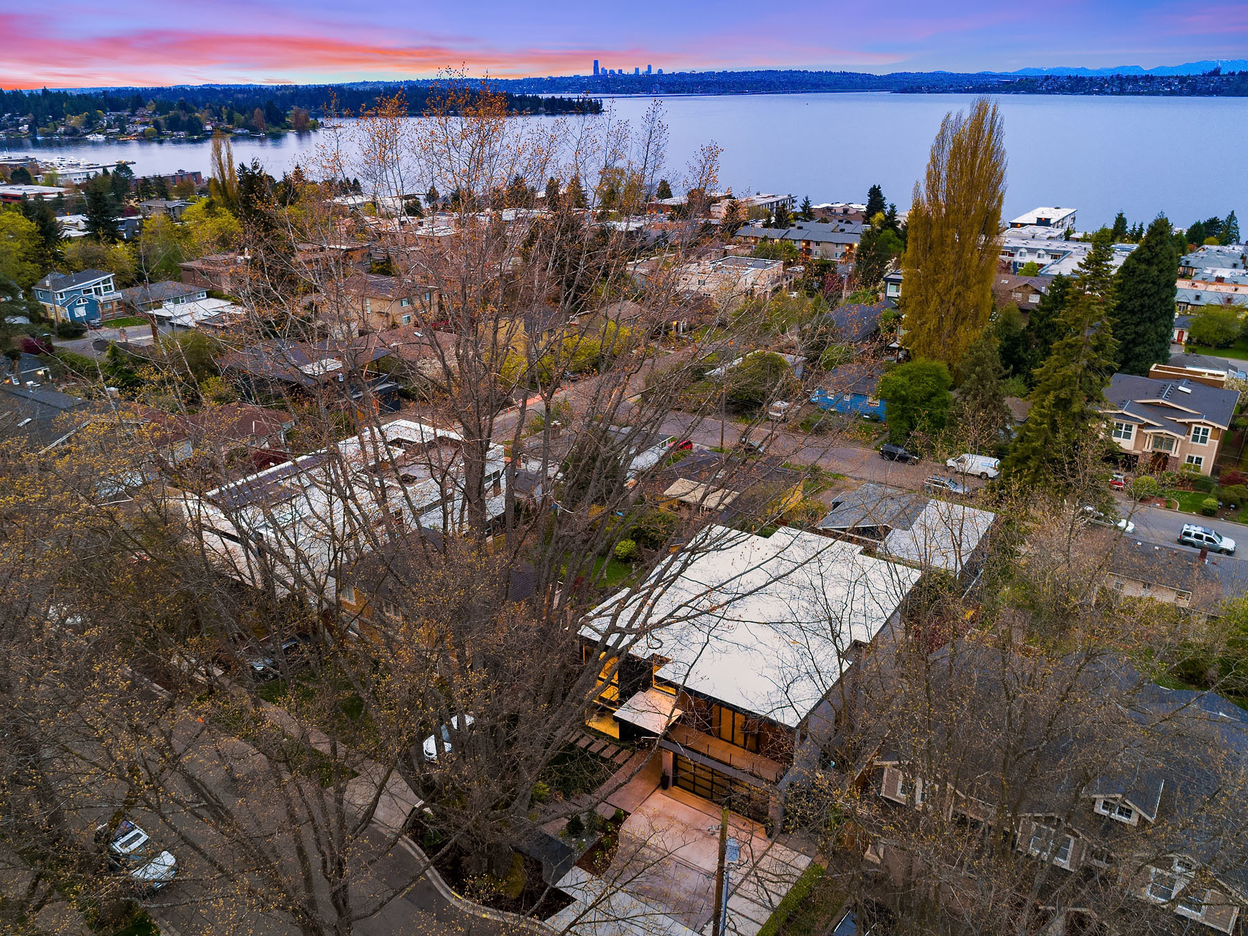 In a premier location, this Lakeview Modern is an easy walk to waterfront, Google and award winning Lakeview Elem. Steel pivot door opens to sleek, sophisticated interiors that have been expertly curated. Floating steel staircase w frameless glass railing leads to a sprawling upper floor. Walls of windows throughout frame sweeping views of Lake Washington, Seattle skyline, and Olympic Mountains. Ample outdoor spaces, 4 decks and fenced yard. Lower level, 1646sf ADU w 2 bed/1ba, full kitchen and w/d.