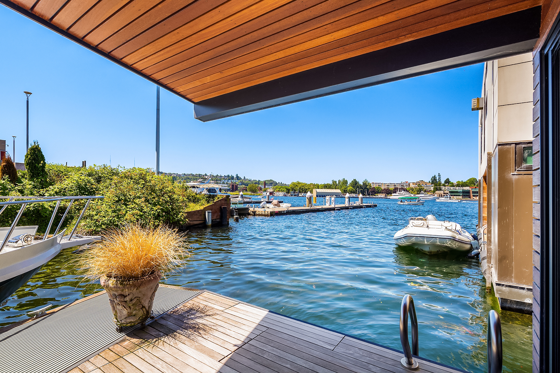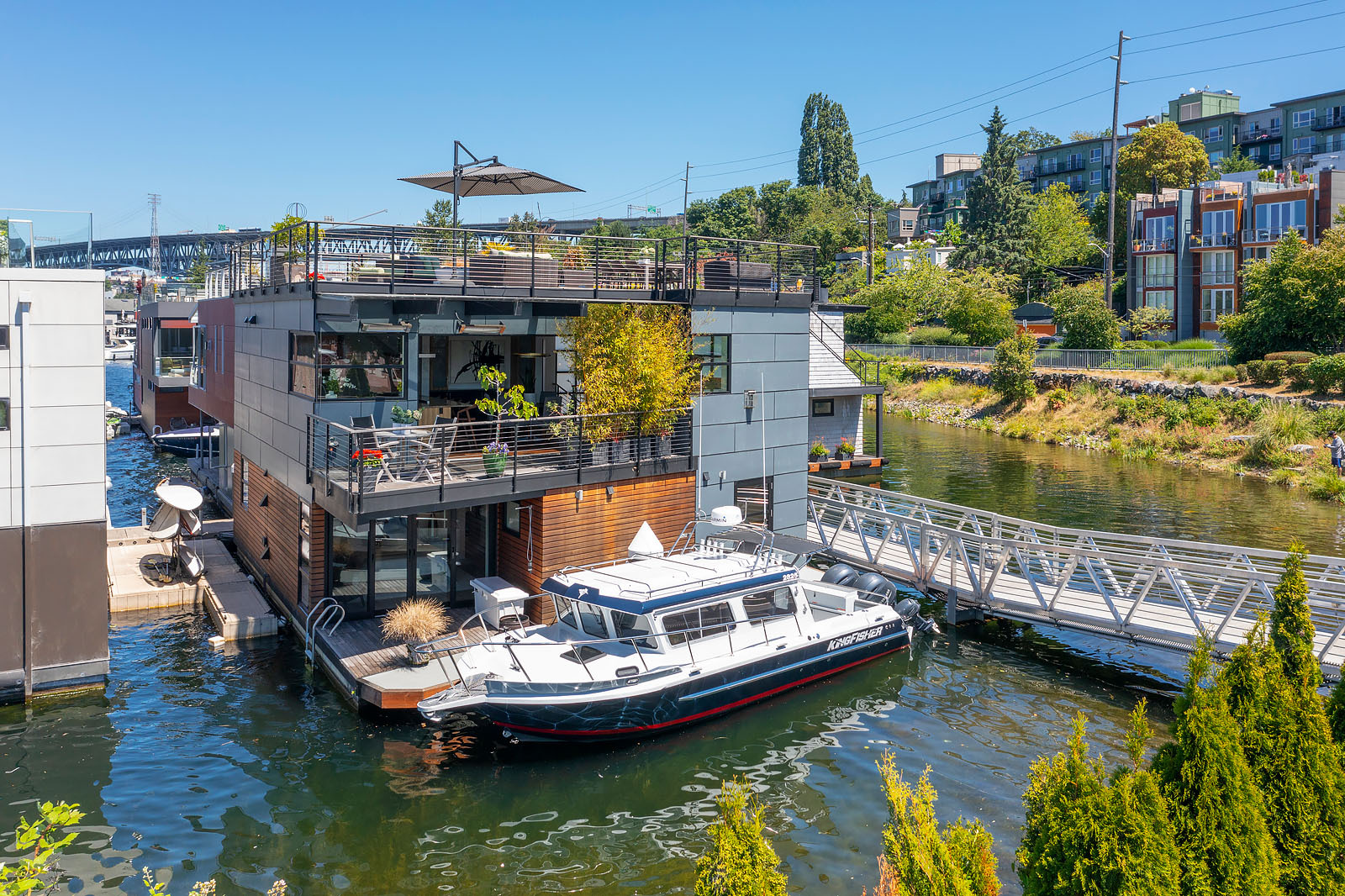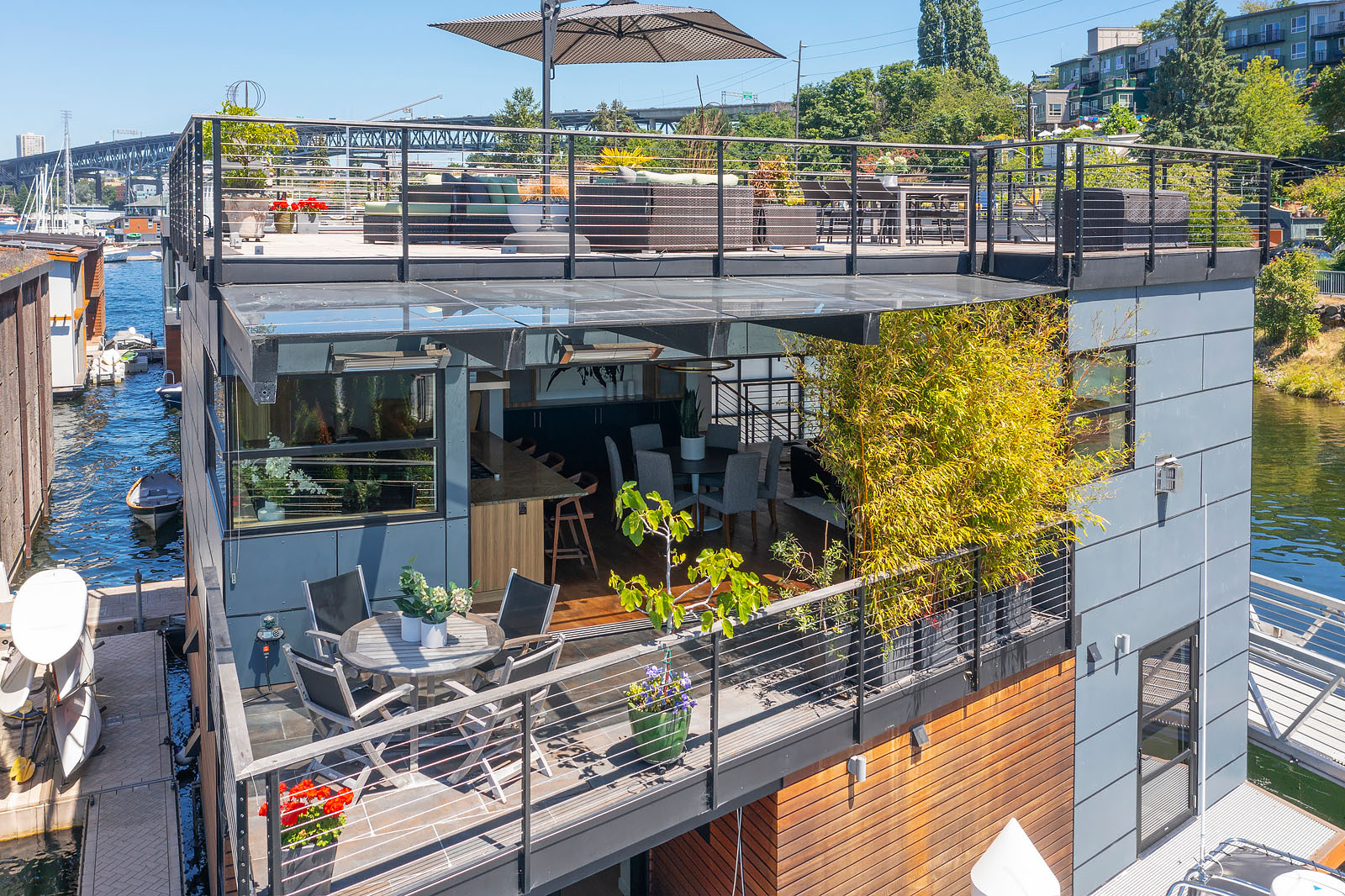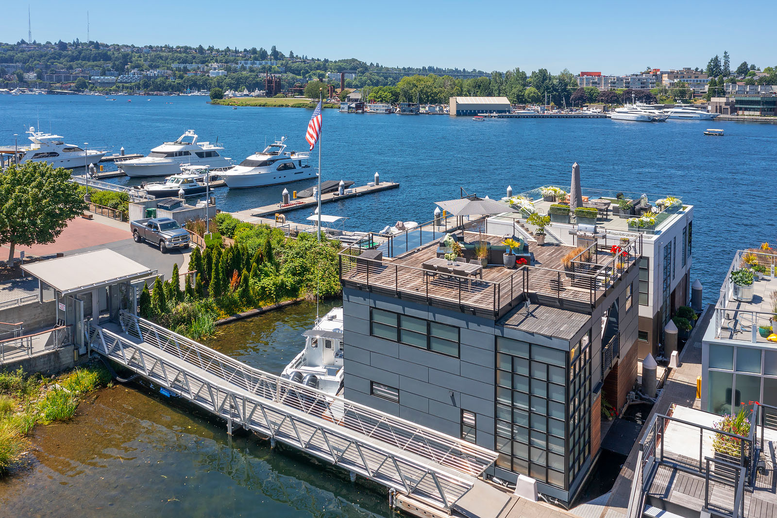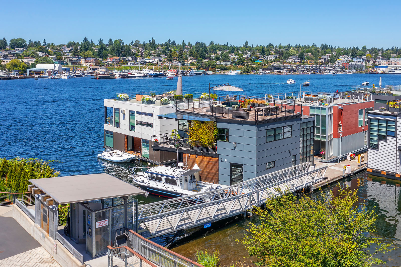 A rare opportunity to live at Seattle’s premier floating home community of Wards Cove on Lake Union. Meticulously maintained, this quality built floating home from Dyna Construction surpasses all expectations. Top floor features voluminous open floor plan w/chef's kitchen with custom cabinetry, eating bar, tv room off the kitchen, sliding doors open onto a covered heated patio. Main level features 3 beds, primary has walk in closet, en-suite bath w/radiant heat and a luxurious steam shower. Sliding doors open onto water level deck with outdoor shower and moorage of up to 32’ boat. Enormous rooftop deck with views of the lake, downtown, glorious sunsets and all the boating activity the lake offers. One gated off-street parking space.