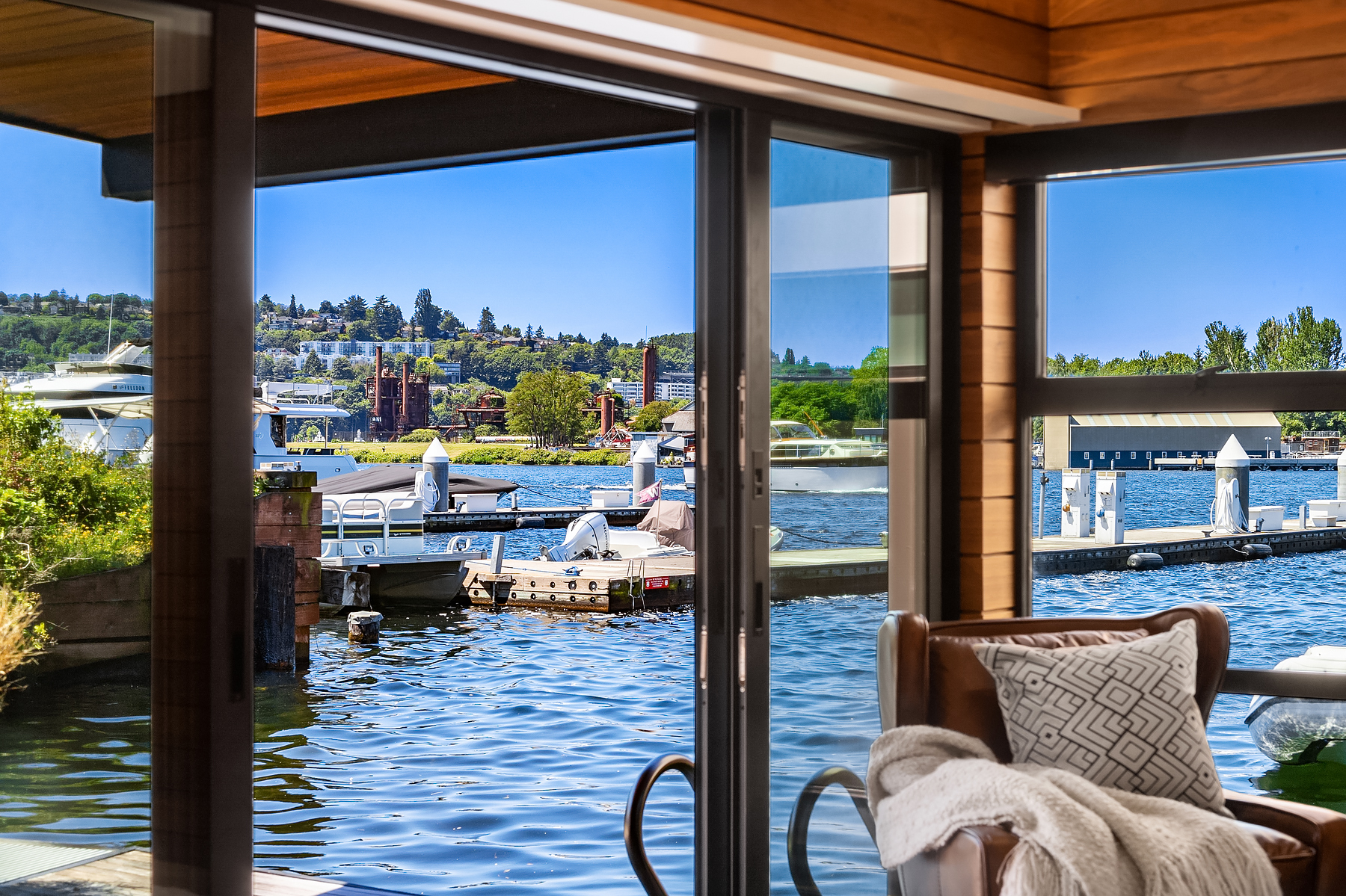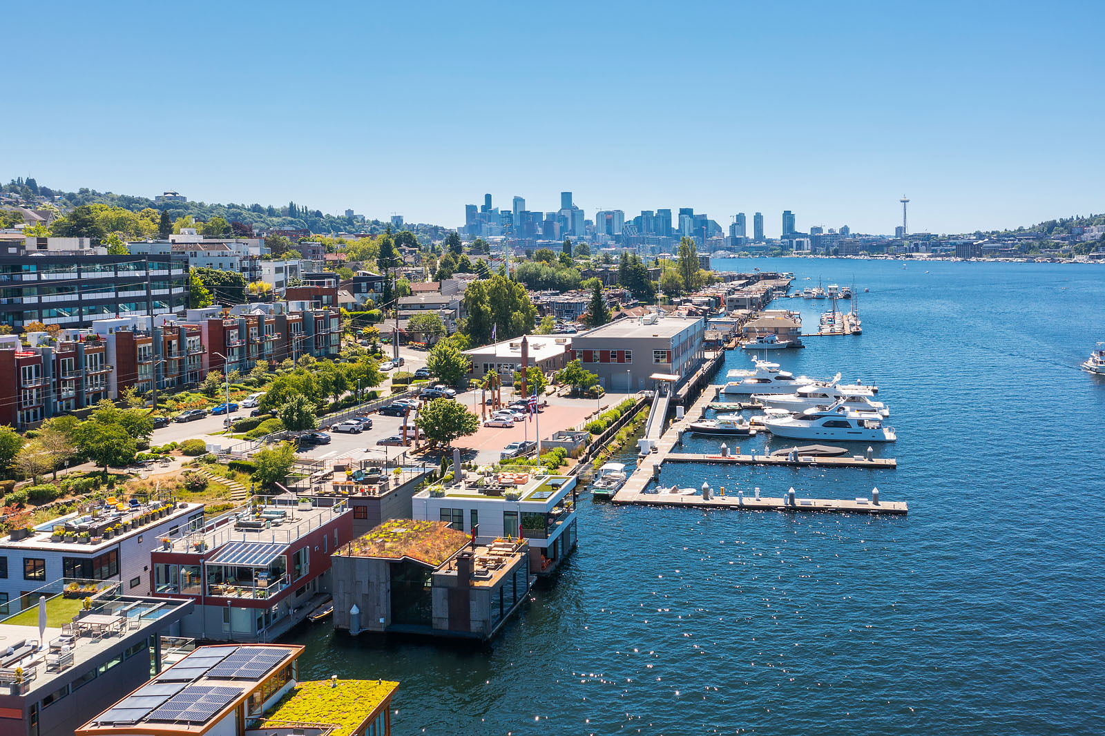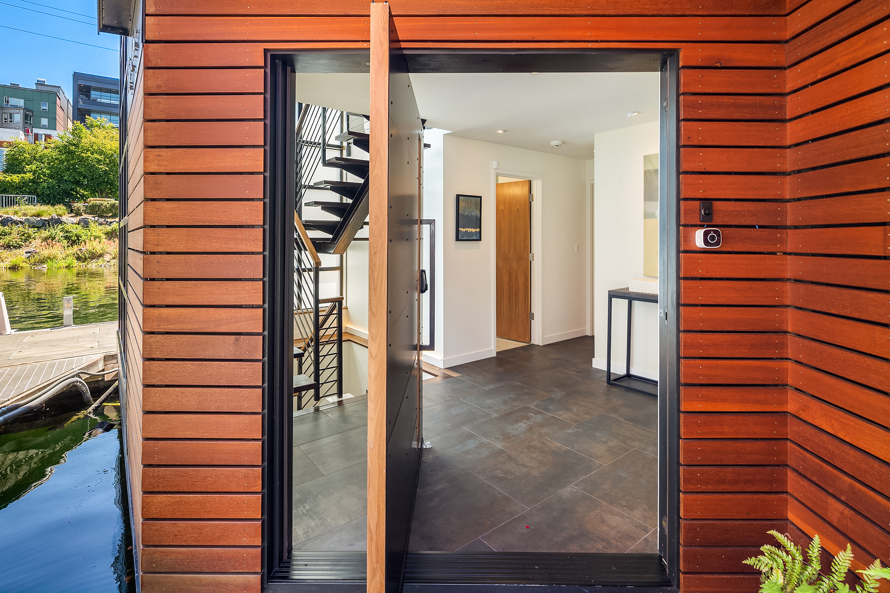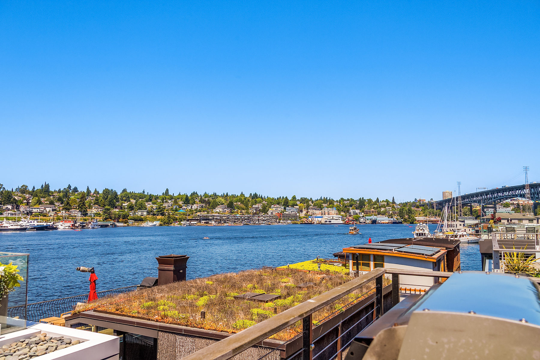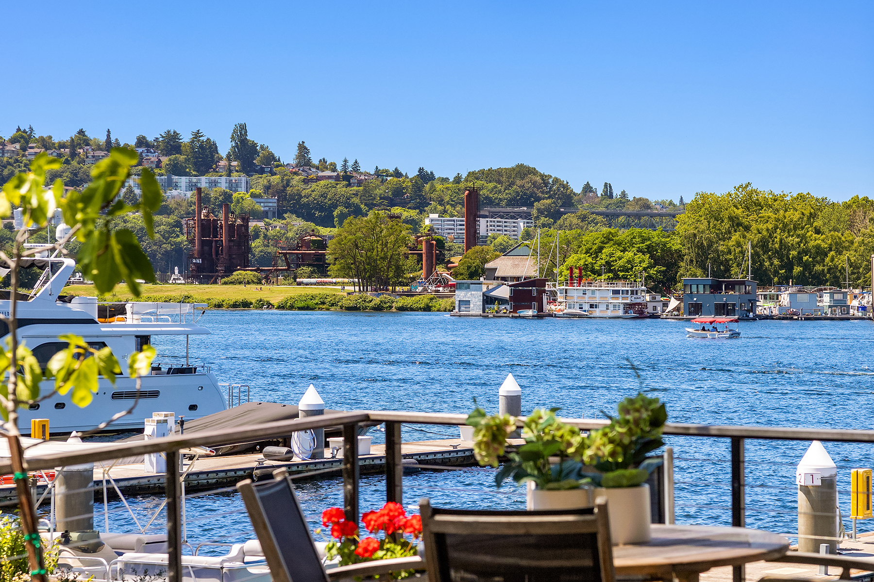 A rare opportunity to live at Seattle’s premier floating home community of Wards Cove on Lake Union. Meticulously maintained, this quality built floating home from Dyna Construction surpasses all expectations. Top floor features voluminous open floor plan w/chef's kitchen with custom cabinetry, eating bar, tv room off the kitchen, sliding doors open onto a covered heated patio. Main level features 3 beds, primary has walk in closet, en-suite bath w/radiant heat and a luxurious steam shower. Sliding doors open onto water level deck with outdoor shower and moorage of up to 32’ boat. Enormous rooftop deck with views of the lake, downtown, glorious sunsets and all the boating activity the lake offers. One gated off-street parking space.