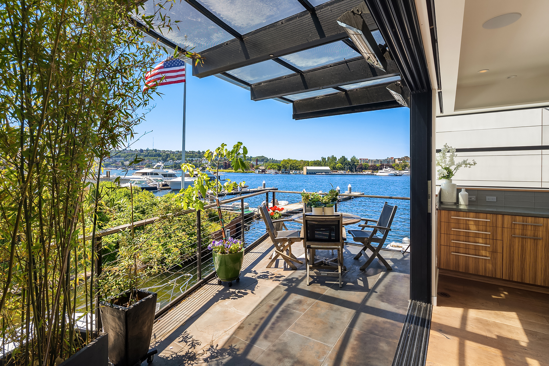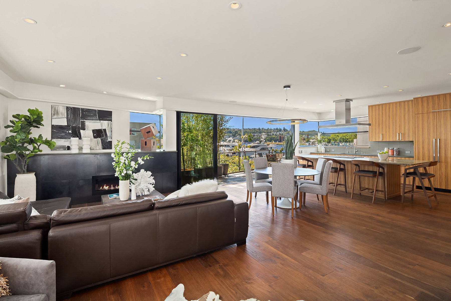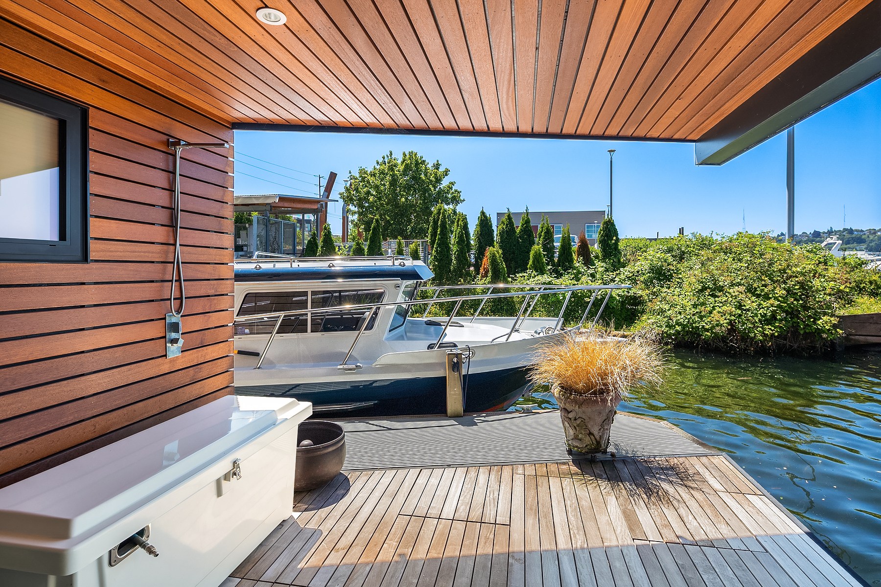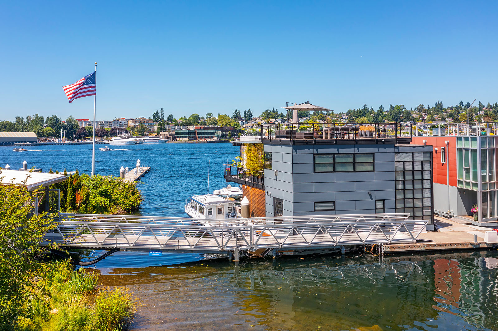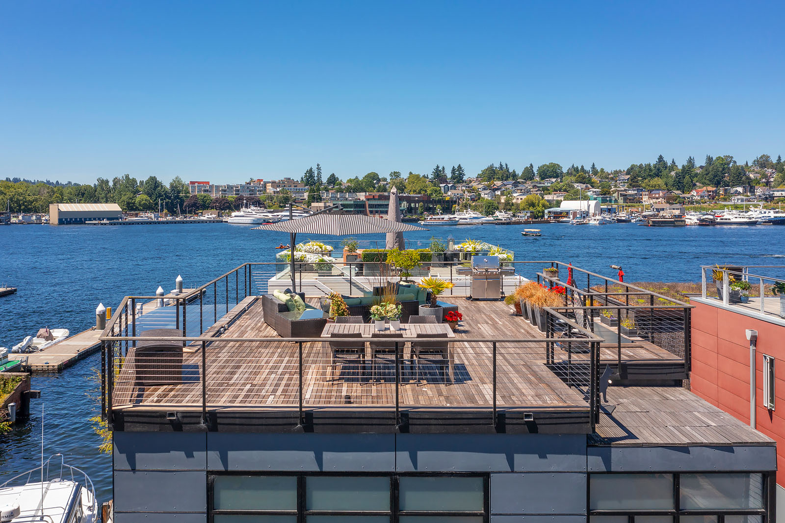 A rare opportunity to live at Seattle’s premier floating home community of Wards Cove on Lake Union. Meticulously maintained, this quality built floating home from Dyna Construction surpasses all expectations. Top floor features voluminous open floor plan w/chef's kitchen with custom cabinetry, eating bar, tv room off the kitchen, sliding doors open onto a covered heated patio. Main level features 3 beds, primary has walk in closet, en-suite bath w/radiant heat and a luxurious steam shower. Sliding doors open onto water level deck with outdoor shower and moorage of up to 32’ boat. Enormous rooftop deck with views of the lake, downtown, glorious sunsets and all the boating activity the lake offers. One gated off-street parking space.