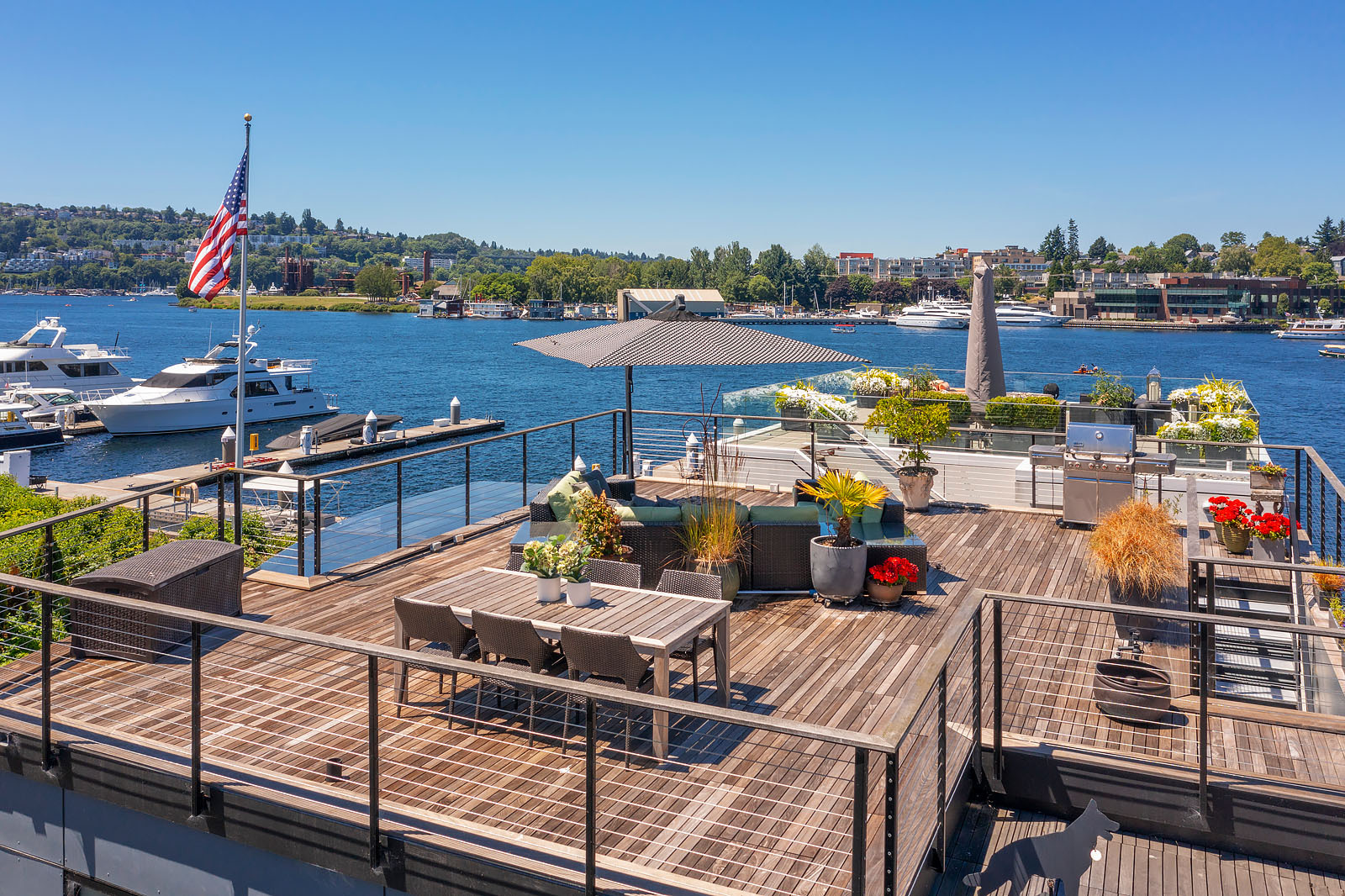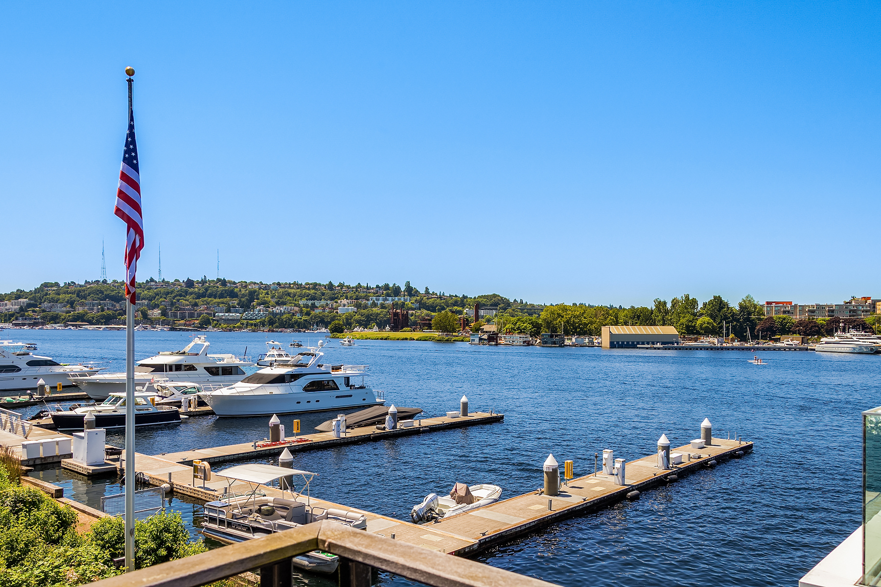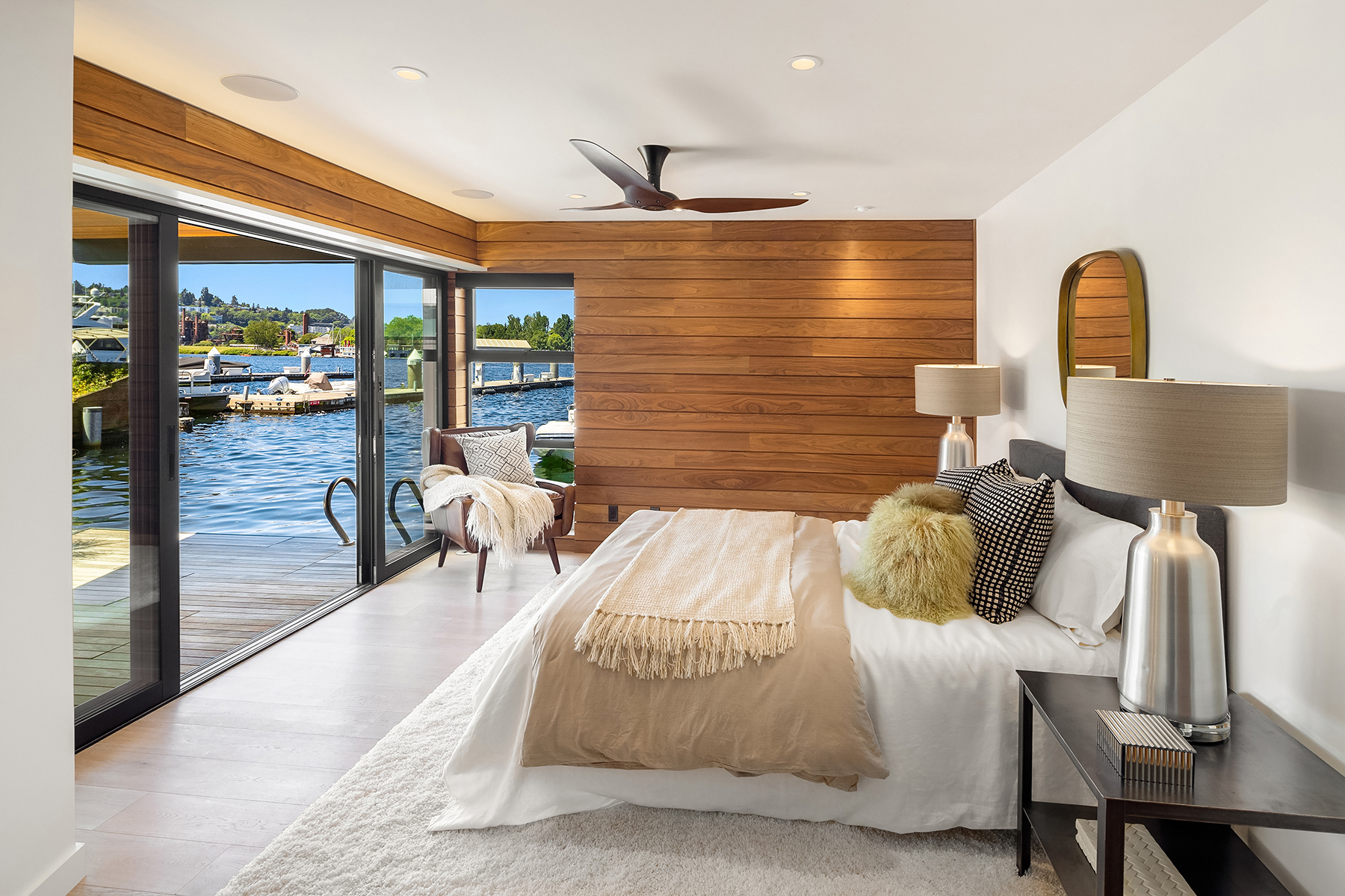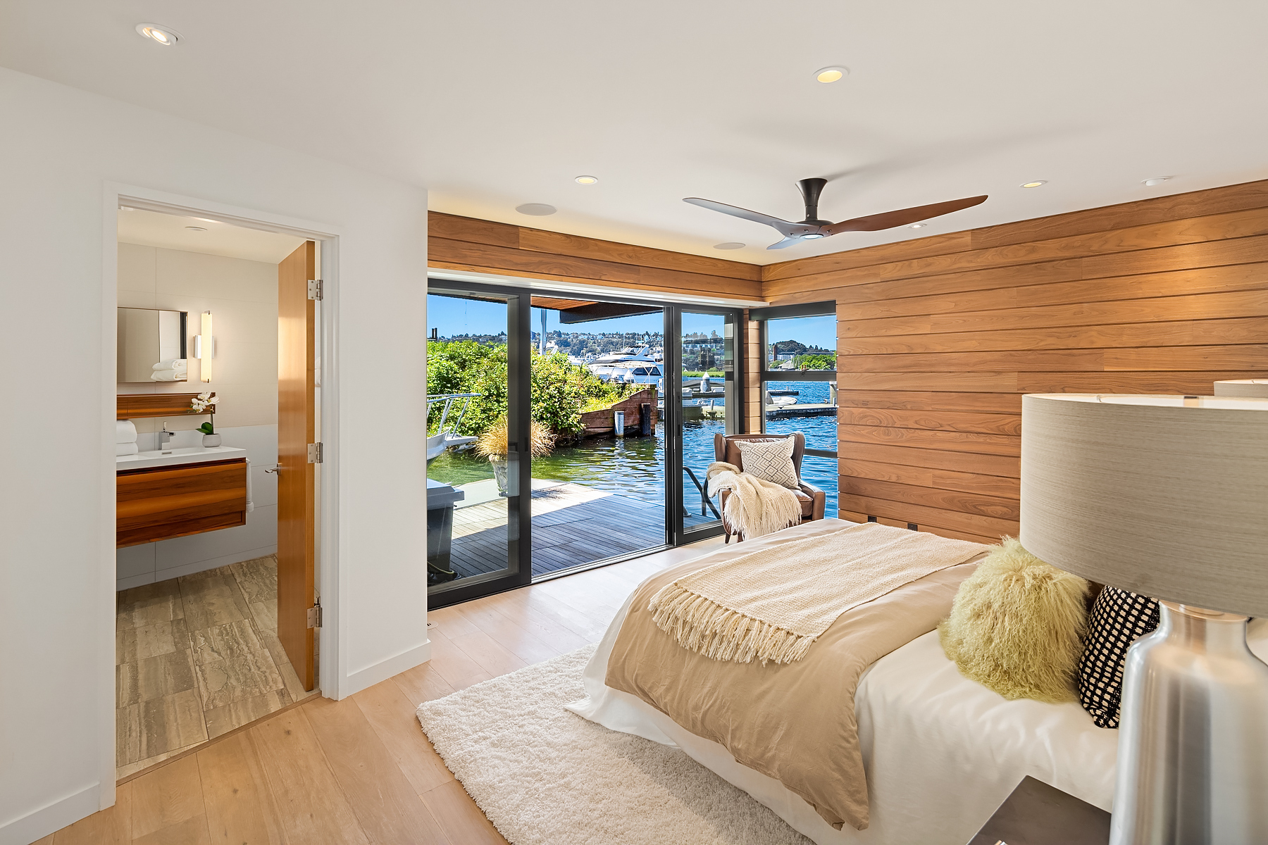 A rare opportunity to live at Seattle’s premier floating home community of Wards Cove on Lake Union. Meticulously maintained, this quality built floating home from Dyna Construction surpasses all expectations. Top floor features voluminous open floor plan w/chef's kitchen with custom cabinetry, eating bar, tv room off the kitchen, sliding doors open onto a covered heated patio. Main level features 3 beds, primary has walk in closet, en-suite bath w/radiant heat and a luxurious steam shower. Sliding doors open onto water level deck with outdoor shower and moorage of up to 32’ boat. Enormous rooftop deck with views of the lake, downtown, glorious sunsets and all the boating activity the lake offers. One gated off-street parking space.