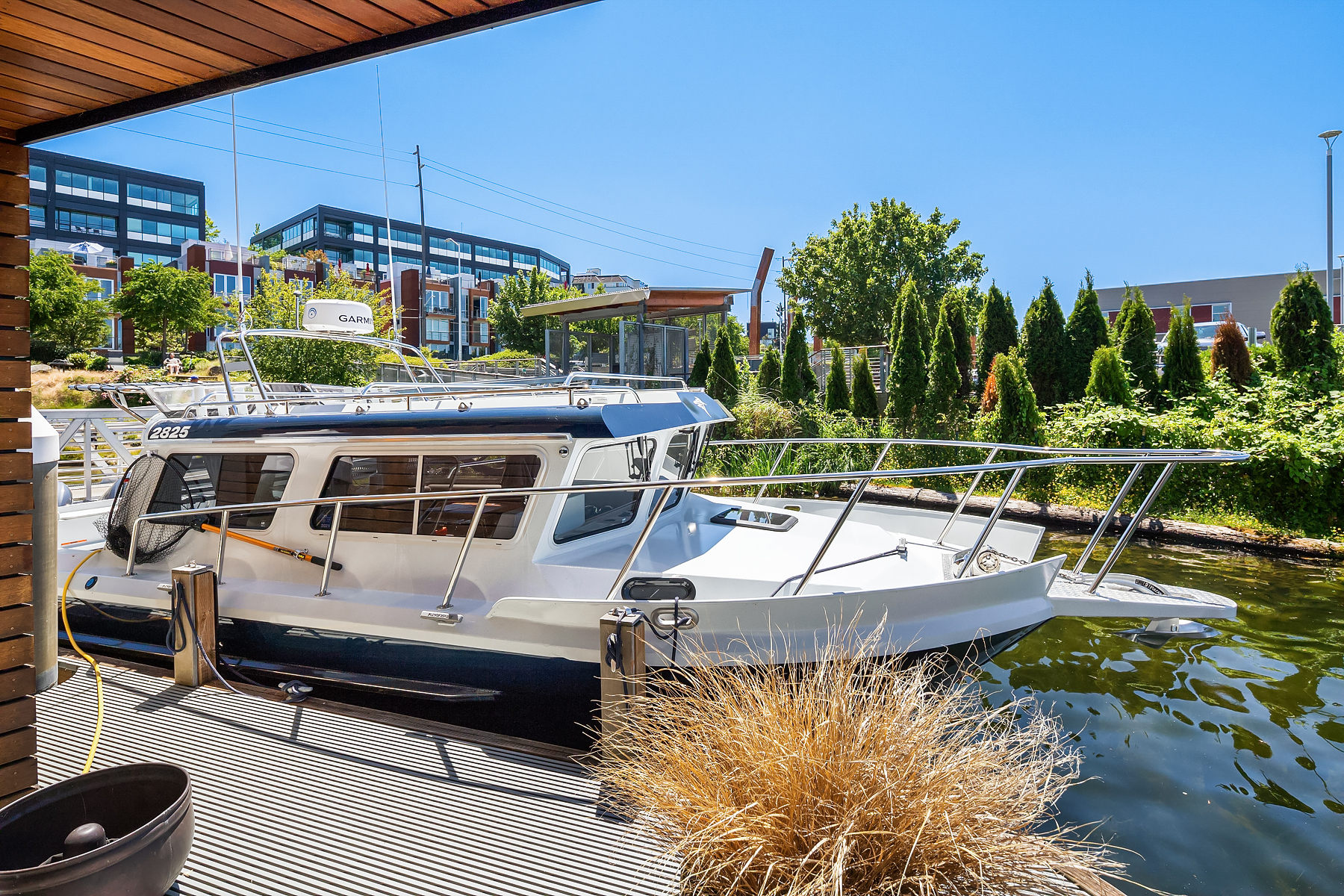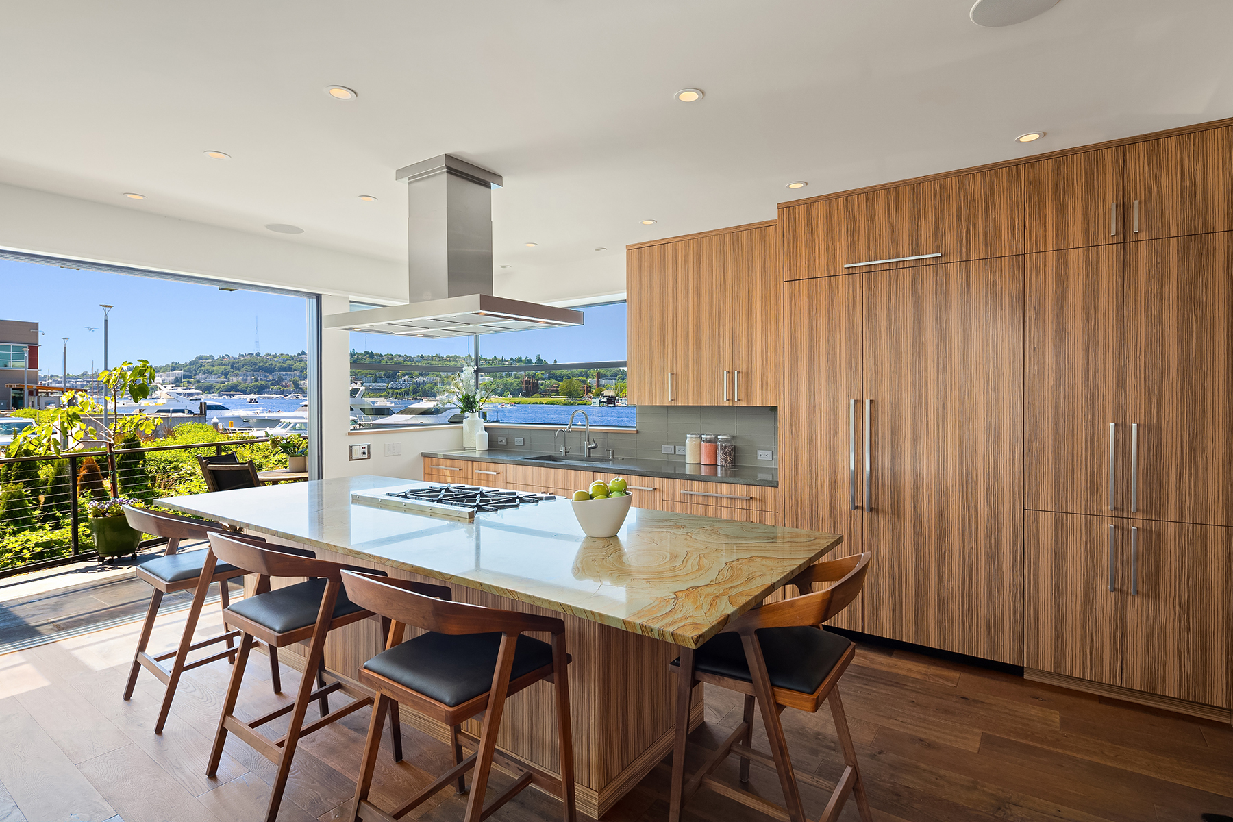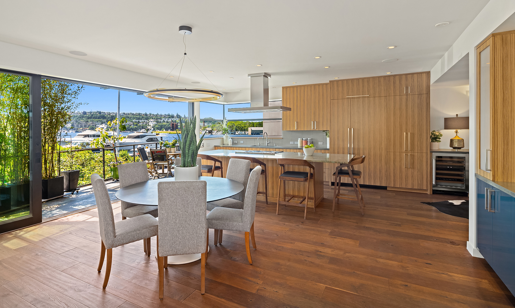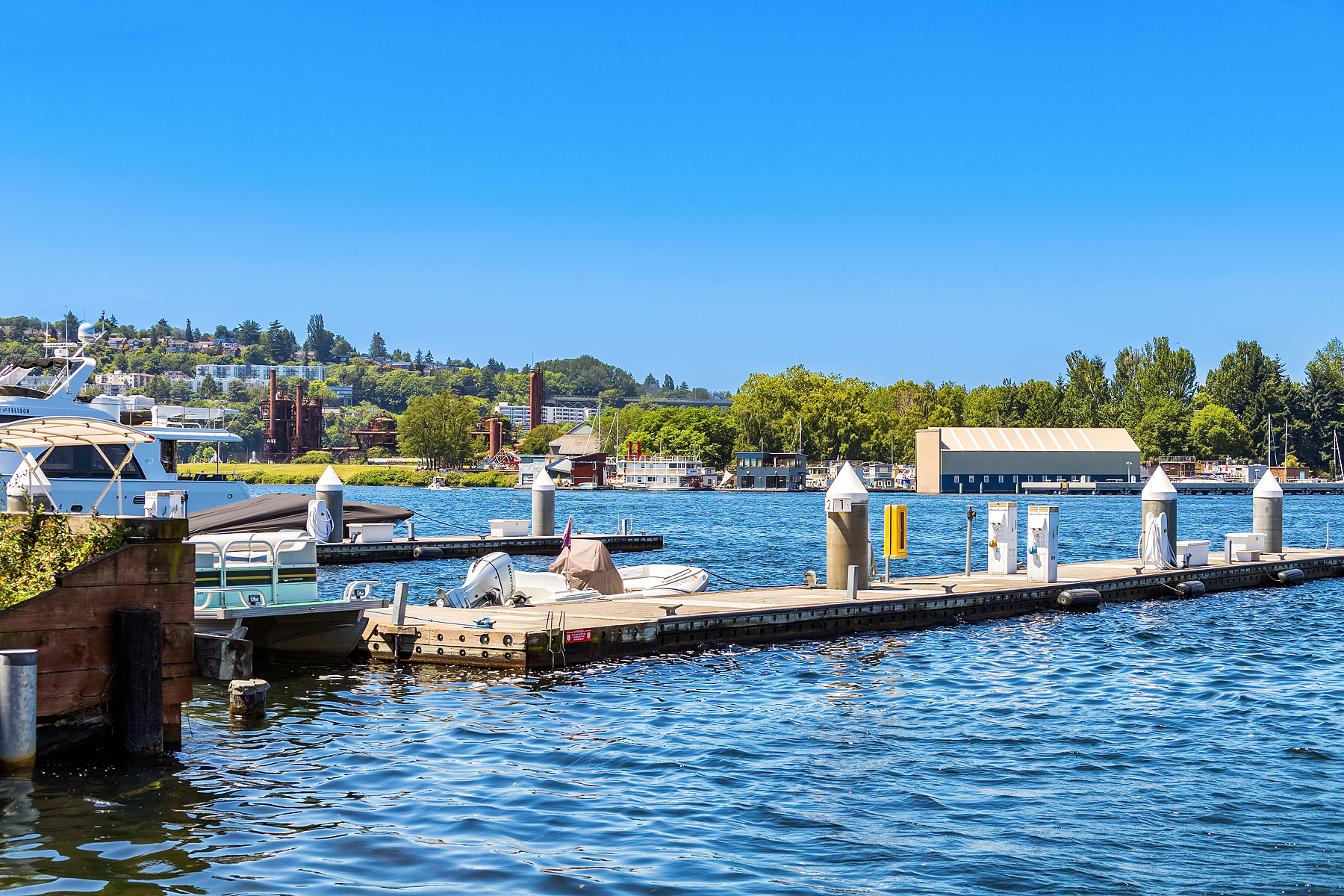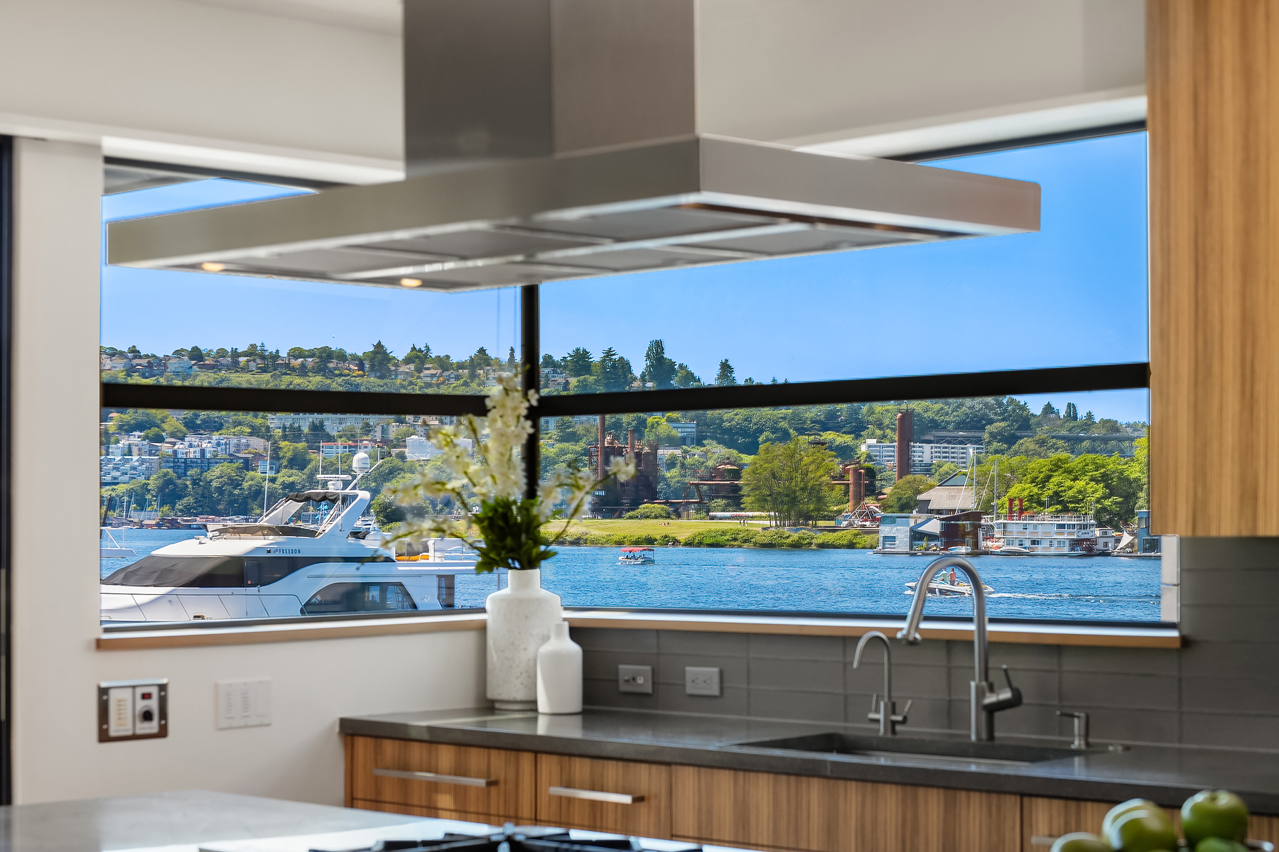 A rare opportunity to live at Seattle’s premier floating home community of Wards Cove on Lake Union. Meticulously maintained, this quality built floating home from Dyna Construction surpasses all expectations. Top floor features voluminous open floor plan w/chef's kitchen with custom cabinetry, eating bar, tv room off the kitchen, sliding doors open onto a covered heated patio. Main level features 3 beds, primary has walk in closet, en-suite bath w/radiant heat and a luxurious steam shower. Sliding doors open onto water level deck with outdoor shower and moorage of up to 32’ boat. Enormous rooftop deck with views of the lake, downtown, glorious sunsets and all the boating activity the lake offers. One gated off-street parking space.