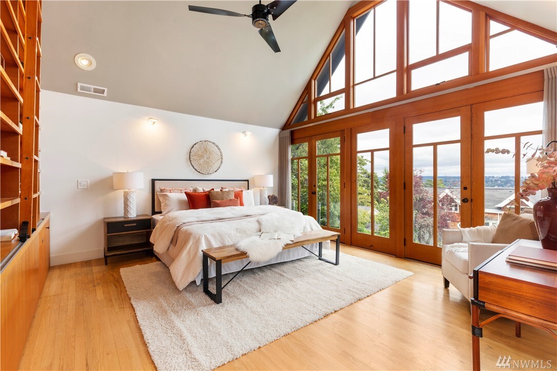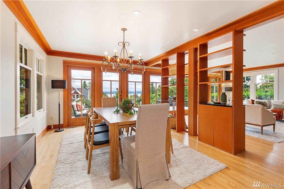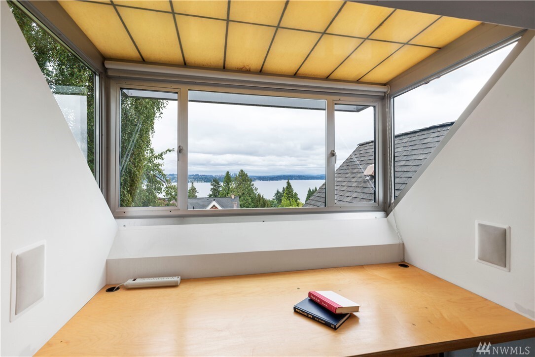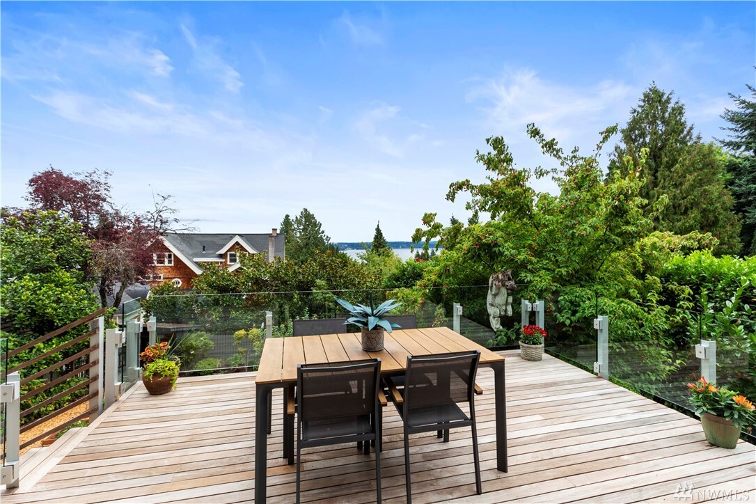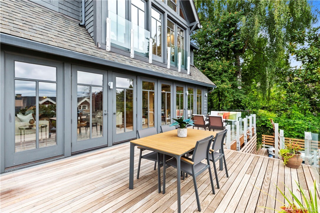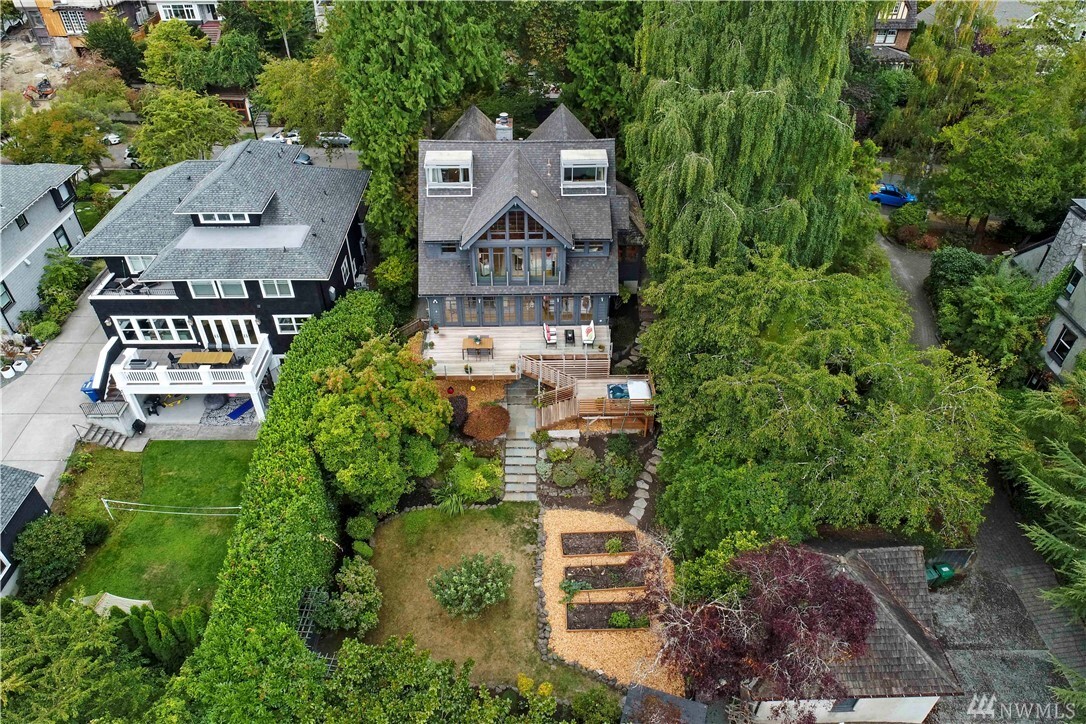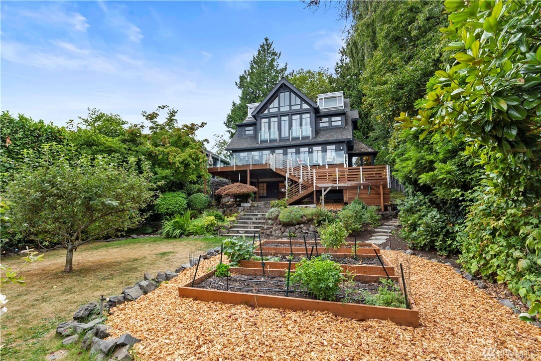 Only a short walk to Madrona, with popular spots such as Hi-Spot Cafe and Molly Moon's Ice Cream, your Pacific NW Denny Blaine home awaits! Perched prominently above the street and surrounded by lush landscaping and fruit trees, you’ll feel far away from the city, yet you're amidst greenbelt trails, less than half a mile from the lake, and about a dozen minutes to downtown. Remodeled in 1993 by Seattle builder Jerry Fulks, you’re welcomed with intricate woodwork throughout, beautiful hardwood floors and custom built-ins. Walls of windows and French doors that open to your expansive entertaining sized deck, with stunning views of Lake Washington and the Cascades, providing an ideal setting for indoor/outdoor entertaining. One-of-a-kind!