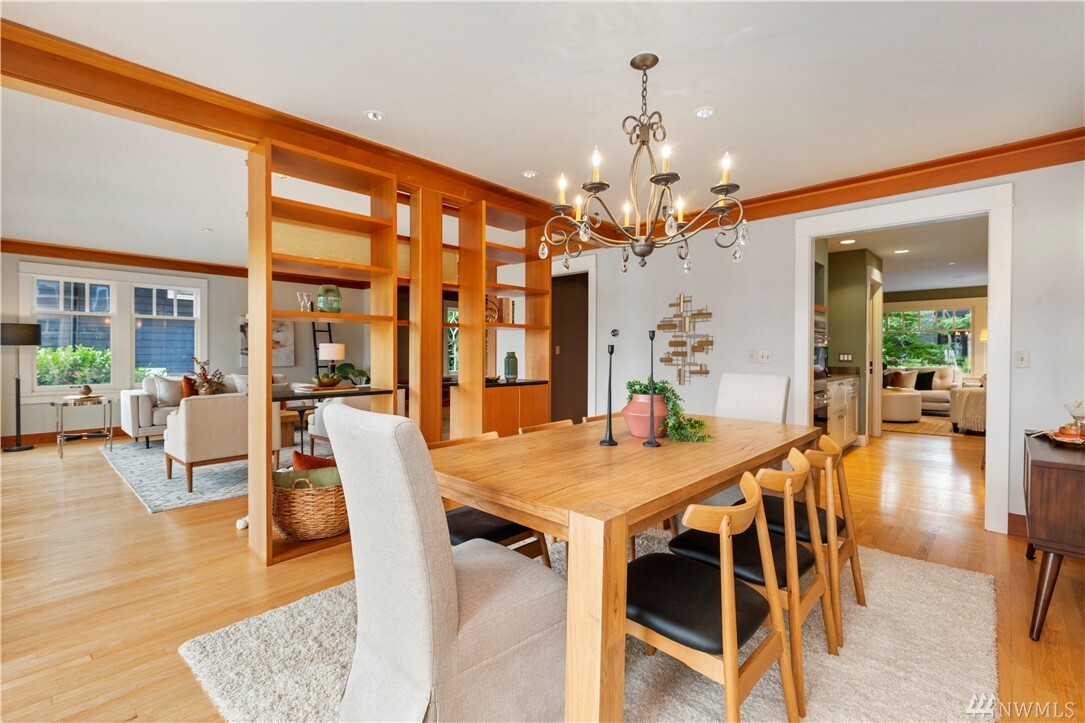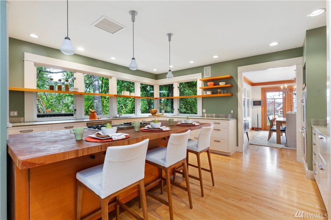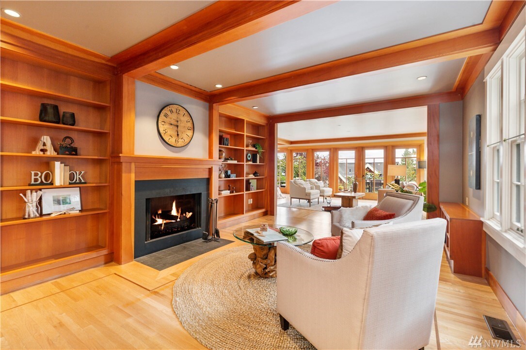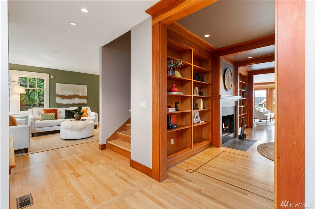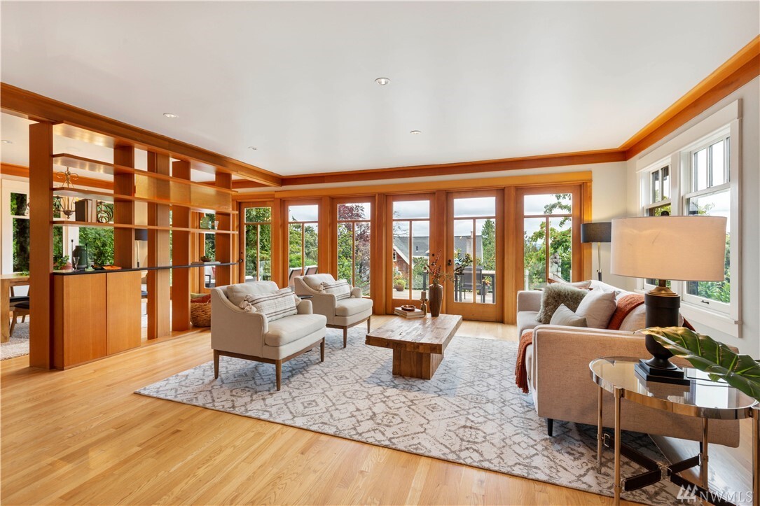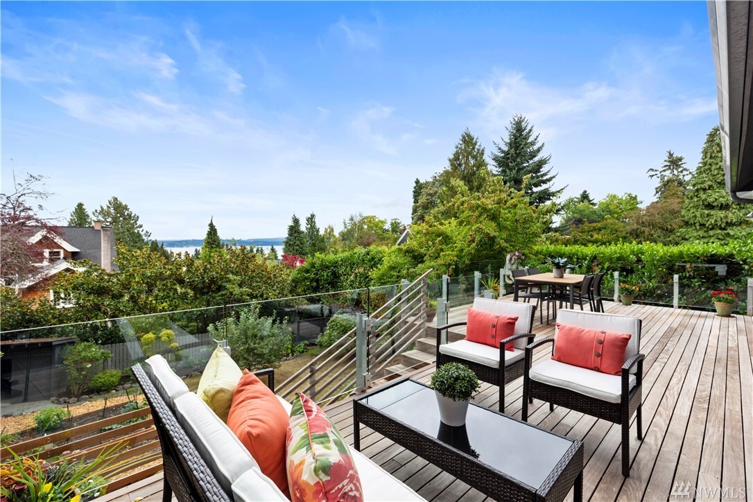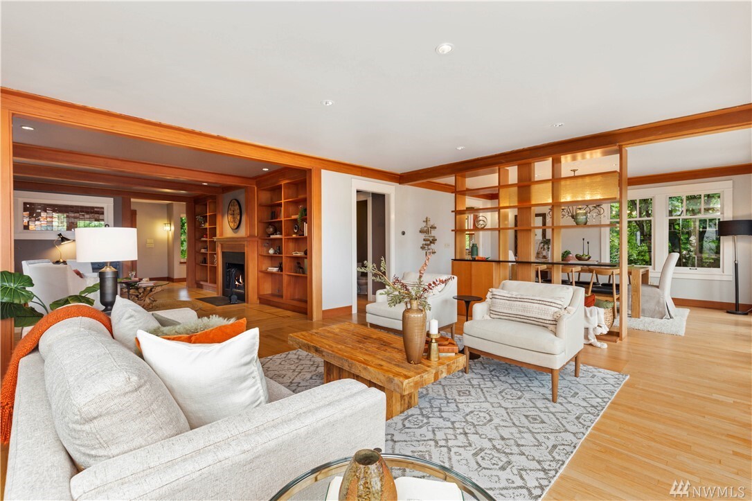 Only a short walk to Madrona, with popular spots such as Hi-Spot Cafe and Molly Moon's Ice Cream, your Pacific NW Denny Blaine home awaits! Perched prominently above the street and surrounded by lush landscaping and fruit trees, you’ll feel far away from the city, yet you're amidst greenbelt trails, less than half a mile from the lake, and about a dozen minutes to downtown. Remodeled in 1993 by Seattle builder Jerry Fulks, you’re welcomed with intricate woodwork throughout, beautiful hardwood floors and custom built-ins. Walls of windows and French doors that open to your expansive entertaining sized deck, with stunning views of Lake Washington and the Cascades, providing an ideal setting for indoor/outdoor entertaining. One-of-a-kind!