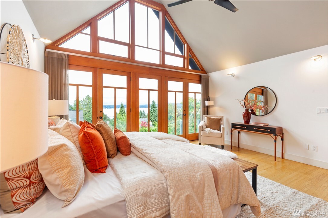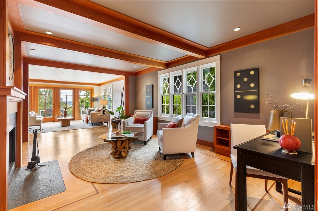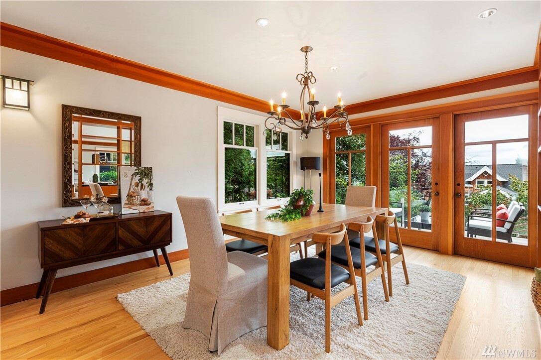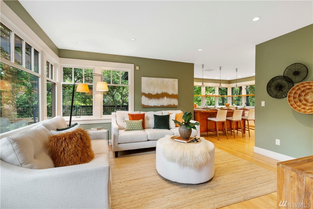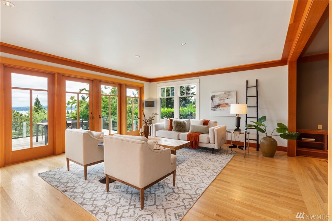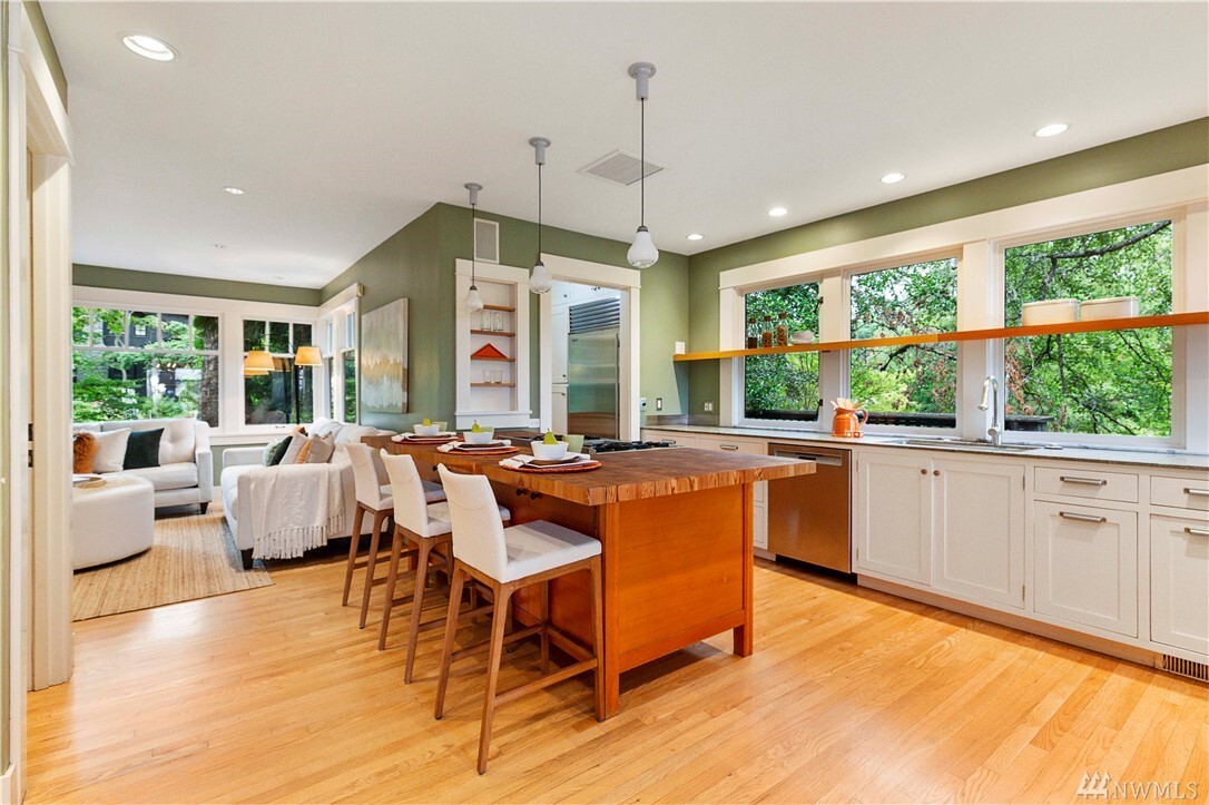 Only a short walk to Madrona, with popular spots such as Hi-Spot Cafe and Molly Moon's Ice Cream, your Pacific NW Denny Blaine home awaits! Perched prominently above the street and surrounded by lush landscaping and fruit trees, you’ll feel far away from the city, yet you're amidst greenbelt trails, less than half a mile from the lake, and about a dozen minutes to downtown. Remodeled in 1993 by Seattle builder Jerry Fulks, you’re welcomed with intricate woodwork throughout, beautiful hardwood floors and custom built-ins. Walls of windows and French doors that open to your expansive entertaining sized deck, with stunning views of Lake Washington and the Cascades, providing an ideal setting for indoor/outdoor entertaining. One-of-a-kind!