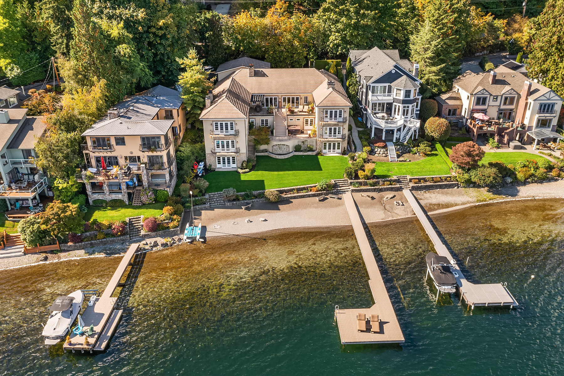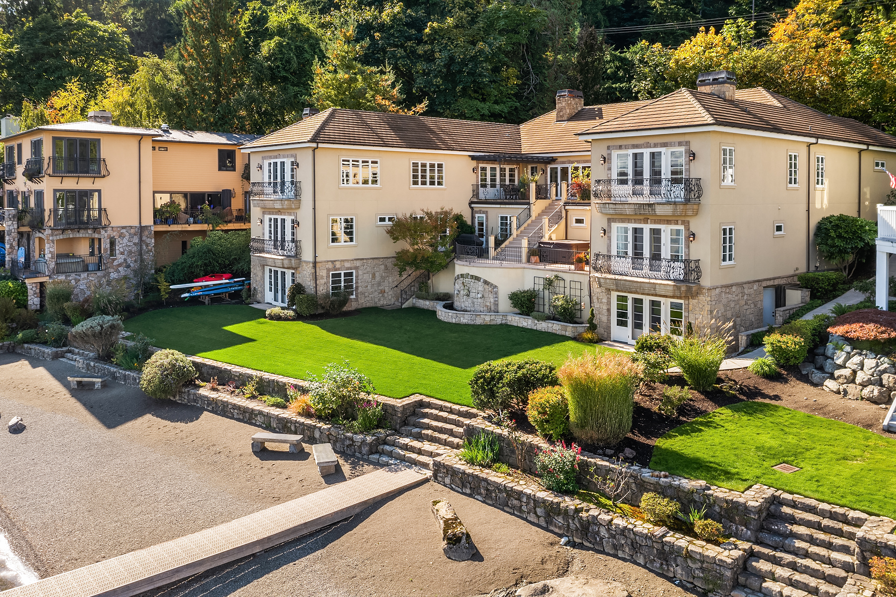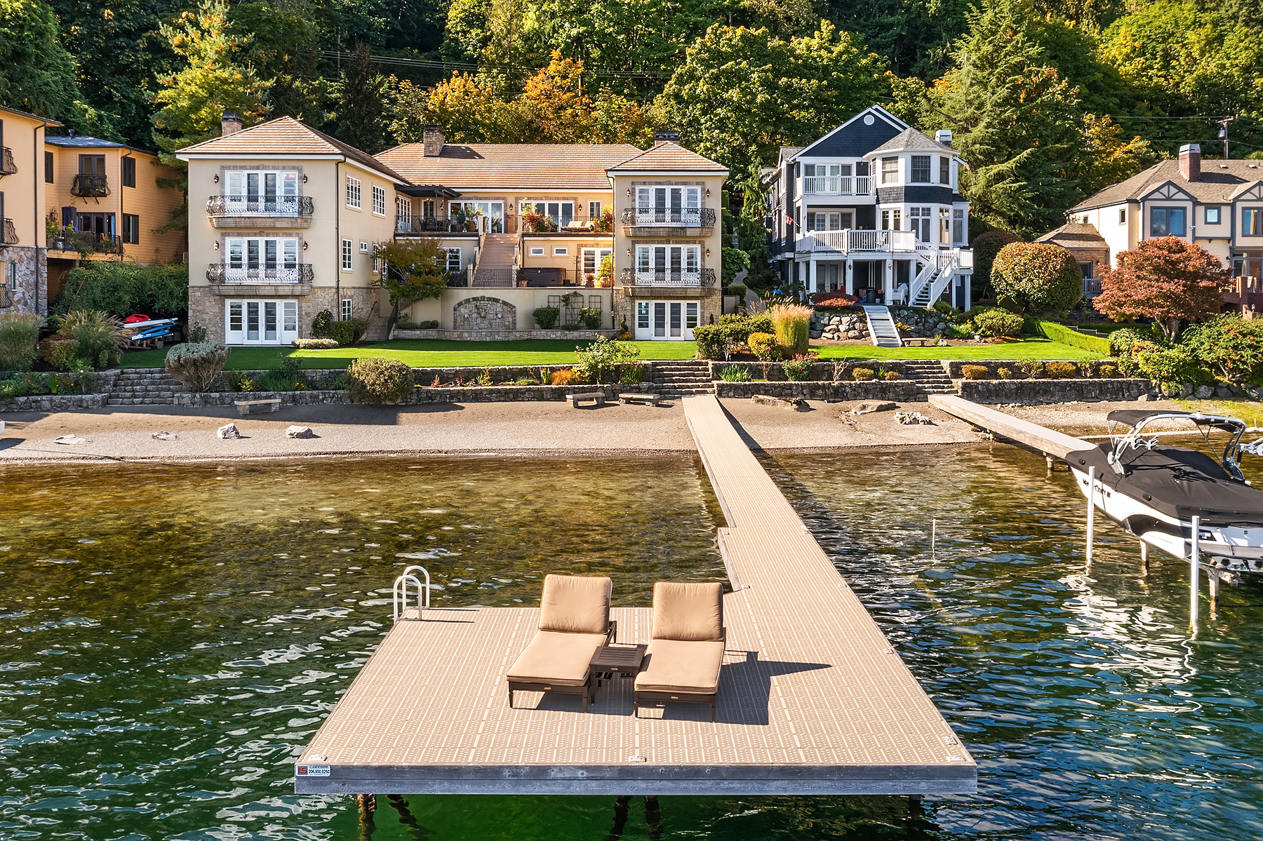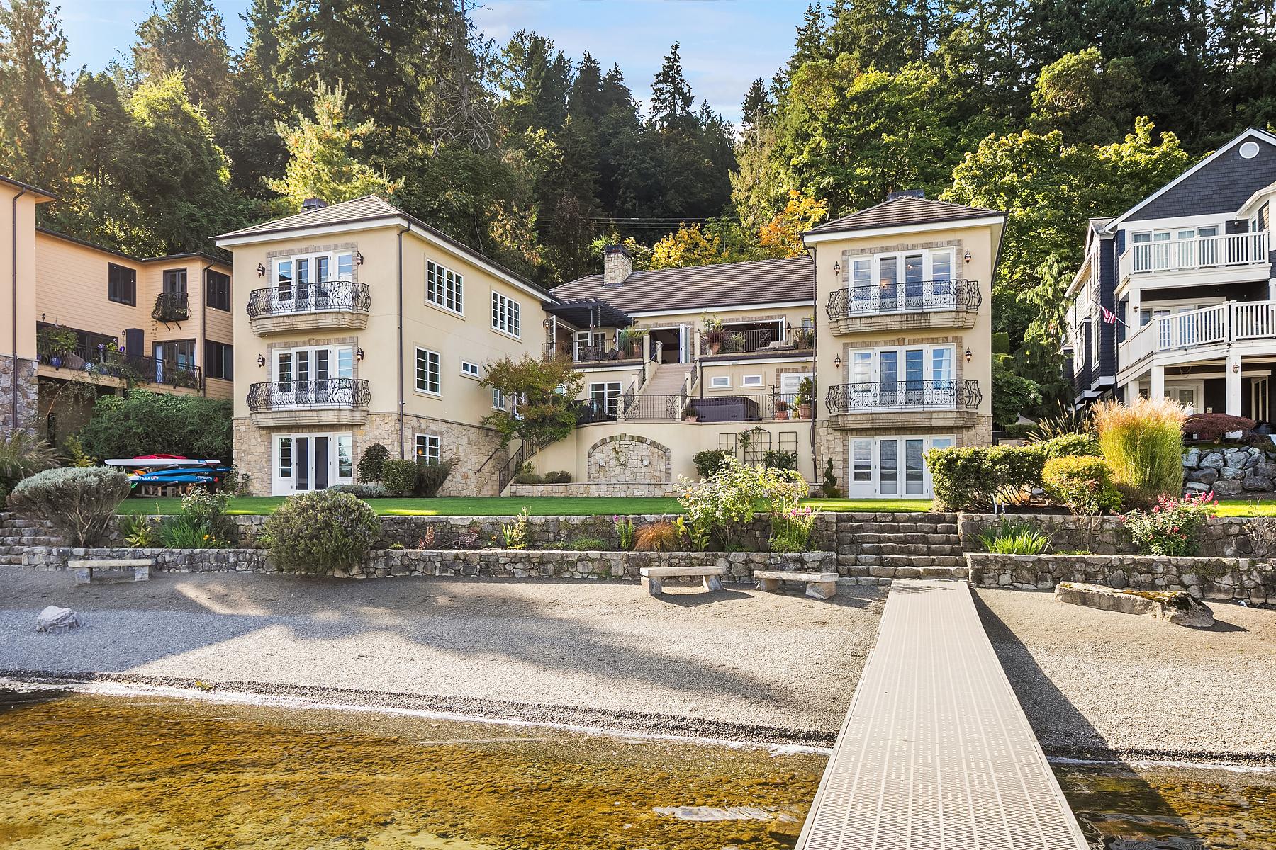 Elevated Contemporary Mediterranean design imbues this bespoke Lake Sammamish Waterfront home with distinctive character, melding gracious architectural proportions, curated finishes and state-of-the-art systems. Shy 1/2 acre, level, street-to-shore lot offers 97' of waterfront, expansive dock, boat lift, extensive beach, two tier bulkhead, meticulous lawn. Lake views from almost every room! U-shaped floor plan, voluminous great room, 19' beamed ceilings, triple set of NanaWall doors open to terraces sheltered from neighbors, wind and sound. Impeccably chosen finishes include wrought iron railings, cased windows, furniture grade built-ins and quarter sawn wide plank French oak hardwoods. Smart Control4 security, climate, media and lighting.