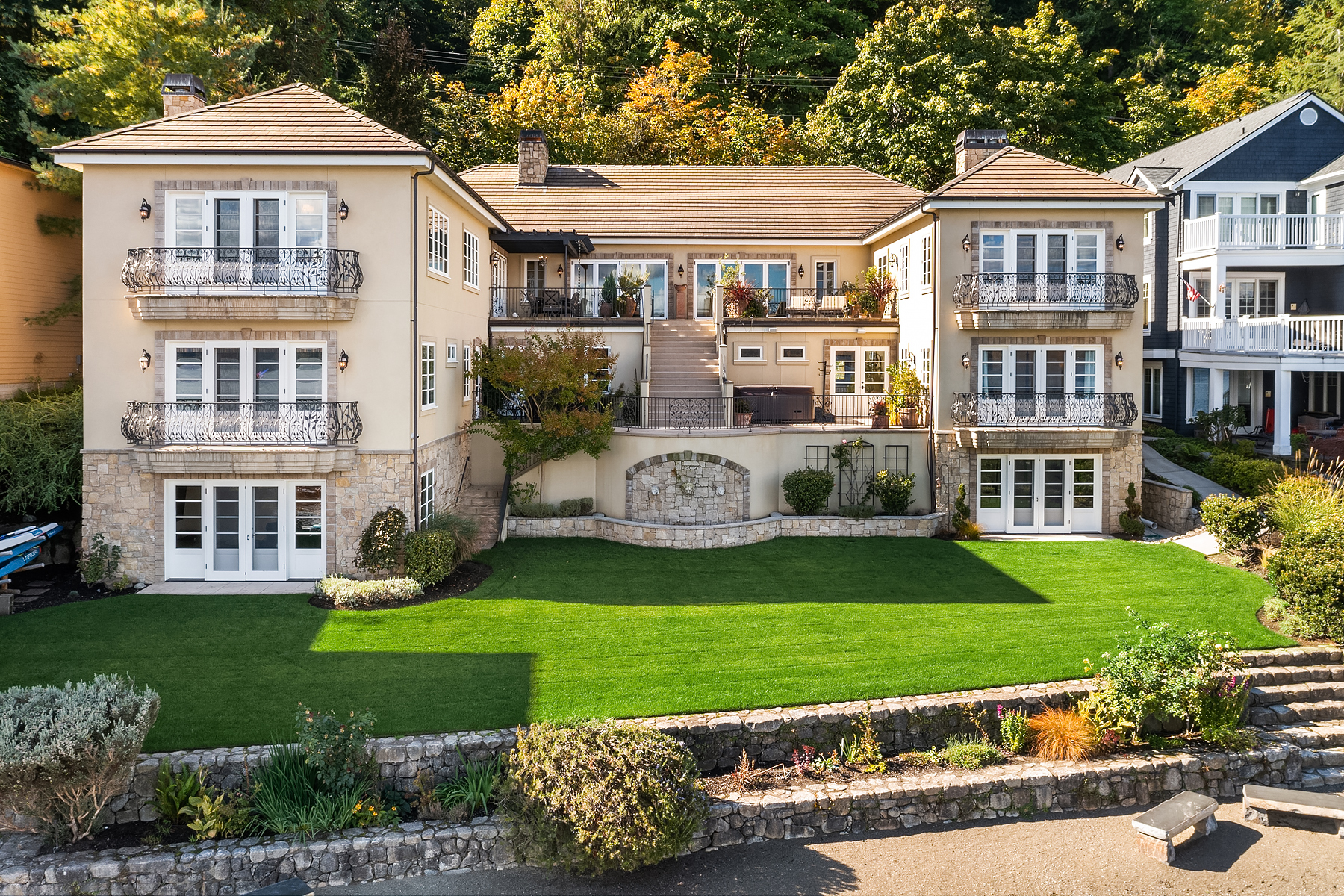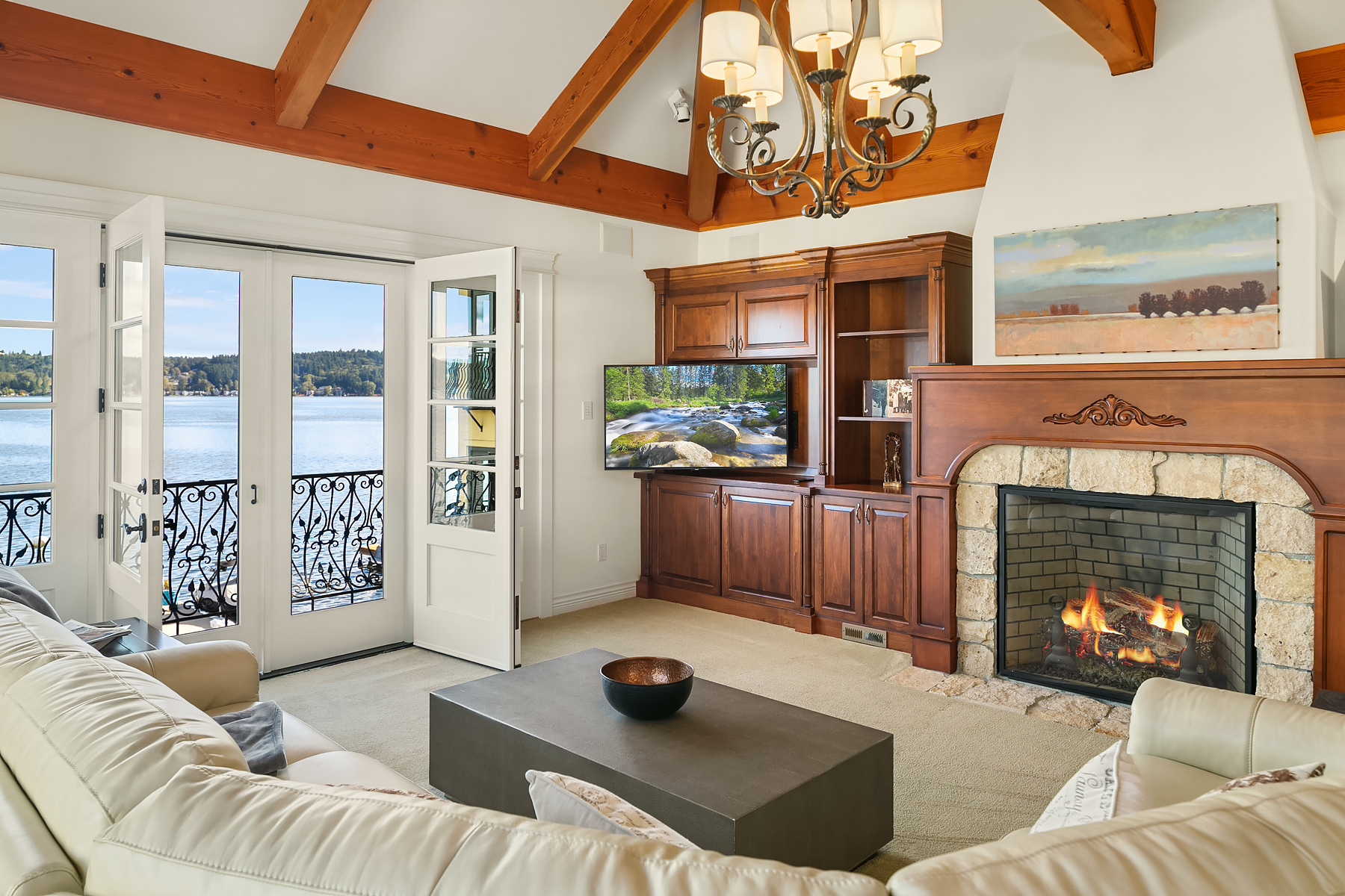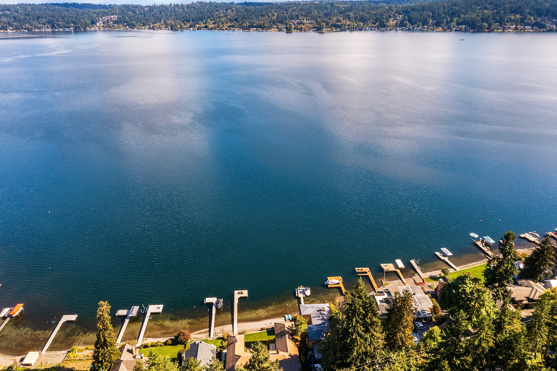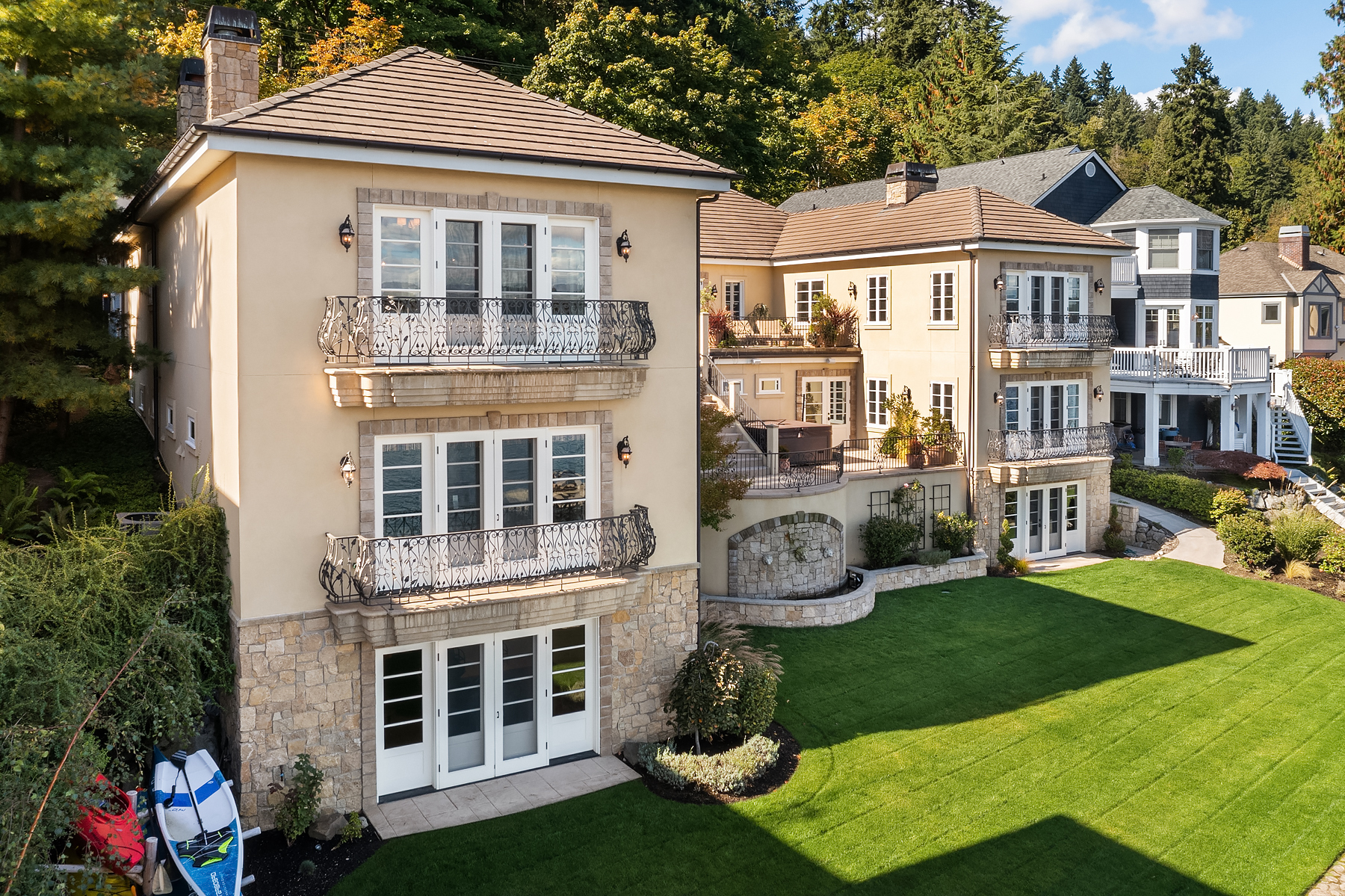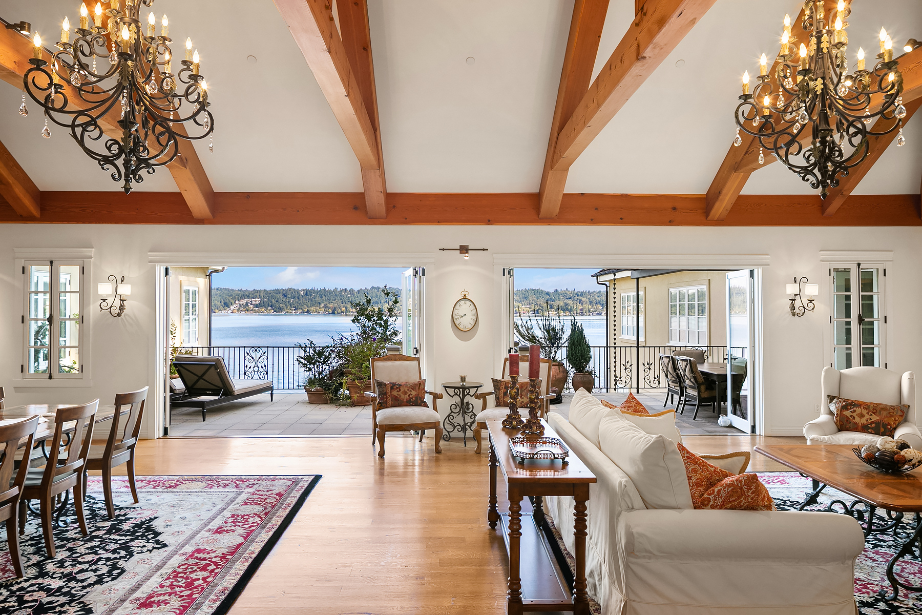 Elevated Contemporary Mediterranean design imbues this bespoke Lake Sammamish Waterfront home with distinctive character, melding gracious architectural proportions, curated finishes and state-of-the-art systems. Shy 1/2 acre, level, street-to-shore lot offers 97' of waterfront, expansive dock, boat lift, extensive beach, two tier bulkhead, meticulous lawn. Lake views from almost every room! U-shaped floor plan, voluminous great room, 19' beamed ceilings, triple set of NanaWall doors open to terraces sheltered from neighbors, wind and sound. Impeccably chosen finishes include wrought iron railings, cased windows, furniture grade built-ins and quarter sawn wide plank French oak hardwoods. Smart Control4 security, climate, media and lighting.