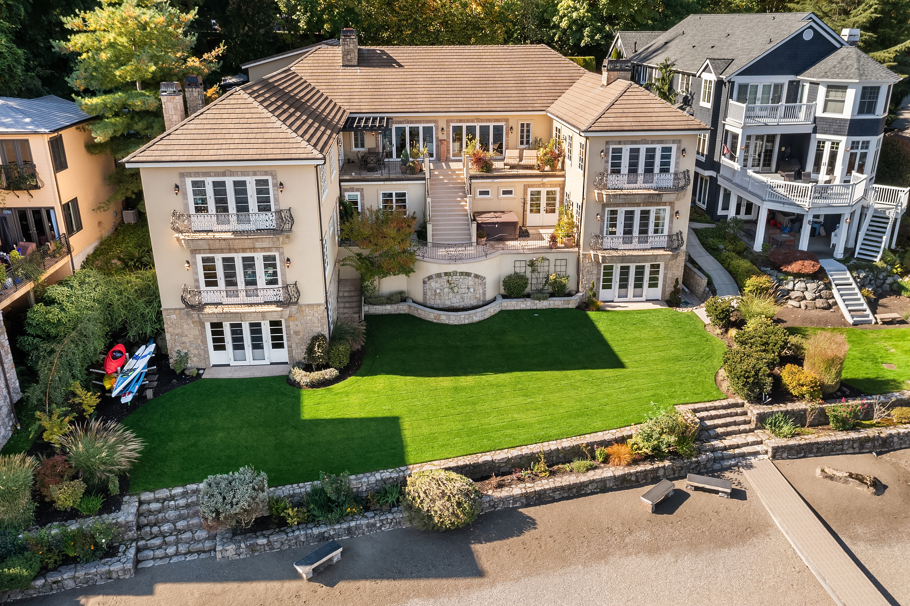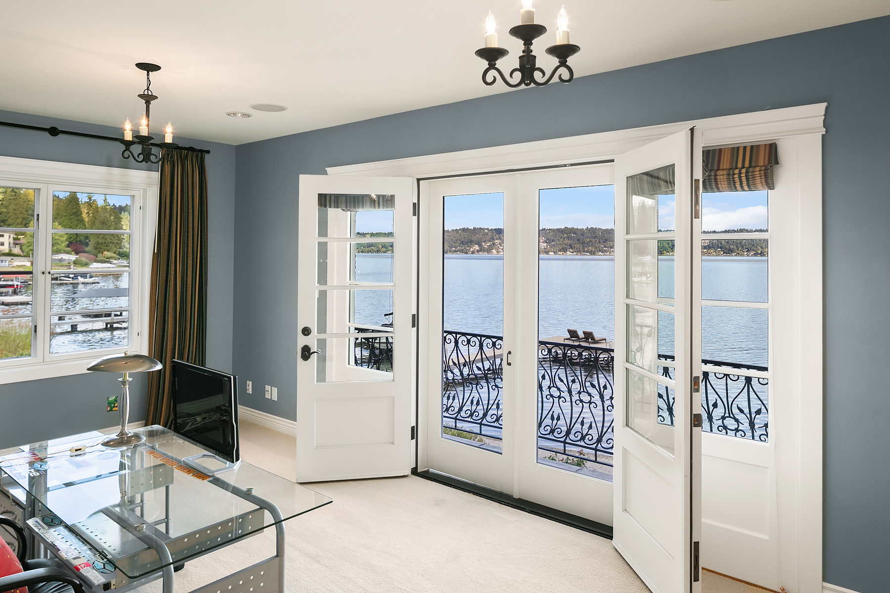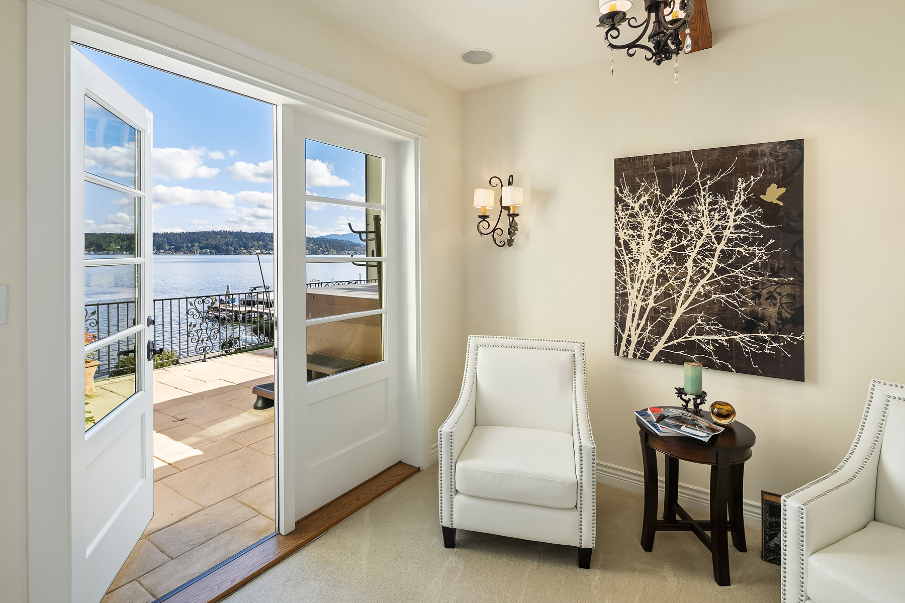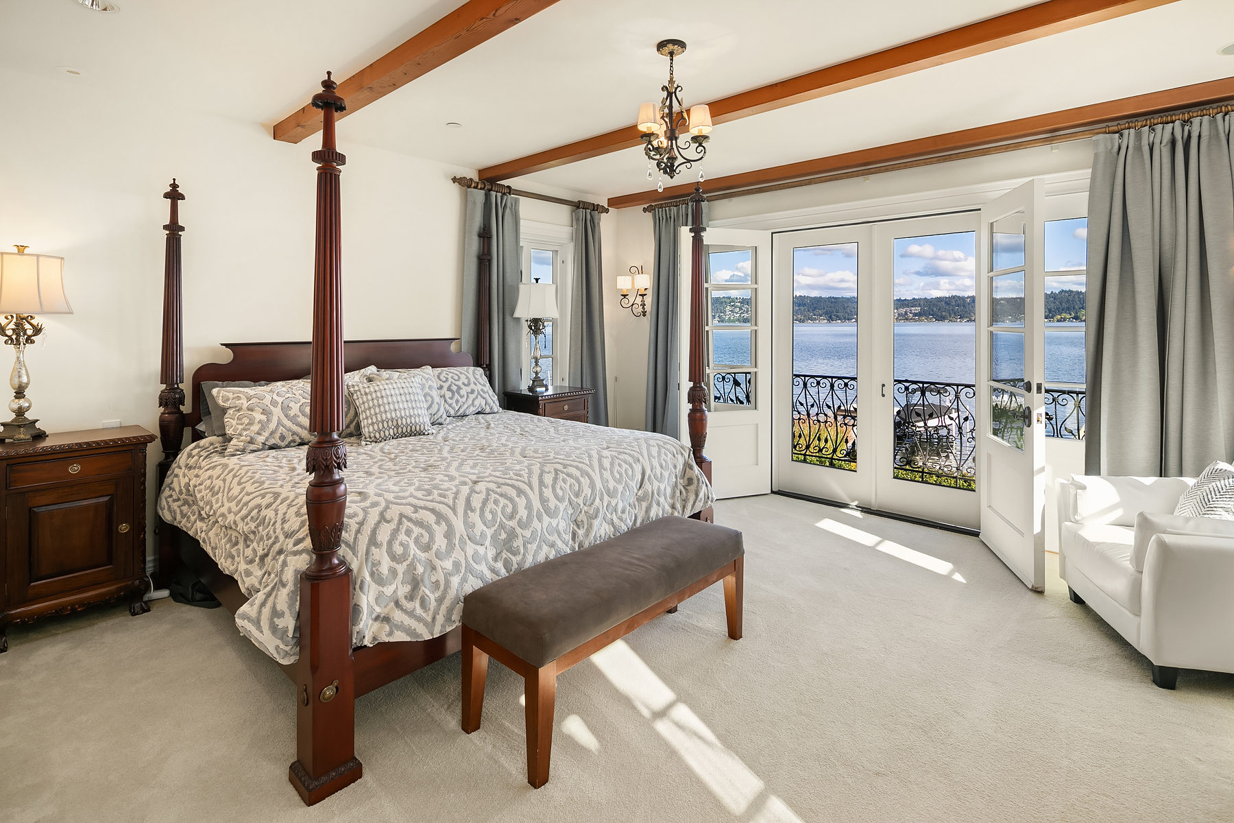 Elevated Contemporary Mediterranean design imbues this bespoke Lake Sammamish Waterfront home with distinctive character, melding gracious architectural proportions, curated finishes and state-of-the-art systems. Shy 1/2 acre, level, street-to-shore lot offers 97' of waterfront, expansive dock, boat lift, extensive beach, two tier bulkhead, meticulous lawn. Lake views from almost every room! U-shaped floor plan, voluminous great room, 19' beamed ceilings, triple set of NanaWall doors open to terraces sheltered from neighbors, wind and sound. Impeccably chosen finishes include wrought iron railings, cased windows, furniture grade built-ins and quarter sawn wide plank French oak hardwoods. Smart Control4 security, climate, media and lighting.