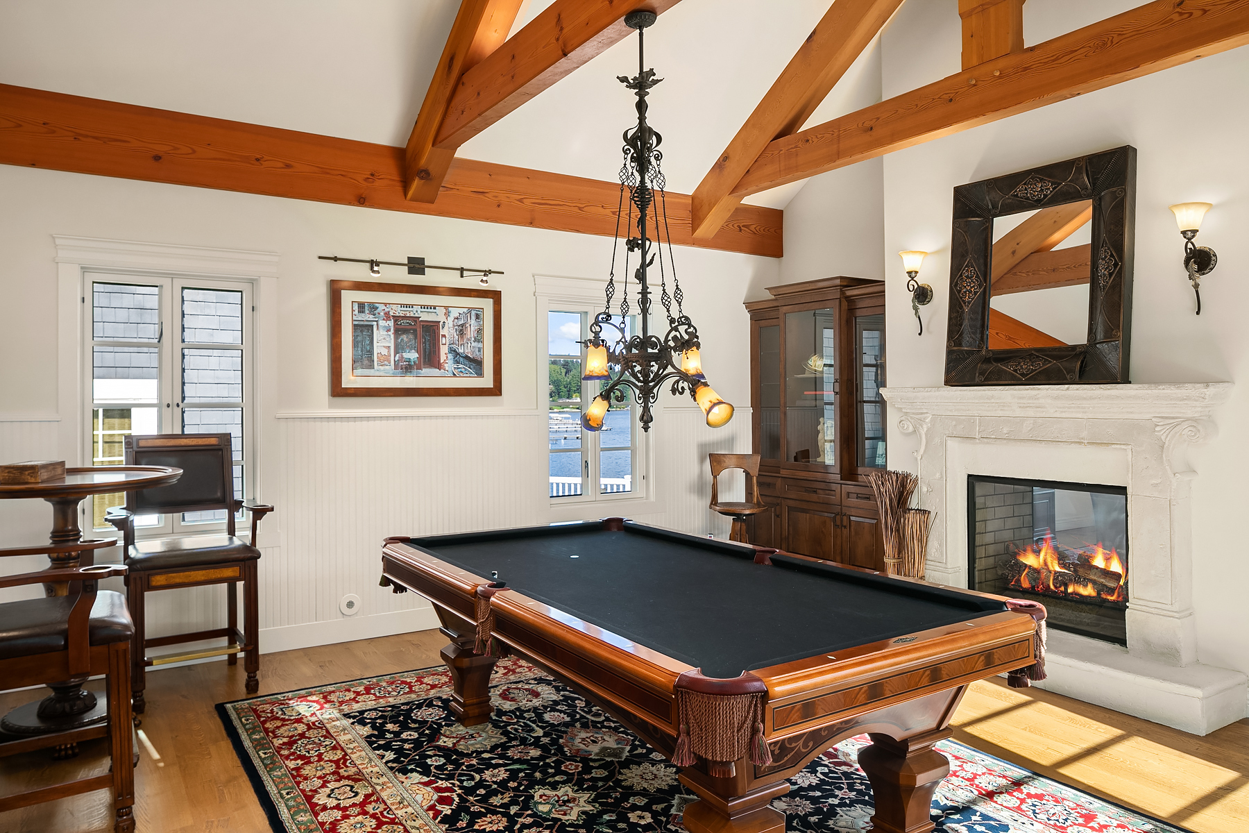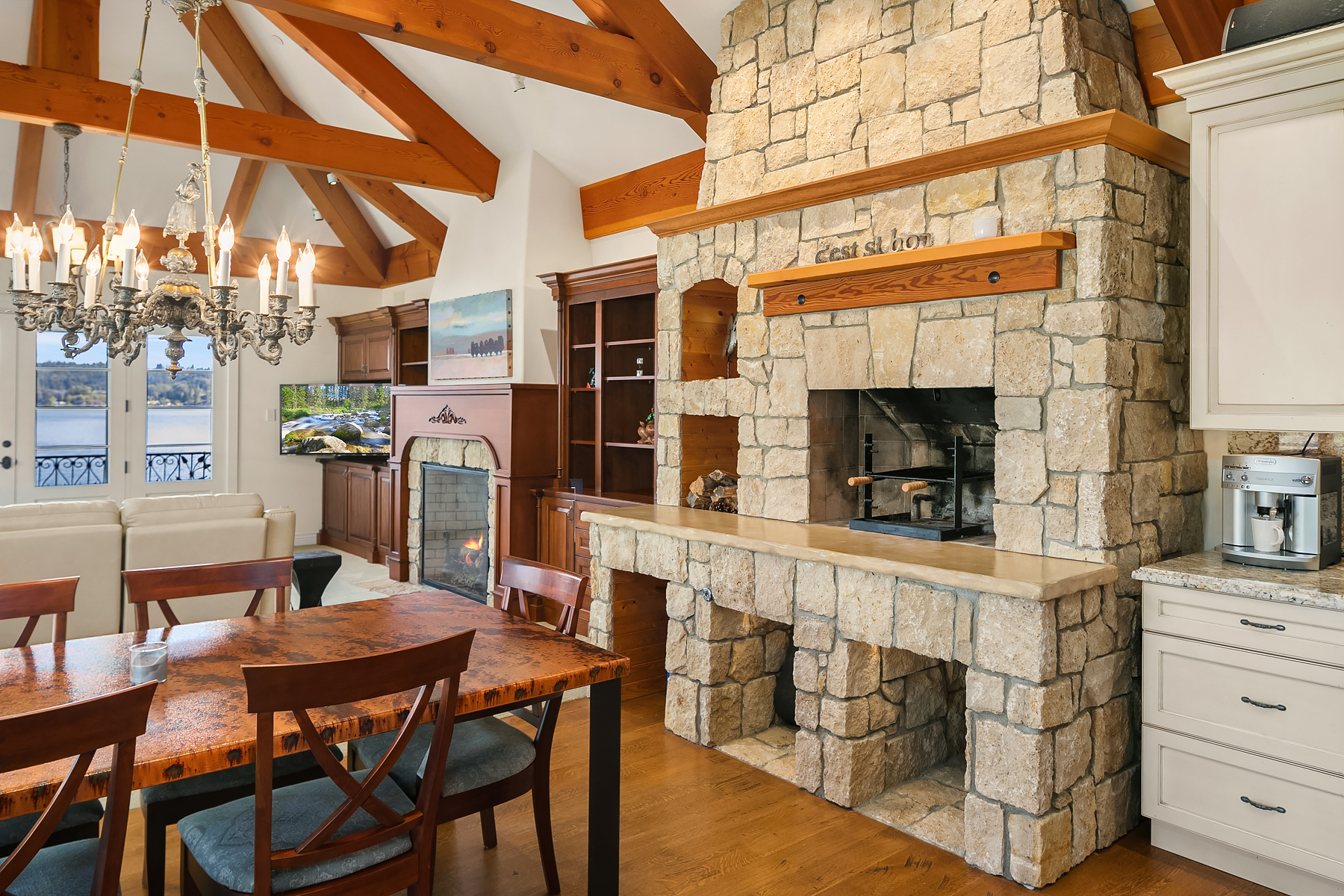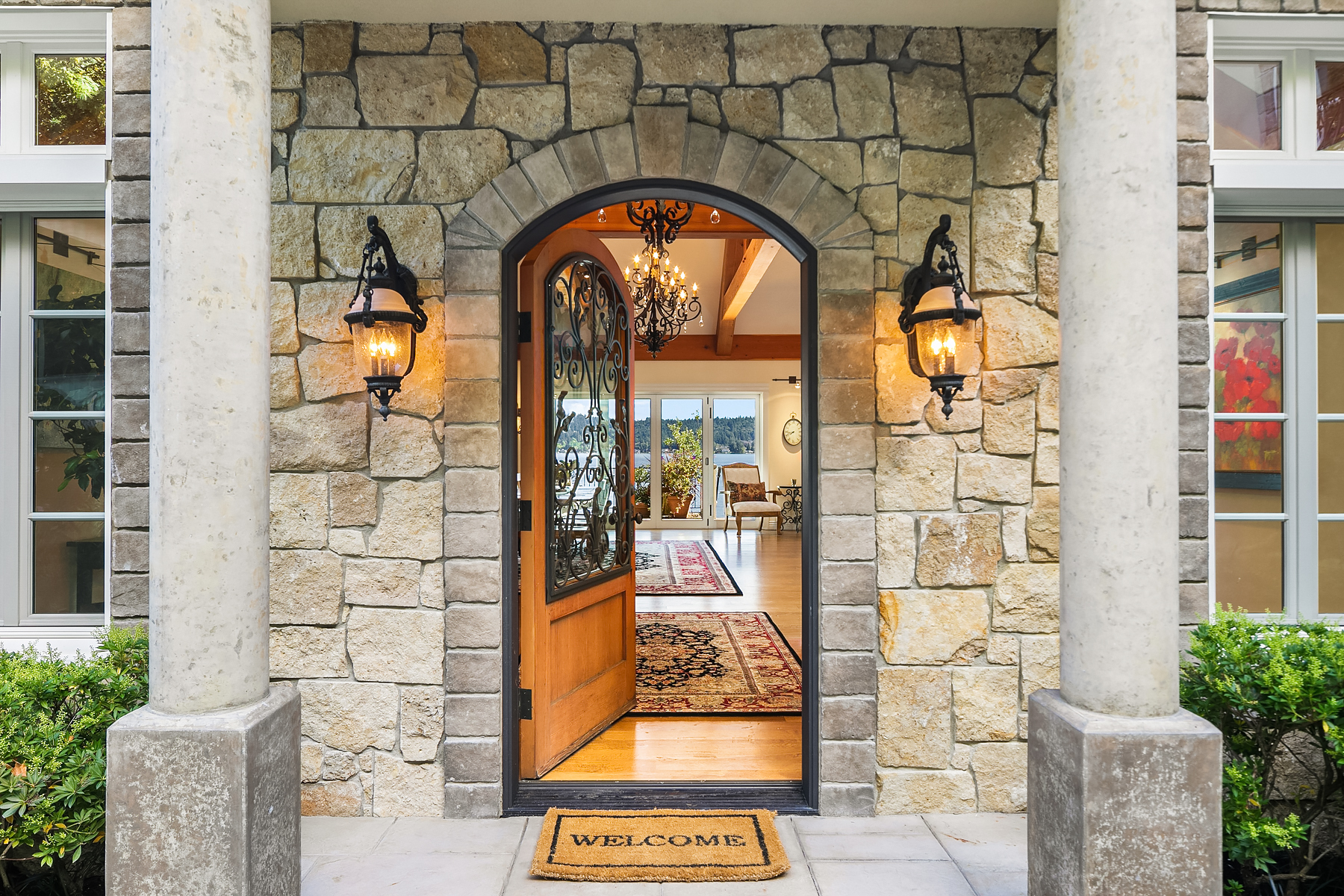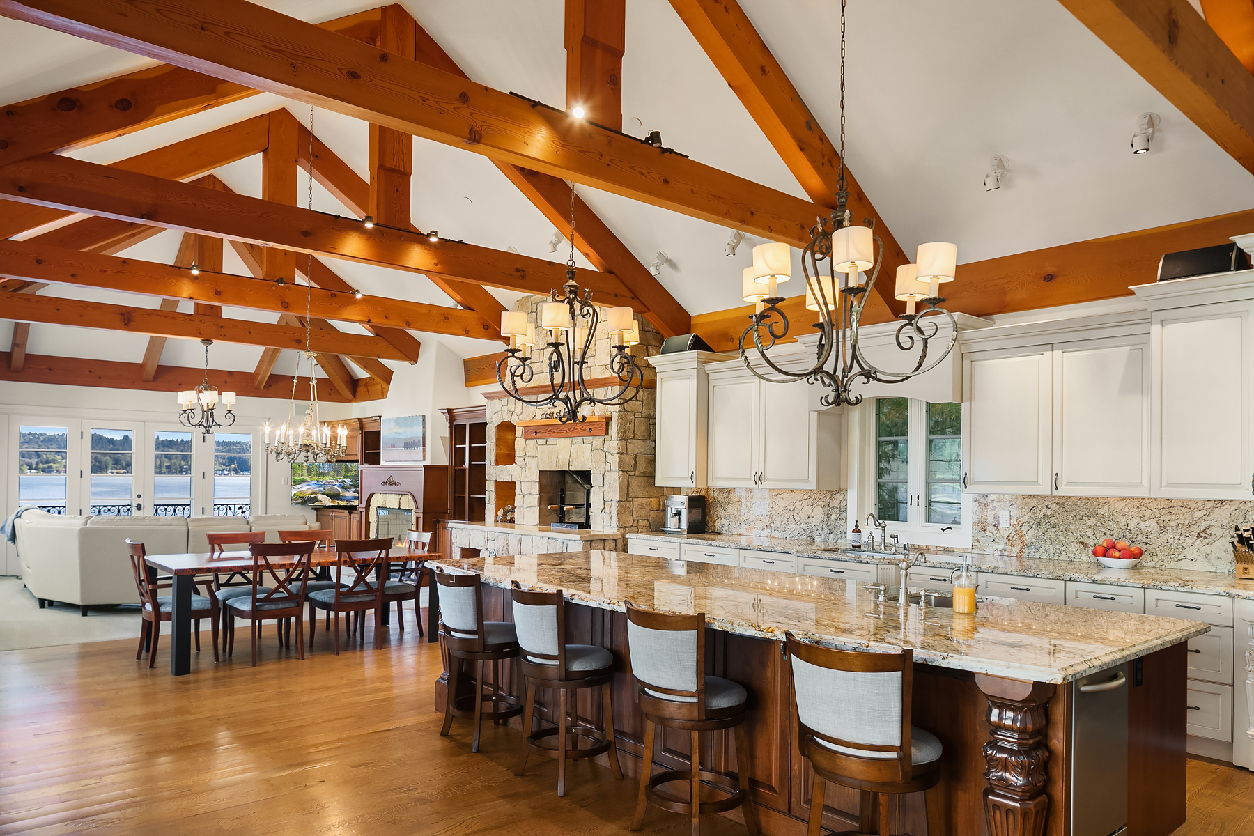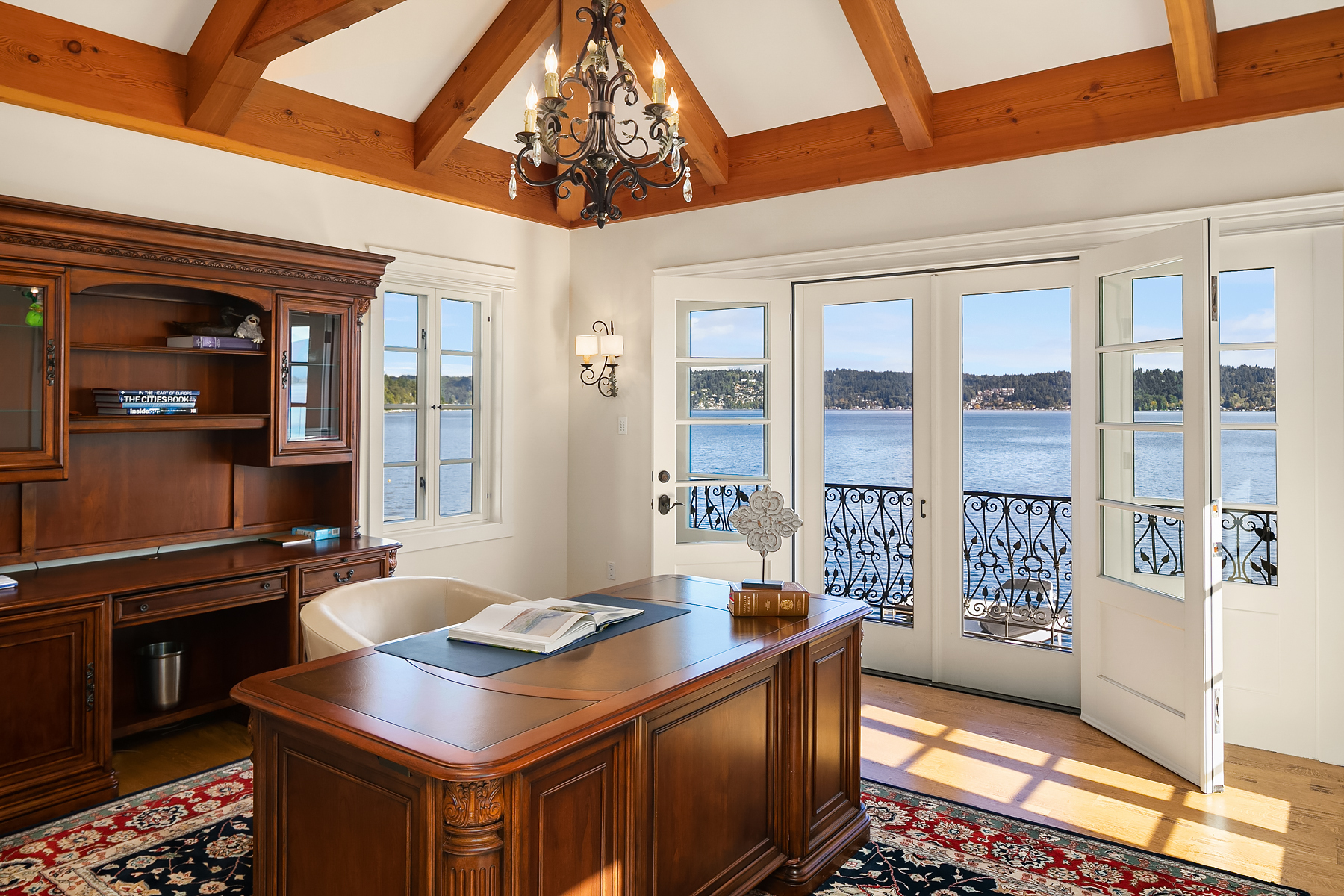 Elevated Contemporary Mediterranean design imbues this bespoke Lake Sammamish Waterfront home with distinctive character, melding gracious architectural proportions, curated finishes and state-of-the-art systems. Shy 1/2 acre, level, street-to-shore lot offers 97' of waterfront, expansive dock, boat lift, extensive beach, two tier bulkhead, meticulous lawn. Lake views from almost every room! U-shaped floor plan, voluminous great room, 19' beamed ceilings, triple set of NanaWall doors open to terraces sheltered from neighbors, wind and sound. Impeccably chosen finishes include wrought iron railings, cased windows, furniture grade built-ins and quarter sawn wide plank French oak hardwoods. Smart Control4 security, climate, media and lighting.