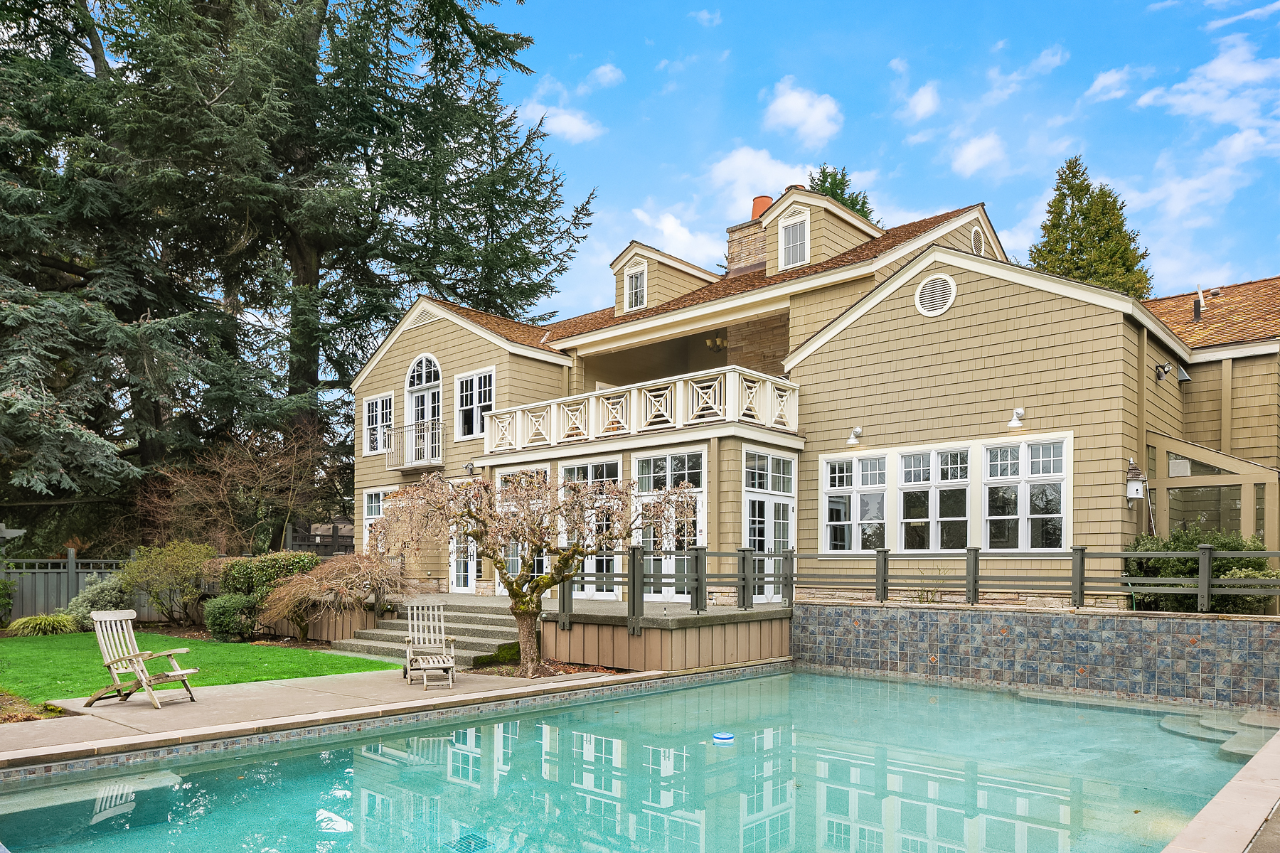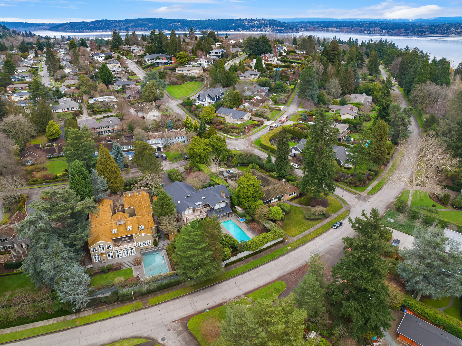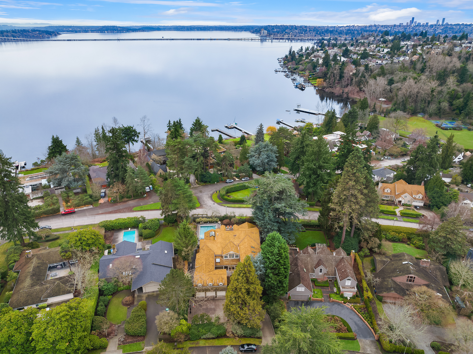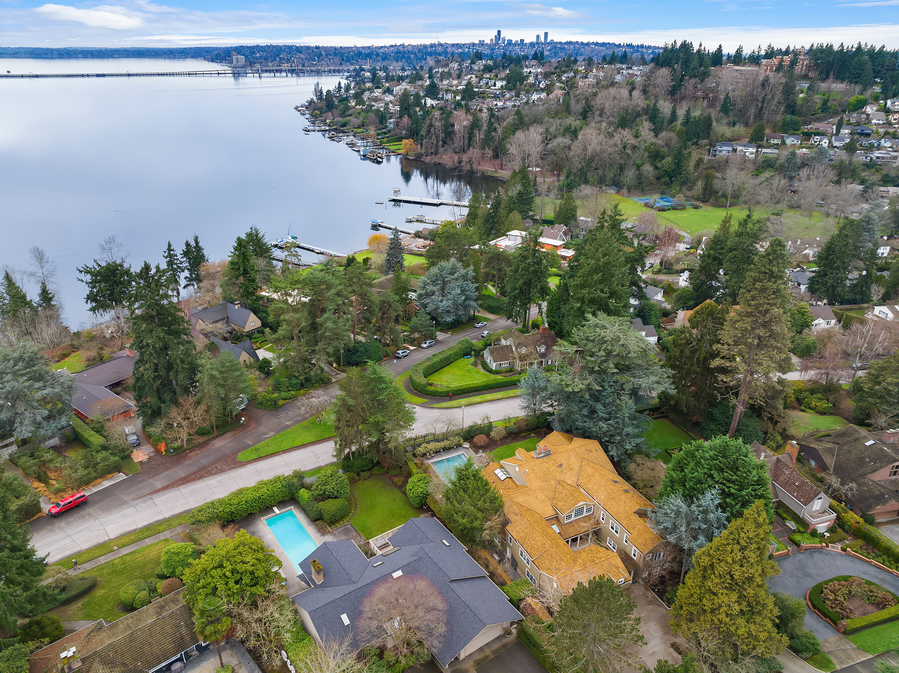Majestic street to street Windermere home with restful views of Lake Washington. Stepping into the stone courtyard, you are encompassed by peaceful grandeur. The spacious formal living room and dining room blend seamlessly with the entertainment-sized kitchen and family room with a wall of french doors that leads to the lush fully fenced backyard and in-ground pool. The updated, bright kitchen features gorgeous granite counters, massive island, high end appliances, dual dishwashers and a butler's pantry. Main floor primary suite with exquisite bath, fireplace and french doors to the backyard patio. Upstairs, a dedicated media room and loft-style game room with pool table open to a covered view deck. Windermere Beach Club eligible!
