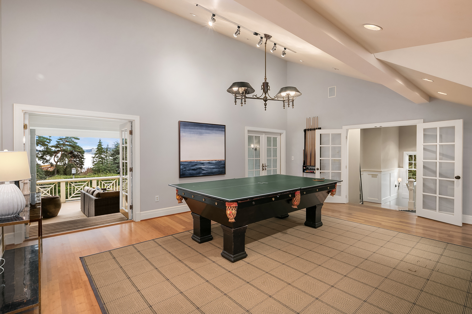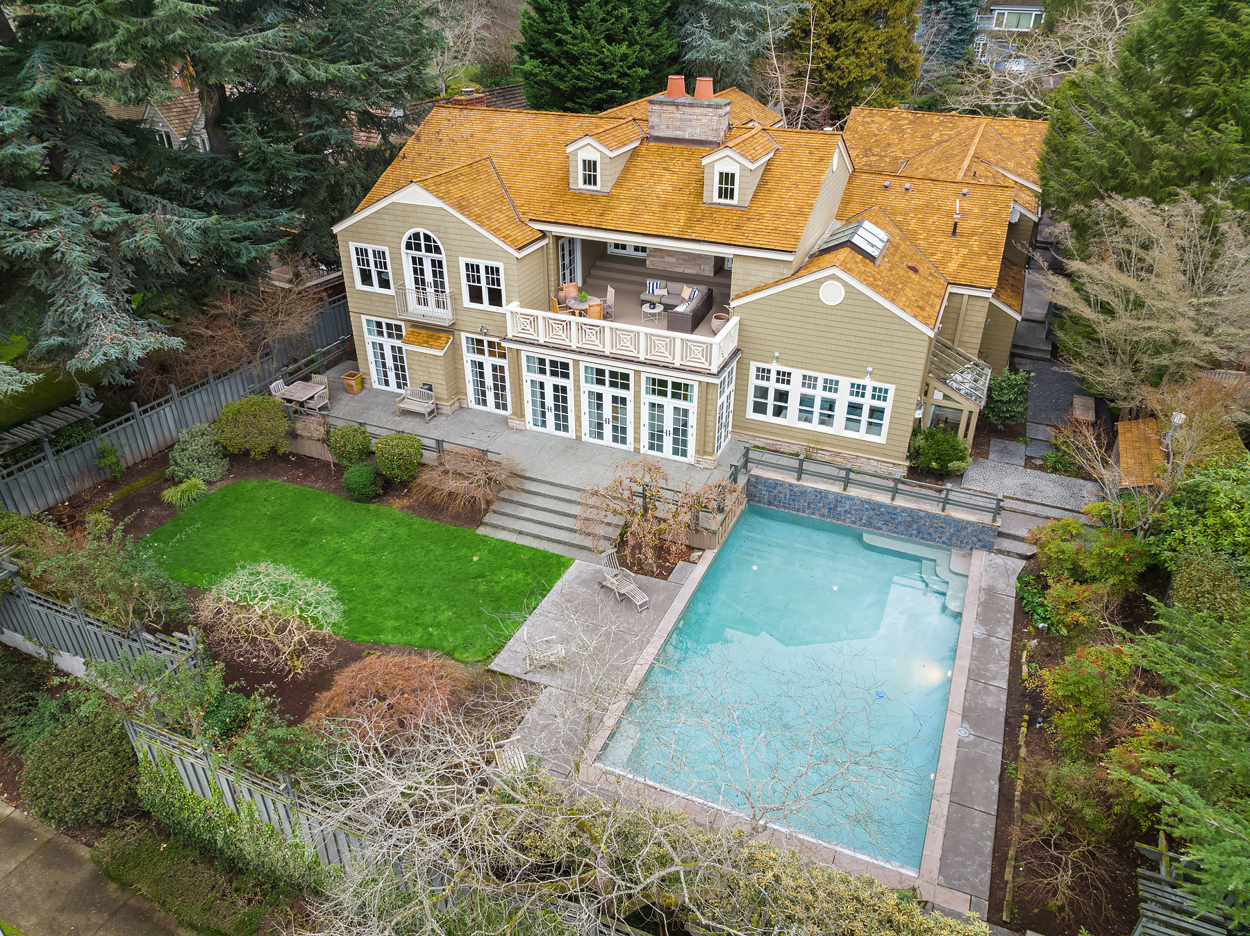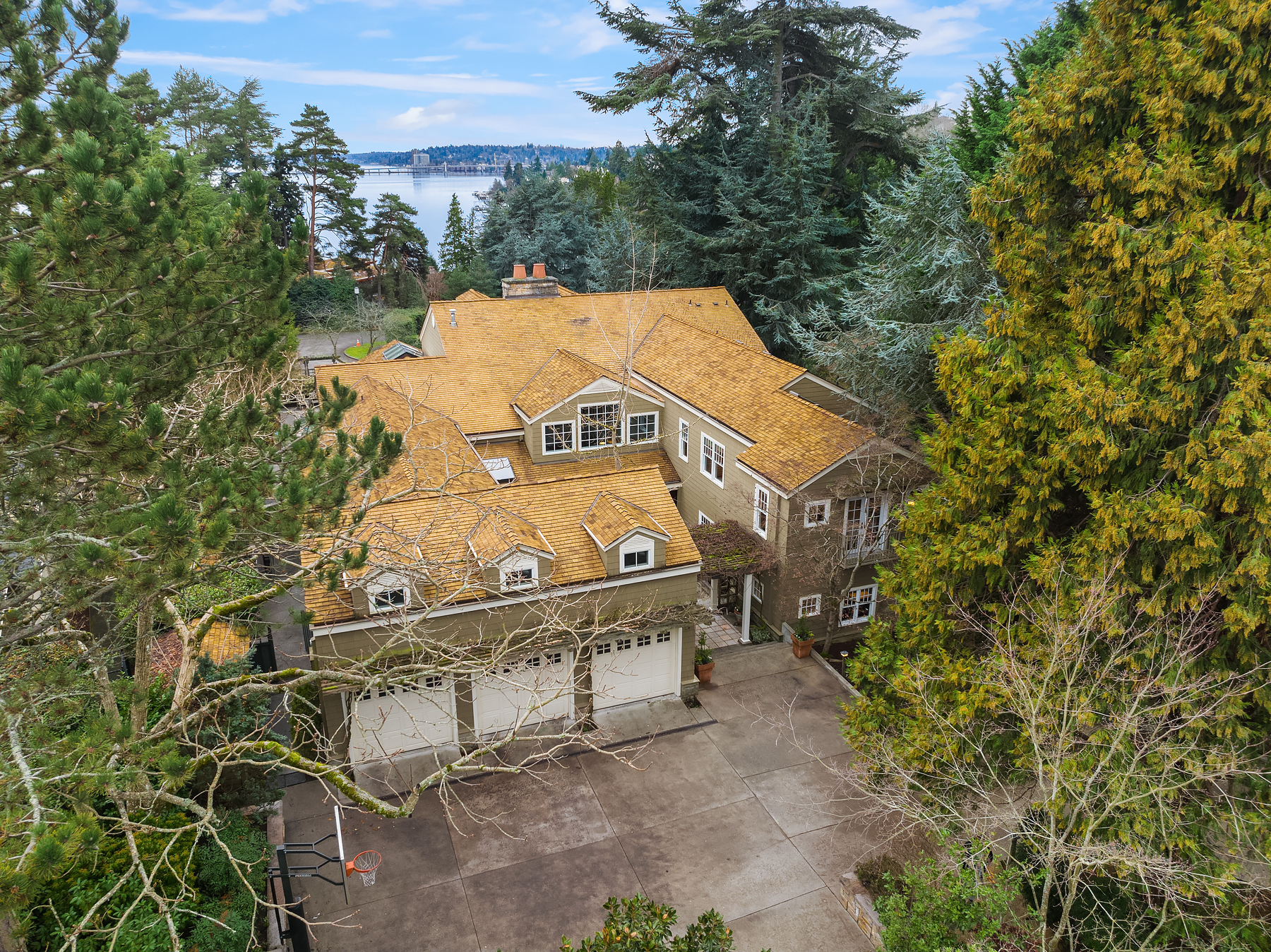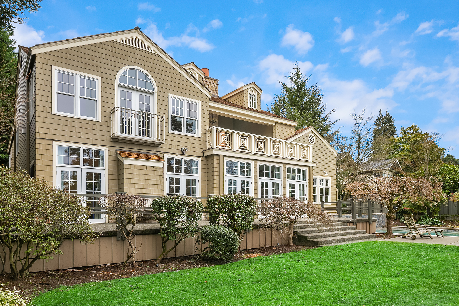 Majestic street to street Windermere home with restful views of Lake Washington. Stepping into the stone courtyard, you are encompassed by peaceful grandeur. The spacious formal living room and dining room blend seamlessly with the entertainment-sized kitchen and family room with a wall of french doors that leads to the lush fully fenced backyard and in-ground pool. The updated, bright kitchen features gorgeous granite counters, massive island, high end appliances, dual dishwashers and a butler's pantry. Main floor primary suite with exquisite bath, fireplace and french doors to the backyard patio. Upstairs, a dedicated media room and loft-style game room with pool table open to a covered view deck. Windermere Beach Club eligible!