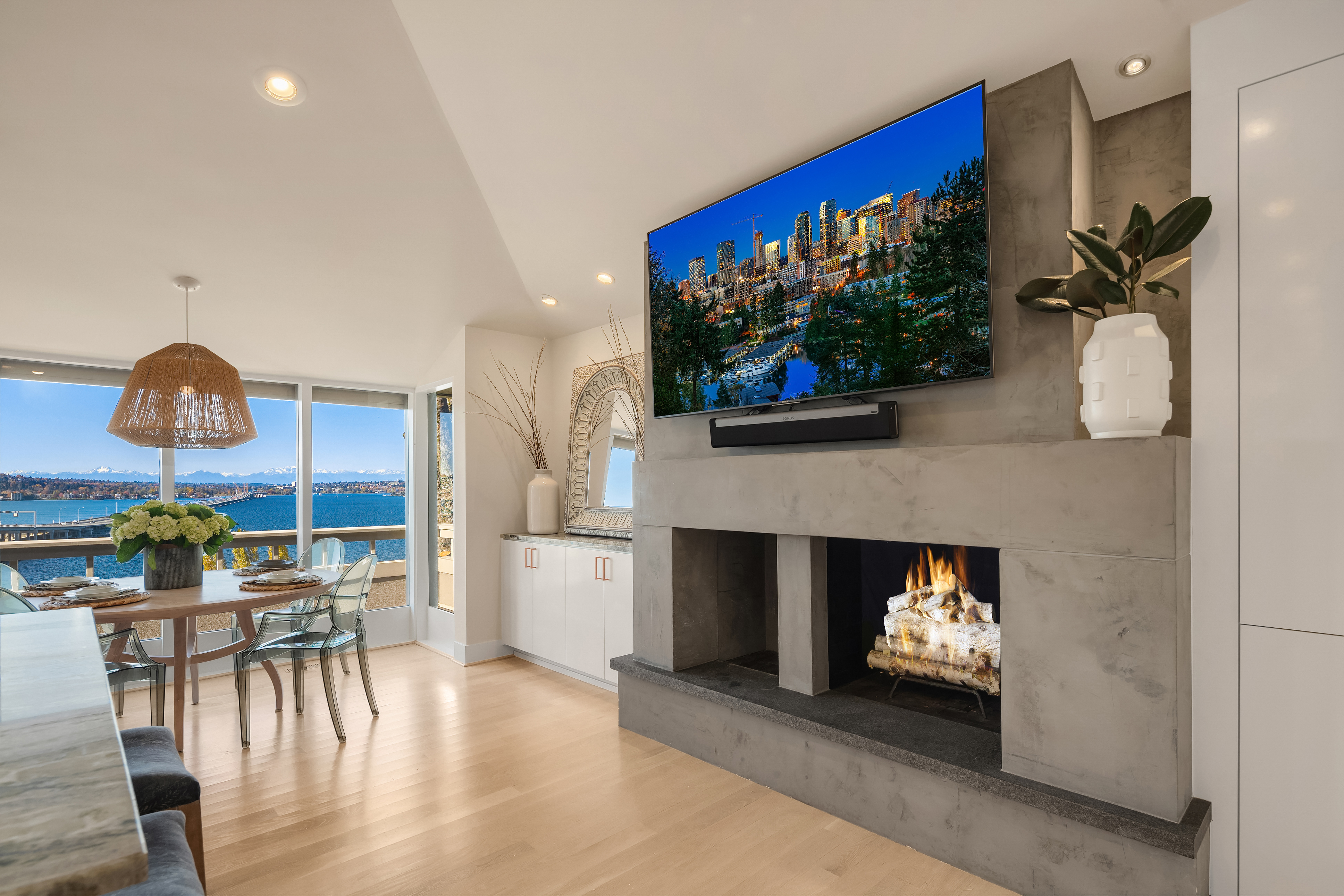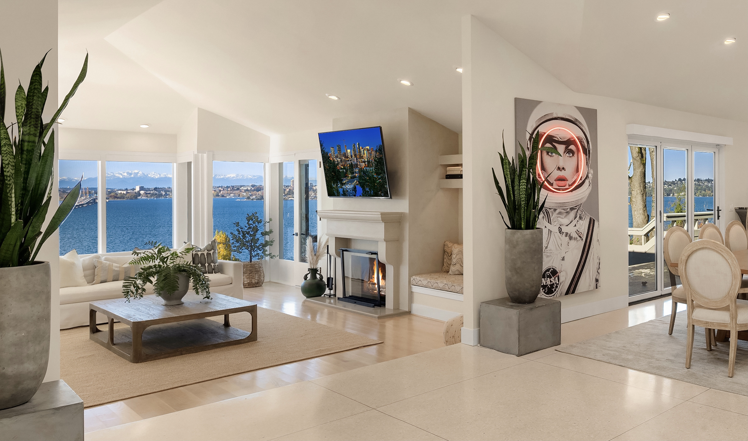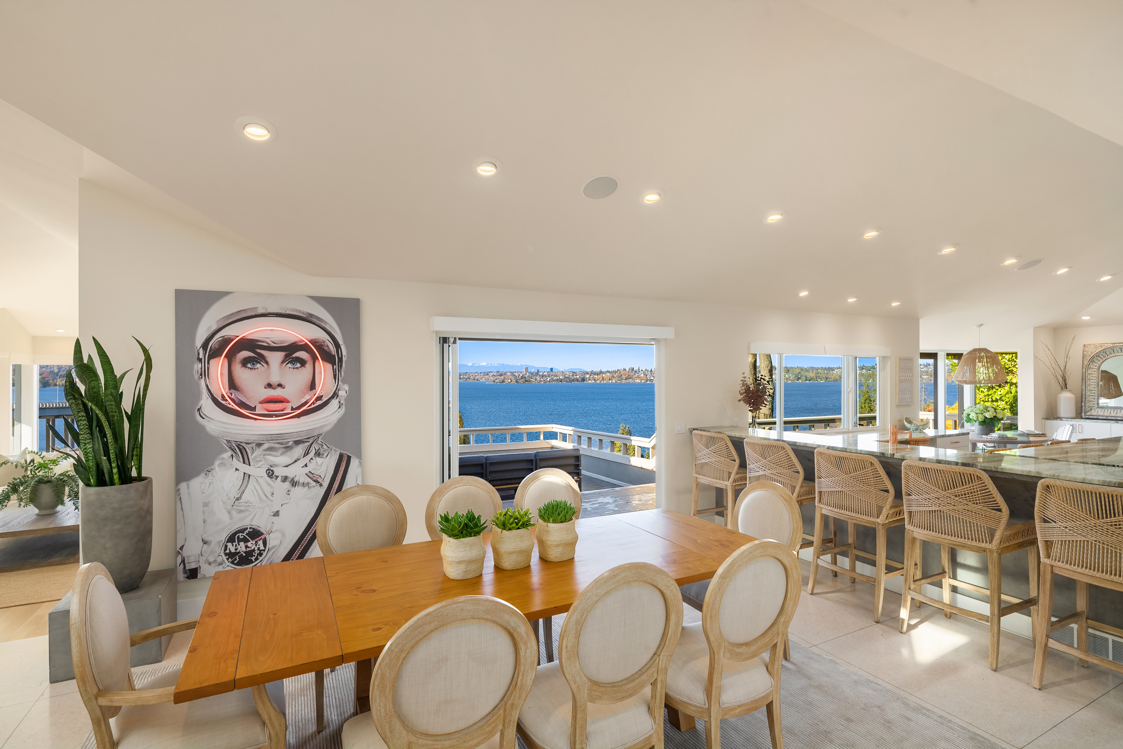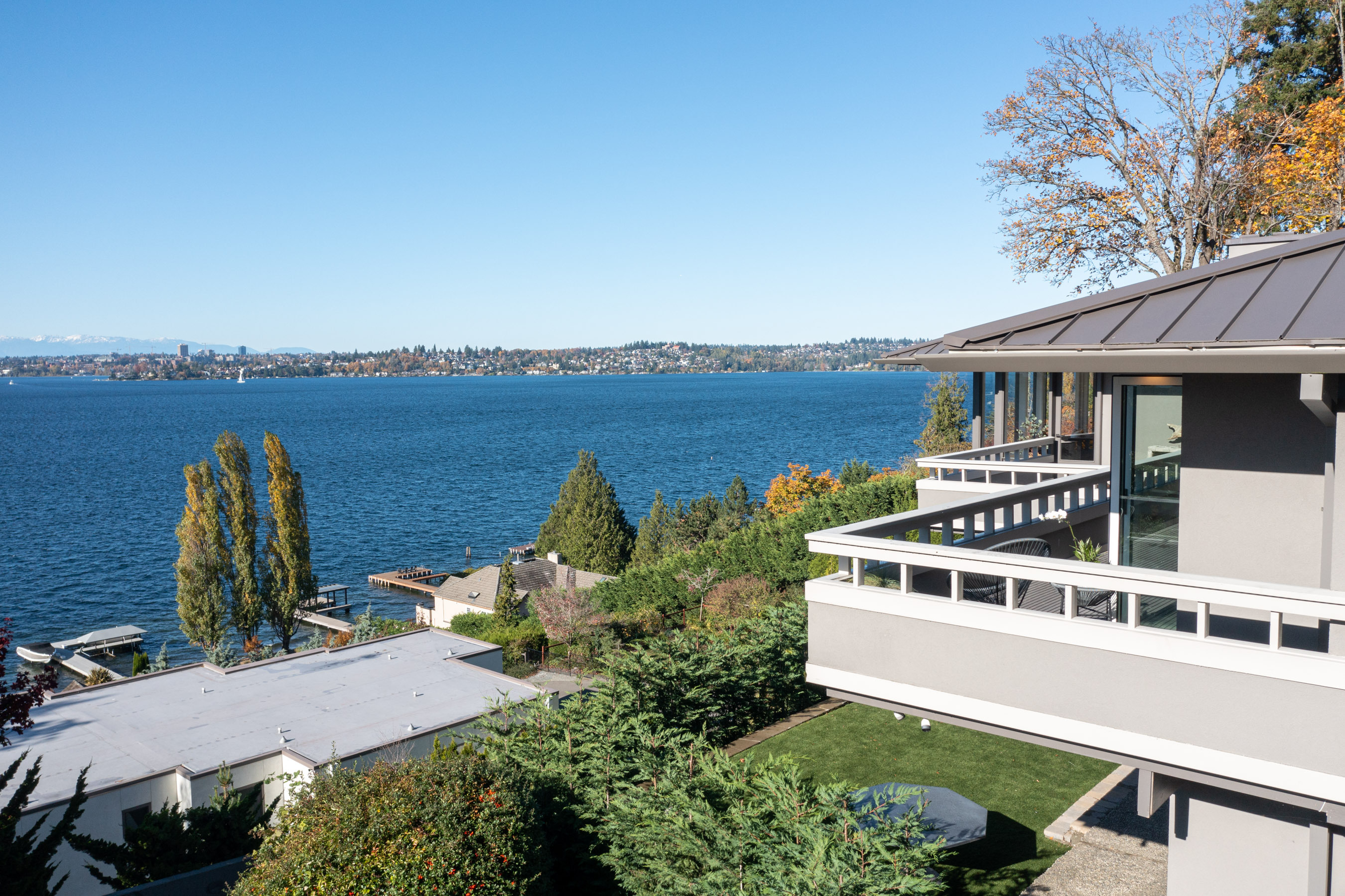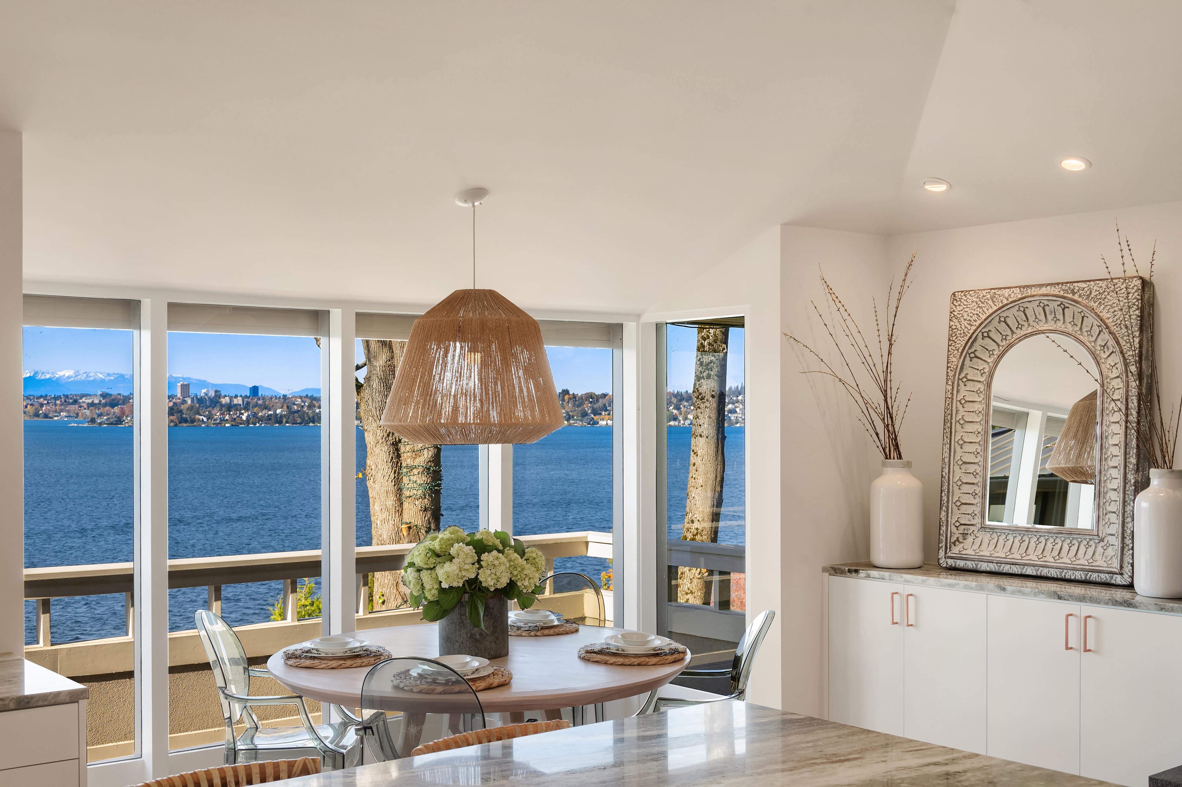 Unrivaled 180 degree views of Lk WA, Seattle skyline & Olympic Mnts, this house is perfect for those who value style, entertaining & quality. This 1964 Ralph Anderson original has been completely renovated all while keeping true to it’s original architecture. From the handpicked statement wallpaper to the unique light fixtures, no detail was spared. A seamless floor plan balances grand living spaces w/ an intimate setting, perfect for dinner parties of 8 and expansion of larger gatherings anytime of year. Main floor primary with spa-like bath featuring soaking tub, steam shower & custom closet creates an owner’s retreat. Space outdoors for all of your activities, easement to use shared waterfront and dock - it doesn’t get better than this.