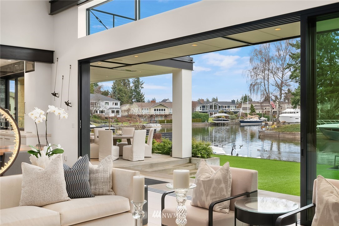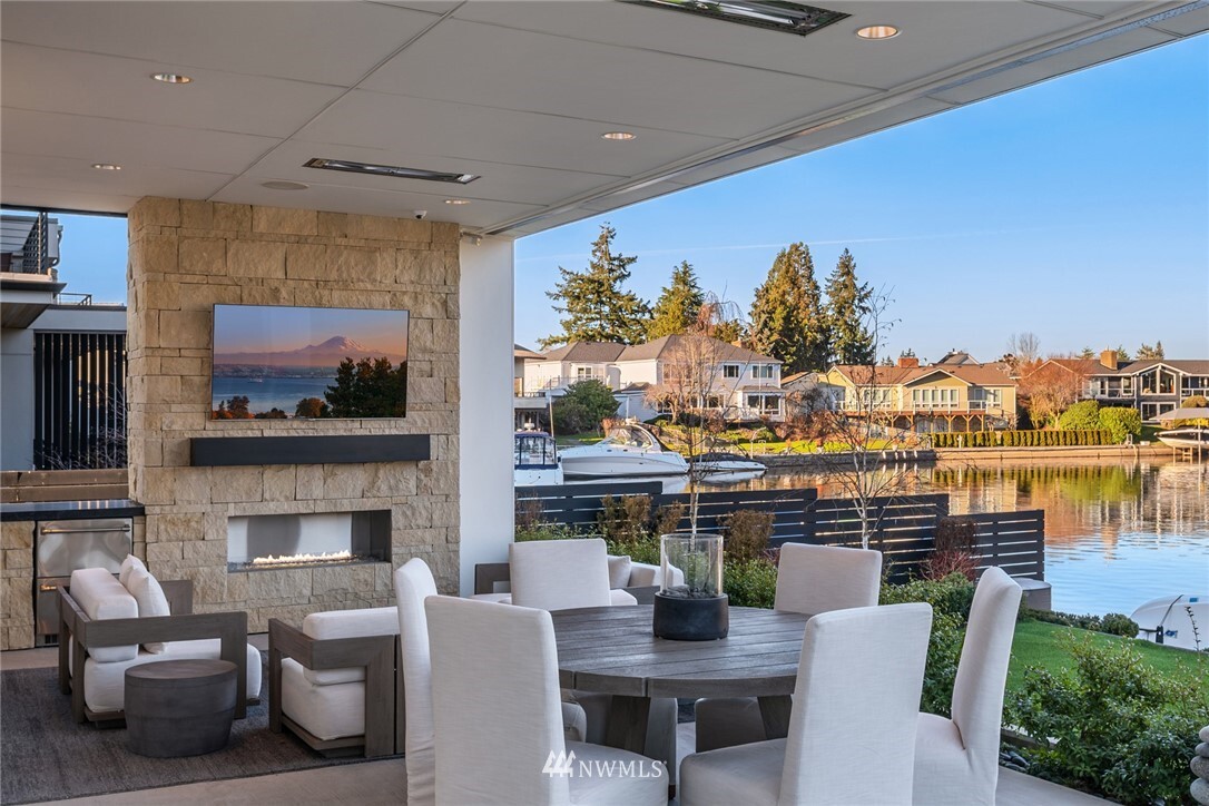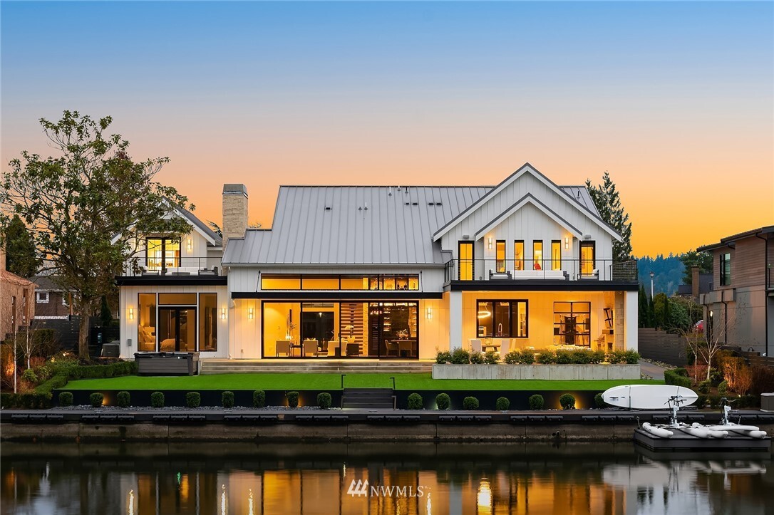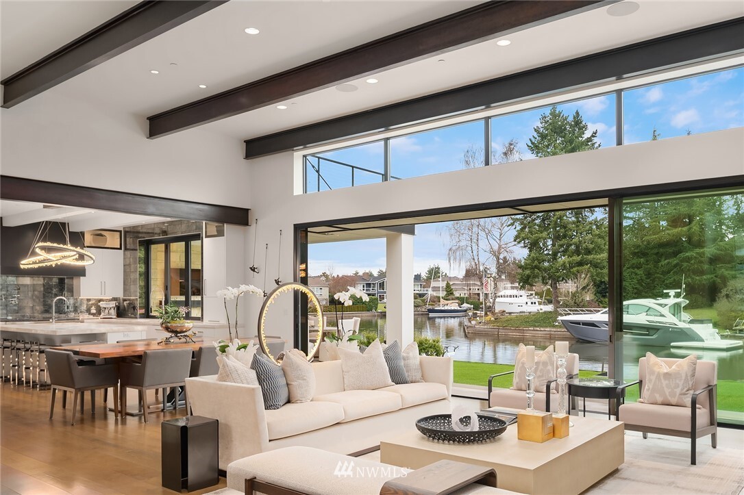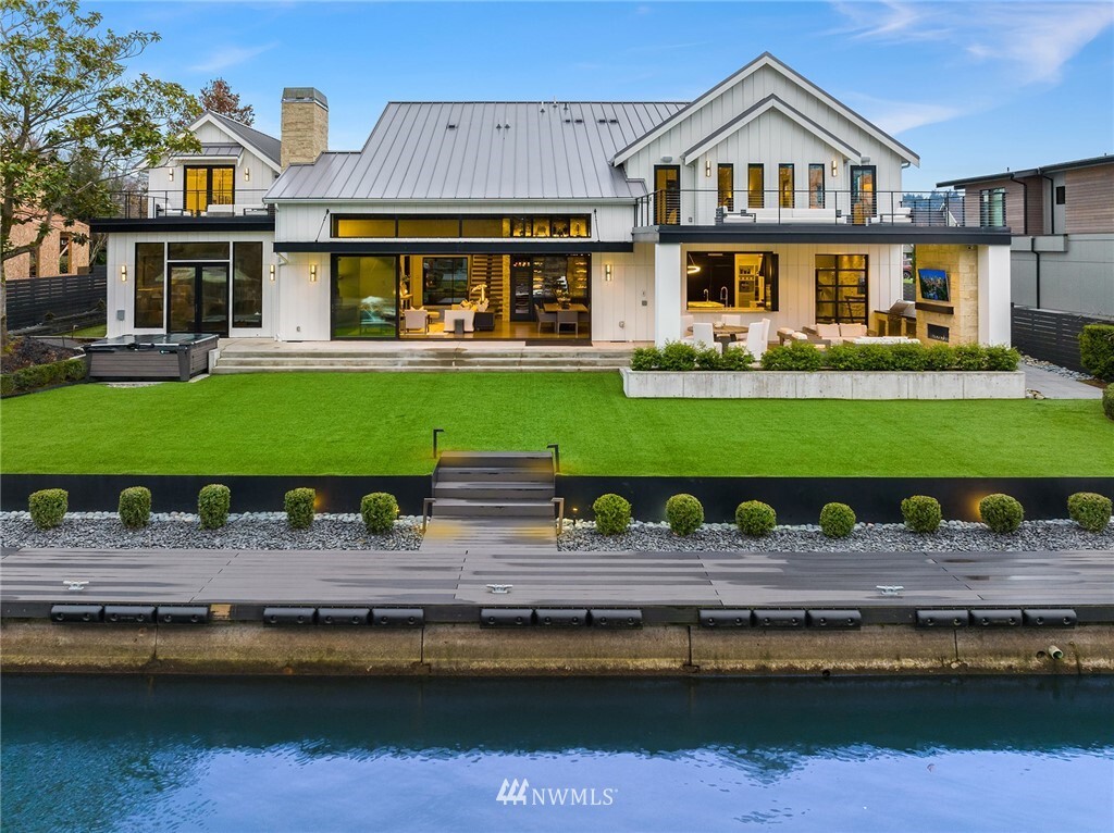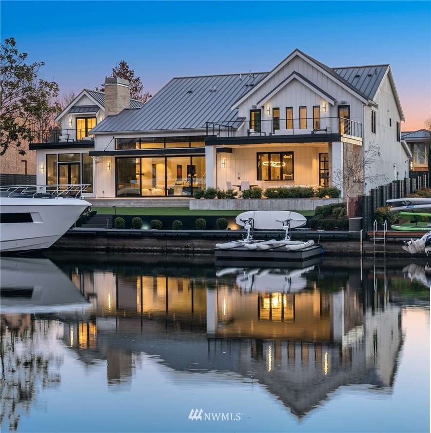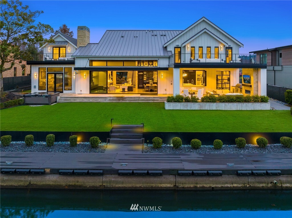 Spectacular custom-built waterfront home featuring incredible architectural details and elevated finishes. Grand pivot door entry opens to panoramic views of the water with great room and soaring ceilings. Luxury appointed chef’s kitchen featuring illuminated crystal island and hand-made tile backsplash. Elegant dining area accented with display and storage for wine collectors.Entire living space opens for indoor-outdoor entertaining on the water. Serene main-floor primary suite with fireplace, full spa bath, and dual-level dressing rooms. Upper decks facing the water. Media Room, state-of-the-art golf/game bonus room, exercise room and pet shower.Covered patio with fireplace and TV.Bulkhead finished in bamboo decking, rare on-lake moorage.