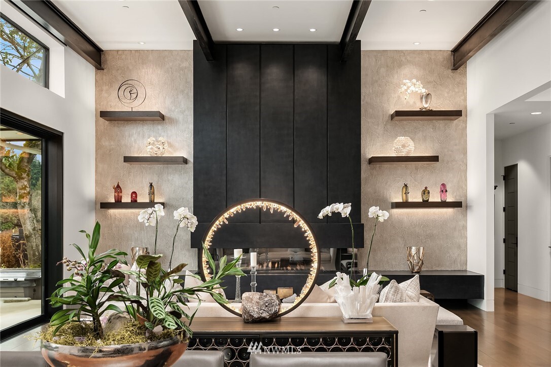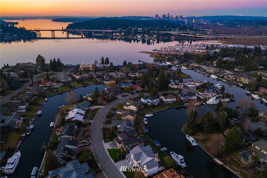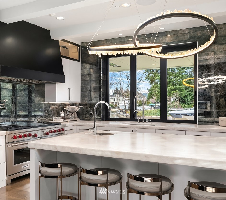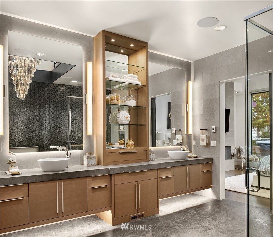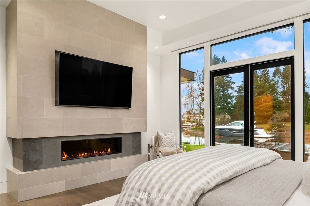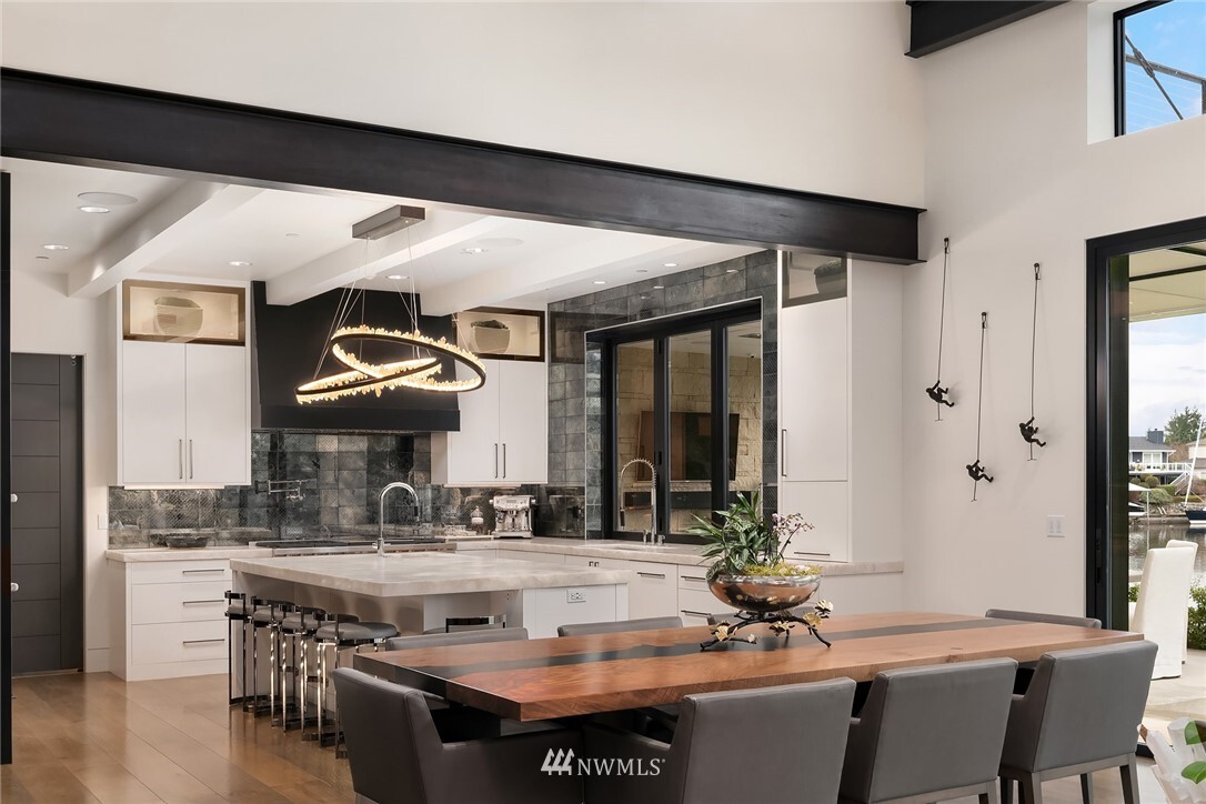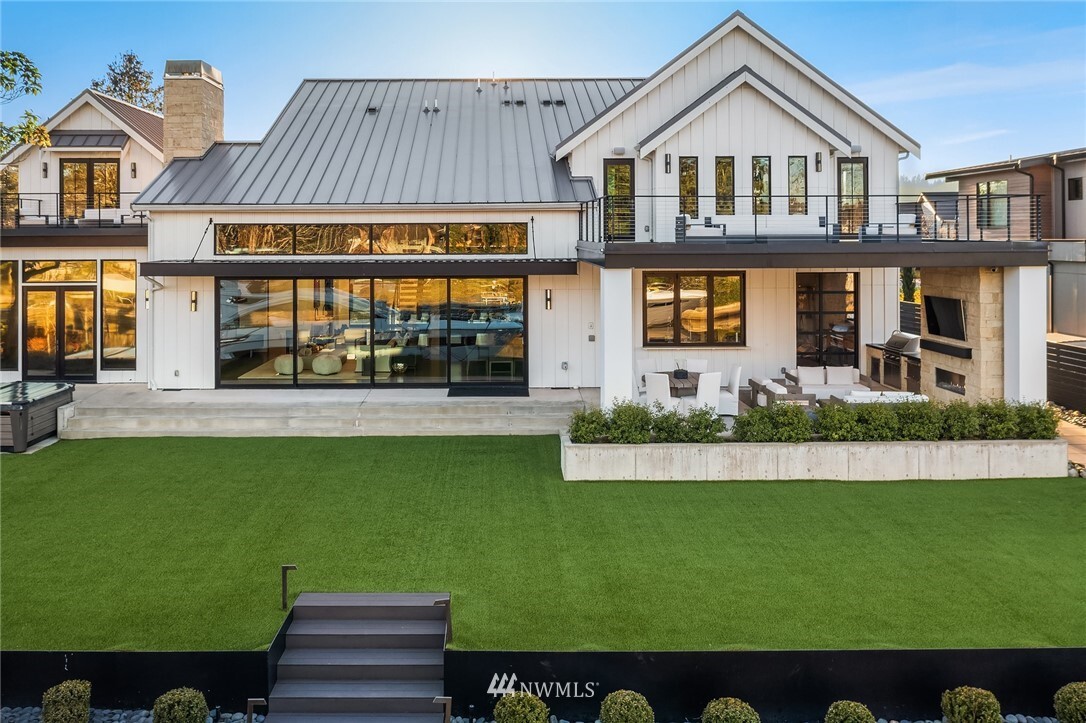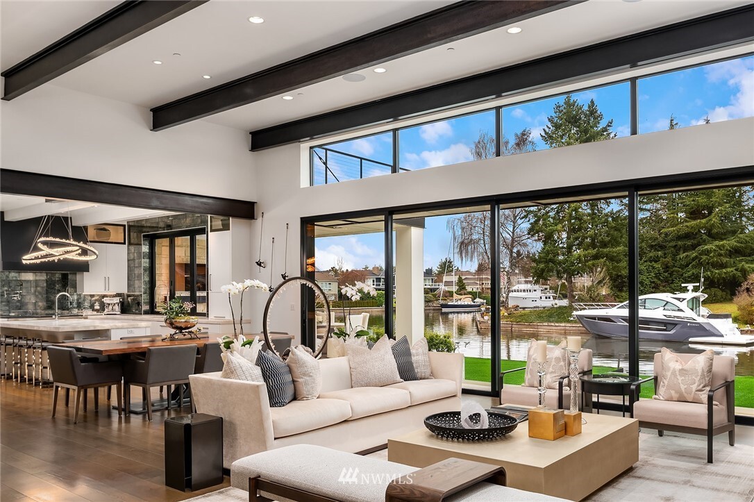 Spectacular custom-built waterfront home featuring incredible architectural details and elevated finishes. Grand pivot door entry opens to panoramic views of the water with great room and soaring ceilings. Luxury appointed chef’s kitchen featuring illuminated crystal island and hand-made tile backsplash. Elegant dining area accented with display and storage for wine collectors.Entire living space opens for indoor-outdoor entertaining on the water. Serene main-floor primary suite with fireplace, full spa bath, and dual-level dressing rooms. Upper decks facing the water. Media Room, state-of-the-art golf/game bonus room, exercise room and pet shower.Covered patio with fireplace and TV.Bulkhead finished in bamboo decking, rare on-lake moorage.