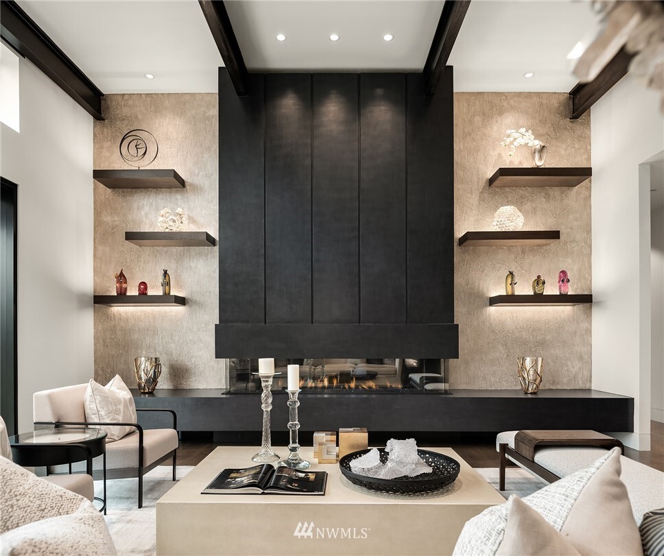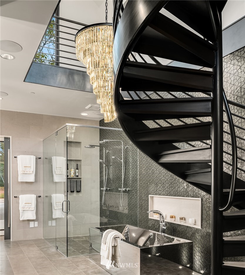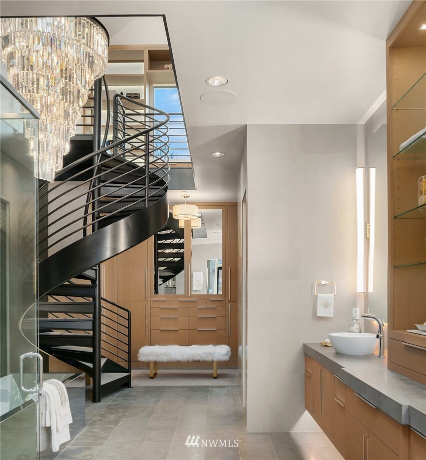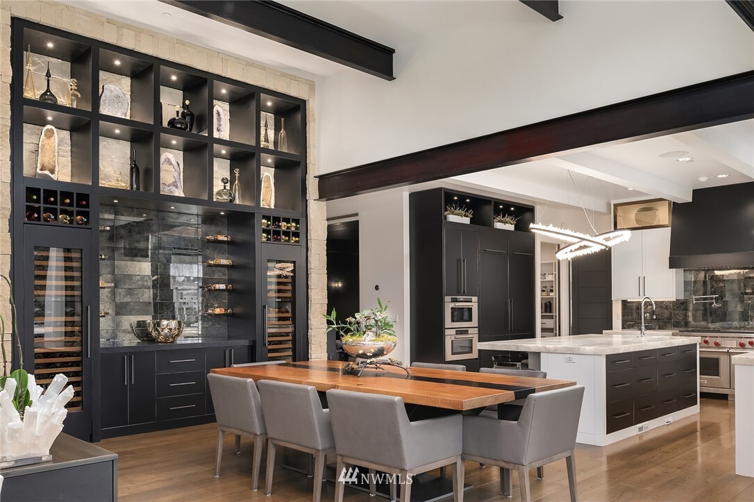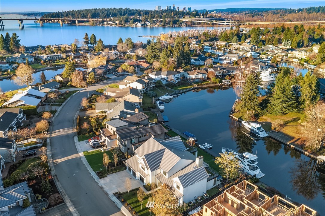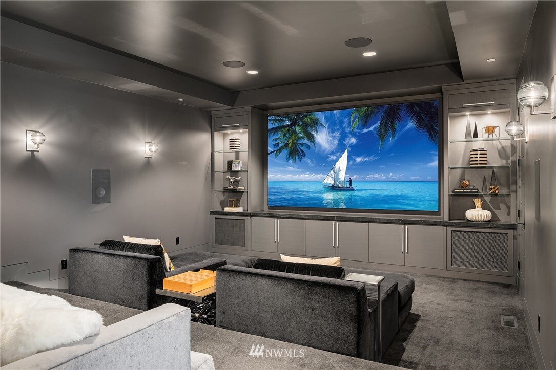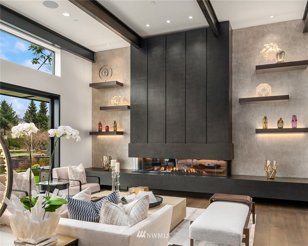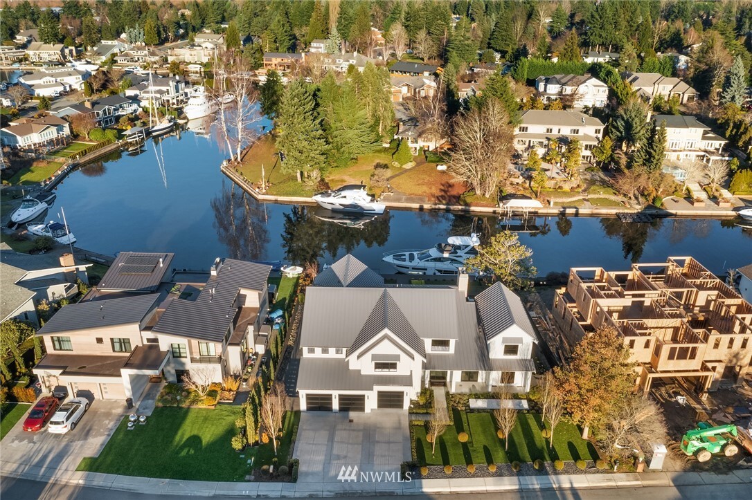 Spectacular custom-built waterfront home featuring incredible architectural details and elevated finishes. Grand pivot door entry opens to panoramic views of the water with great room and soaring ceilings. Luxury appointed chef’s kitchen featuring illuminated crystal island and hand-made tile backsplash. Elegant dining area accented with display and storage for wine collectors.Entire living space opens for indoor-outdoor entertaining on the water. Serene main-floor primary suite with fireplace, full spa bath, and dual-level dressing rooms. Upper decks facing the water. Media Room, state-of-the-art golf/game bonus room, exercise room and pet shower.Covered patio with fireplace and TV.Bulkhead finished in bamboo decking, rare on-lake moorage.