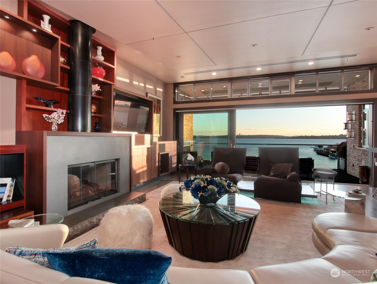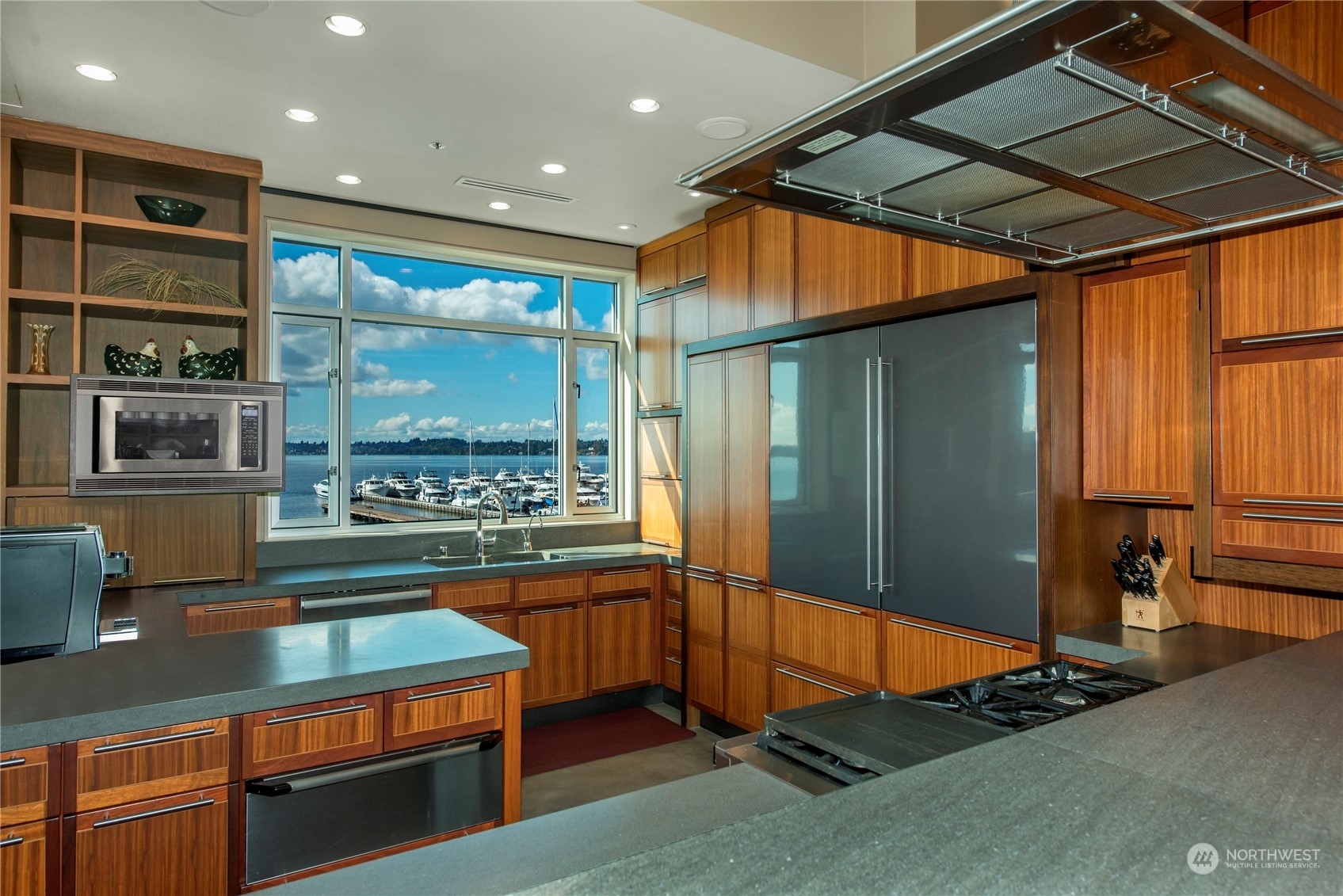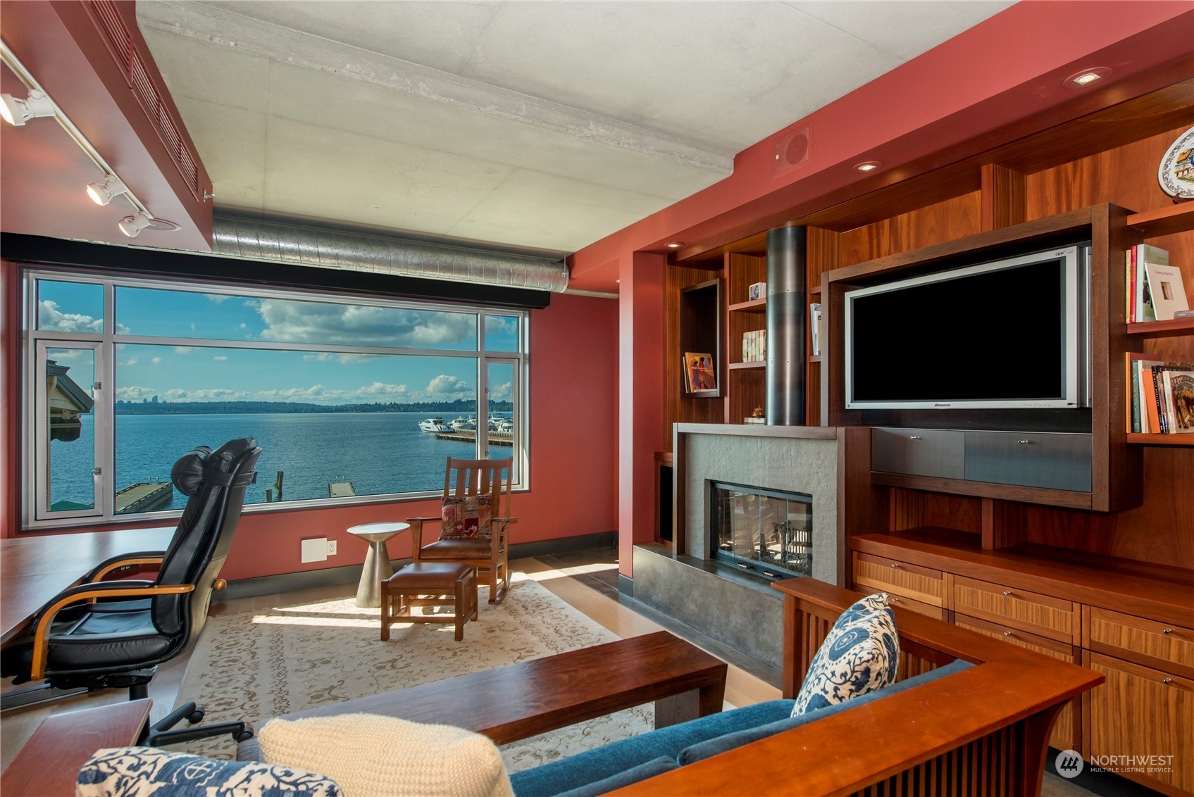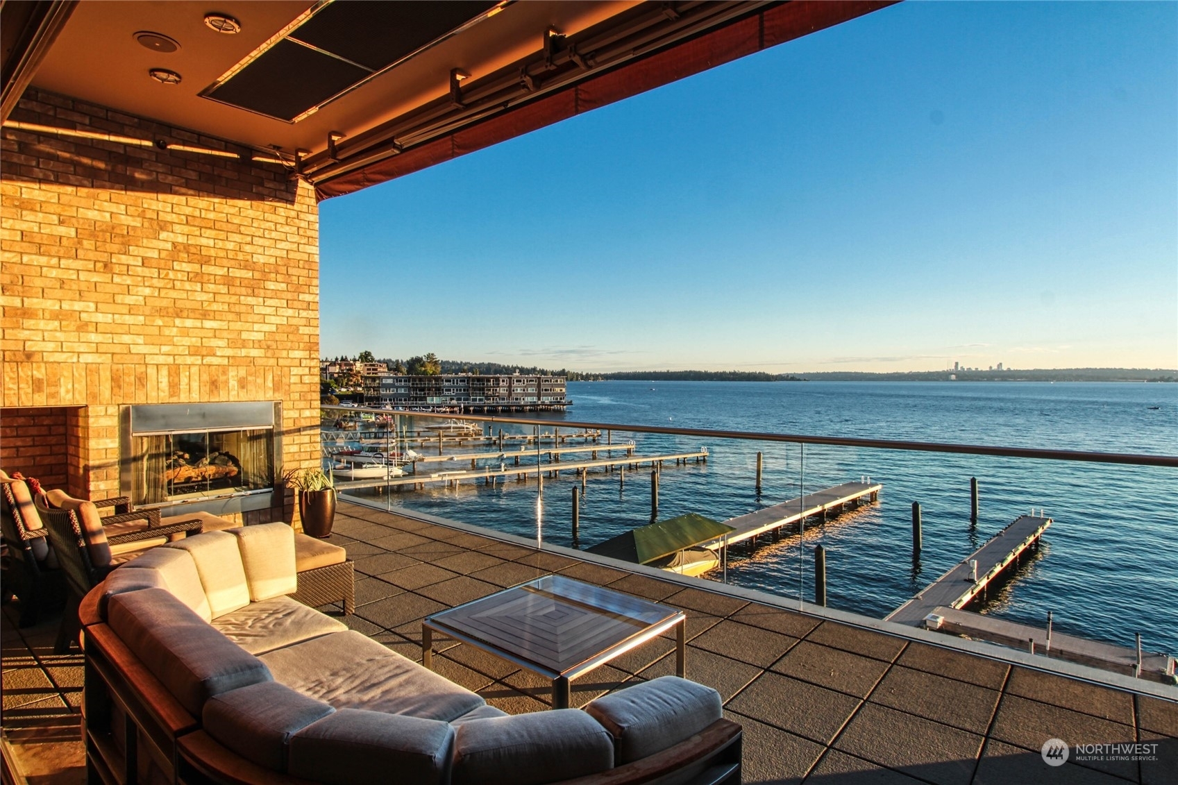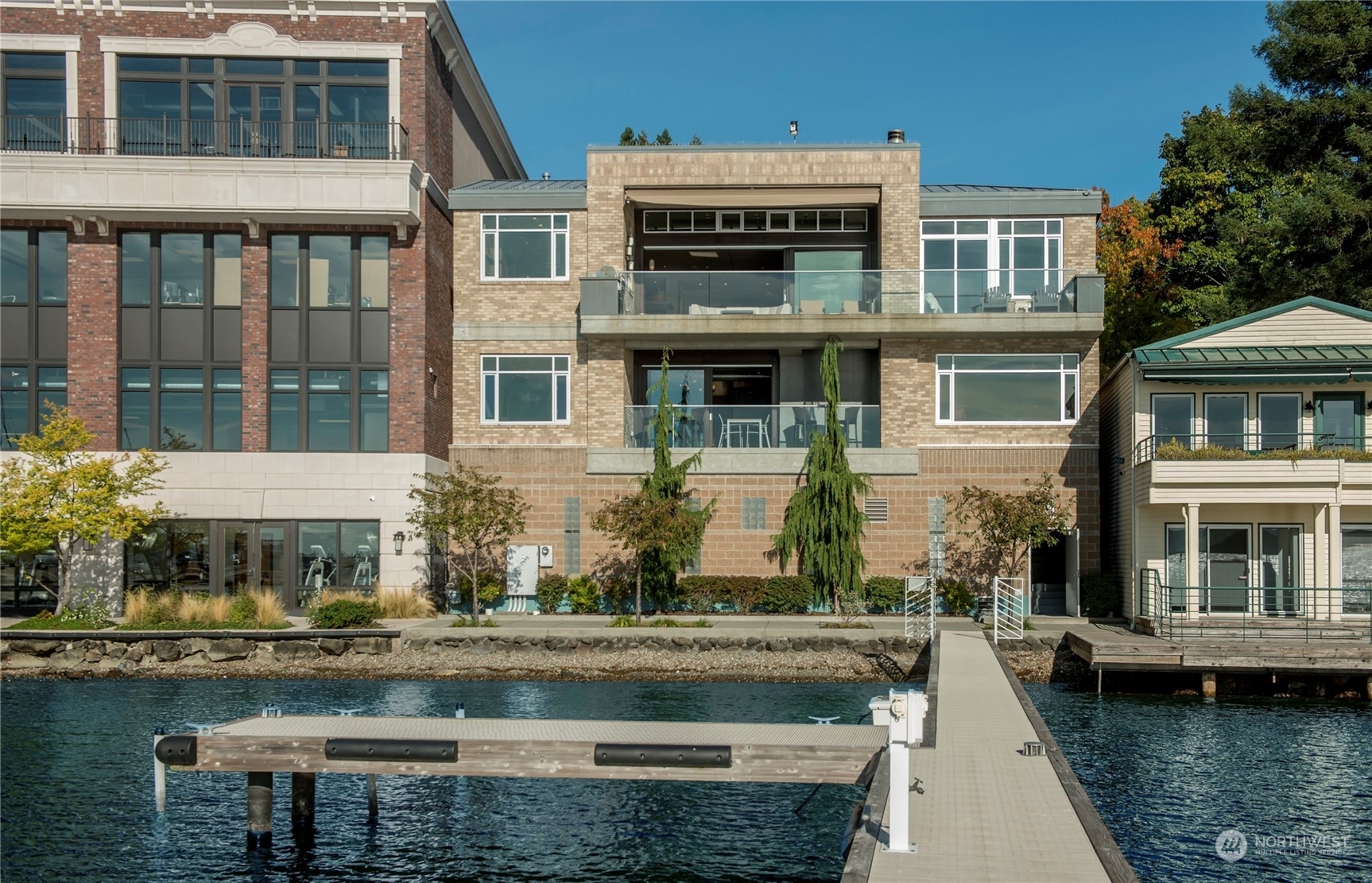 One of a kind waterfront. Lock and leave with stunning Industrial Modern Design. Sweeping views of Lake Washington and Olympic Mountains. The finest construction of steel and concrete in heart of City, yet so private. 4 en suite bedrooms. Finished 3,375 square foot heated garage with collector car exhaust extractor easily parks 9 cars. Locked gated dock with concrete pilings and solar power lift capable for mooring a significant yacht. Wet bar and temperature controlled wine room. Elevator services 3 floors from garage to top floor. Street level separate entrance to office suites. Imagine your home with collector car parking, yacht moorage, office suites in the heart of Kirkland. Lifestyle perfection.