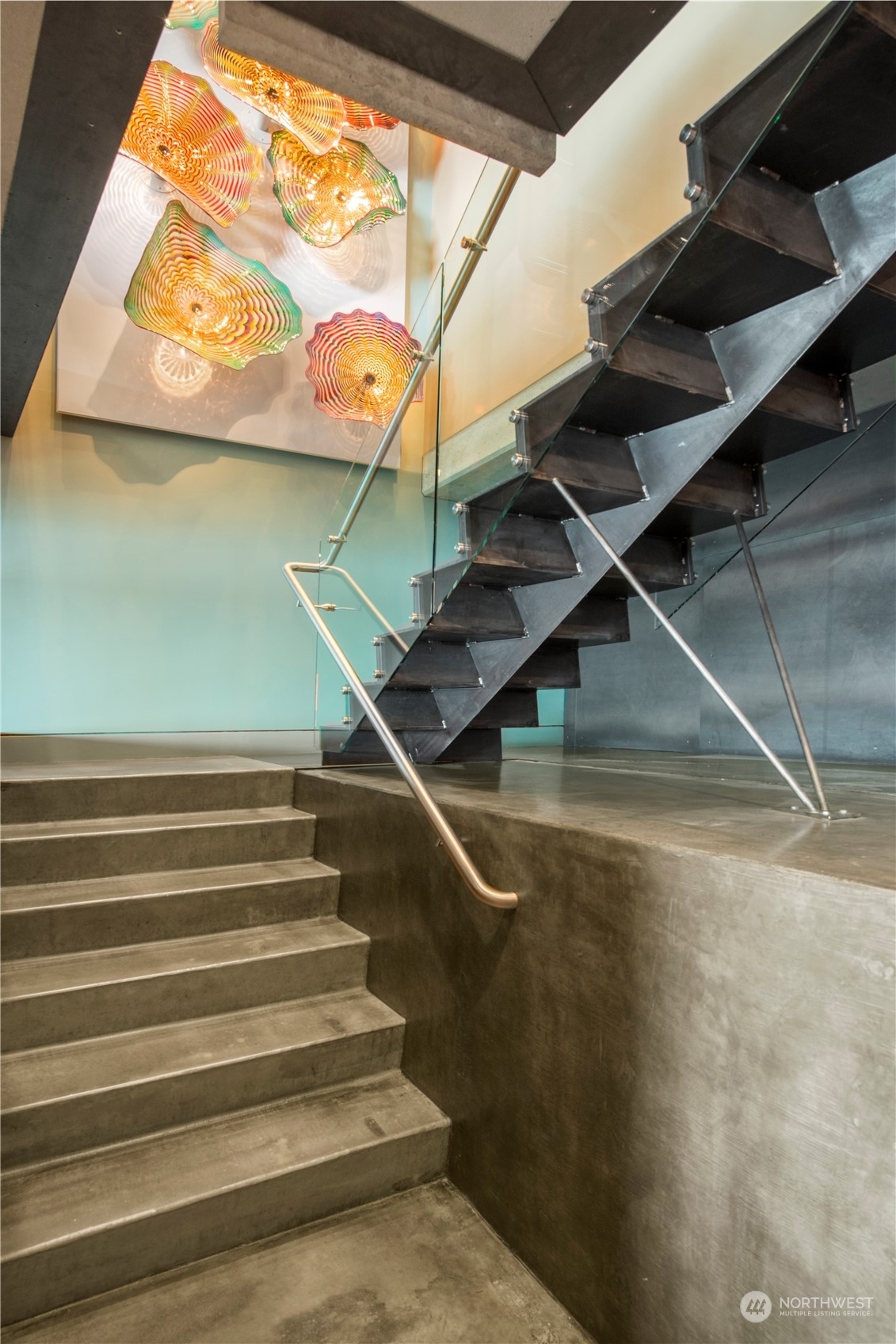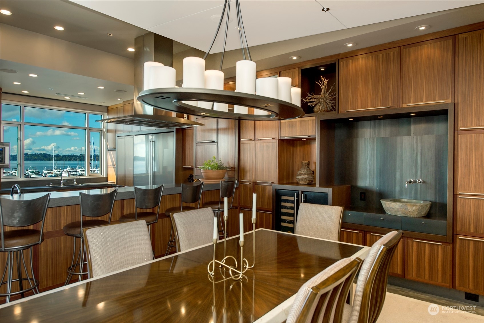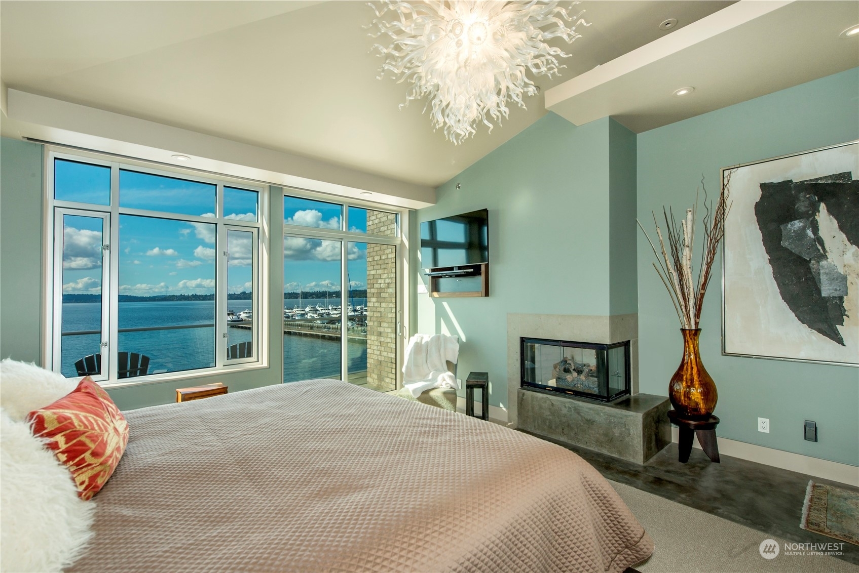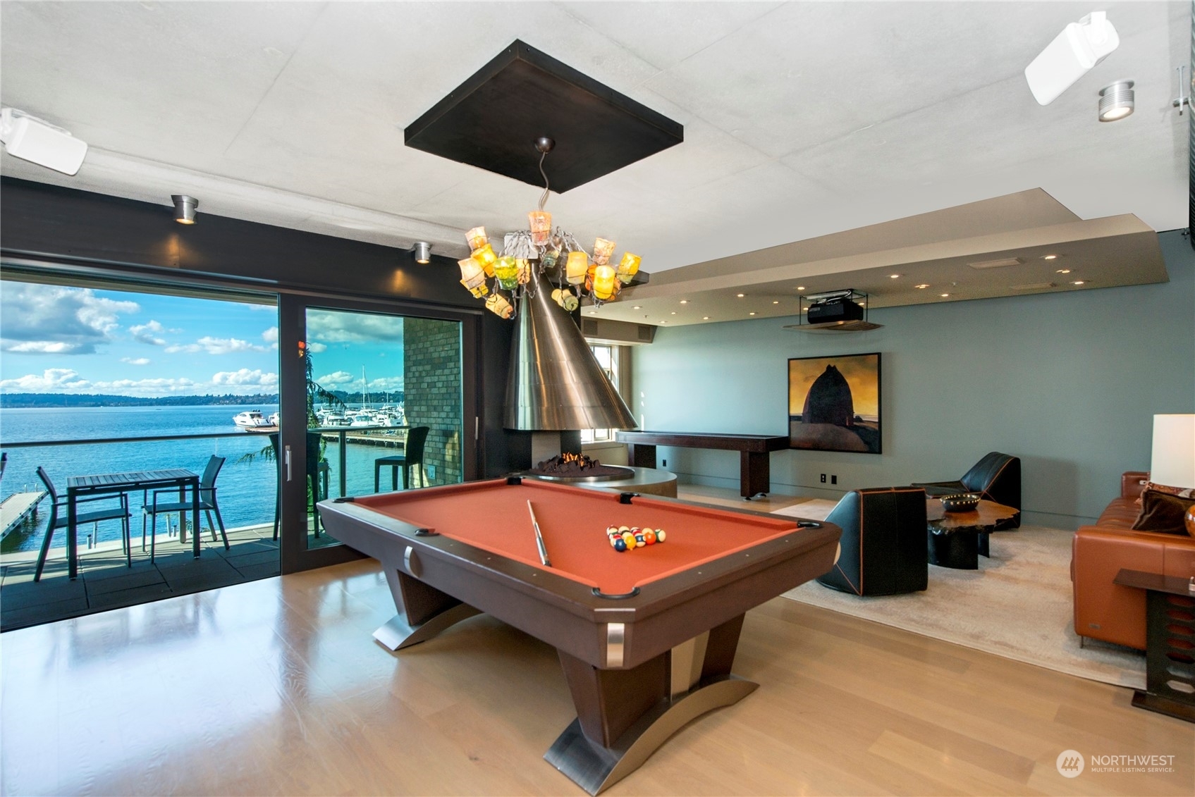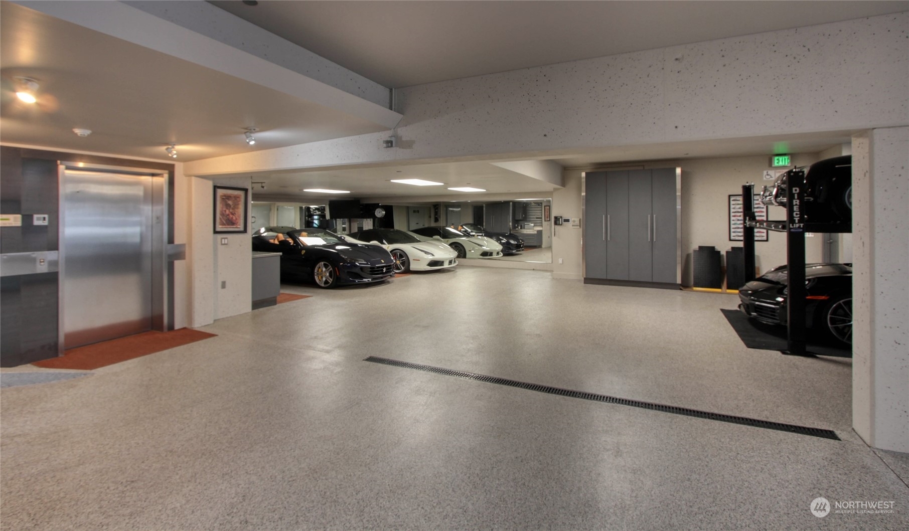 One of a kind waterfront. Lock and leave with stunning Industrial Modern Design. Sweeping views of Lake Washington and Olympic Mountains. The finest construction of steel and concrete in heart of City, yet so private. 4 en suite bedrooms. Finished 3,375 square foot heated garage with collector car exhaust extractor easily parks 9 cars. Locked gated dock with concrete pilings and solar power lift capable for mooring a significant yacht. Wet bar and temperature controlled wine room. Elevator services 3 floors from garage to top floor. Street level separate entrance to office suites. Imagine your home with collector car parking, yacht moorage, office suites in the heart of Kirkland. Lifestyle perfection.