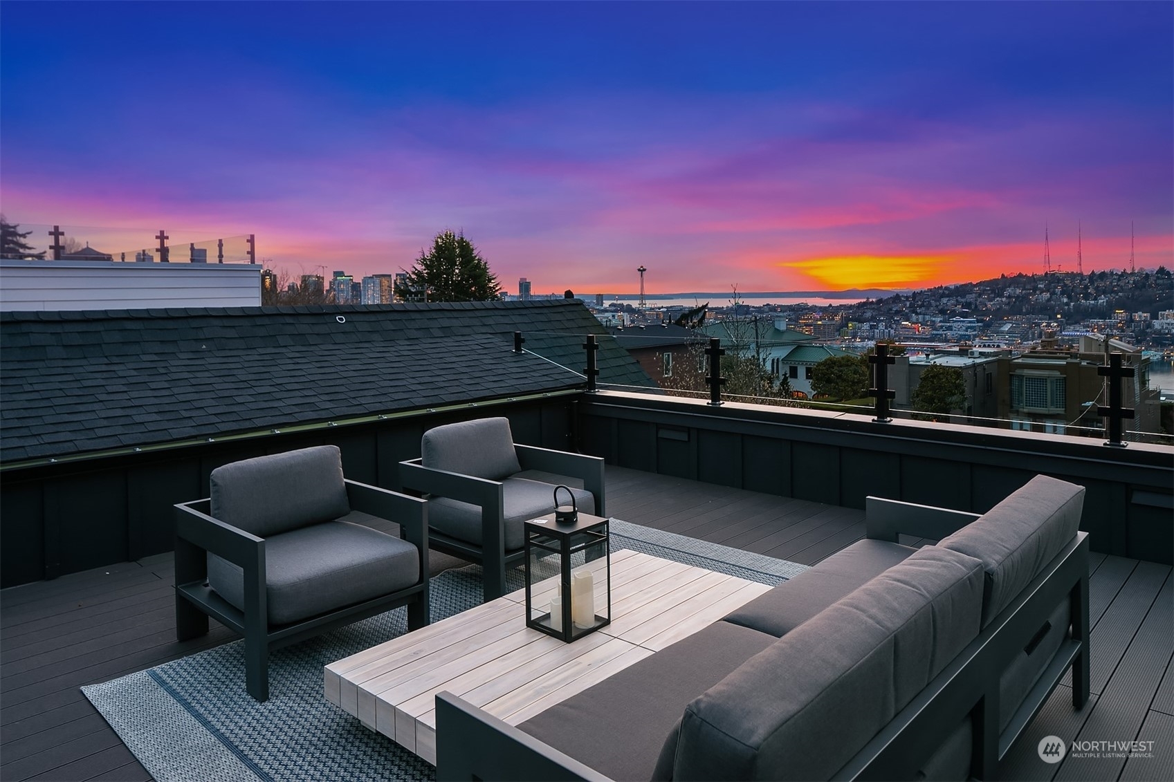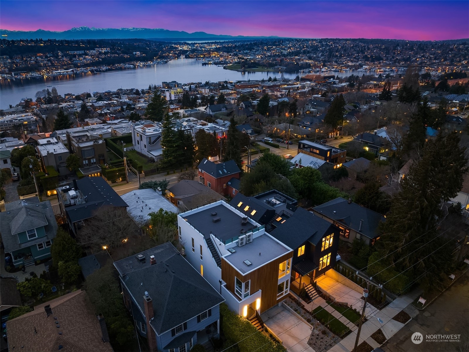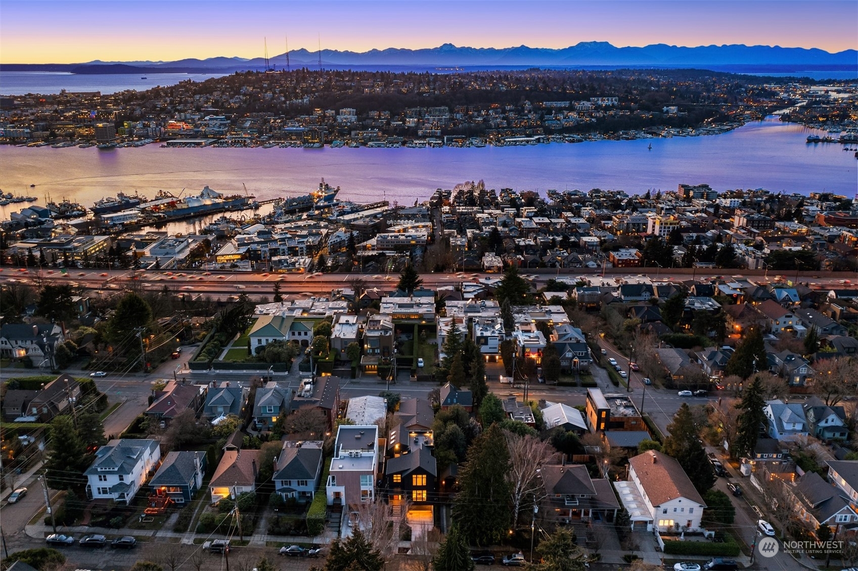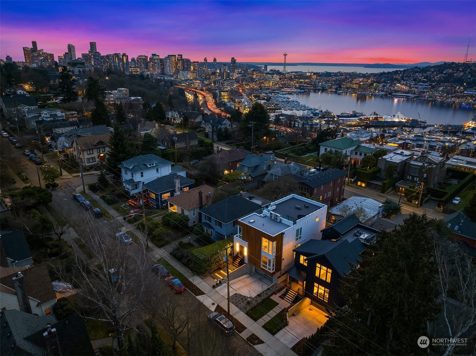This new privately commissioned home from acclaimed developer Halverson Design Build reflects the elegance of North Capitol Hill’s most sought-after street – Federal Avenue. Enjoy stunning views of Seattle, Lake Union, and Olympic Mountains from the home’s expansive windows and spacious rooftop deck. This masterfully-designed home boasts abundant natural light, soaring ceilings + exquisitely curated finishes. Open-concept living features hardwoods, exposed beams, custom built-ins + fireplace. Chef’s kitchen impresses with premier appliances, Carrara marble counters, + large pantry. Retreat in luxury to owner’s suite with cathedral ceilings, fireplace, skylights, + spa-like bath. Home office, fenced backyard, bonus rooms, + two-car garage.