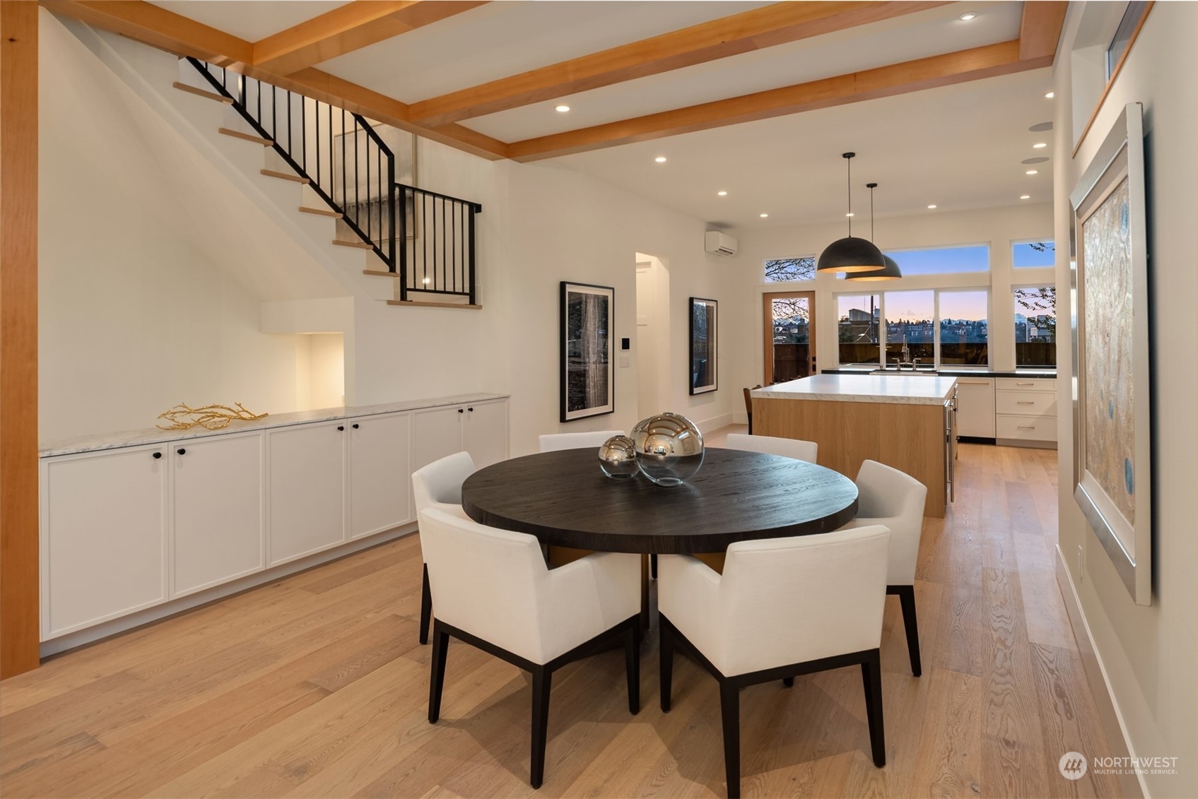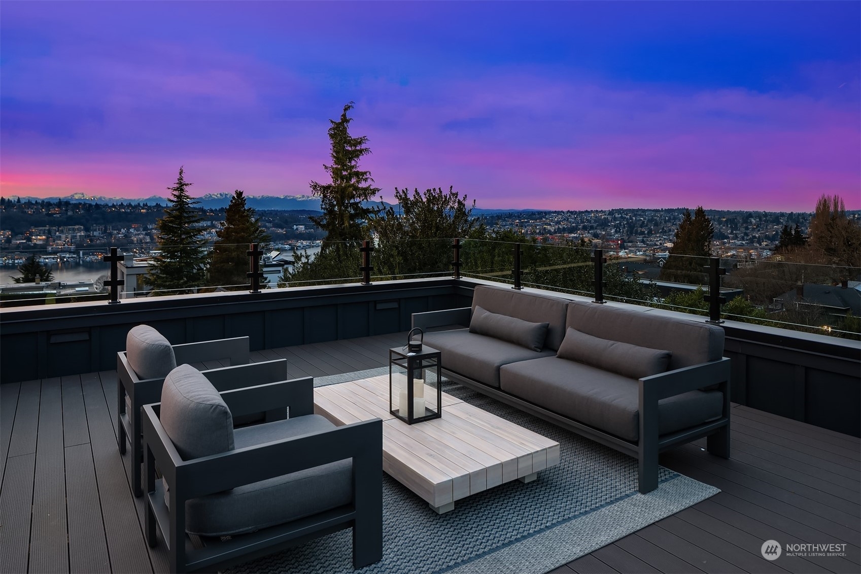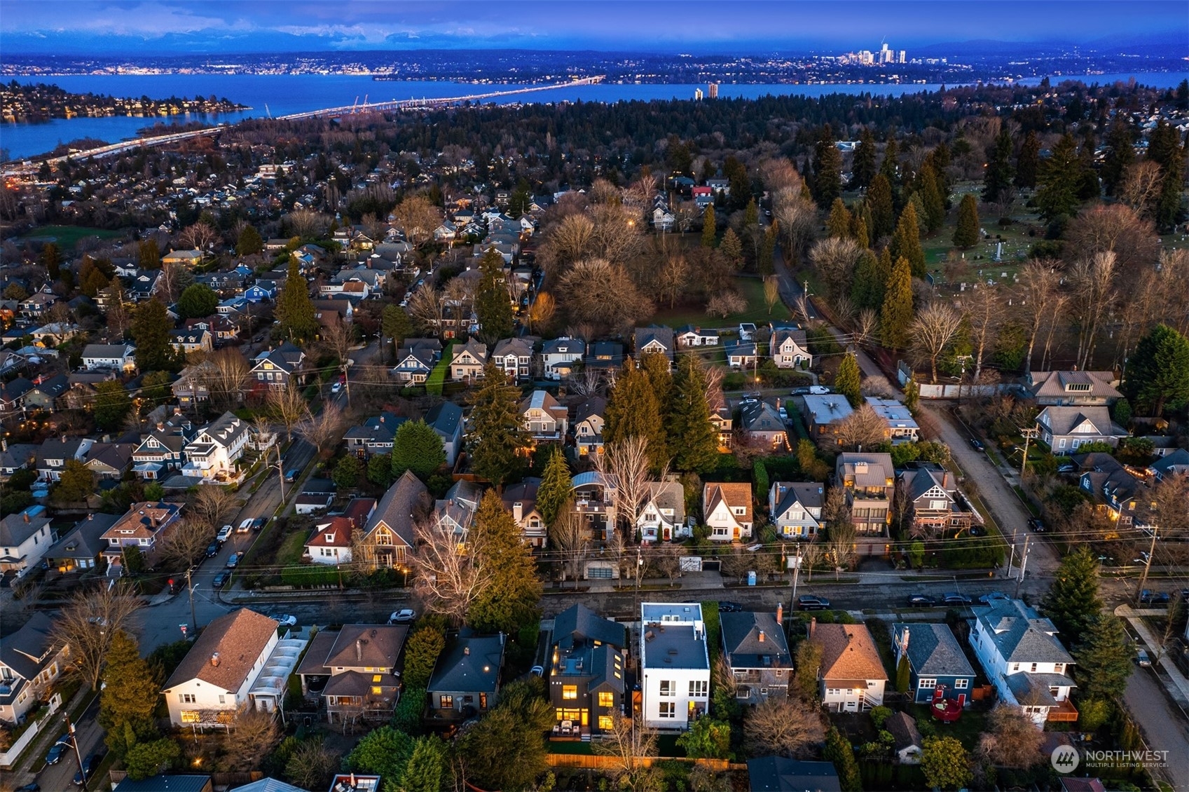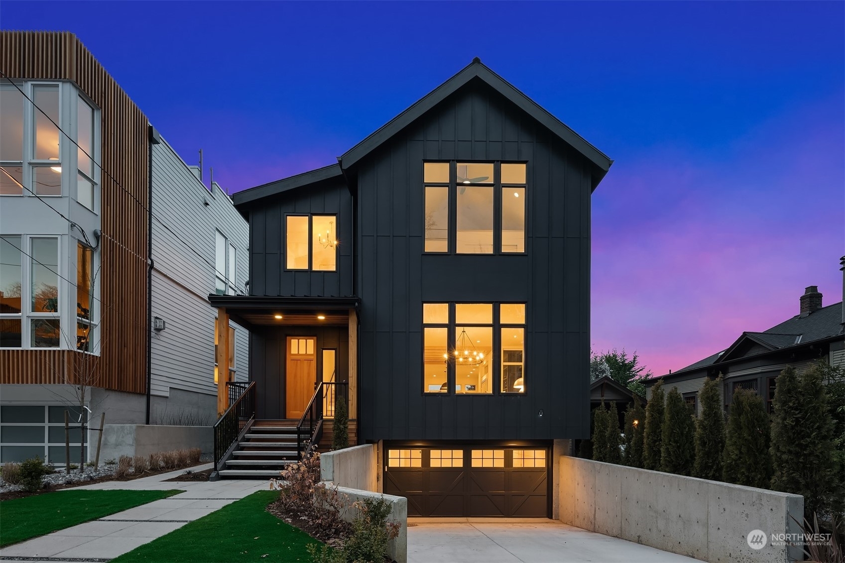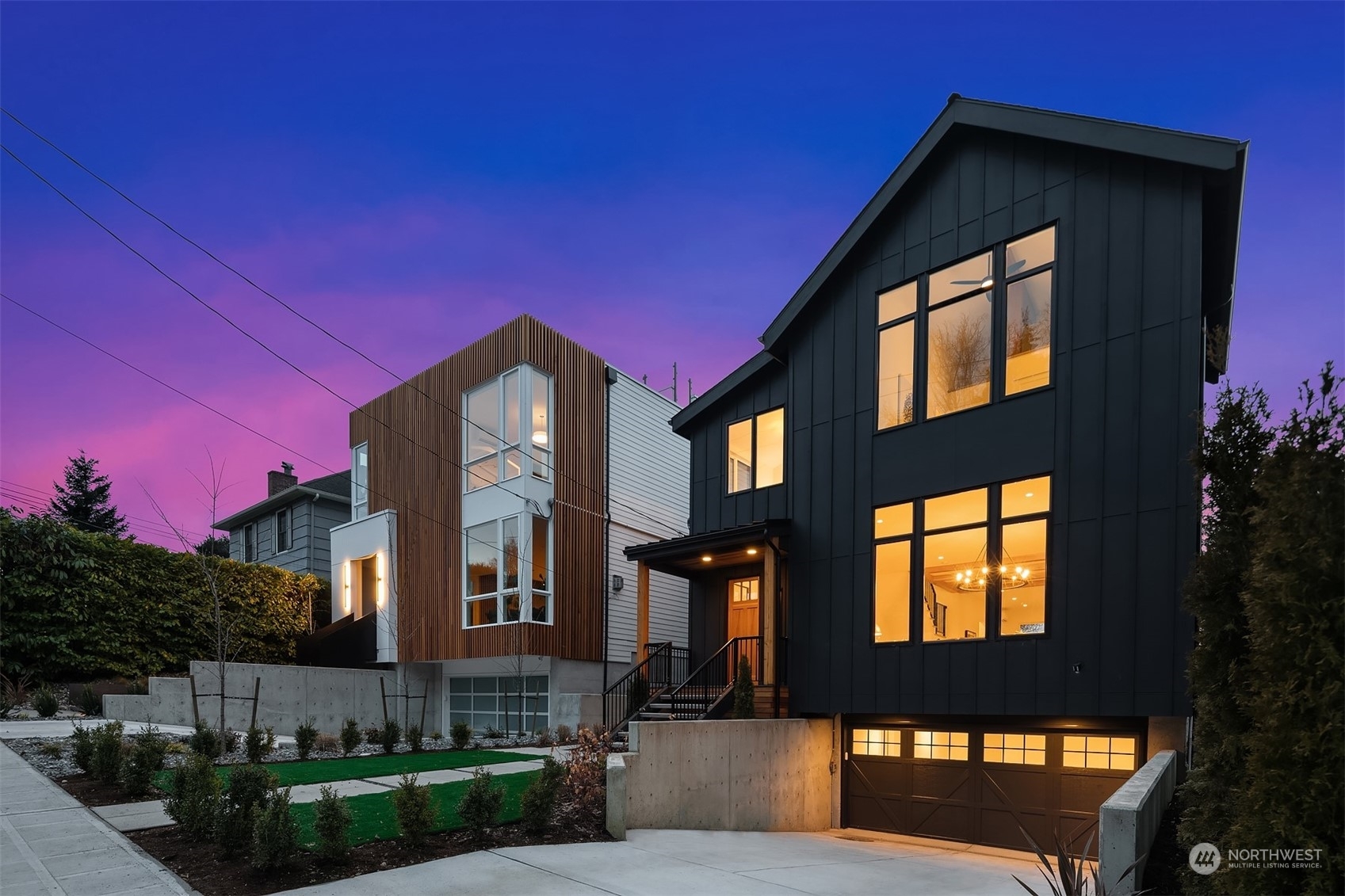 This new privately commissioned home from acclaimed developer Halverson Design Build reflects the elegance of North Capitol Hill’s most sought-after street – Federal Avenue. Enjoy stunning views of Seattle, Lake Union, and Olympic Mountains from the home’s expansive windows and spacious rooftop deck. This masterfully-designed home boasts abundant natural light, soaring ceilings + exquisitely curated finishes. Open-concept living features hardwoods, exposed beams, custom built-ins + fireplace. Chef’s kitchen impresses with premier appliances, Carrara marble counters, + large pantry. Retreat in luxury to owner’s suite with cathedral ceilings, fireplace, skylights, + spa-like bath. Home office, fenced backyard, bonus rooms, + two-car garage.
