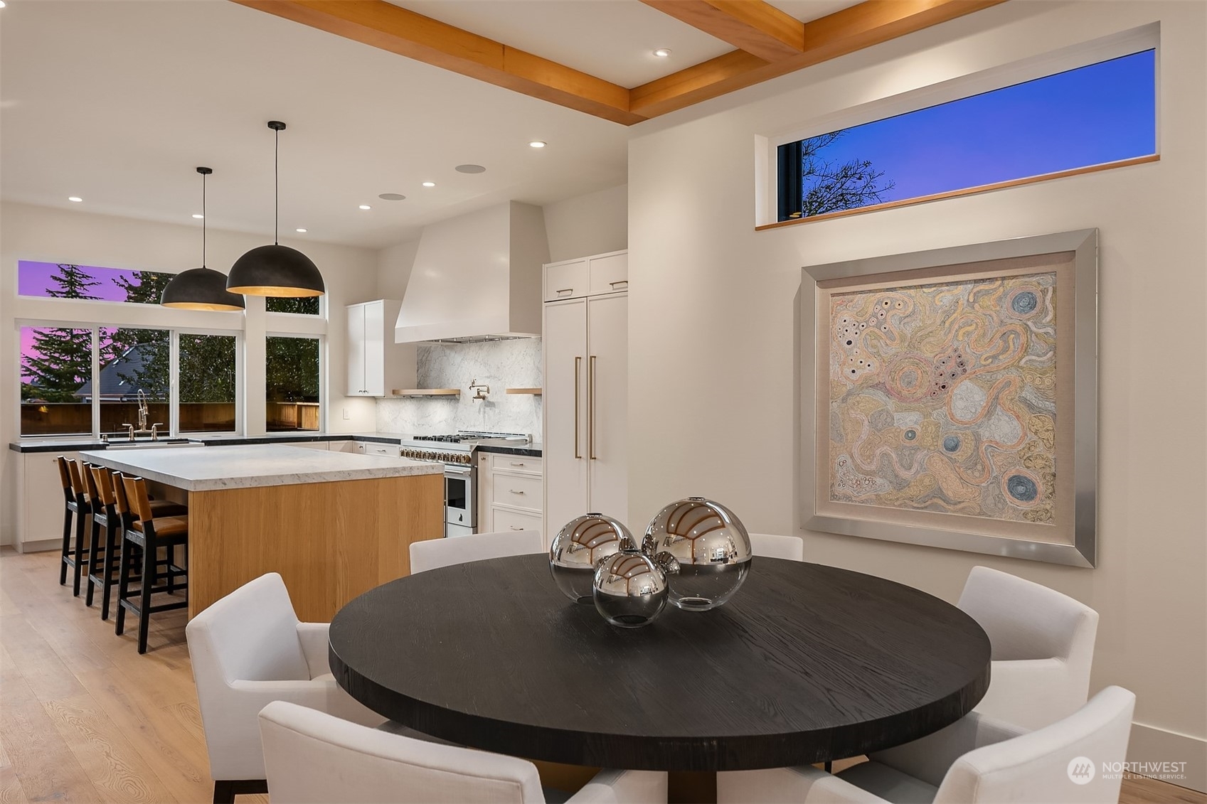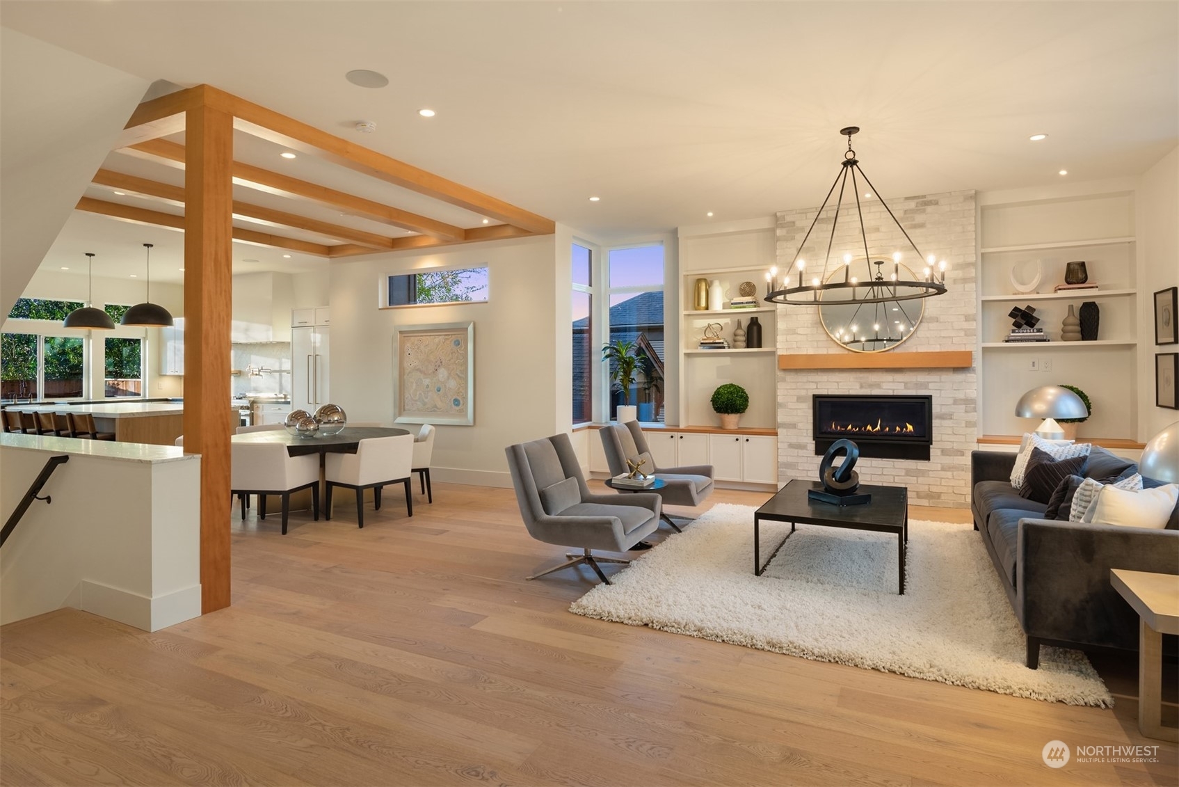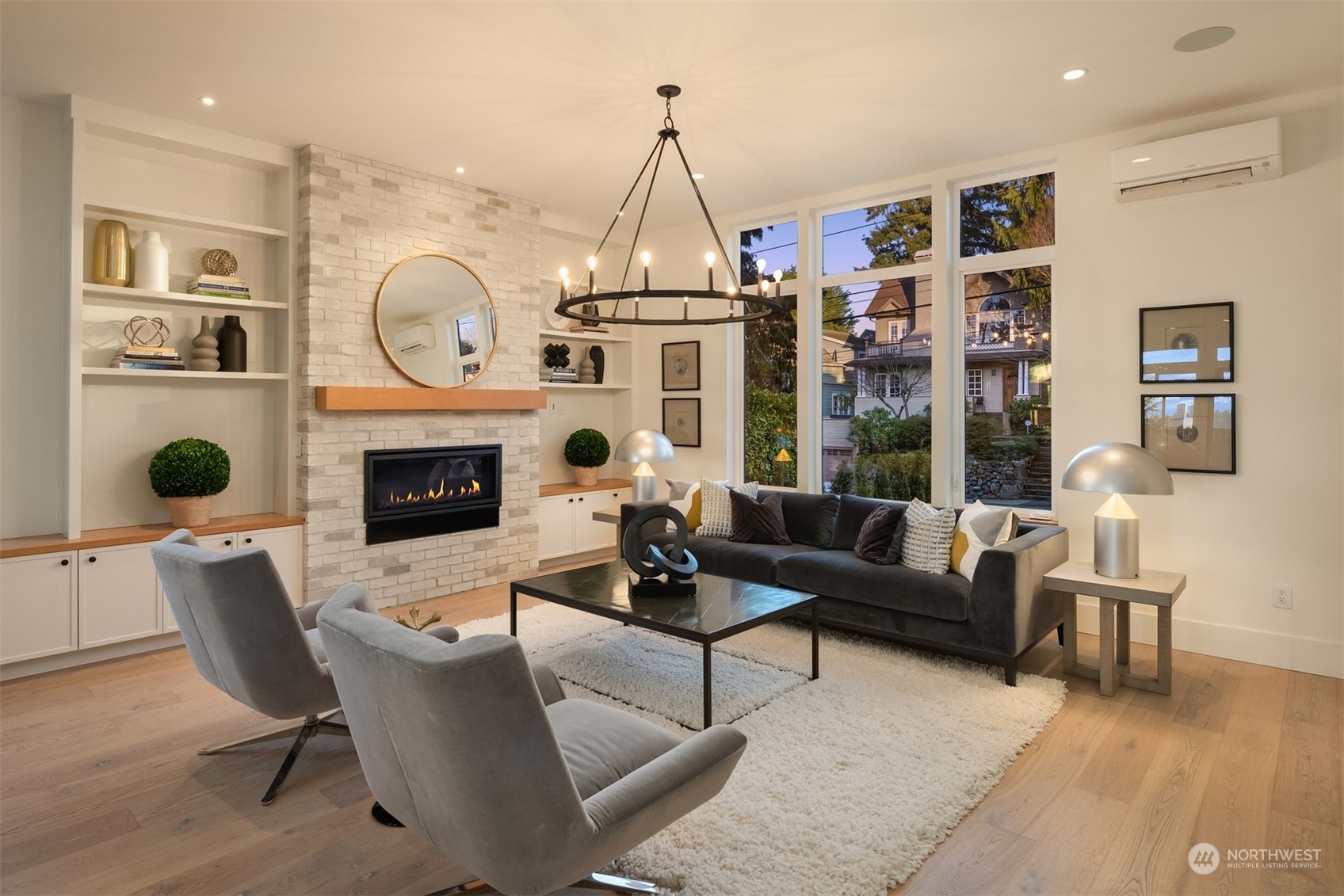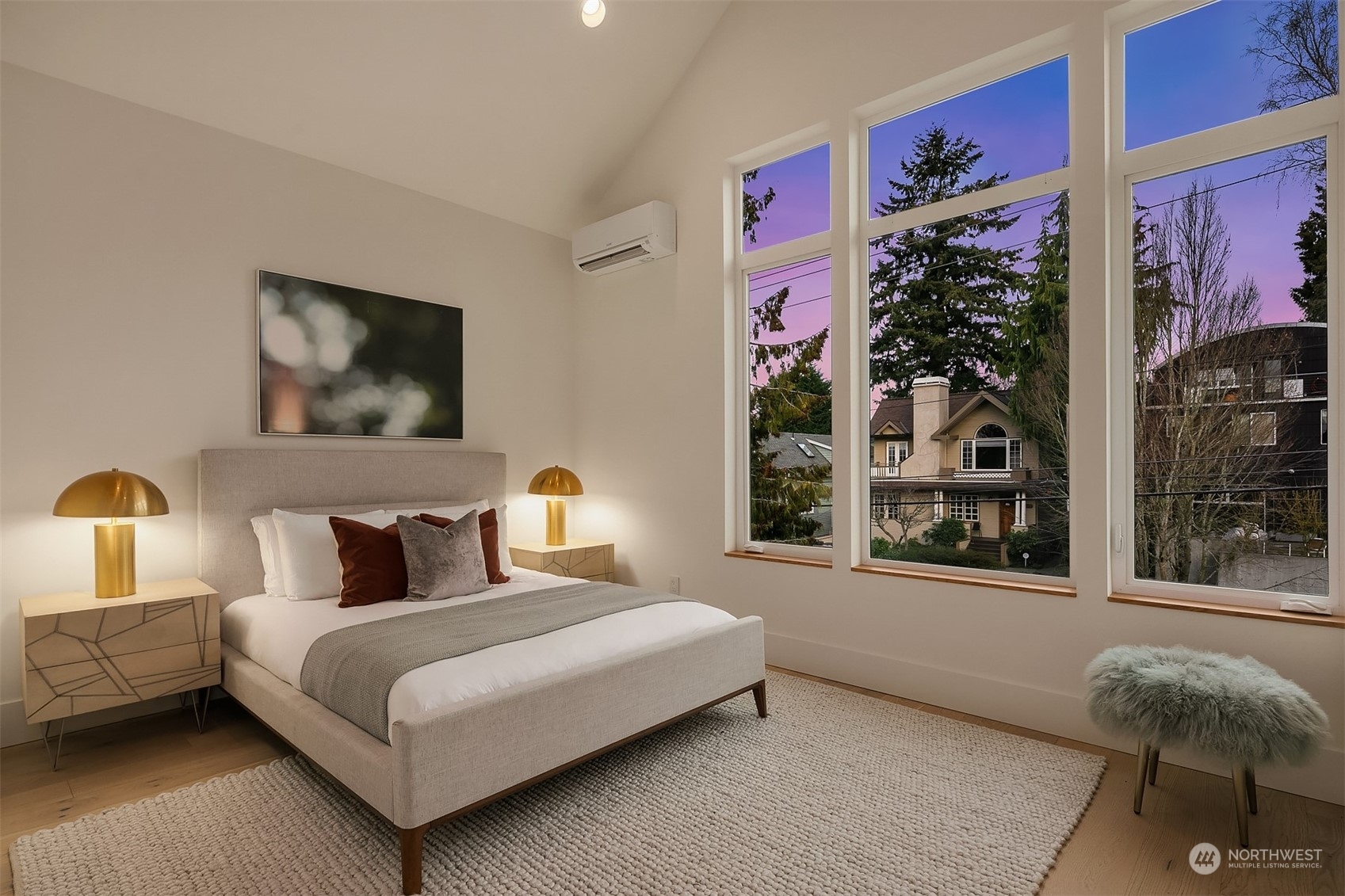 This new privately commissioned home from acclaimed developer Halverson Design Build reflects the elegance of North Capitol Hill’s most sought-after street – Federal Avenue. Enjoy stunning views of Seattle, Lake Union, and Olympic Mountains from the home’s expansive windows and spacious rooftop deck. This masterfully-designed home boasts abundant natural light, soaring ceilings + exquisitely curated finishes. Open-concept living features hardwoods, exposed beams, custom built-ins + fireplace. Chef’s kitchen impresses with premier appliances, Carrara marble counters, + large pantry. Retreat in luxury to owner’s suite with cathedral ceilings, fireplace, skylights, + spa-like bath. Home office, fenced backyard, bonus rooms, + two-car garage.