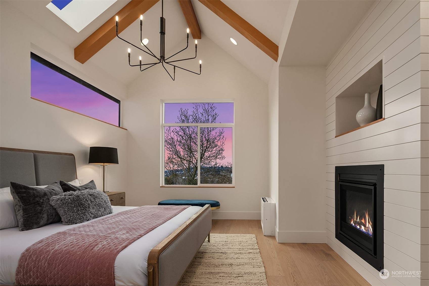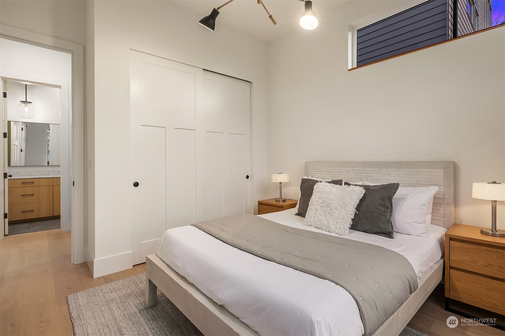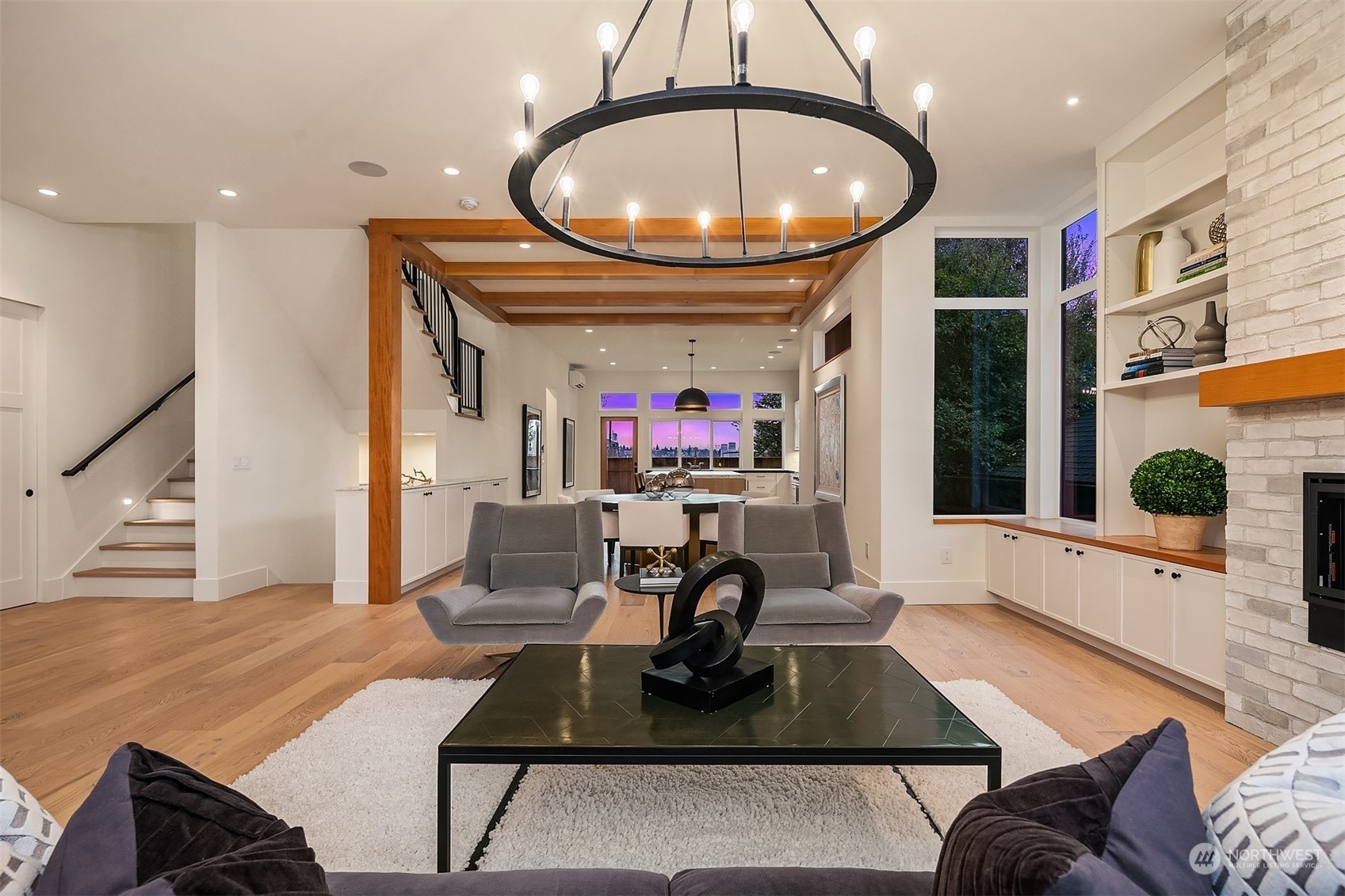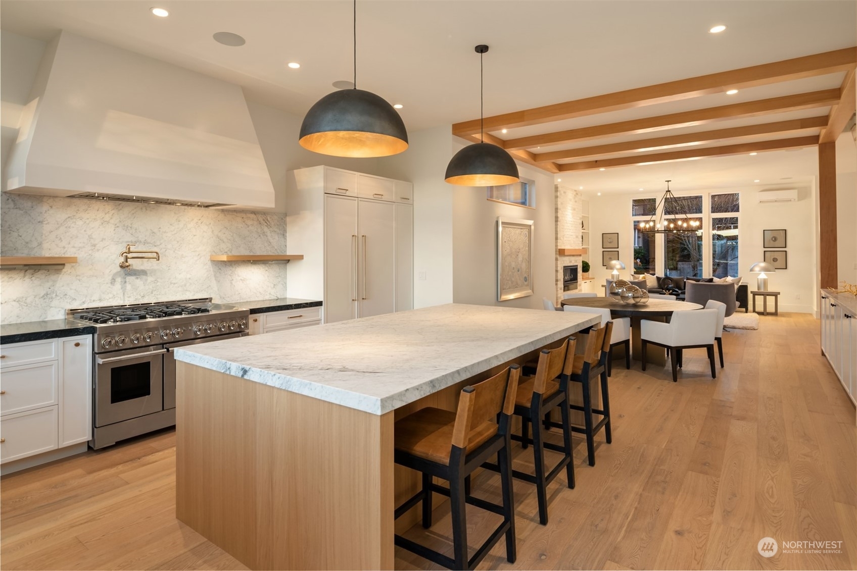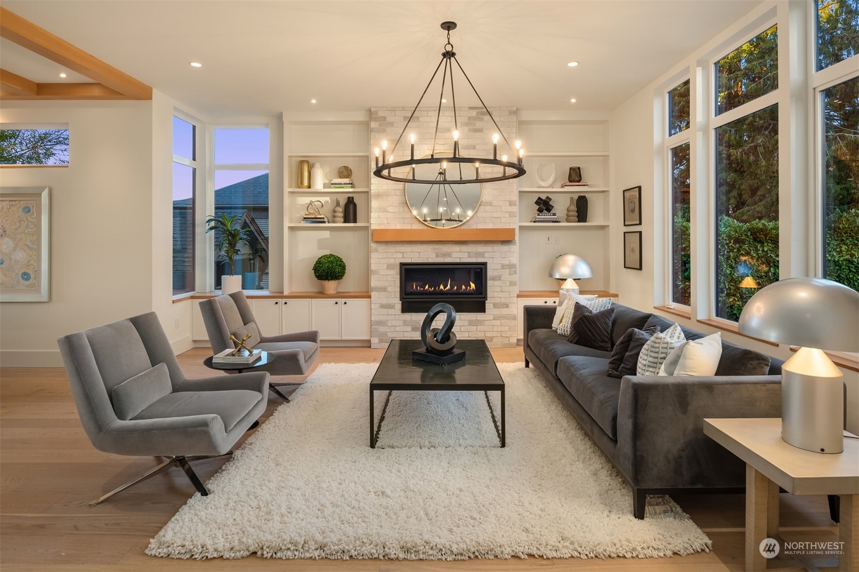 This new privately commissioned home from acclaimed developer Halverson Design Build reflects the elegance of North Capitol Hill’s most sought-after street – Federal Avenue. Enjoy stunning views of Seattle, Lake Union, and Olympic Mountains from the home’s expansive windows and spacious rooftop deck. This masterfully-designed home boasts abundant natural light, soaring ceilings + exquisitely curated finishes. Open-concept living features hardwoods, exposed beams, custom built-ins + fireplace. Chef’s kitchen impresses with premier appliances, Carrara marble counters, + large pantry. Retreat in luxury to owner’s suite with cathedral ceilings, fireplace, skylights, + spa-like bath. Home office, fenced backyard, bonus rooms, + two-car garage.
