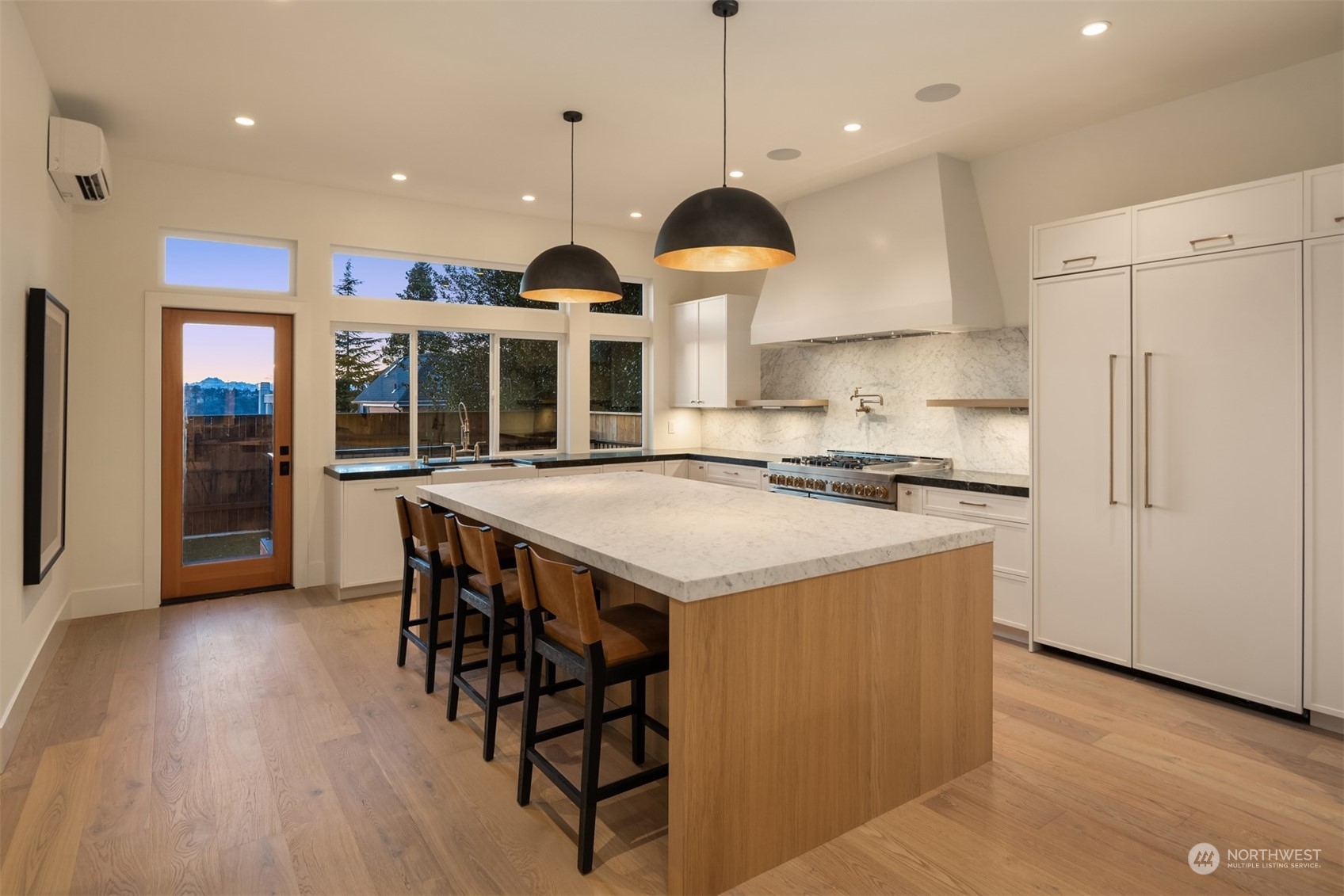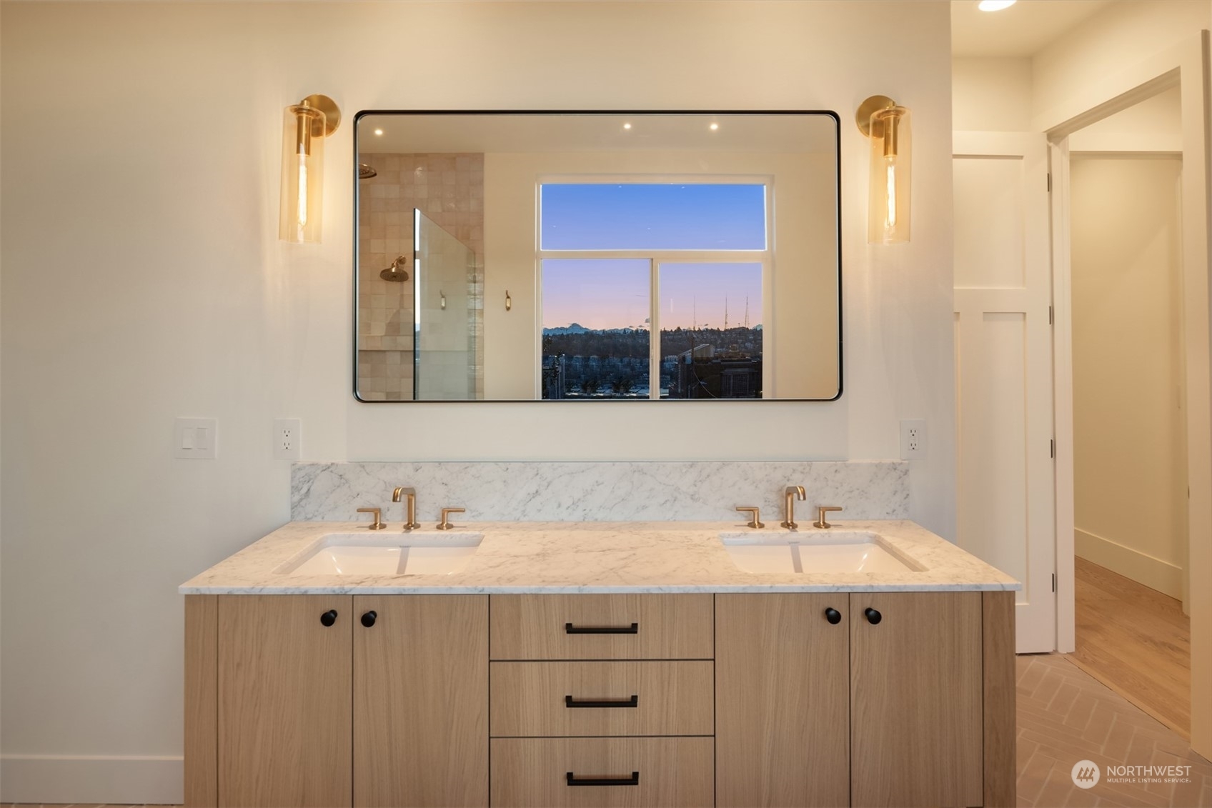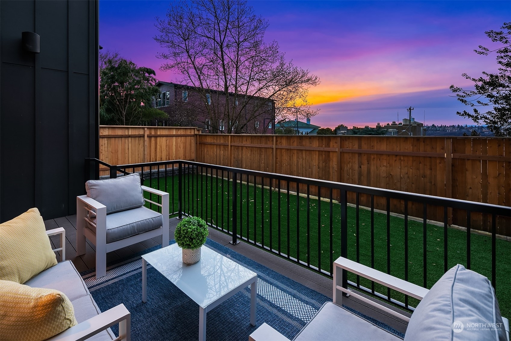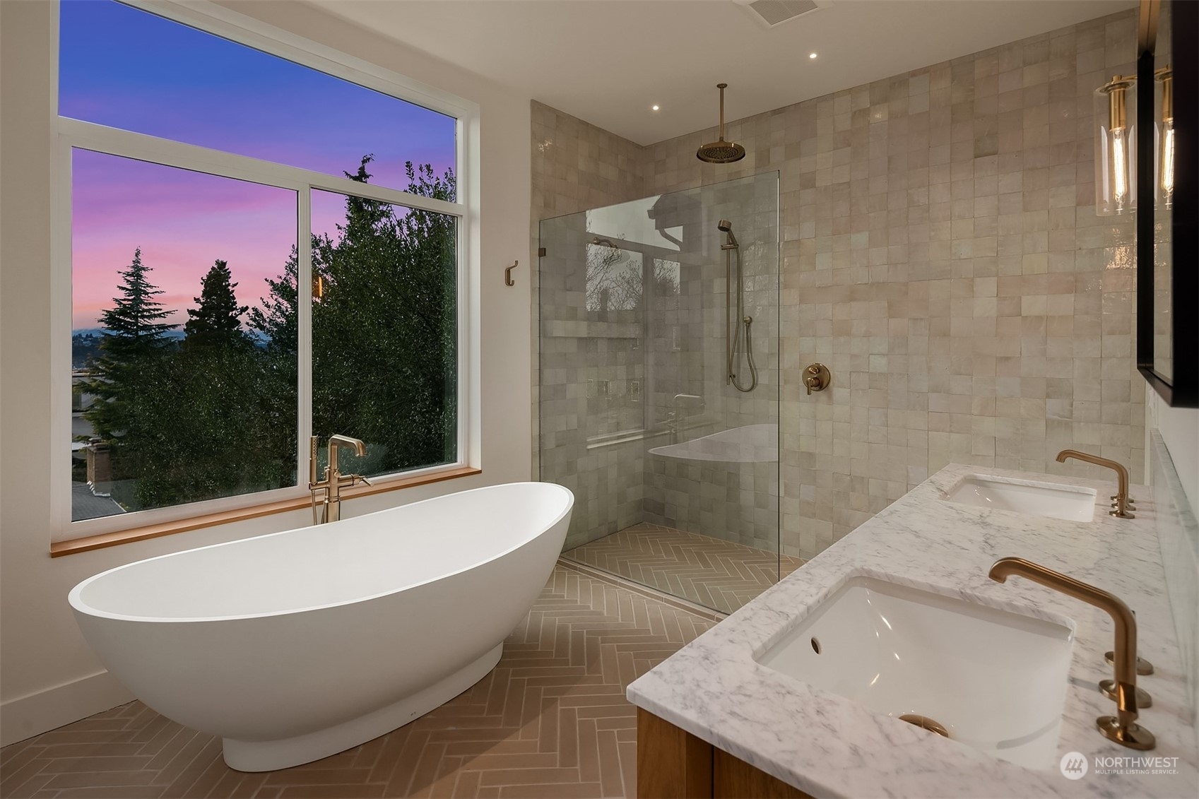 This new privately commissioned home from acclaimed developer Halverson Design Build reflects the elegance of North Capitol Hill’s most sought-after street – Federal Avenue. Enjoy stunning views of Seattle, Lake Union, and Olympic Mountains from the home’s expansive windows and spacious rooftop deck. This masterfully-designed home boasts abundant natural light, soaring ceilings + exquisitely curated finishes. Open-concept living features hardwoods, exposed beams, custom built-ins + fireplace. Chef’s kitchen impresses with premier appliances, Carrara marble counters, + large pantry. Retreat in luxury to owner’s suite with cathedral ceilings, fireplace, skylights, + spa-like bath. Home office, fenced backyard, bonus rooms, + two-car garage.