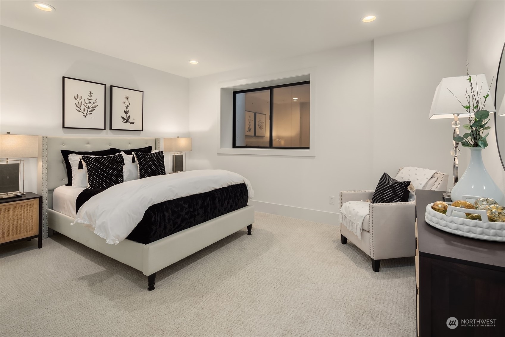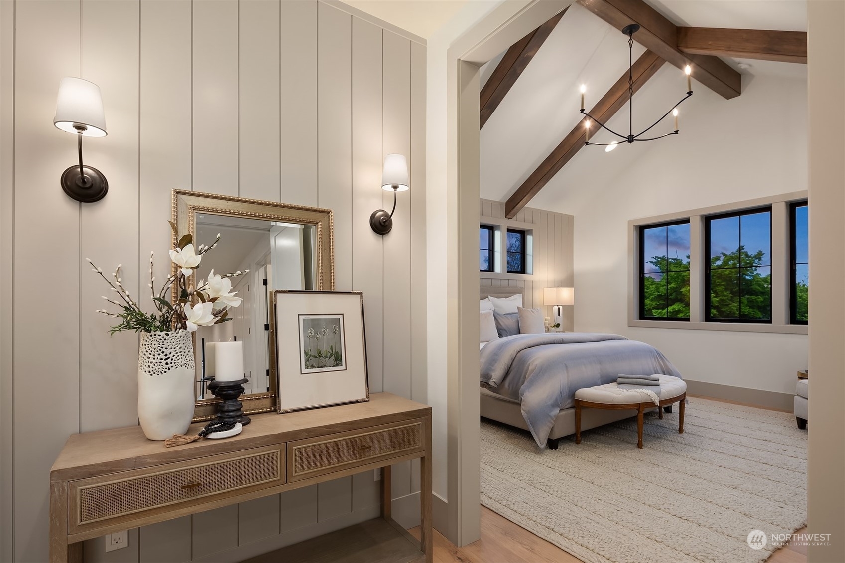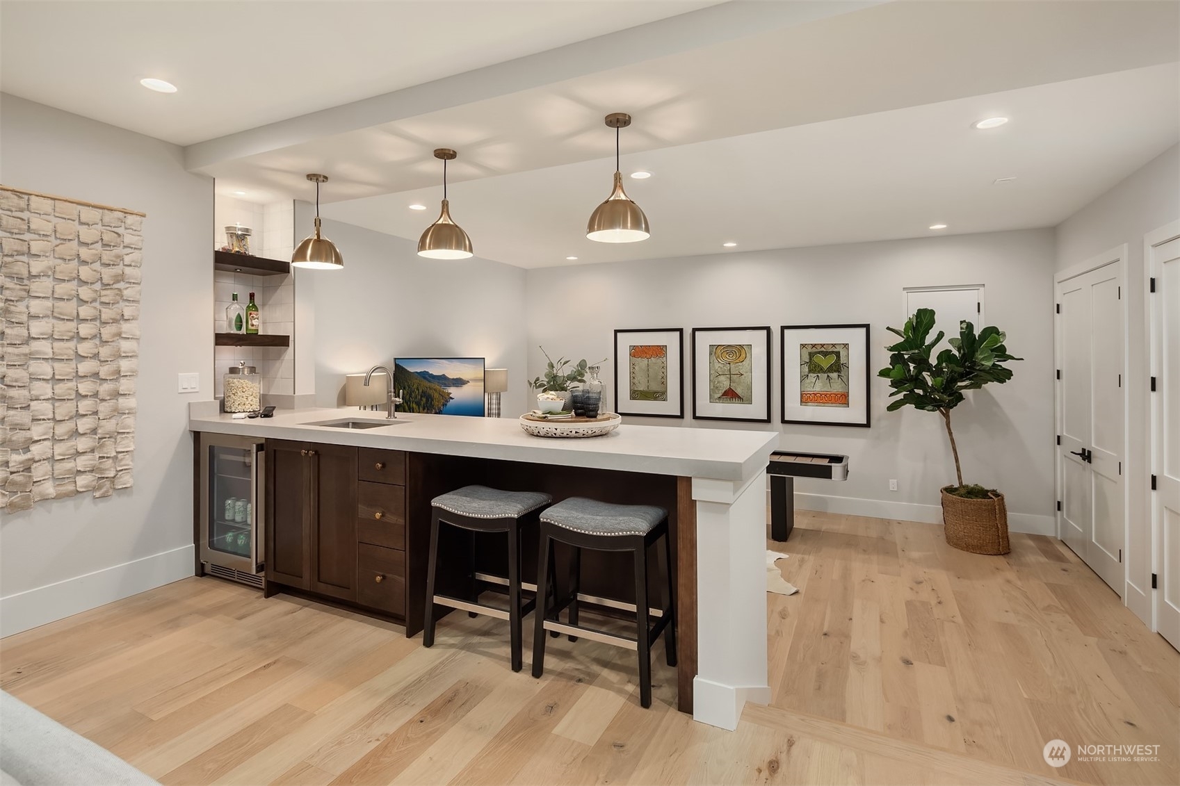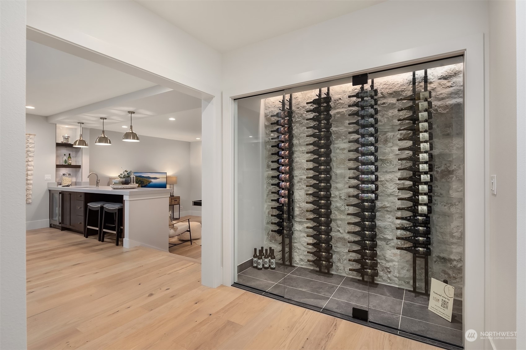 Discover elevated luxury living in this prestigious Sand Point Country Club home by Seattle's premier builder, Approach Build. Inside this timeless modern craftsman, experience grandeur with soaring two-story ceiling in the central living area. Gourmet kitchen boasts a Carrara marble island, butler's pantry and Nanawall window positioned over bar top with beverage center for in/outdoor hosting. Spacious backyard features a covered patio with custom fireplace. Well-appointed lower level is perfect for entertaining with built-in bar and custom designed to fit a Full Swing golf simulator. Upstairs, each of the four bedrooms offers an en-suite, while the luxurious primary spans the depth of the home, with vaulted ceilings and territorial views.