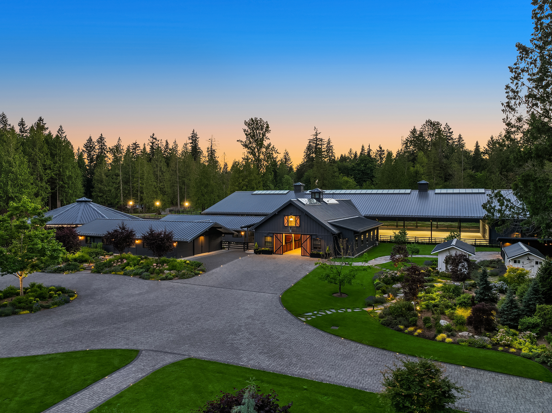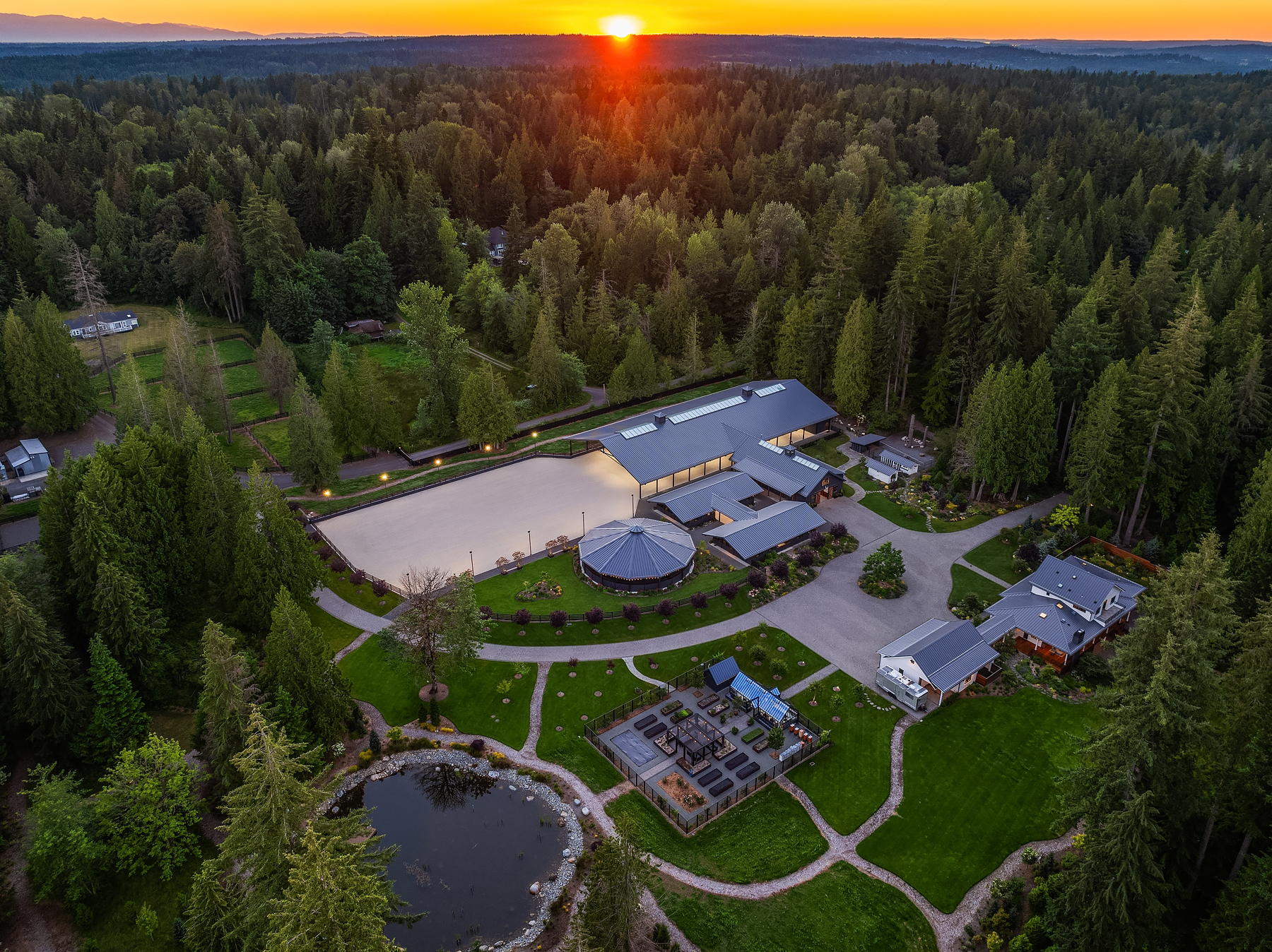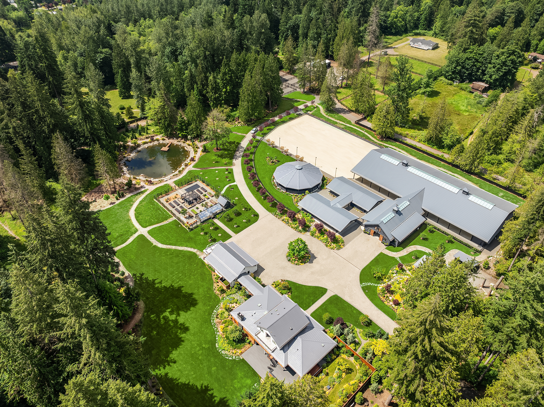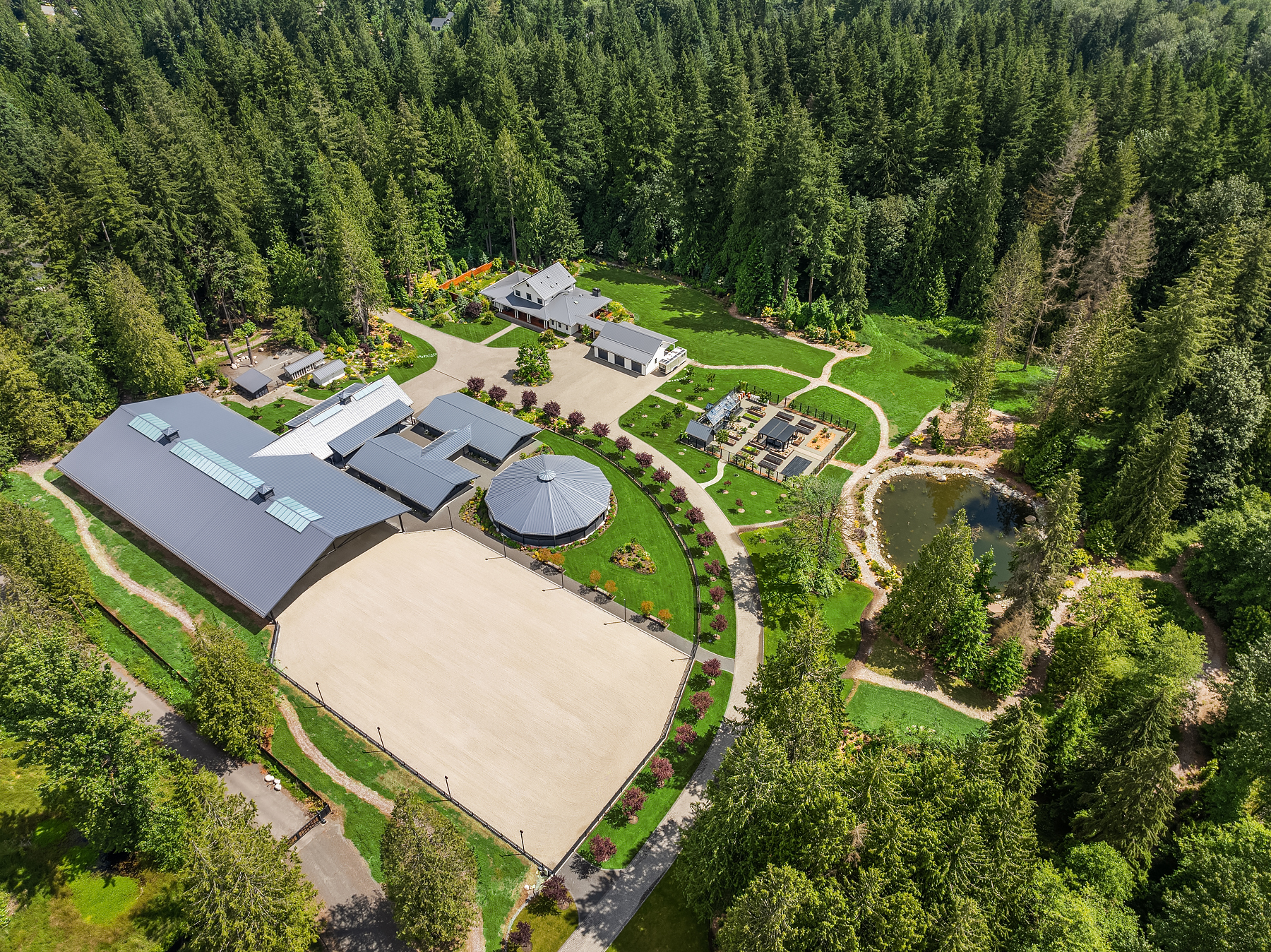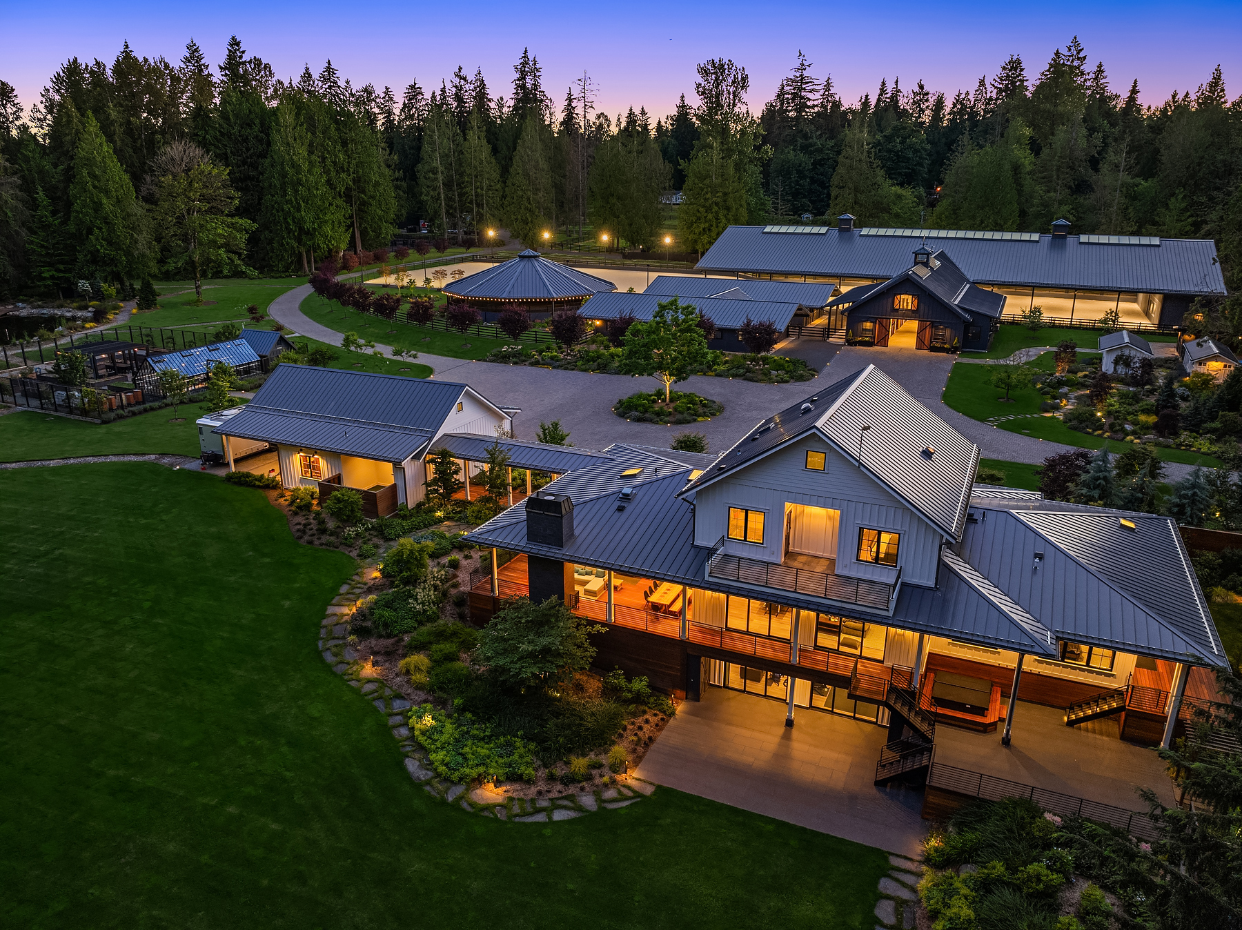 Lost Lake Farm, destined to be a NW Landmark in Equestrian living. A captivating masterpiece built in 2019 sited on over 23 perfected acres. Unparalleled State of the art horse facilities, 19 stalls, 80 x 200 covered arena blends seamlessly into a 110 X 200 outdoor portion for a total of 400' length. Hoofgrid paddocks, heated viewing rm, steel board fencing and countless equine amenities. Over 5000 SF Modern Farmhouse offers grand Great Room design w/ massive pocket doors opening to a forested backdrop & outdoor living spaces. The home and its surroundings were thoughtfully designed and executed with a no expense spared approach from start to finish. 2 gated entries, updated 2700+ SF 3 bed staff home, greenhouse, fenced gardens, RV parking
