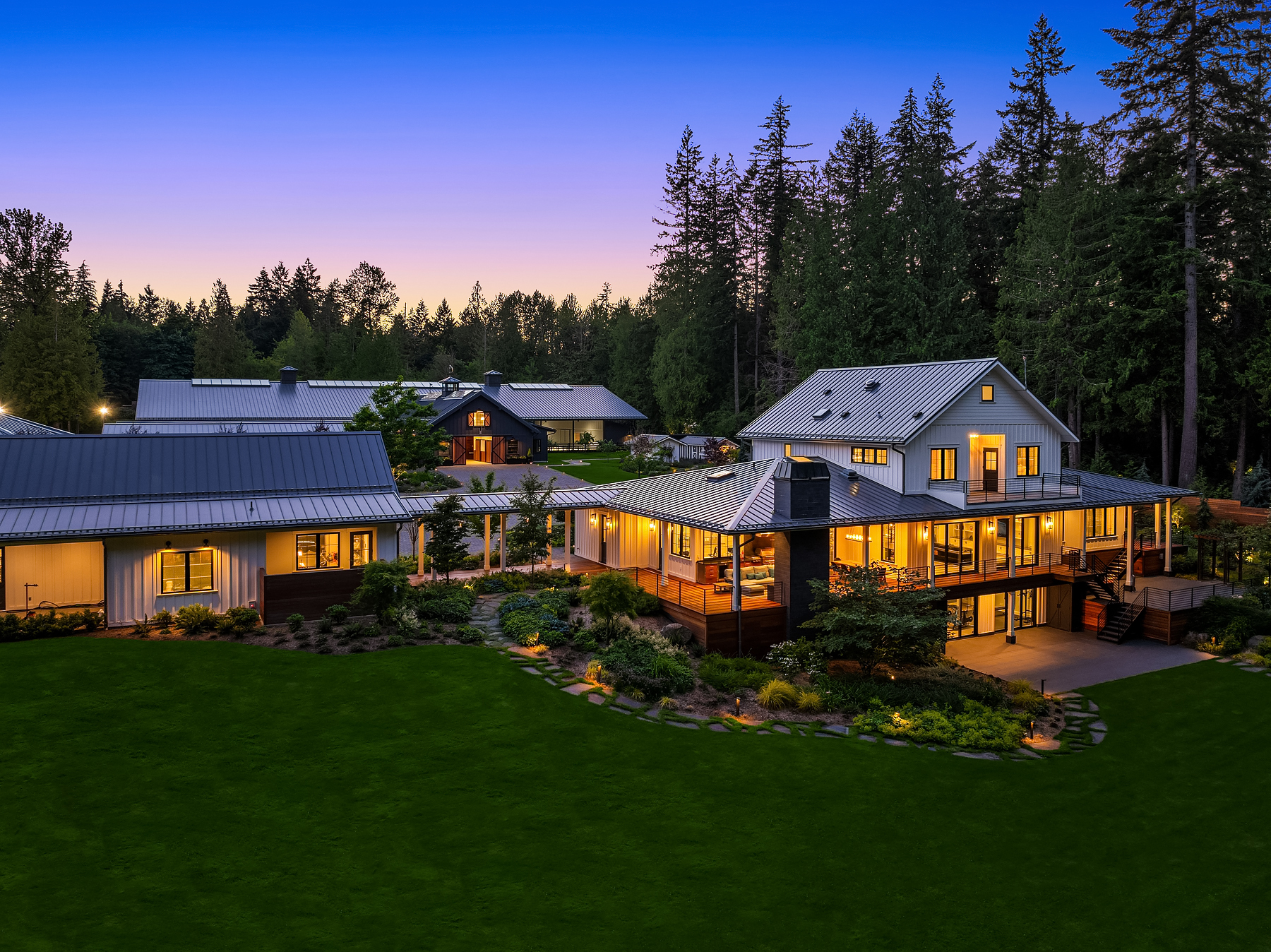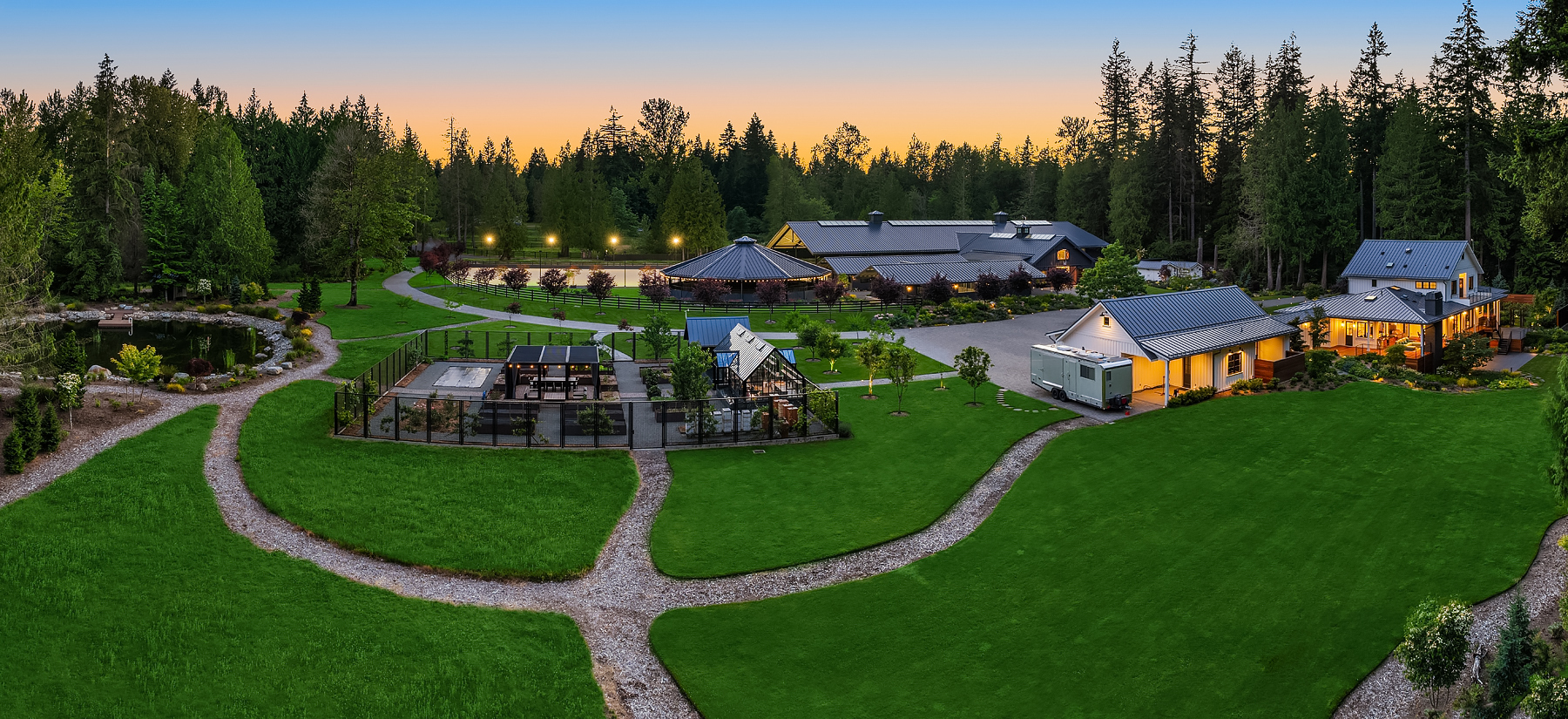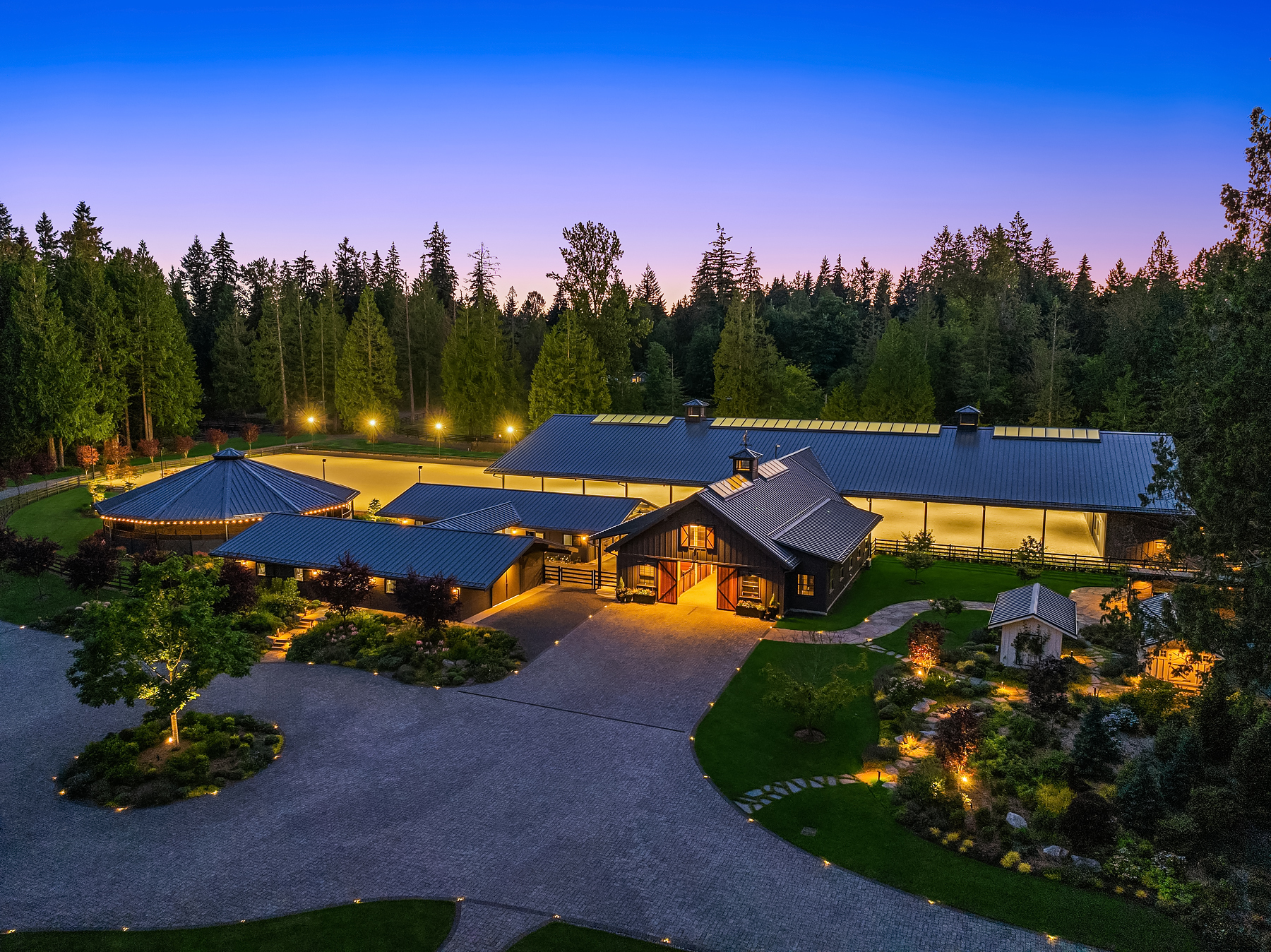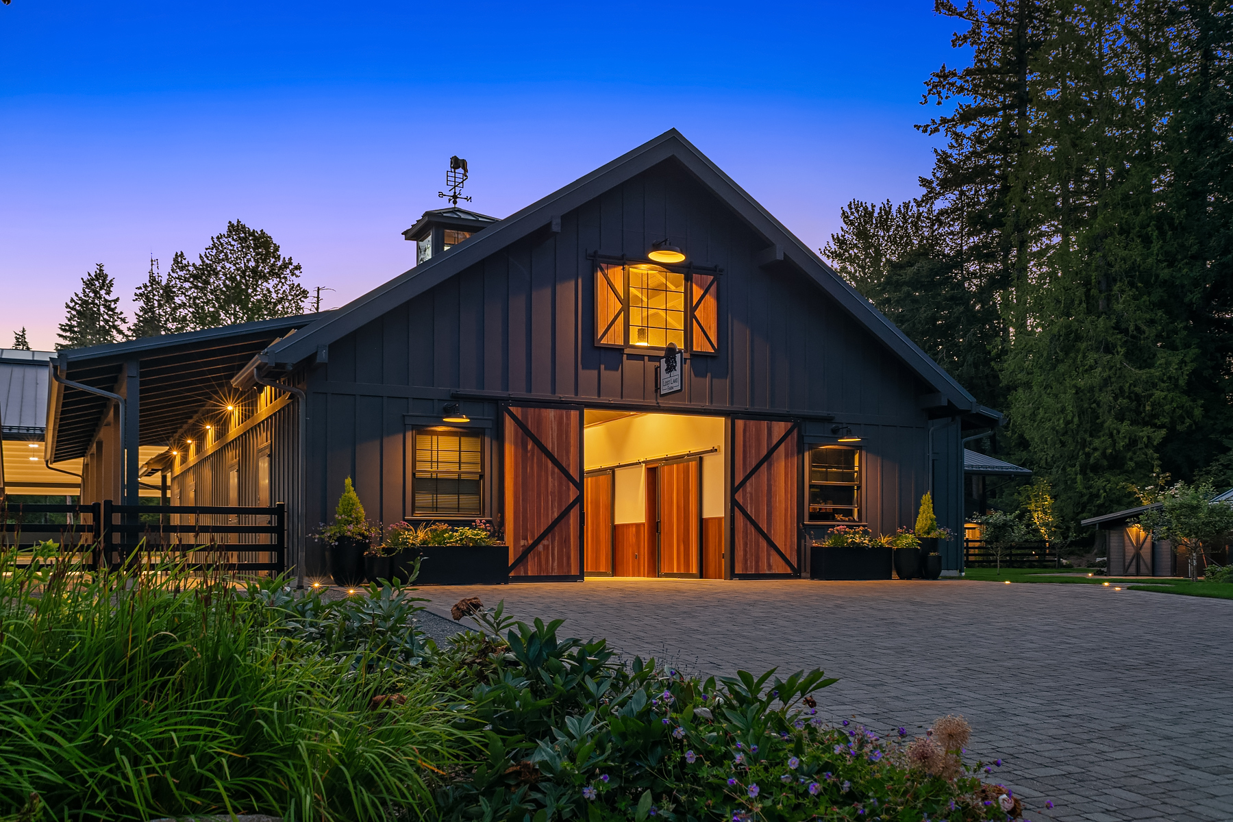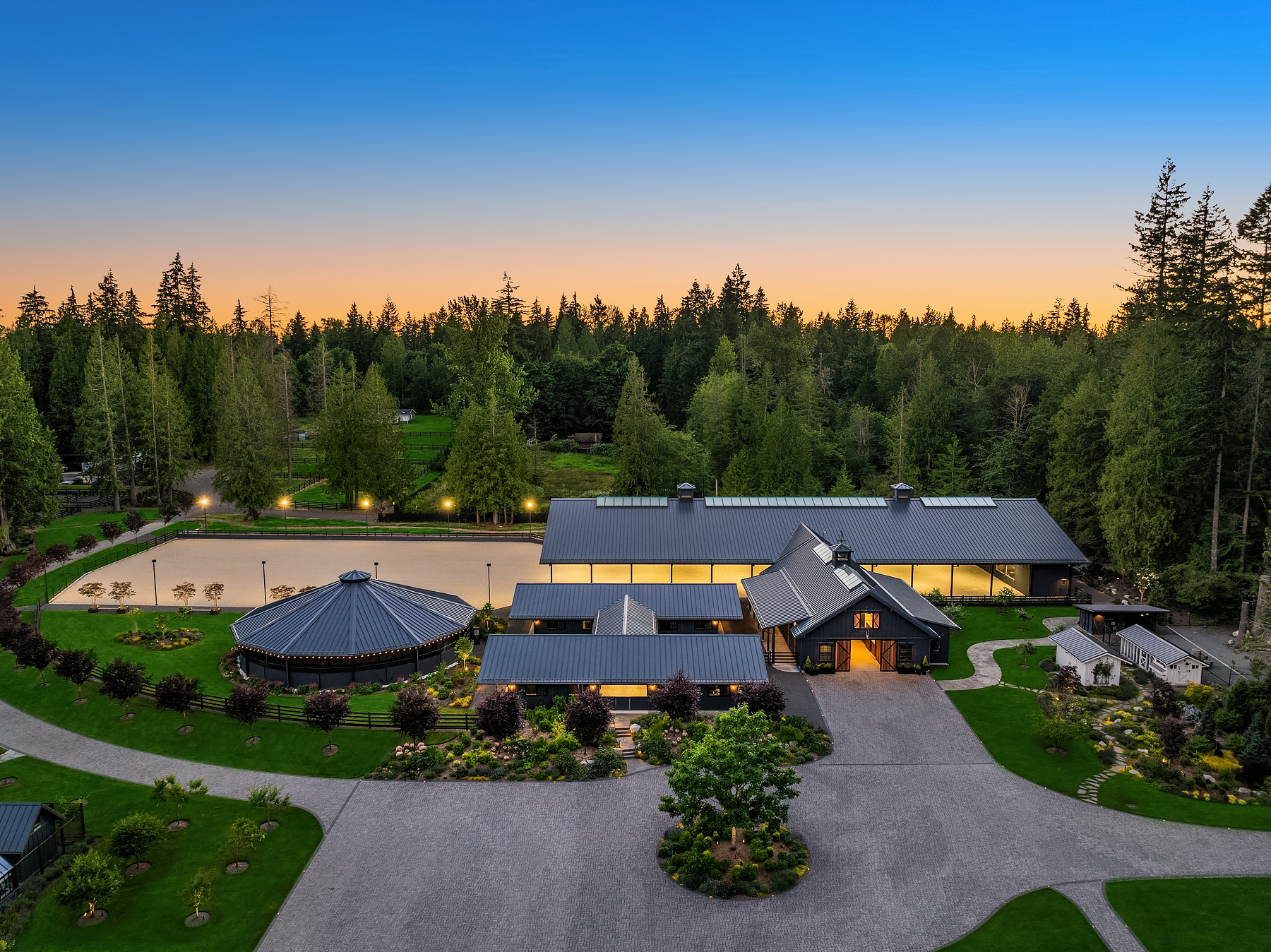Lost Lake Farm, destined to be a NW Landmark in Equestrian living. A captivating masterpiece built in 2019 sited on over 23 perfected acres. Unparalleled State of the art horse facilities, 19 stalls, 80 x 200 covered arena blends seamlessly into a 110 X 200 outdoor portion for a total of 400' length. Hoofgrid paddocks, heated viewing rm, steel board fencing and countless equine amenities. Over 5000 SF Modern Farmhouse offers grand Great Room design w/ massive pocket doors opening to a forested backdrop & outdoor living spaces. The home and its surroundings were thoughtfully designed and executed with a no expense spared approach from start to finish. 2 gated entries, updated 2700+ SF 3 bed staff home, greenhouse, fenced gardens, RV parking