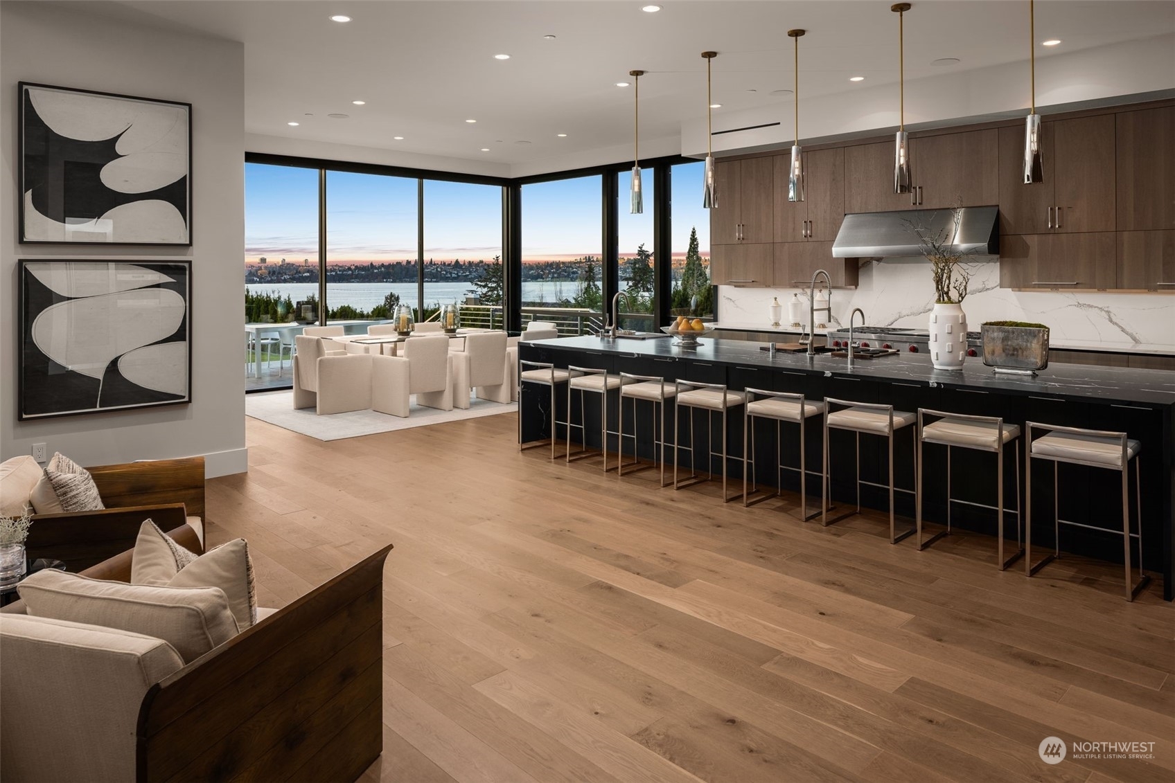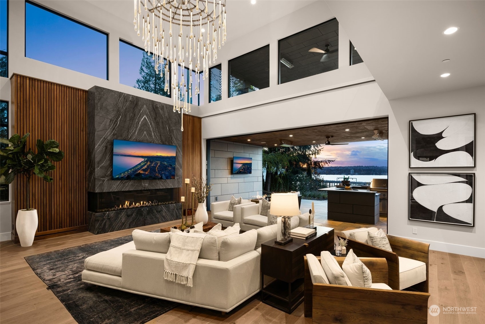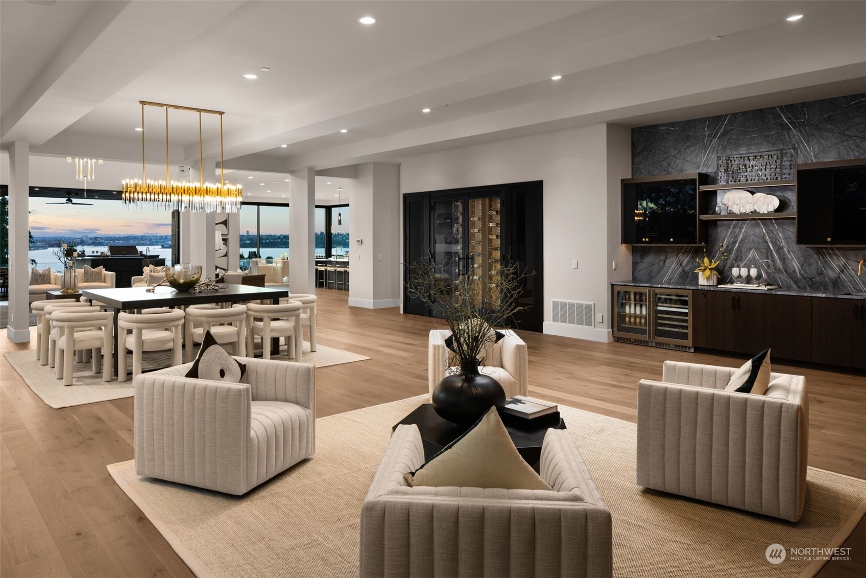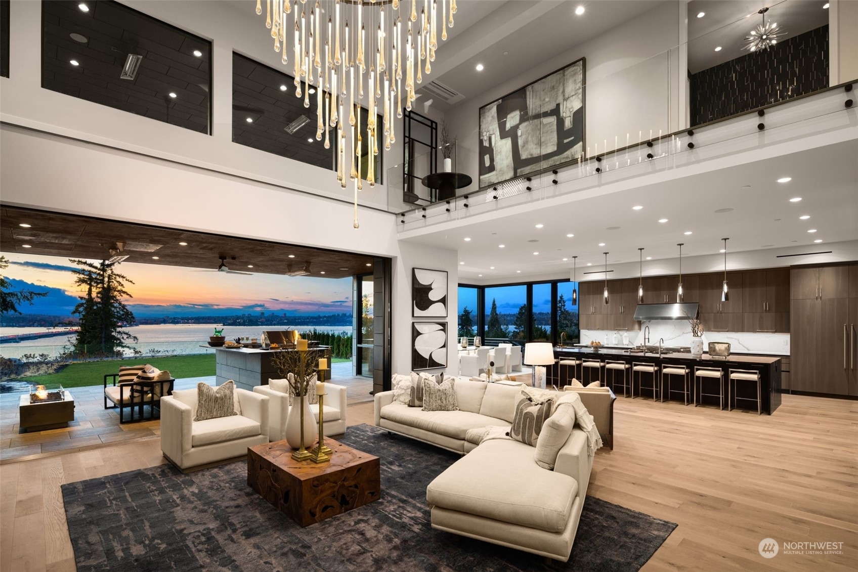 The most exclusive new-construction offering in Medina—where modern design, scale, & rare waterfront access converge. This 12,000+ SF gated estate showcases soaring architecture, an illuminated 20’ quartzite entry wall, and gallery-like interiors with panoramic west-facing views of Lake Washington, Seattle & the Olympics. The main level redefines entertaining with a 22’ wall of glass that disappears to unite indoor & heated outdoor living. A culinary statement, the home offers a primary kitchen and fully outfitted prep kitchen. Amenities include dual primary suites, wine room, theater, sauna, elevator, and 4-car garage. Private path to 32’ of shared waterfront with dock and moorage. A singular opportunity in Medina’s most coveted location.