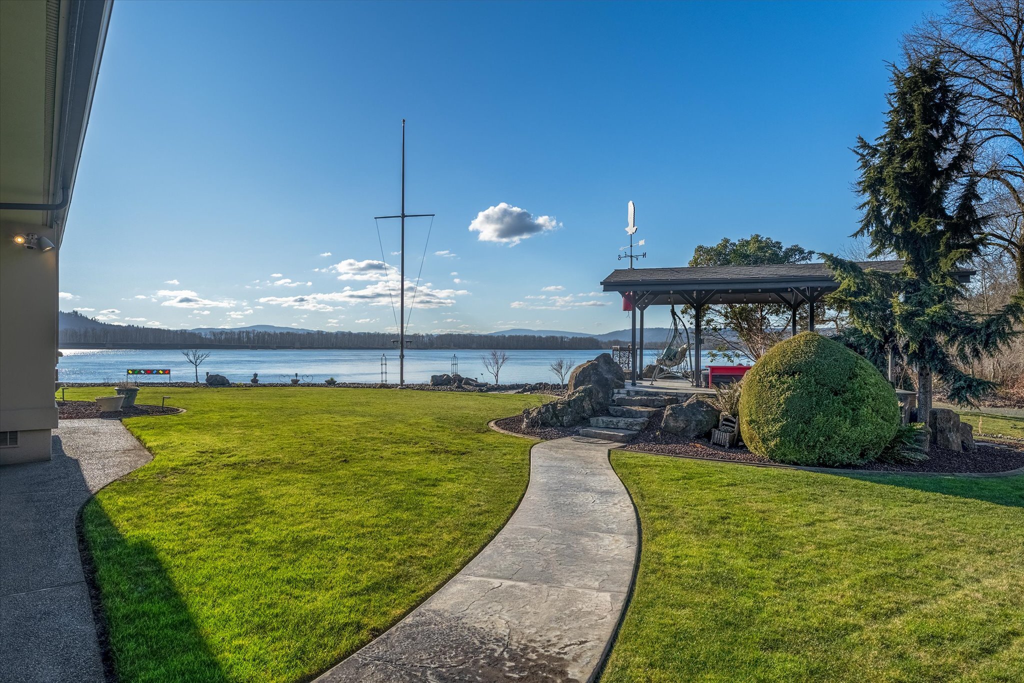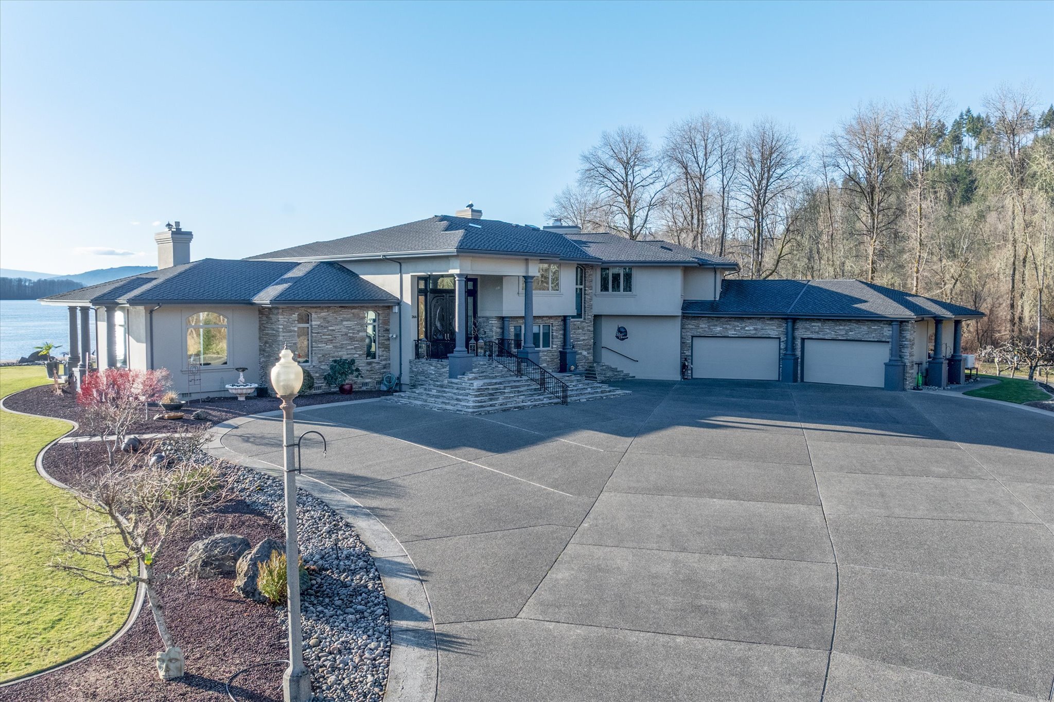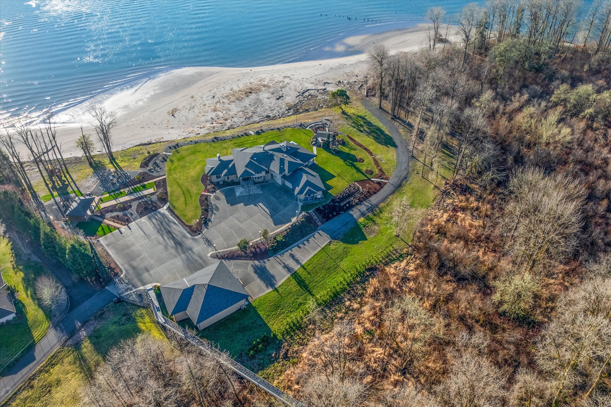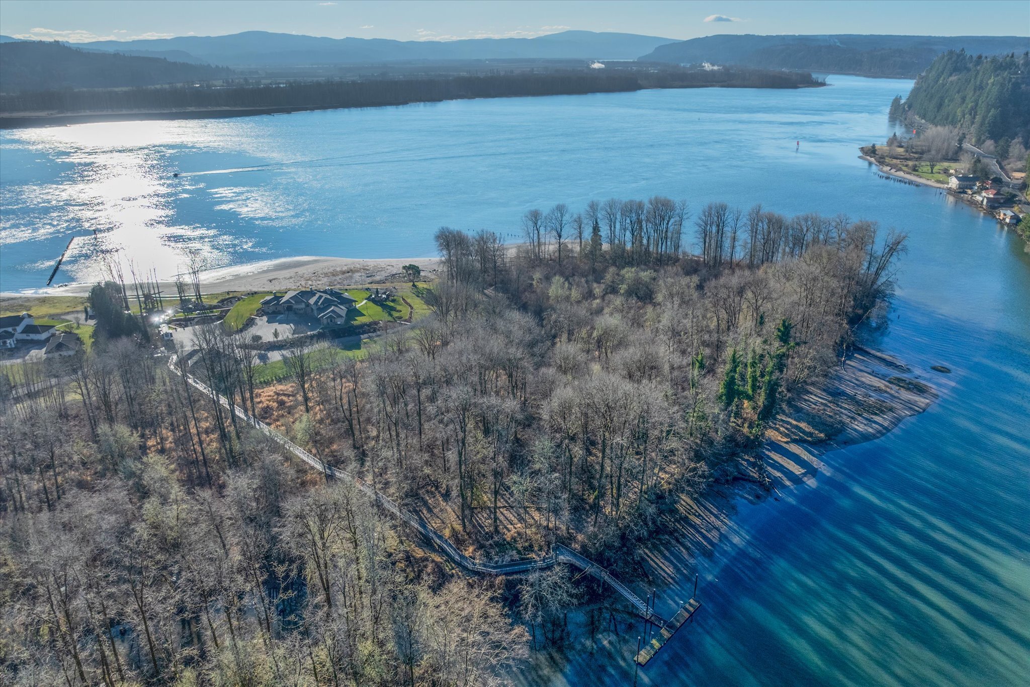 Stunning waterfront estate offers an unparalleled lifestyle, with 16 acres of privacy surrounded by water on three sides. Over 1,000 feet of sandy Columbia River beach and breathtaking views from nearly every room in the 7,280 sq ft home. Picturesque boardwalk leads to the 80-ft long boat dock, ideal for water adventures. Completely remodeled open kitchen is a chef’s dream with 3 ovens, quartz counters, and so much more. River front gazebo is perfect for hosting large gatherings with a full kitchen and the option to enclose-complete with playground, gas fire pit and more. 4 bedrooms, office, 2 versatile flex rooms and 5 bathrooms. Primary suite is an oasis of comfort you'll never want to leave. Garage parking for at least 10 cars and an RV.