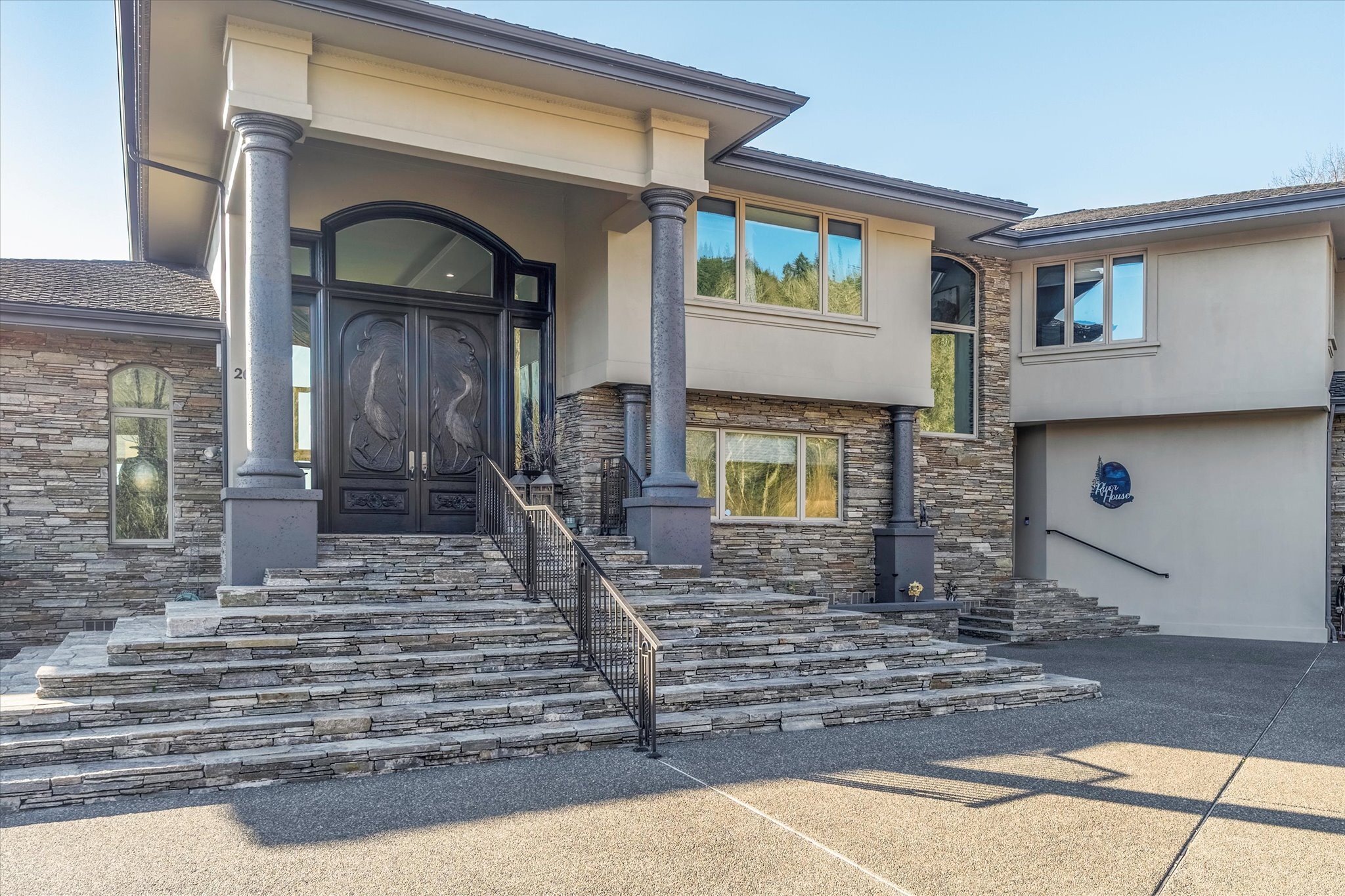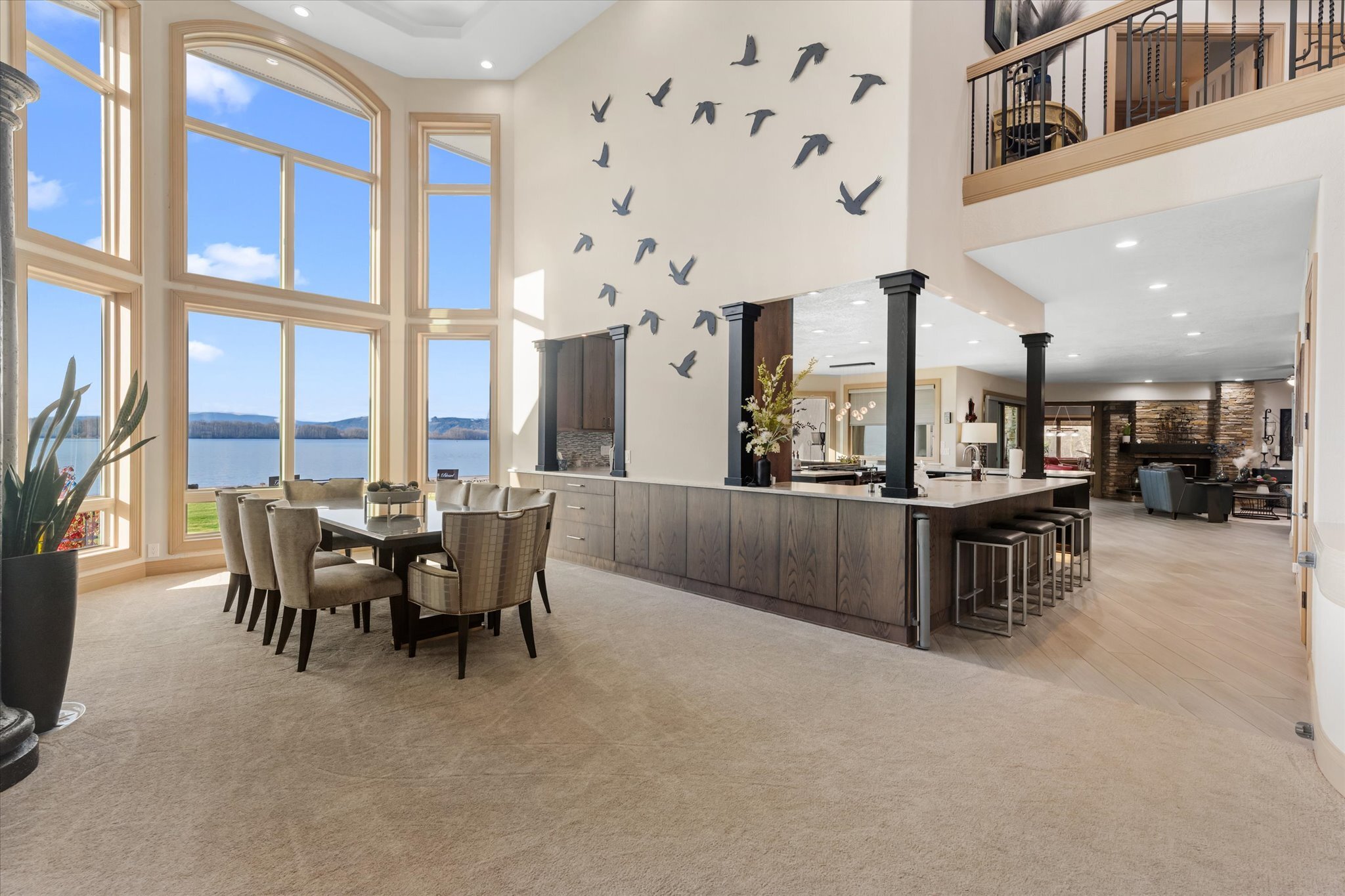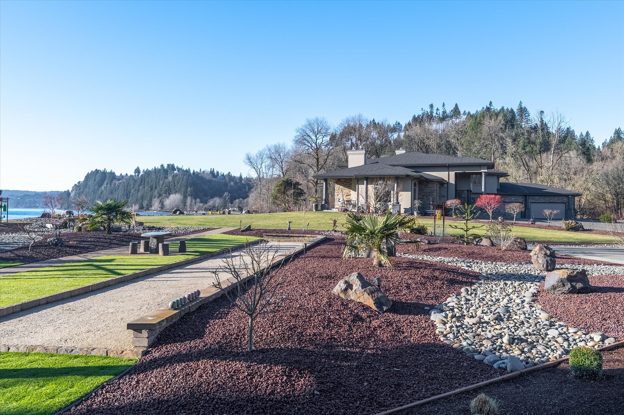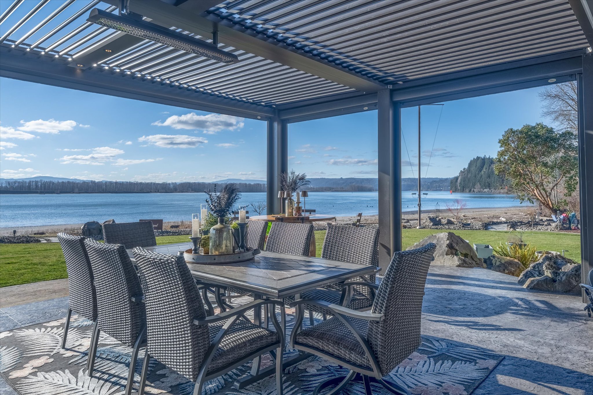 Stunning waterfront estate offers an unparalleled lifestyle, with 16 acres of privacy surrounded by water on three sides. Over 1,000 feet of sandy Columbia River beach and breathtaking views from nearly every room in the 7,280 sq ft home. Picturesque boardwalk leads to the 80-ft long boat dock, ideal for water adventures. Completely remodeled open kitchen is a chef’s dream with 3 ovens, quartz counters, and so much more. River front gazebo is perfect for hosting large gatherings with a full kitchen and the option to enclose-complete with playground, gas fire pit and more. 4 bedrooms, office, 2 versatile flex rooms and 5 bathrooms. Primary suite is an oasis of comfort you'll never want to leave. Garage parking for at least 10 cars and an RV.