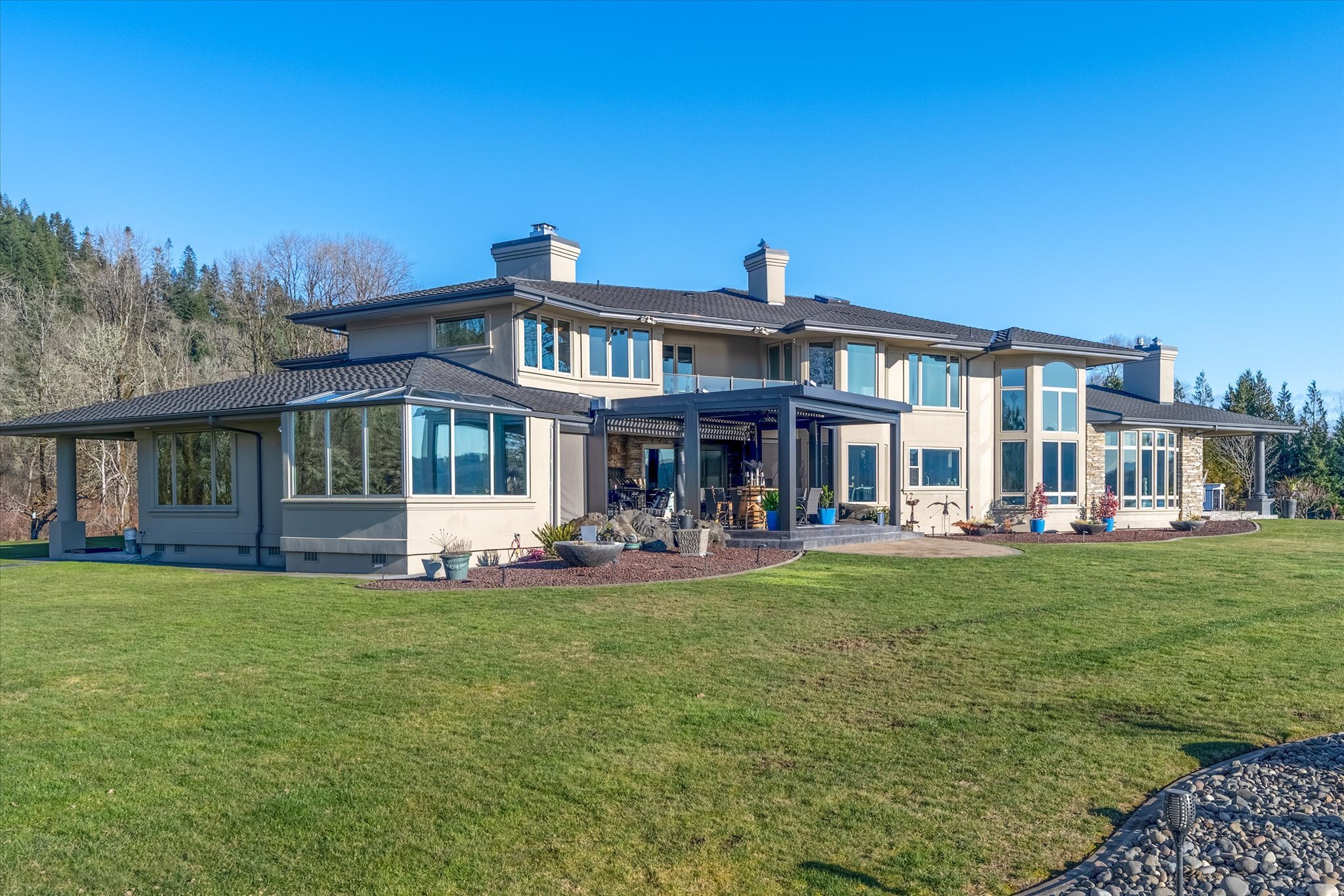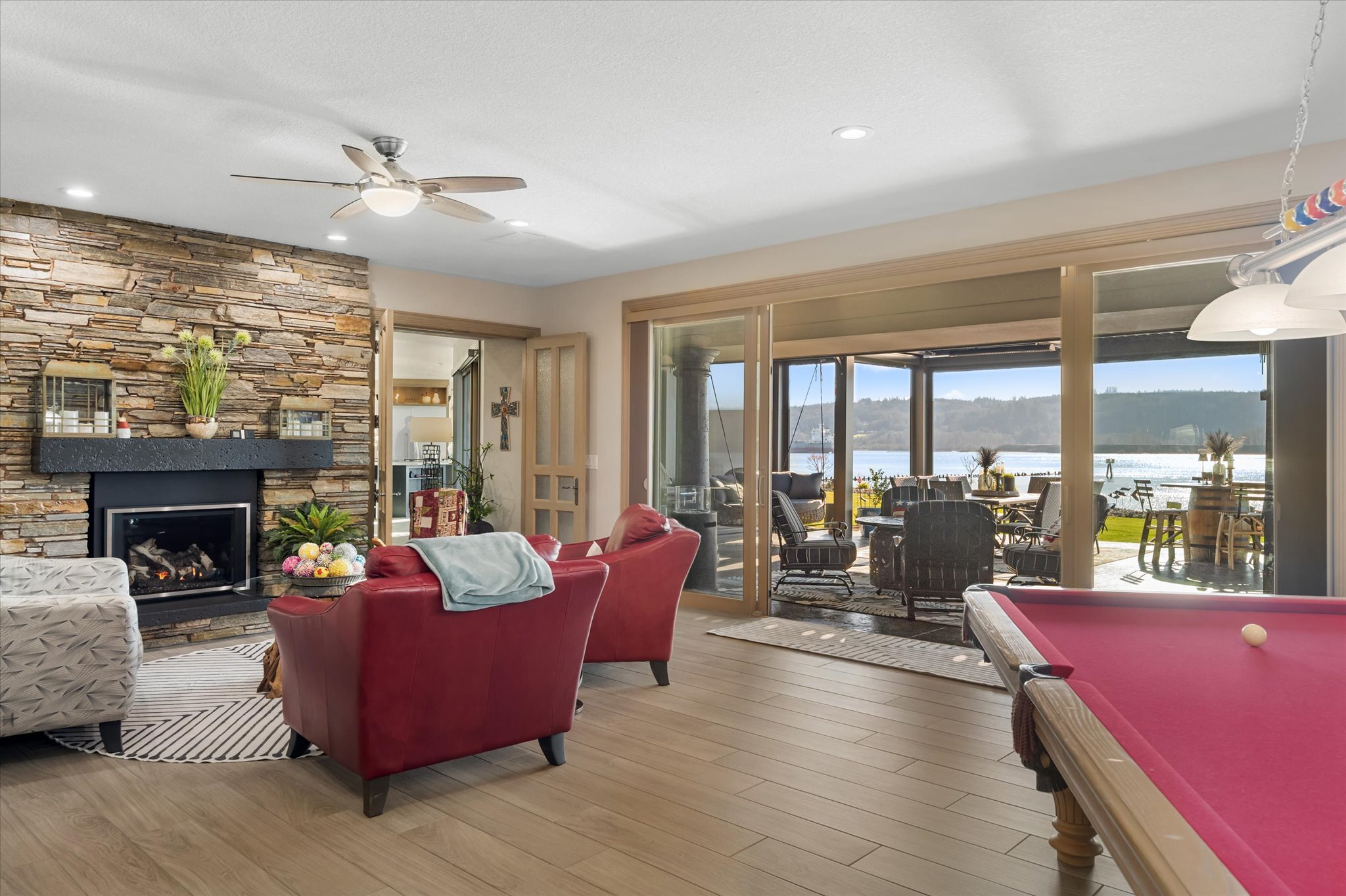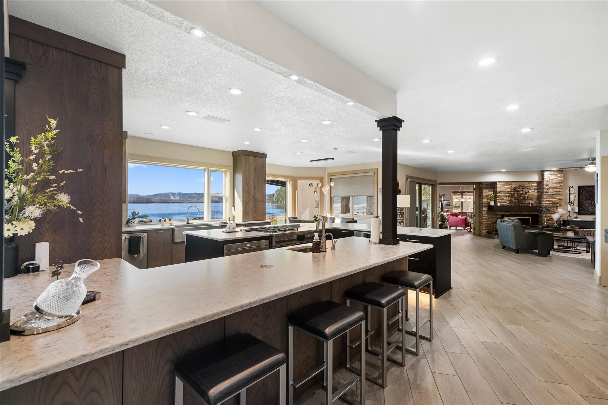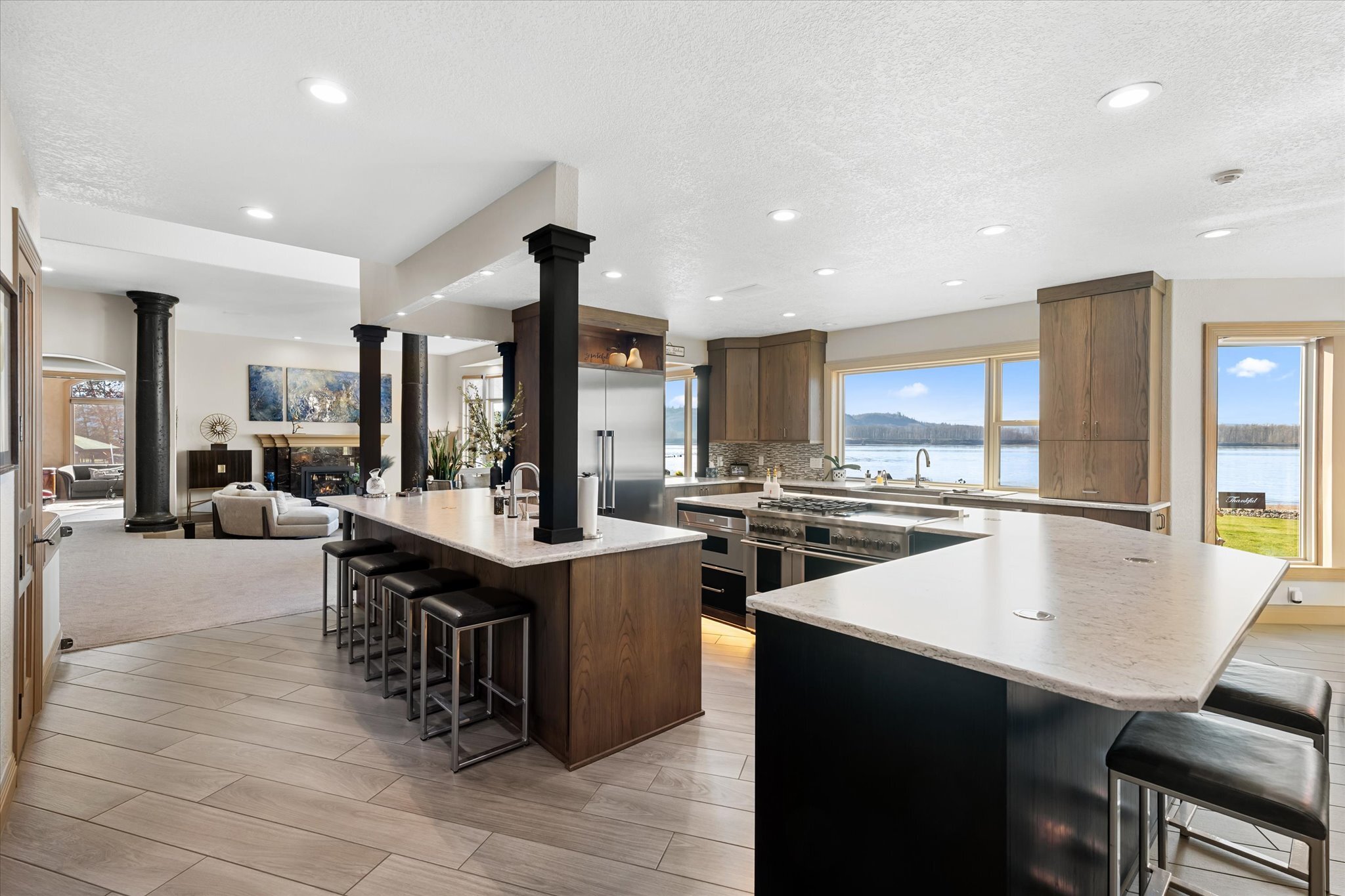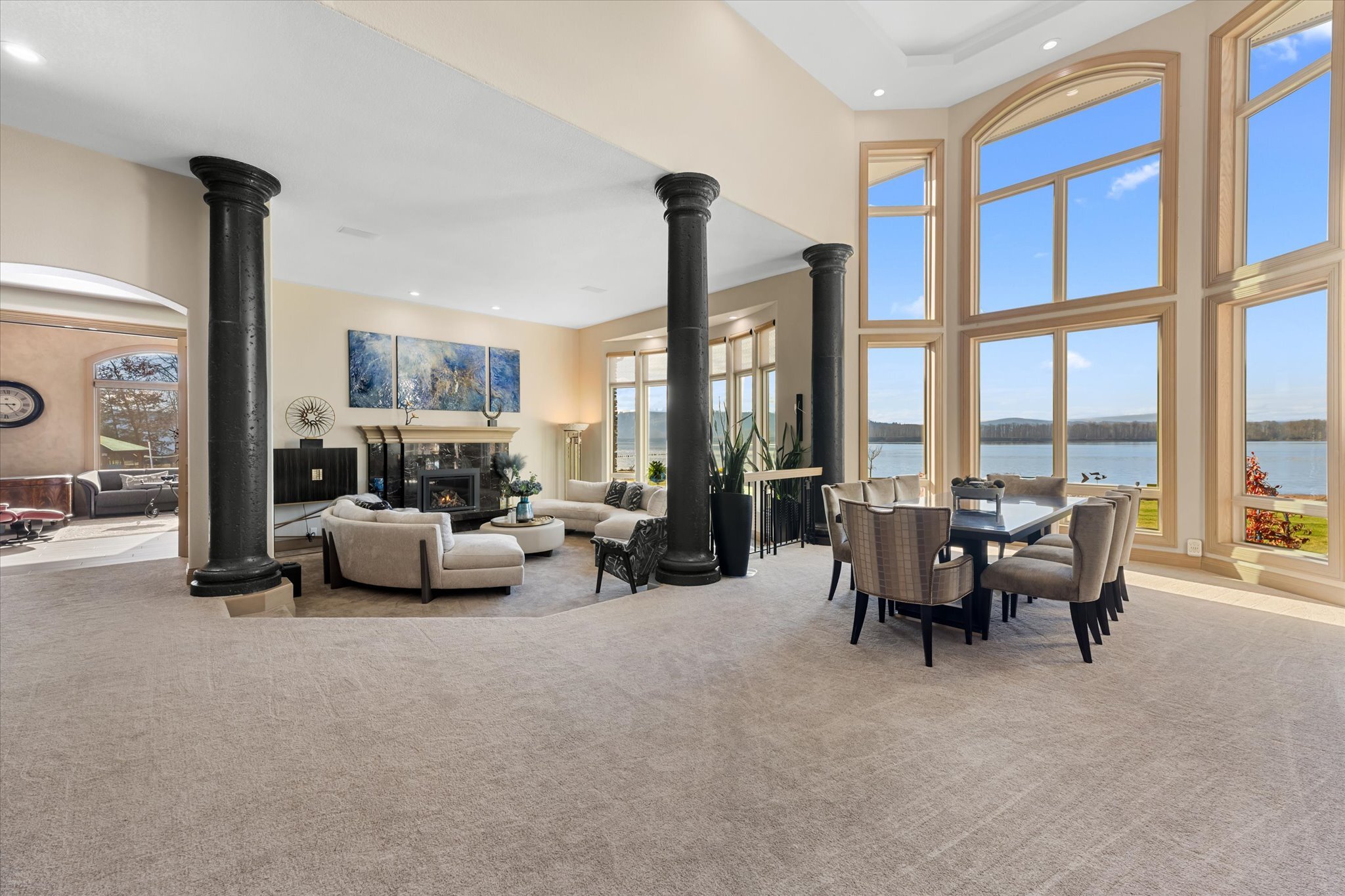 Stunning waterfront estate offers an unparalleled lifestyle, with 16 acres of privacy surrounded by water on three sides. Over 1,000 feet of sandy Columbia River beach and breathtaking views from nearly every room in the 7,280 sq ft home. Picturesque boardwalk leads to the 80-ft long boat dock, ideal for water adventures. Completely remodeled open kitchen is a chef’s dream with 3 ovens, quartz counters, and so much more. River front gazebo is perfect for hosting large gatherings with a full kitchen and the option to enclose-complete with playground, gas fire pit and more. 4 bedrooms, office, 2 versatile flex rooms and 5 bathrooms. Primary suite is an oasis of comfort you'll never want to leave. Garage parking for at least 10 cars and an RV.