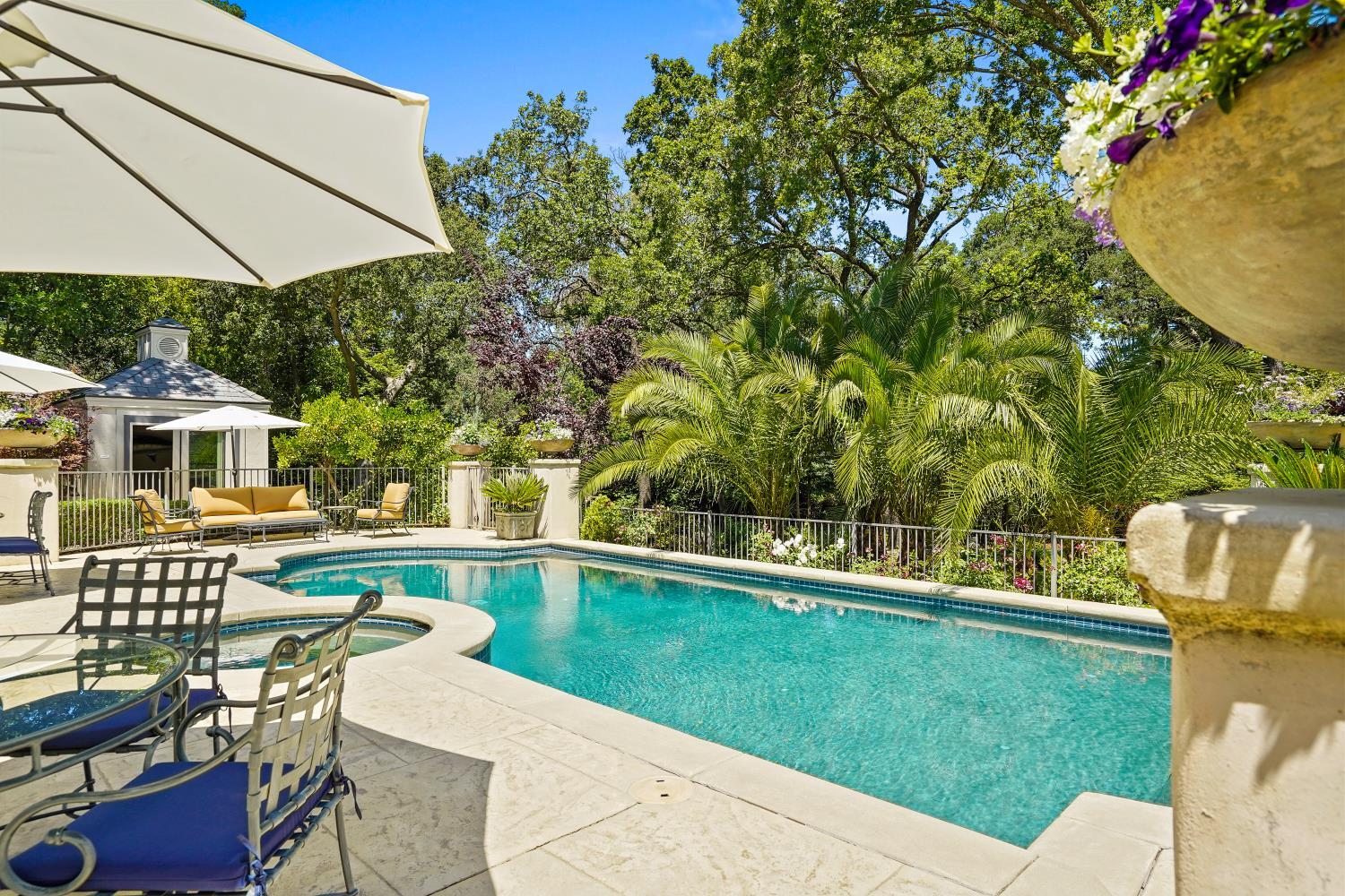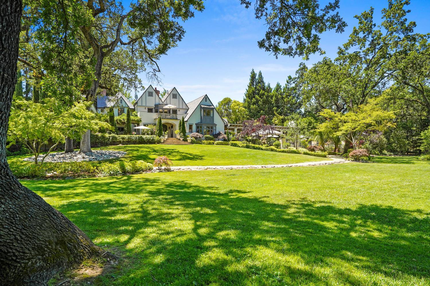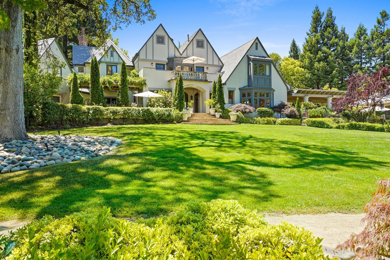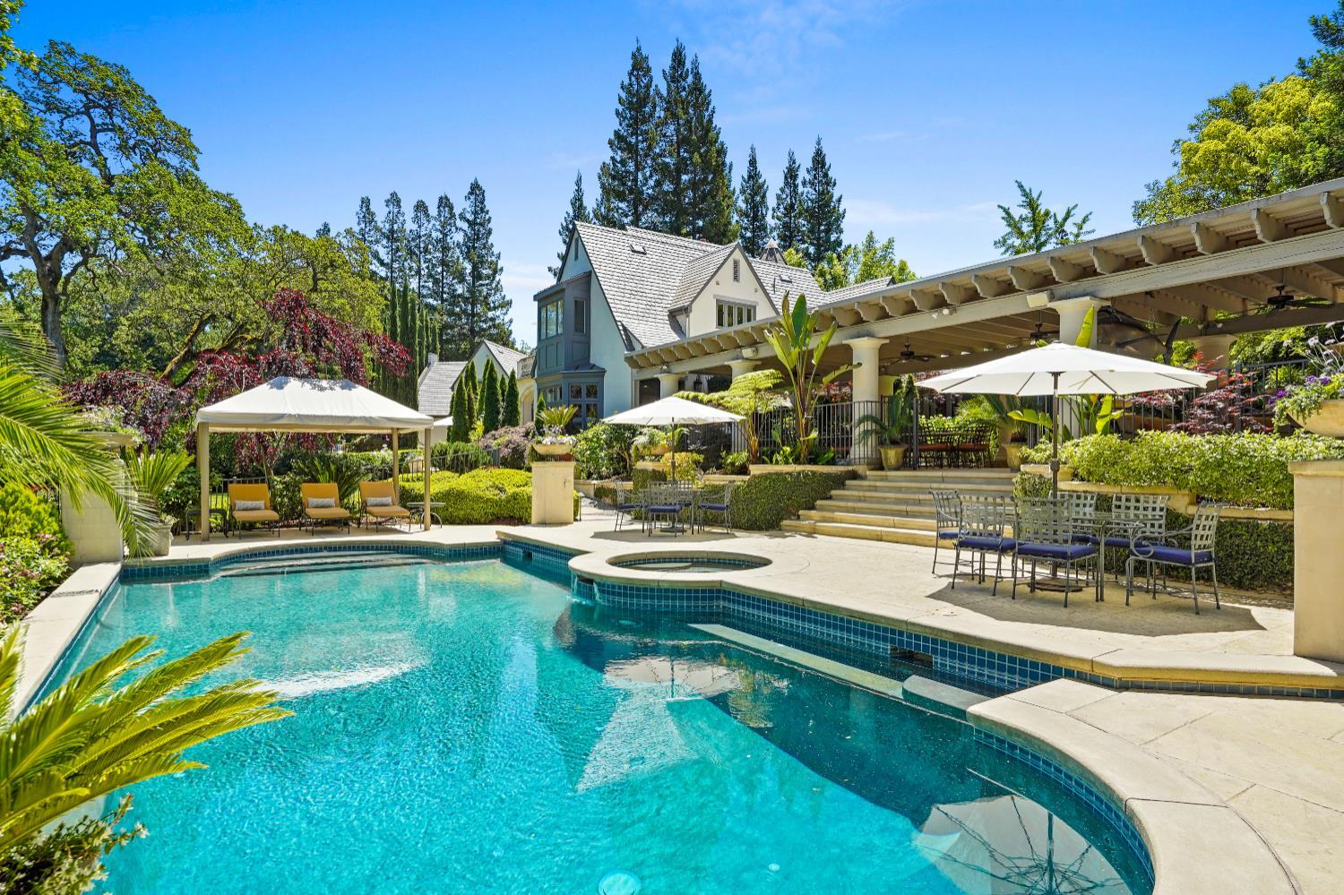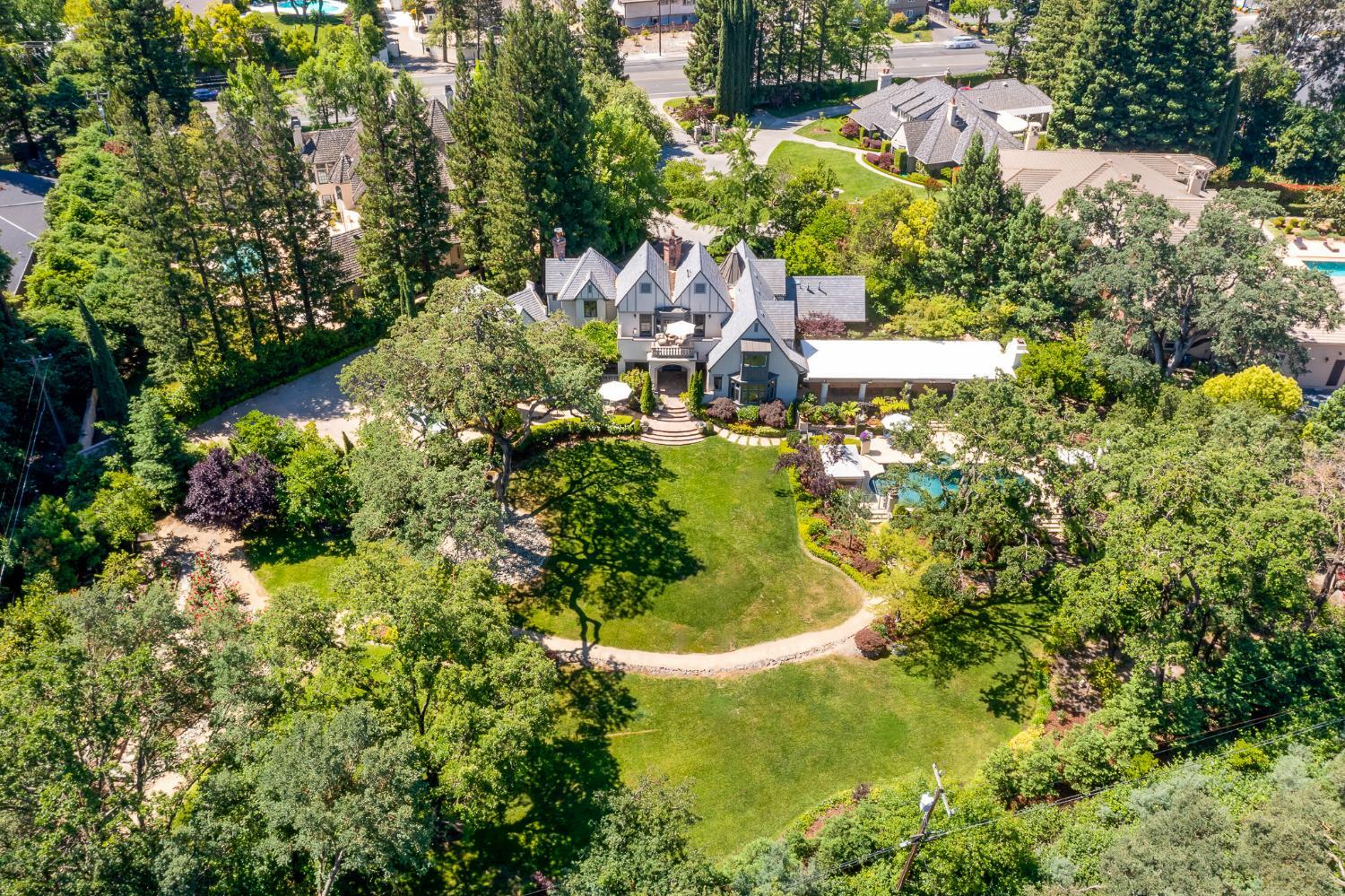 Prestigious Knightsbridge Lane, secluded behind gates, is home to this exceptional estate offering privacy and elegance in Sierra Oaks Vista. Set on over an acre of lush gardens and majestic Heritage Oaks, this Chateau-inspired home seamlessly blends timeless charm with modern luxury. Inside, you'll find stunning beamed ceilings in the formal dining room, a full library, and a gourmet chef's kitchen featuring a grand marble islandperfect for entertaining. The spa-inspired primary suite offers a tranquil retreat with a balcony overlooking the gardens, while the spectacular wine cellar, separate in-law flat, and poolside gym cater to every lifestyle need. Step outside to enjoy a resort-style loggia with seating for 20, an outdoor kitchen and BBQ, a relaxing fireplace lounge by the pool, a rose garden, and a secluded fire pit. All just minutes from top schools, restaurants, shopping, freeway access, and downtown Sacramento. This is more than a homeit's a private sanctuary in the heart of the city.