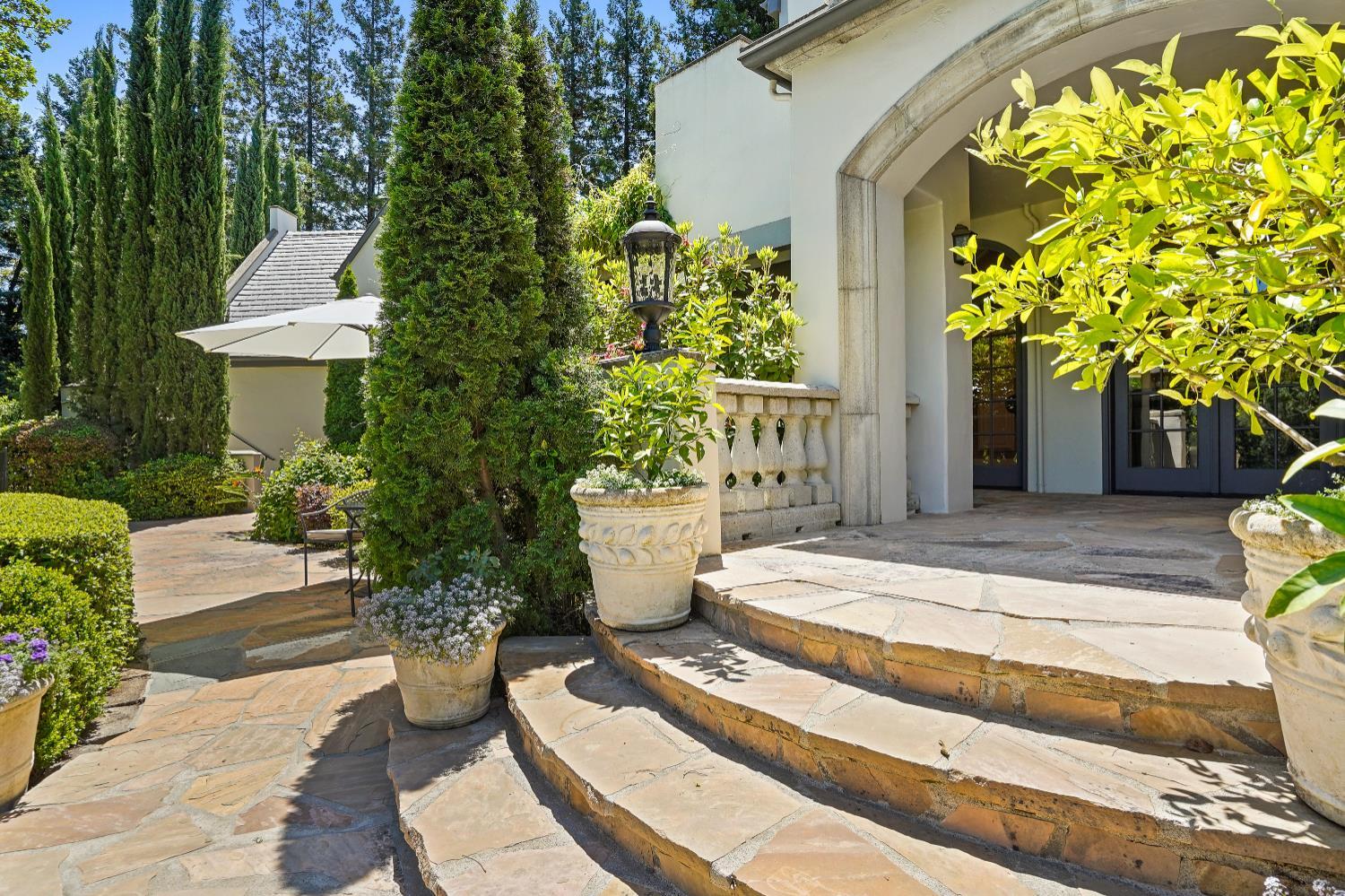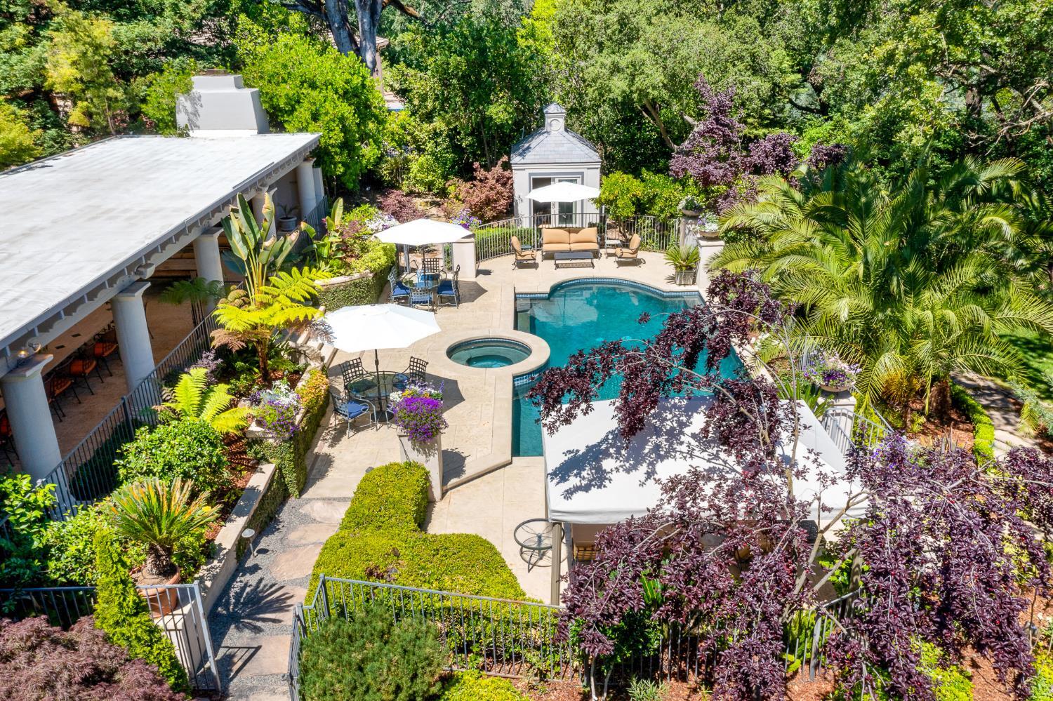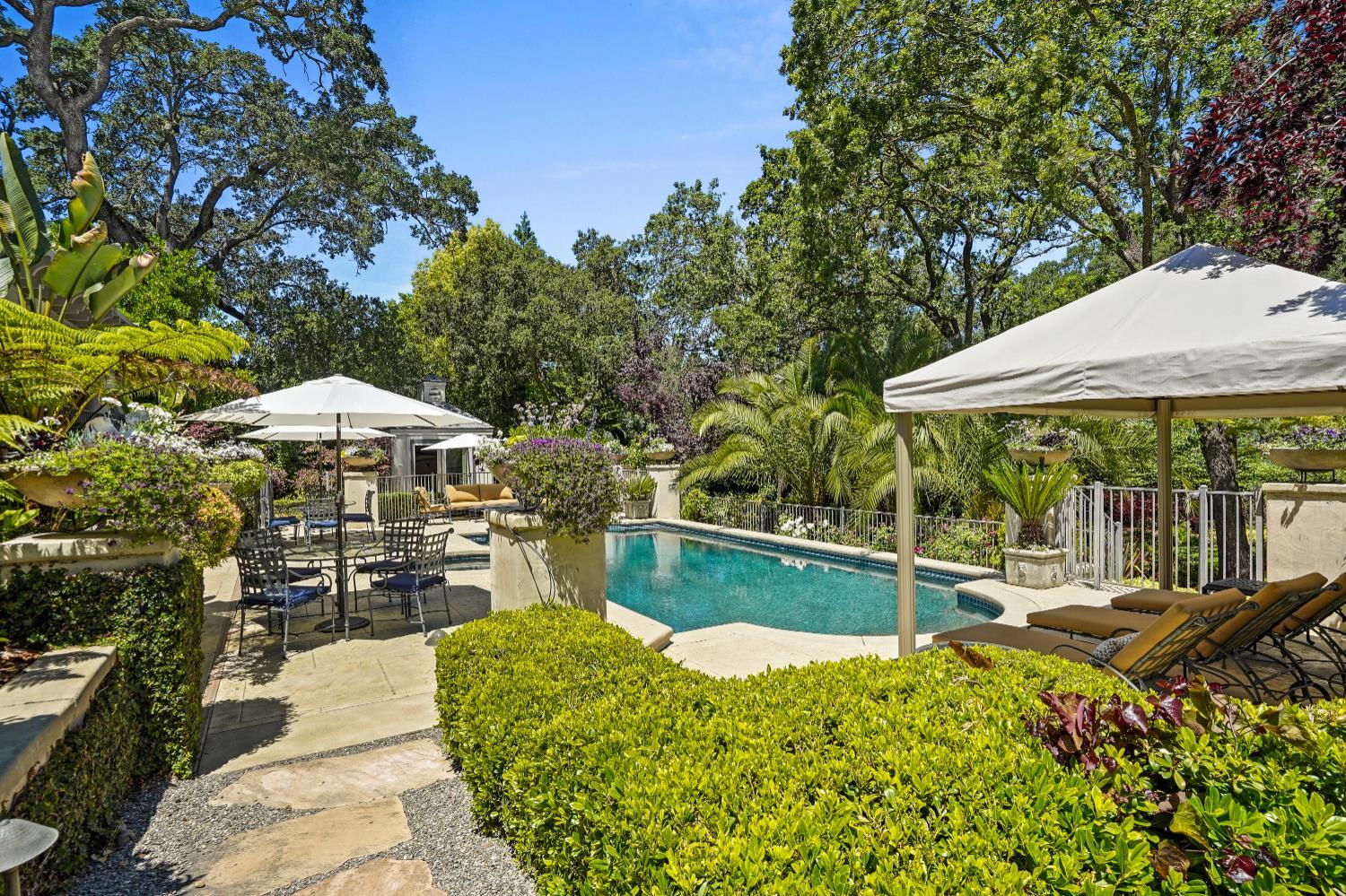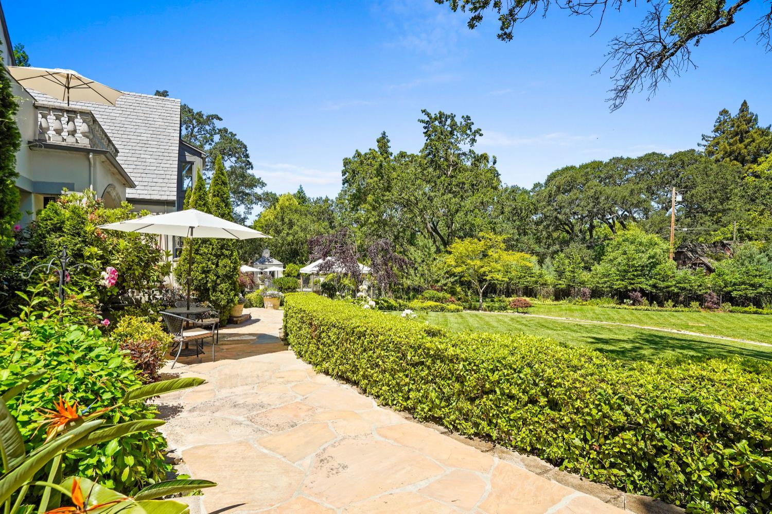 Prestigious Knightsbridge Lane, secluded behind gates, is home to this exceptional estate offering privacy and elegance in Sierra Oaks Vista. Set on over an acre of lush gardens and majestic Heritage Oaks, this Chateau-inspired home seamlessly blends timeless charm with modern luxury. Inside, you'll find stunning beamed ceilings in the formal dining room, a full library, and a gourmet chef's kitchen featuring a grand marble islandperfect for entertaining. The spa-inspired primary suite offers a tranquil retreat with a balcony overlooking the gardens, while the spectacular wine cellar, separate in-law flat, and poolside gym cater to every lifestyle need. Step outside to enjoy a resort-style loggia with seating for 20, an outdoor kitchen and BBQ, a relaxing fireplace lounge by the pool, a rose garden, and a secluded fire pit. All just minutes from top schools, restaurants, shopping, freeway access, and downtown Sacramento. This is more than a homeit's a private sanctuary in the heart of the city.