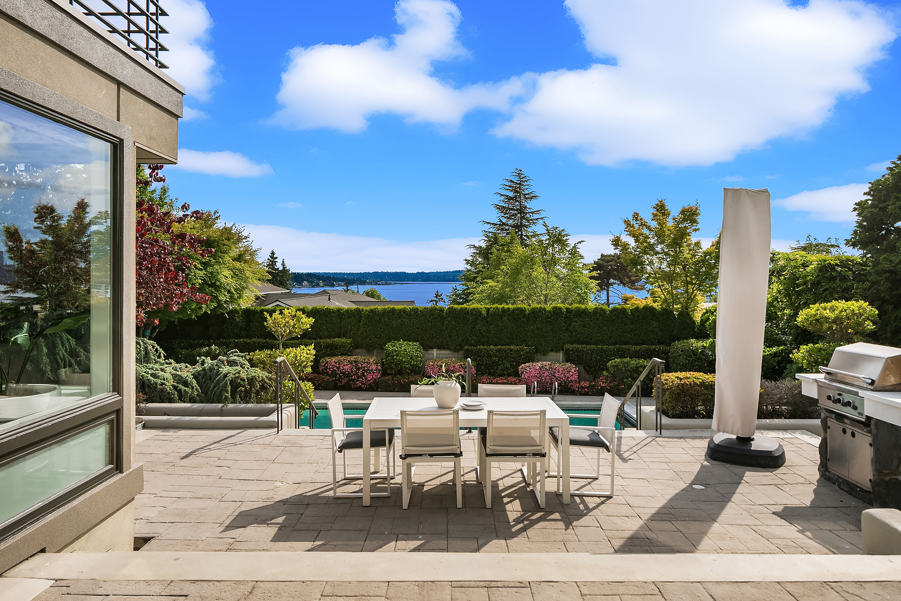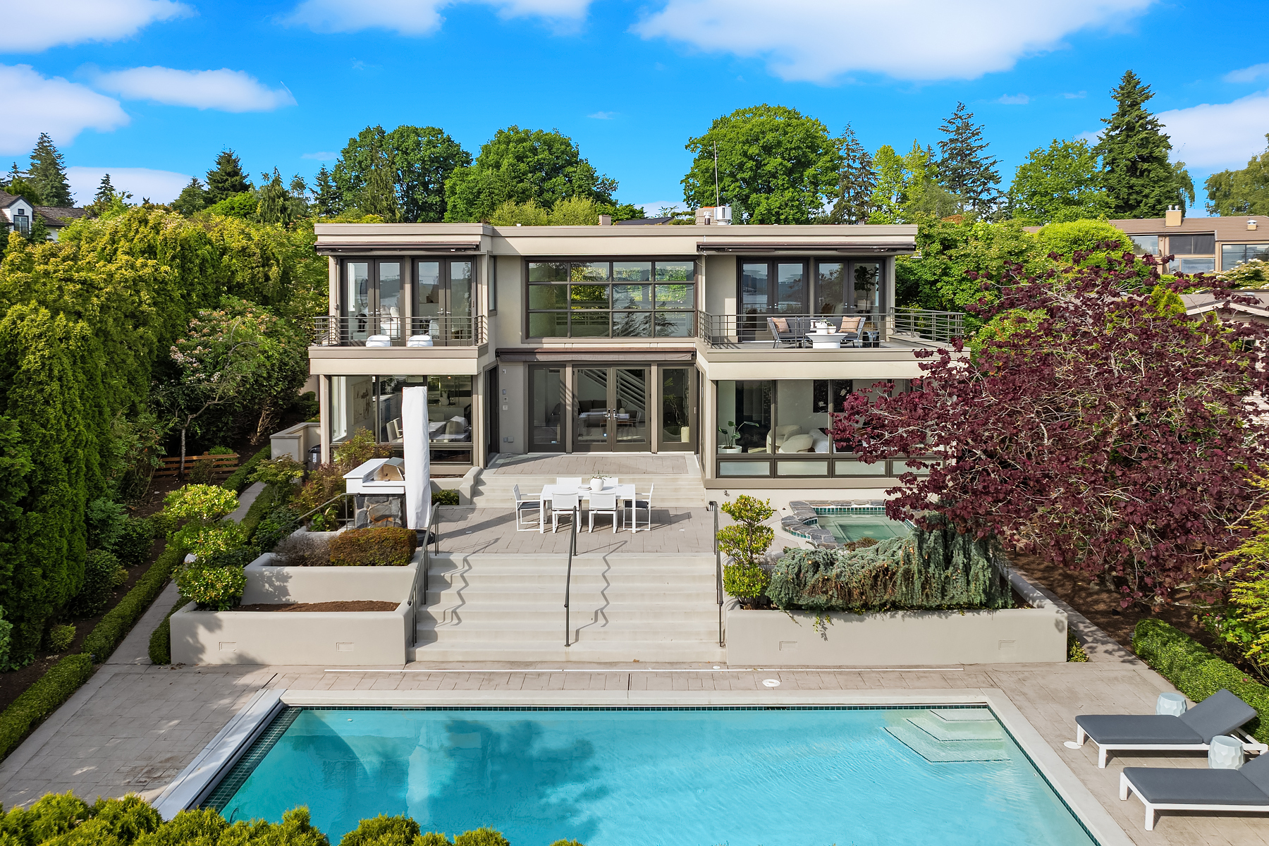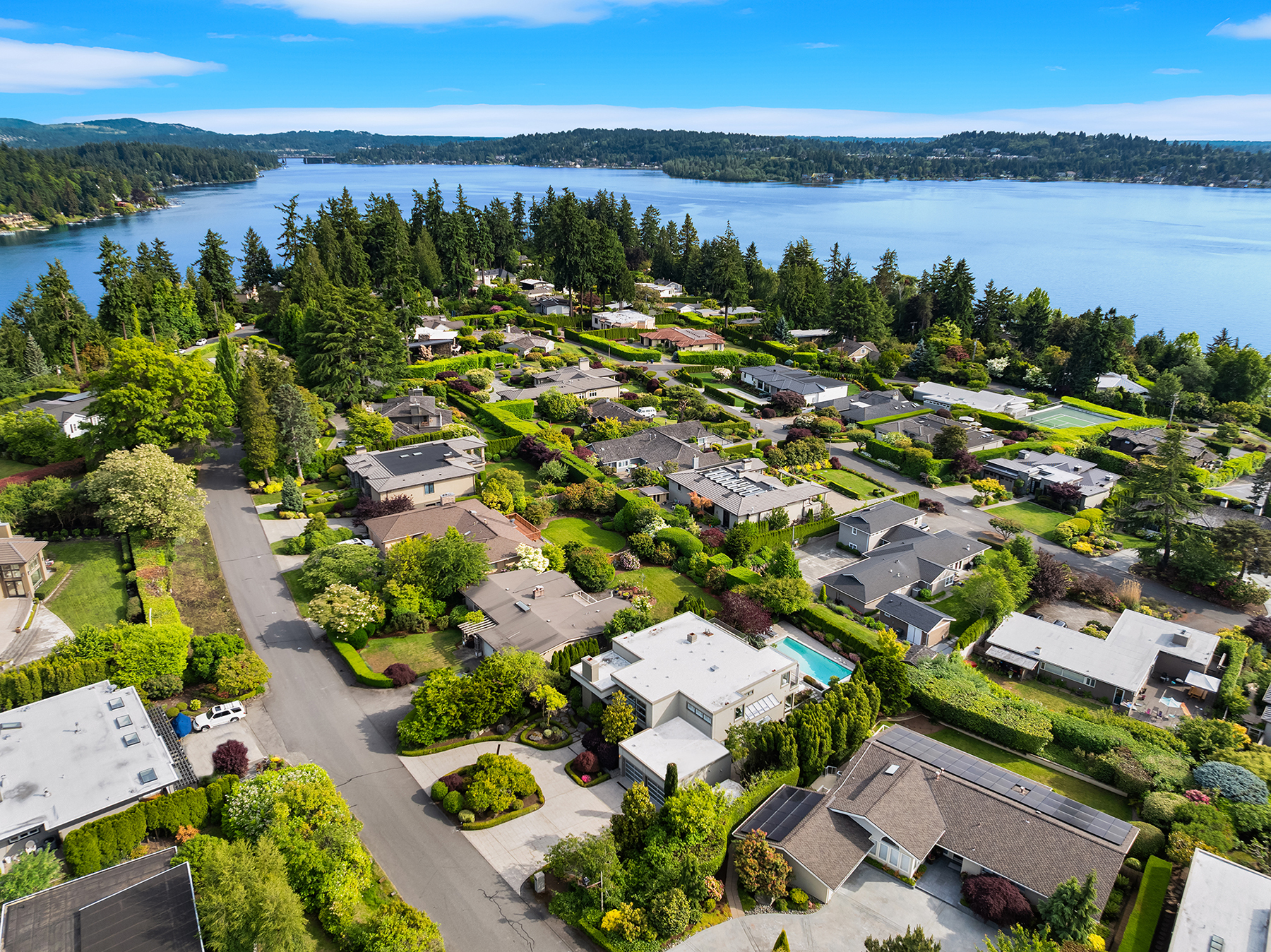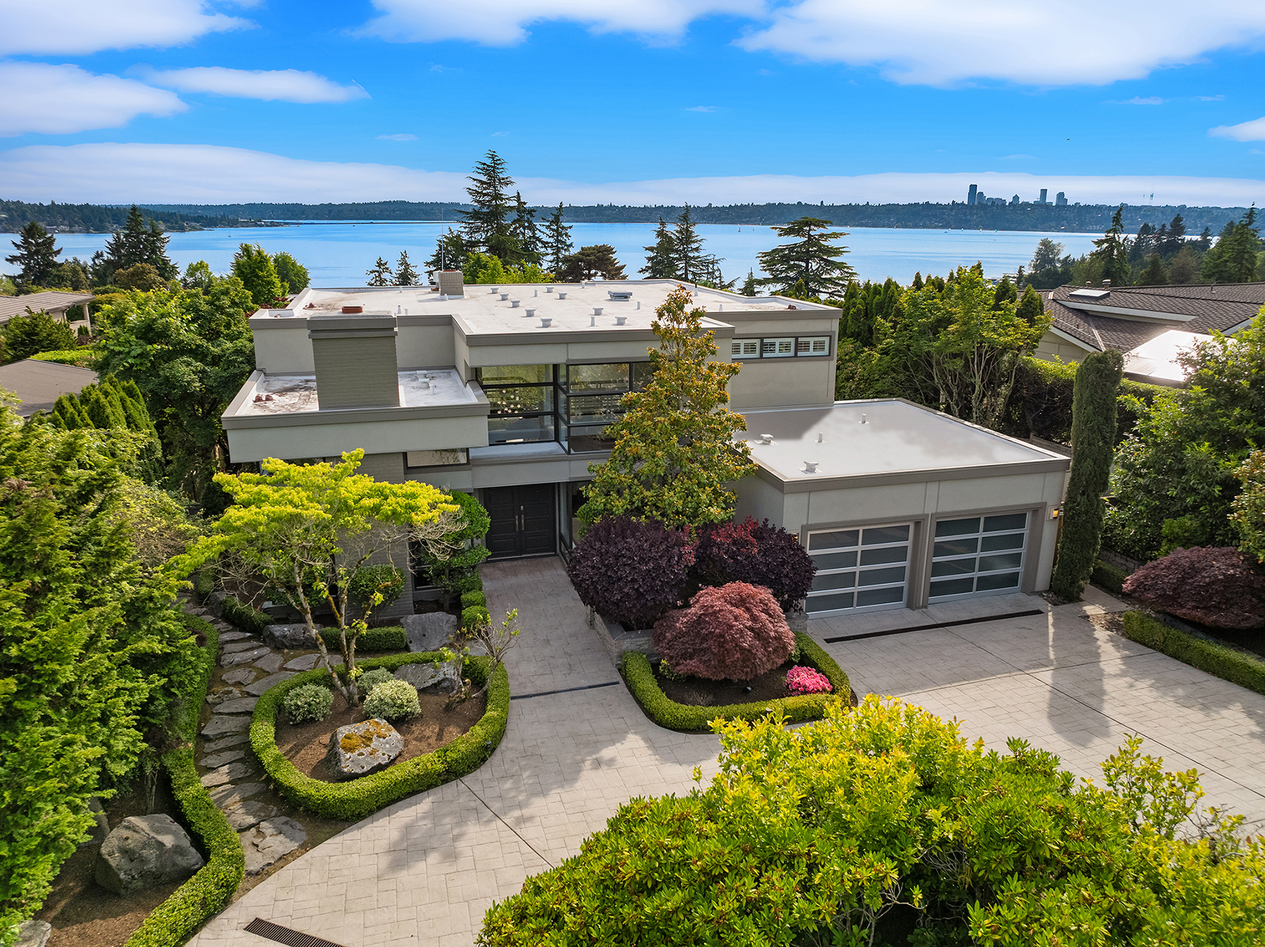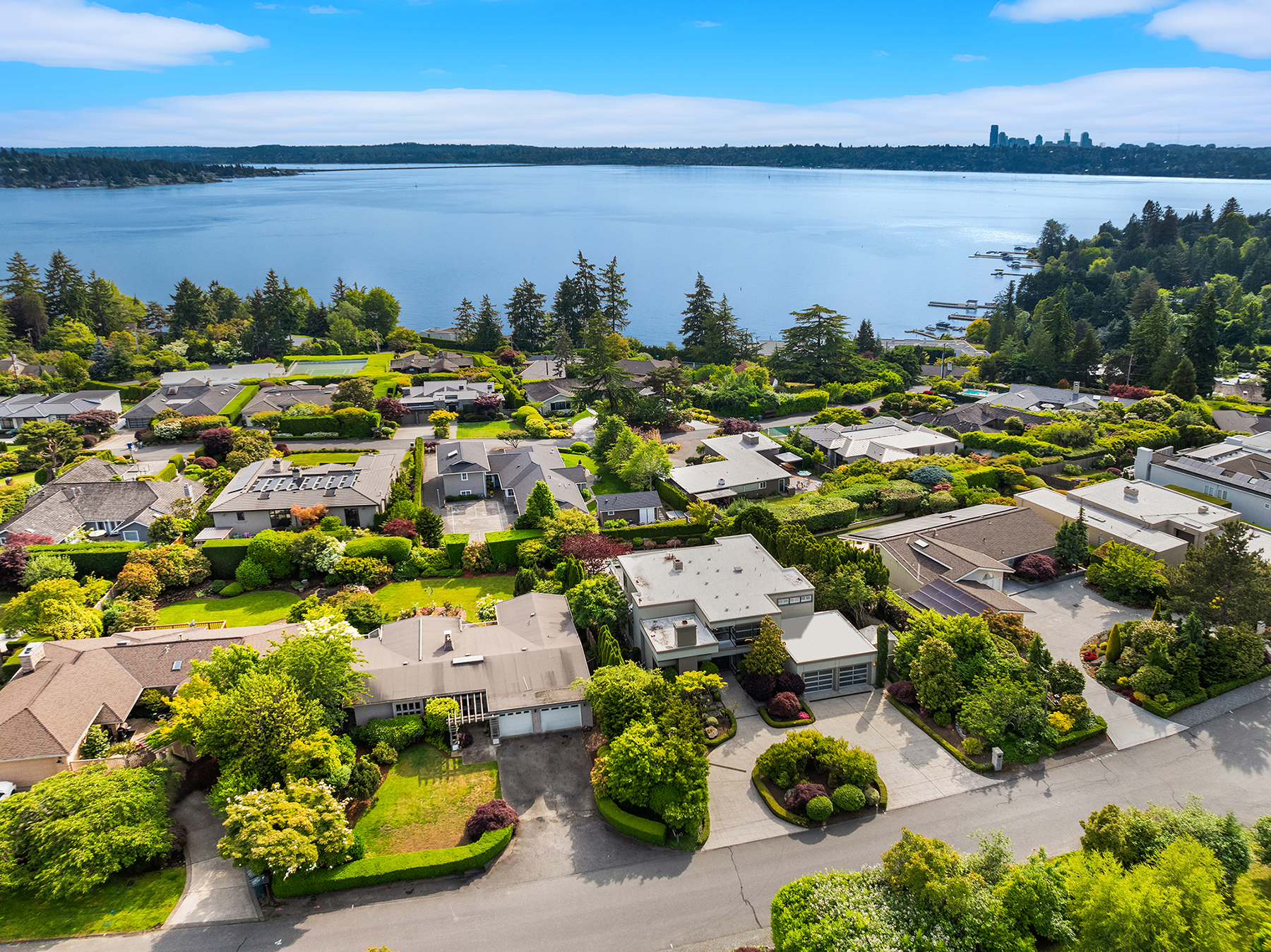 Set in coveted Medina Heights and enveloped in verdant landscaping, this Bender-Chaffey custom residence offers sweeping Westerly views of Lake Washington, Seattle Skyline and Olympic Mountains from both levels. Designed for grand entertaining and everyday elegance, the home features an impressive remodel, soaring ceilings and floor-to-ceiling glass walls that capture the stunning vistas and overlooks the resort-style pool and spa from nearly every room. The well-appointed kitchen boasts a suite of professional-grade appliances perfect for the avid entertainer and epicurean chef. Rare-to-find main floor primary plus grand jr suite on upper floor. Blending style & sophistication, this one-of-a-kind residence is designed to inspire & impress.