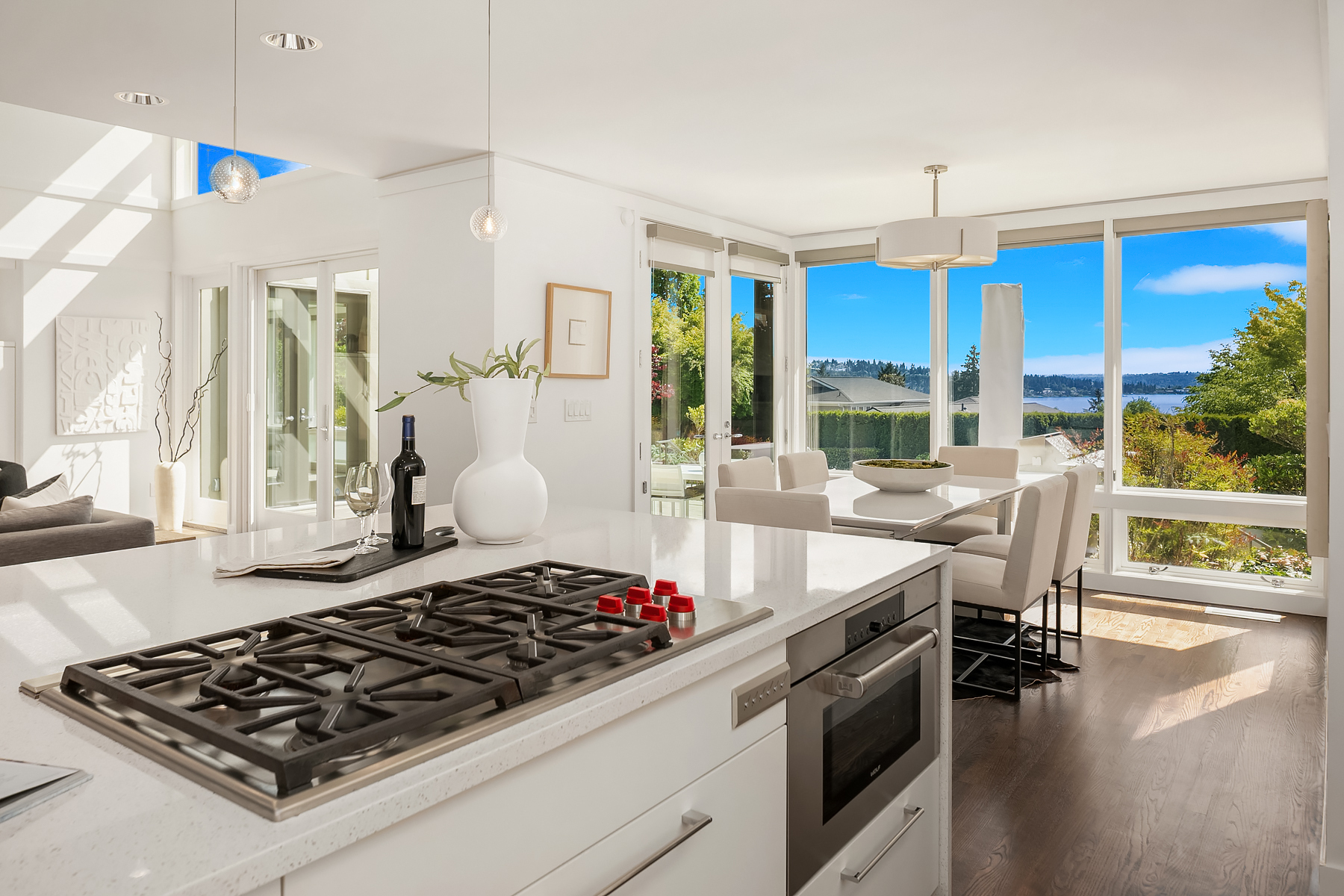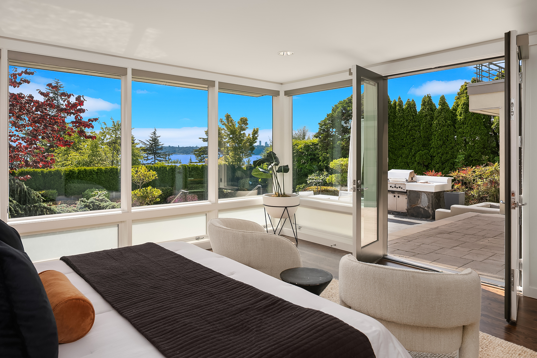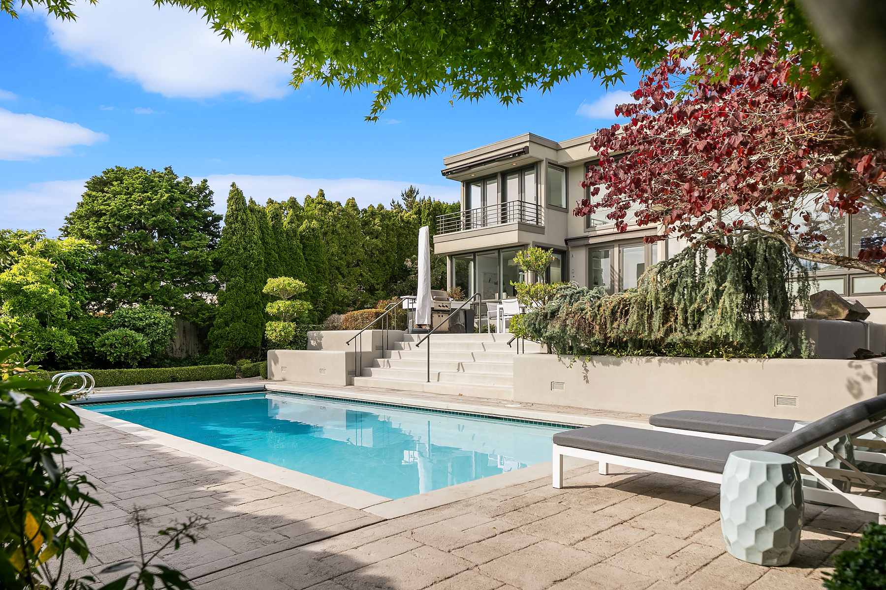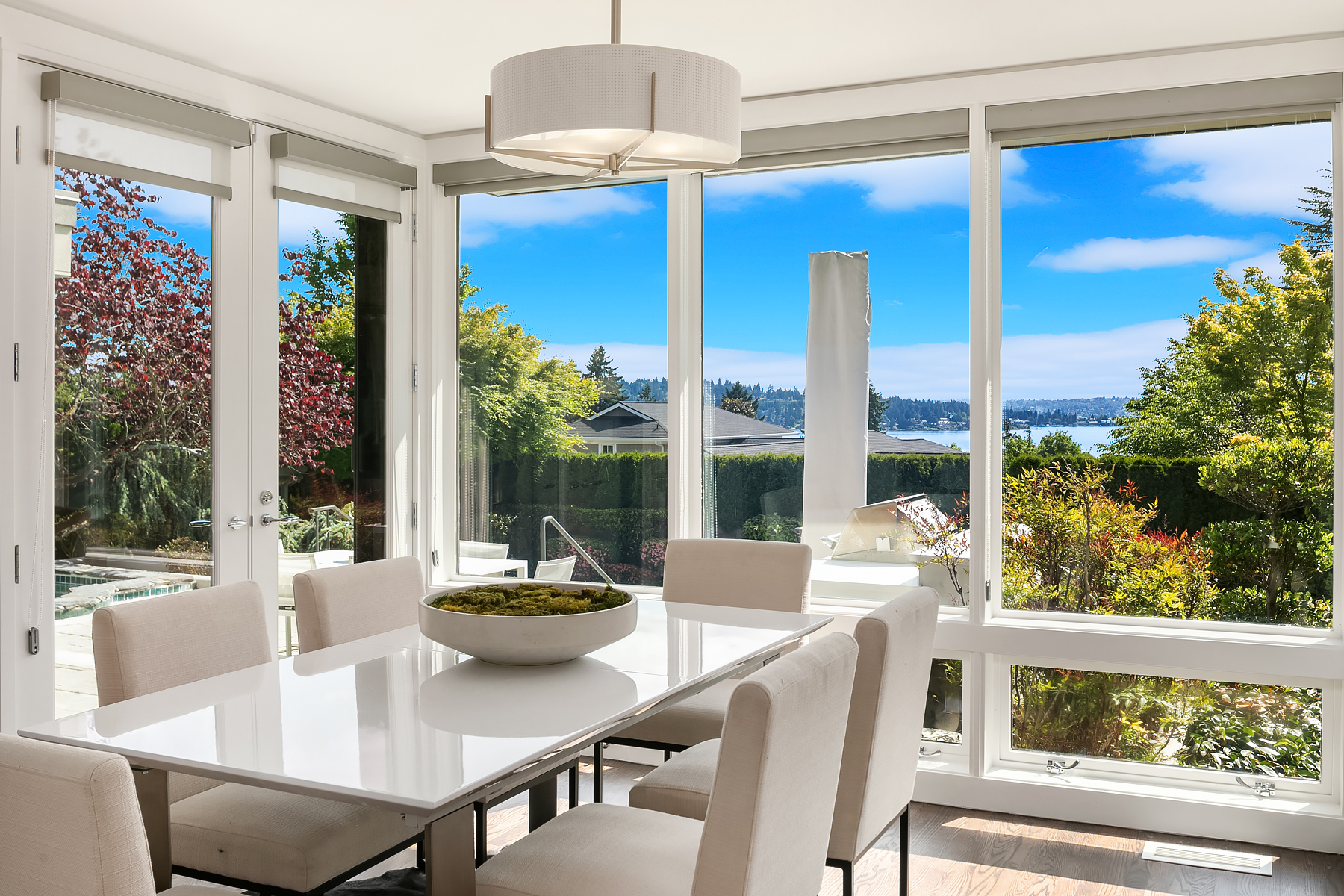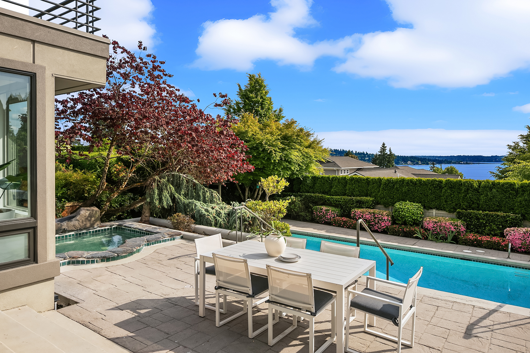 Set in coveted Medina Heights and enveloped in verdant landscaping, this Bender-Chaffey custom residence offers sweeping Westerly views of Lake Washington, Seattle Skyline and Olympic Mountains from both levels. Designed for grand entertaining and everyday elegance, the home features an impressive remodel, soaring ceilings and floor-to-ceiling glass walls that capture the stunning vistas and overlooks the resort-style pool and spa from nearly every room. The well-appointed kitchen boasts a suite of professional-grade appliances perfect for the avid entertainer and epicurean chef. Rare-to-find main floor primary plus grand jr suite on upper floor. Blending style & sophistication, this one-of-a-kind residence is designed to inspire & impress.