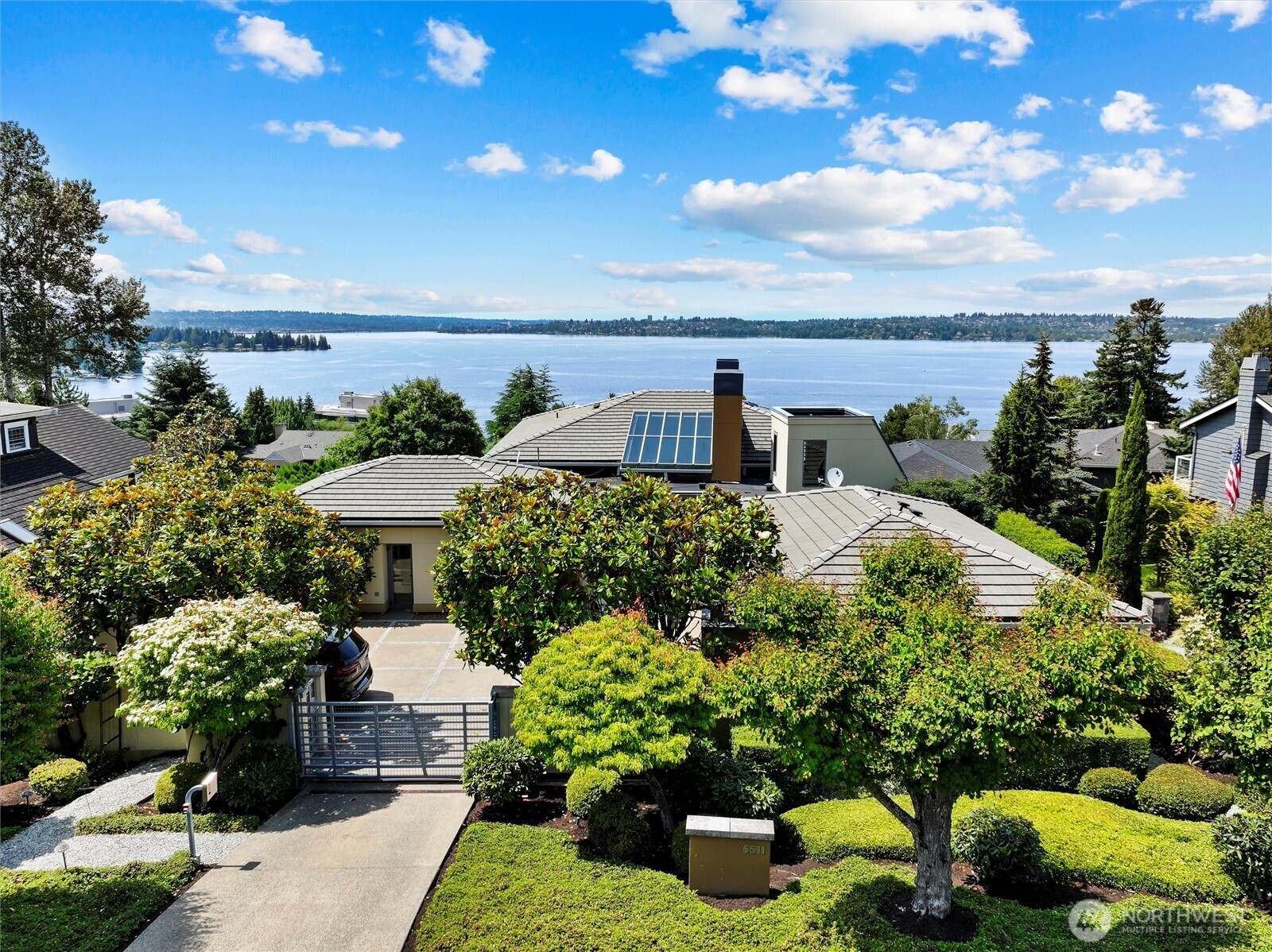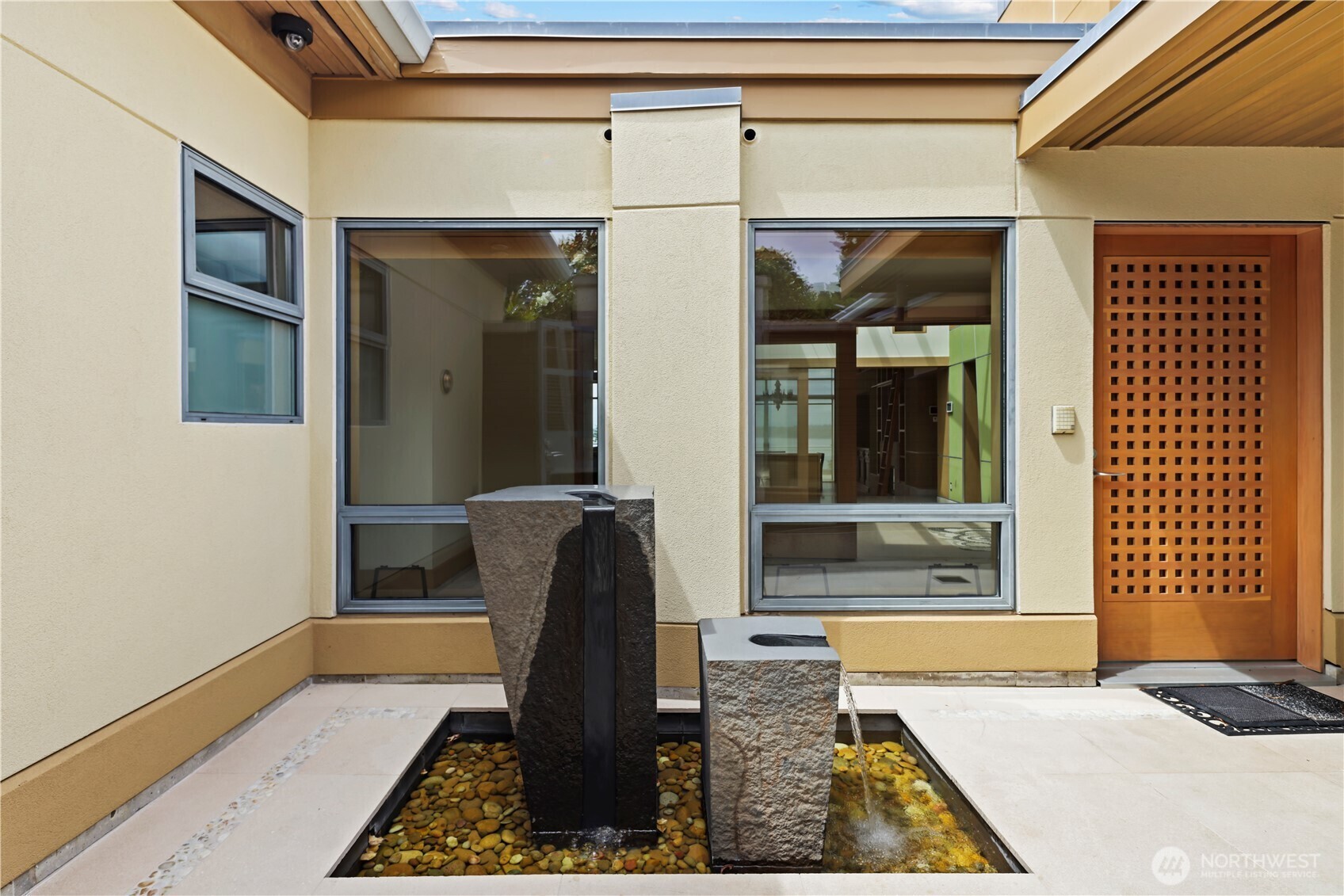 This luxury home boasts a rare bluff setting w/ one of Kirkland’s best views. Designed by Robert Reed, it blends modern PNW architecture w/ Mexican designs inspired by Luis Barragán & Ricardo Legorreta. Built by Bender Chaffey, it features 36” thick angled stucco/metal walls. The 6 BD, 5.5 BA, 5,500 SF home includes an entry w/ a fountain, indoor courtyard w/ fireplace, real stucco, natural stones, & doors like modern Mexican homes. It offers high ceilings, large windows, built-ins, multiple courtyards, a living room w/ fireplace, formal dining, nook, exquisite kitchen w/ views, deck, primary bedroom w/ spa-like bath, 2 offices, rec room w/ kitchenette opening to patio, study/library, craft room, beautiful gardens, & a 3-car garage.