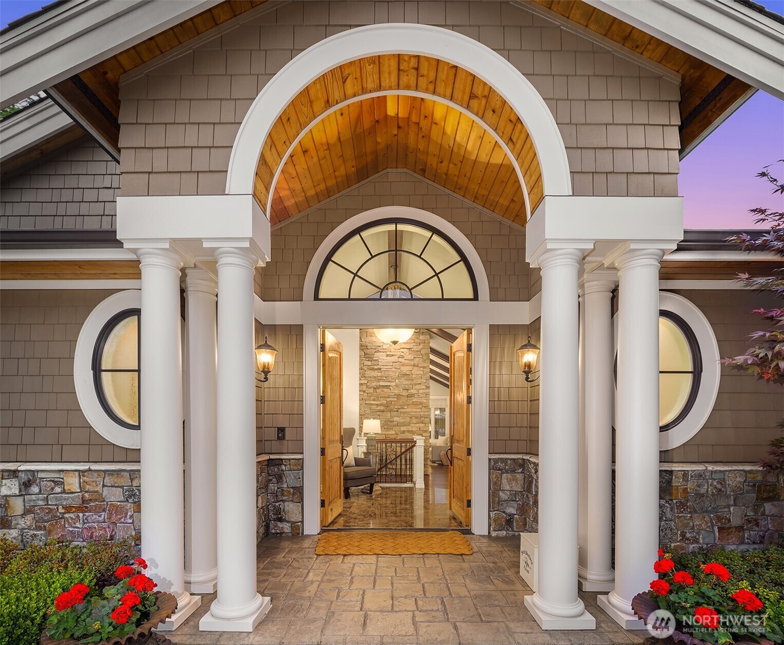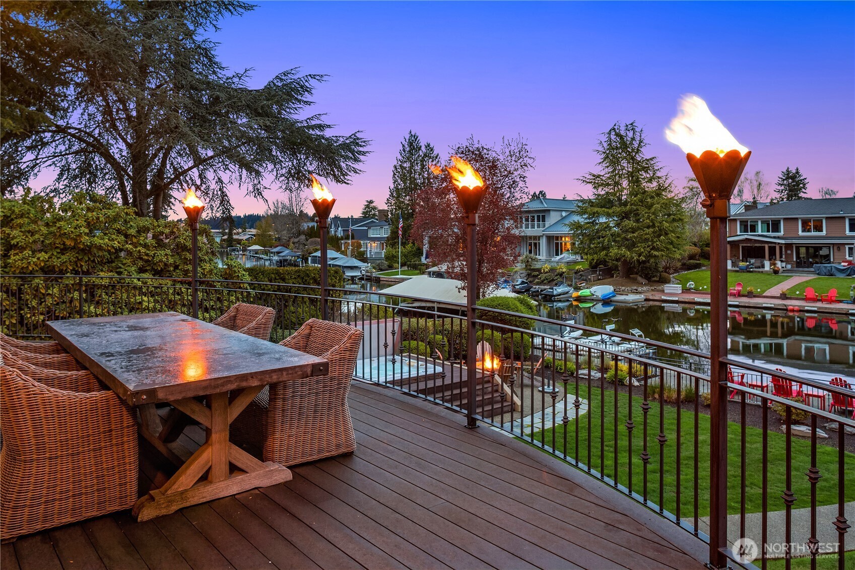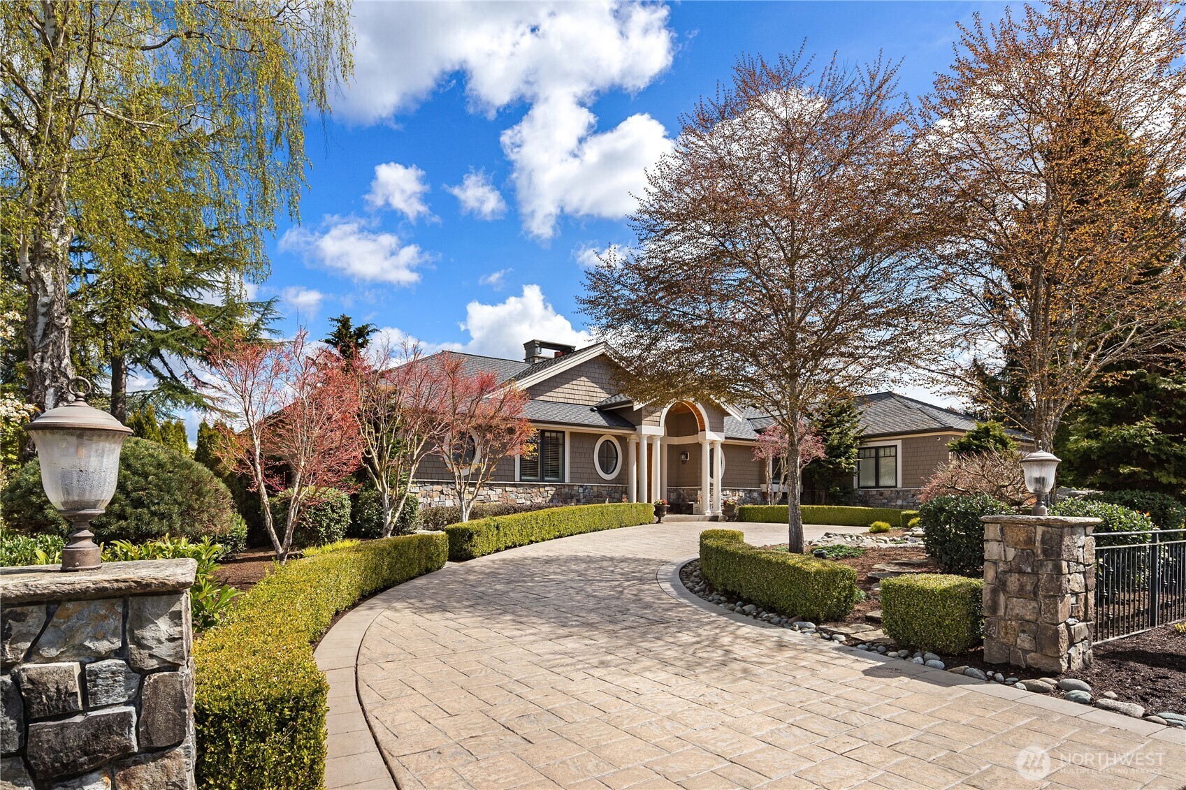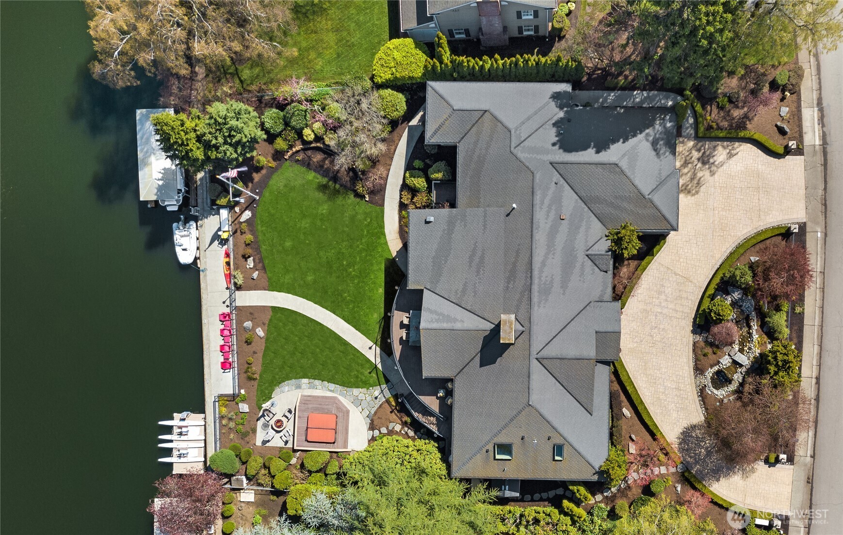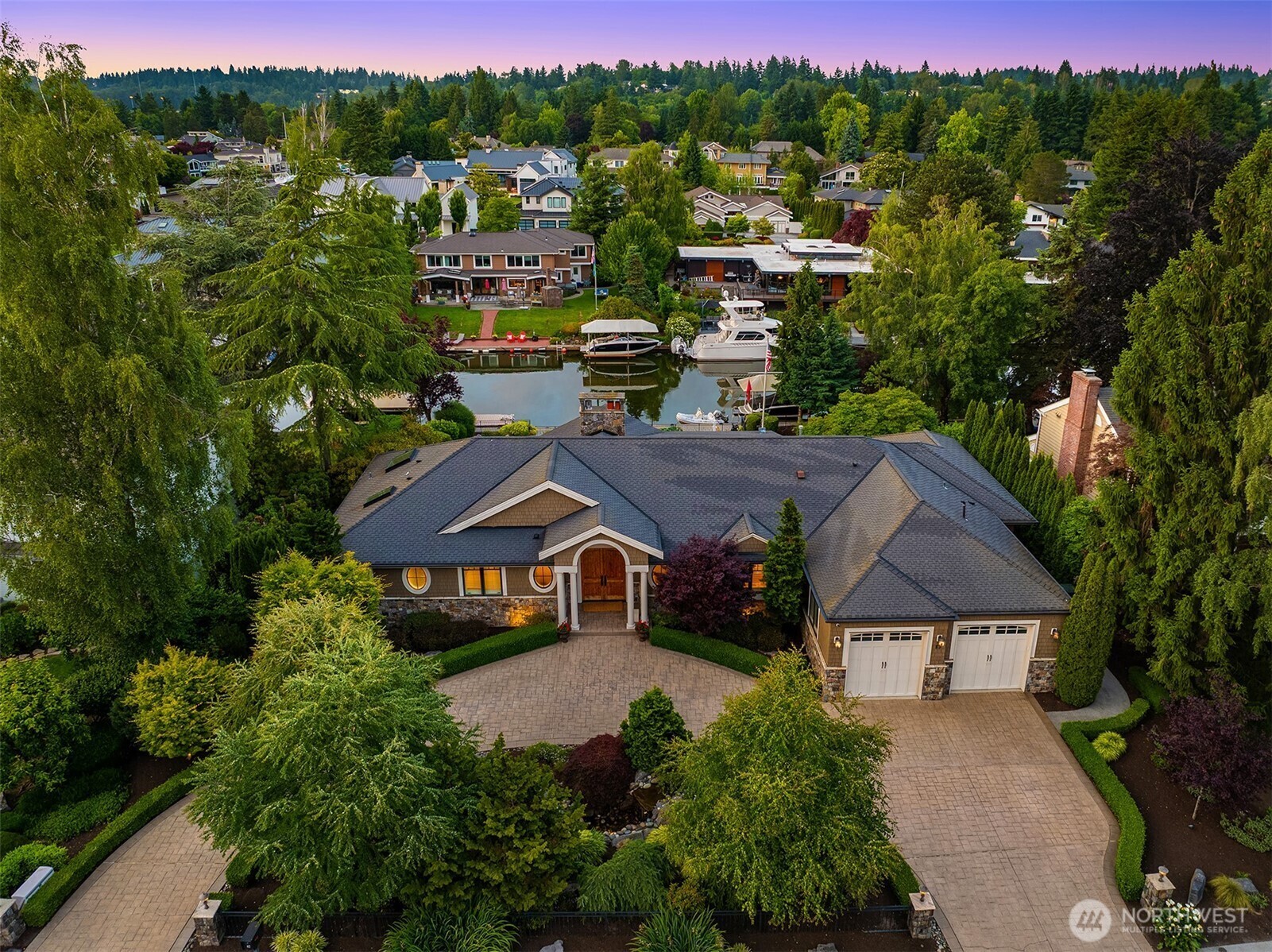 Luxury waterfront living in Newport Shores. Iconic property offering 105 feet of waterfront. This exquisite home blends timeless architecture and stonework with refined updates. Thoughtfully designed for effortless indoor-outdoor living, main level opens to an expansive deck, a lush, level lawn, and coveted canal frontage-sheltered moorage and dock access for boating and water toys. Inside, enjoy a gourmet kitchen, great room, & serene main-floor primary suite with spa-like bath and HUGE walk-in closet. Three additional bedrooms, rec room, home office and vaulted living room (or formal dining). A waterfront sanctuary in popular Bellevue neighborhood w/community engagement. Card & wine room, generator & 2 Walk-in storage rooms.