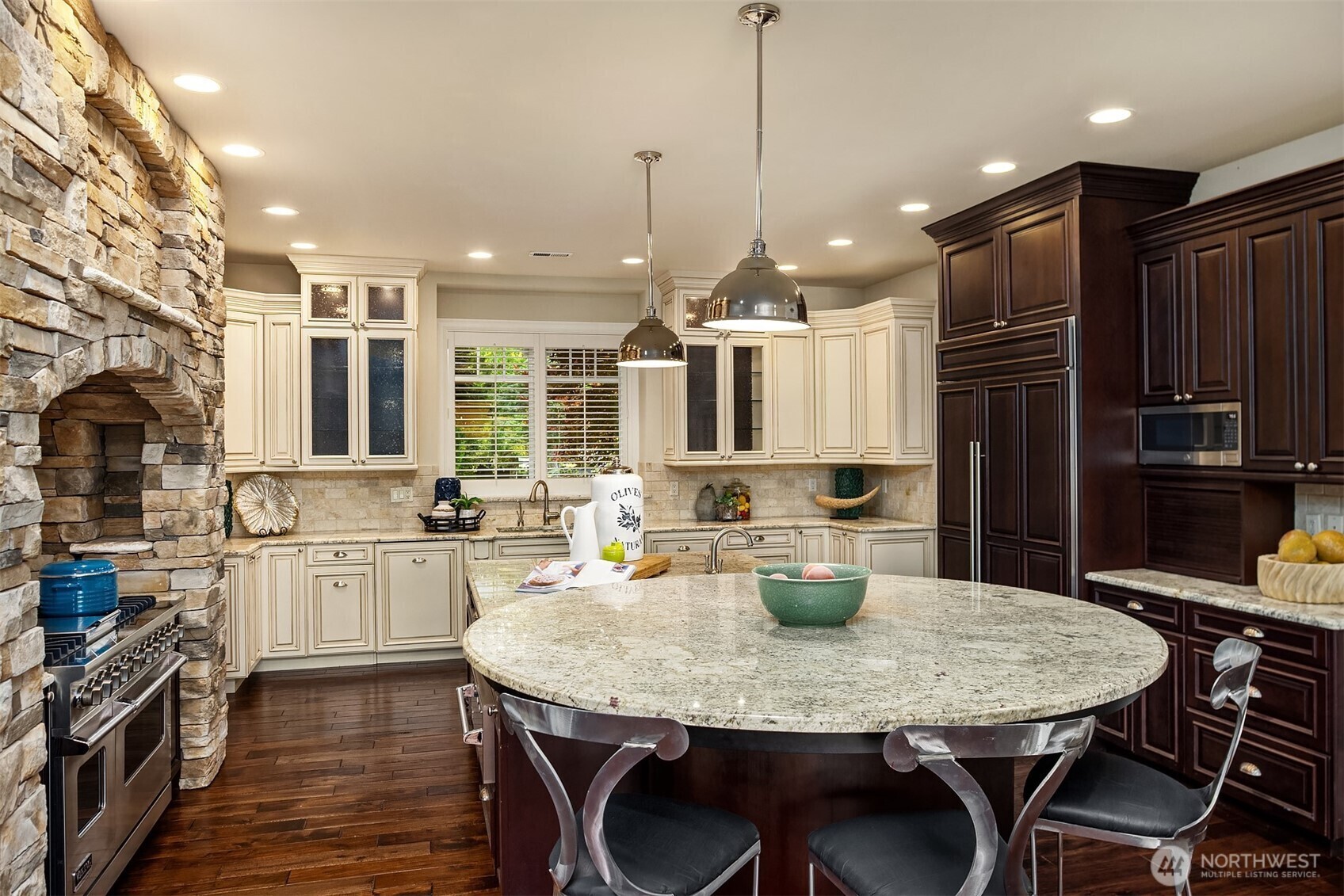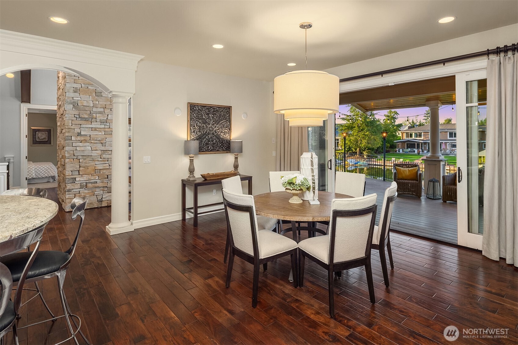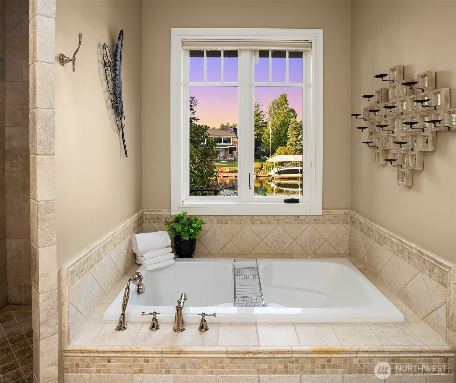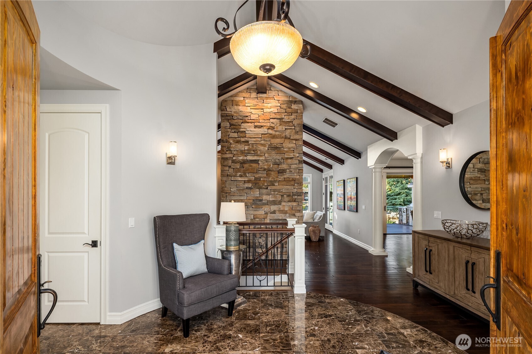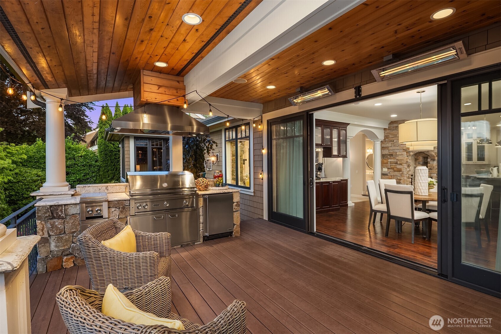 Luxury waterfront living in Newport Shores. Iconic property offering 105 feet of waterfront. This exquisite home blends timeless architecture and stonework with refined updates. Thoughtfully designed for effortless indoor-outdoor living, main level opens to an expansive deck, a lush, level lawn, and coveted canal frontage-sheltered moorage and dock access for boating and water toys. Inside, enjoy a gourmet kitchen, great room, & serene main-floor primary suite with spa-like bath and HUGE walk-in closet. Three additional bedrooms, rec room, home office and vaulted living room (or formal dining). A waterfront sanctuary in popular Bellevue neighborhood w/community engagement. Card & wine room, generator & 2 Walk-in storage rooms.