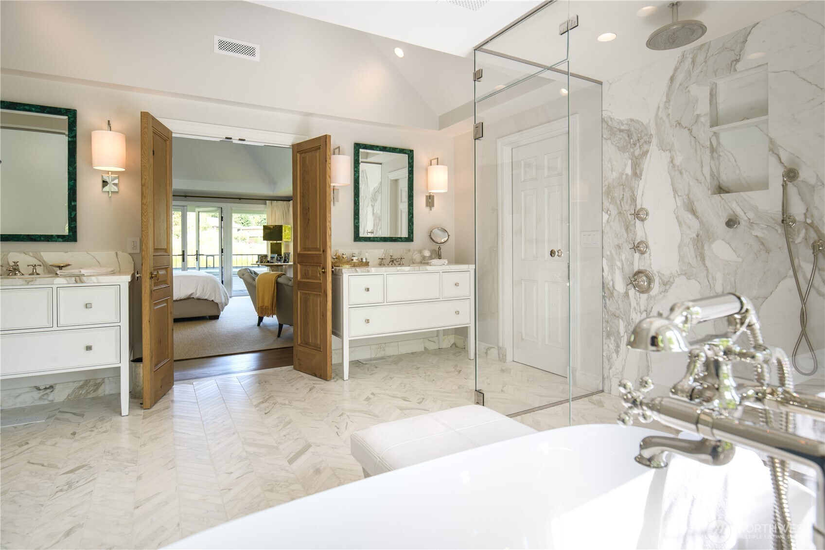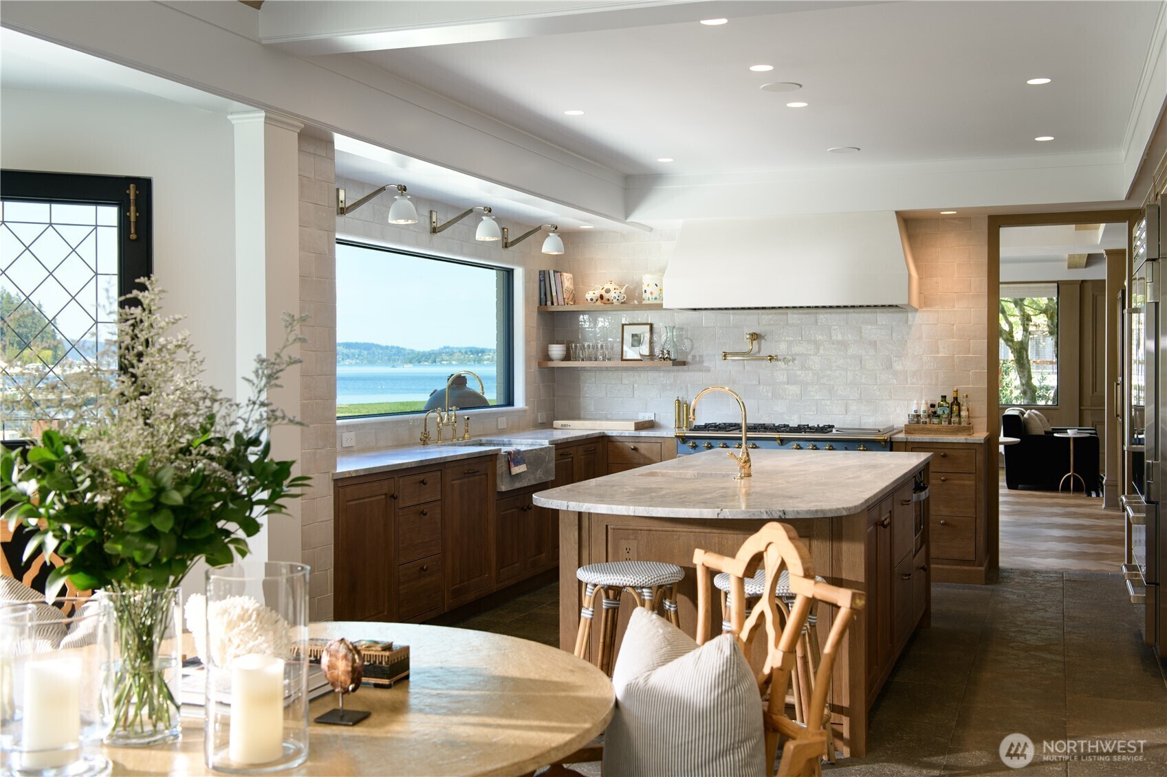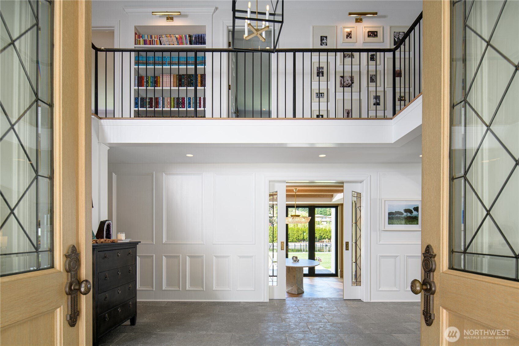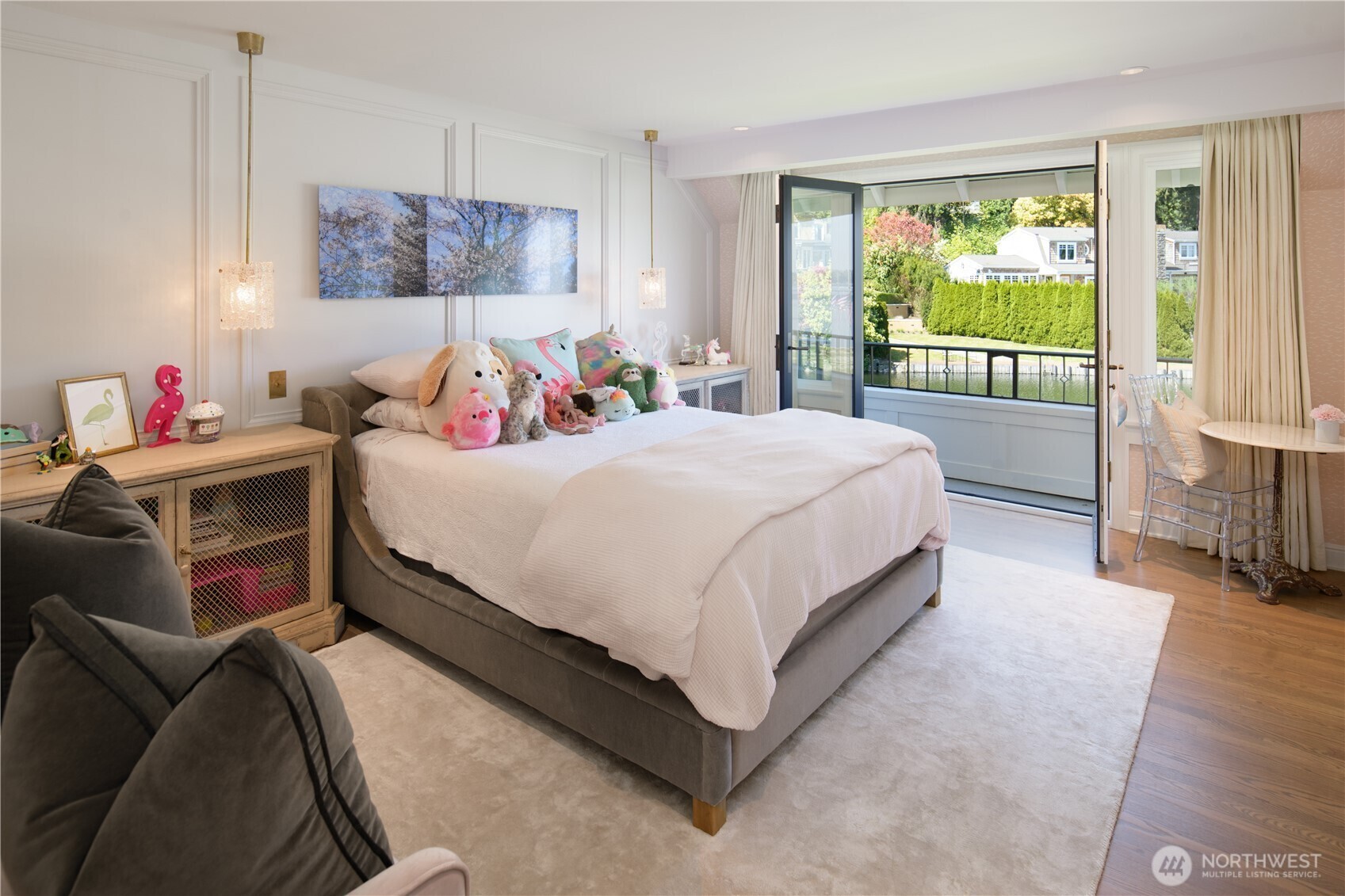 Reimagined English Tudor nestled on the west-facing shores of Lake Washington.Double doors open to two story entry with bespoke iron railings & gorgeous stone floors mined in Ireland.Formal living & dining rooms with oversized French doors to bluestone patio, huge lawn, fire pits & calming water views.Study with cashmere walls, lacquered trims and bookcases.Kitchen/Great room with fireplace, stunning marble & Ann Sacks terra cotta tile finishes and blue Lacanche range.Primary room w/antique fireplace & Calacatta marble bathroom. Hand-cut herringbone white oak floors. 123 ft of waterfront-new bulkhead/dock/platform lift for the boating enthusiast.5 Beds, 5.5 Baths.Gym.Park-like setting with gated drive. Do not miss the pickleball court!
