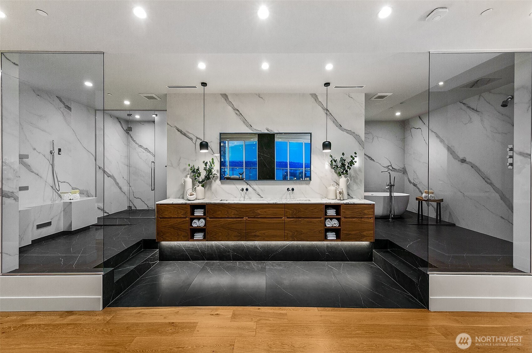 Welcome to the ultimate in luxury living – the Escala Penthouse. This newly redesigned 4,522 sq ft southwest corner masterpiece offers expansive, unobstructed views of the iconic Seattle skyline, Elliott Bay, and the majestic Olympic Mountains. With 4 parking spaces, 2 private vestibules ensures ultimate privacy and security- your own elevator opens directly into this elegant sanctuary. 2 storage units, 3 Bedrooms, 3.5 bath, laundry room, library, 2 terraces, 500 sqft & 220 sqft - bbq, fire tables allowed -this is truly a one-of-a-kind residence. Exclusive State-of-the-Art Kitchen,Expansive Living Areas,Fully Automated Lutron Lighting & Shading: Enjoy a perfect ambiance with the touch of a button. Every detail has been carefully curated.