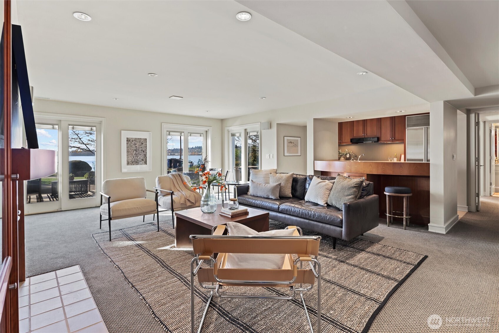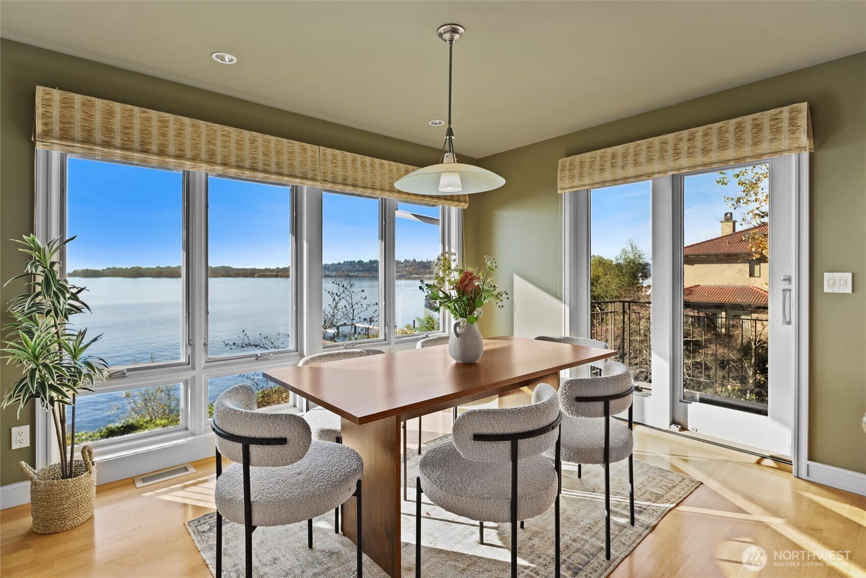 Iconic Paul Hayden Kirk–designed Lake Washington estate incls 2 southwest-facing waterfront parcels totaling .728 acre w/161 feet of no-bank shoreline on Kirkland’s coveted Juanita Point. At the end of a private gated lane, this 5,030 SF, 5BR, 4.5BA NW Modern - originally built in 1964 & renovated in 1998 w/cathedral ceilings, transom windows & walls of glass - showcases sweeping vistas of the lake, Mt. Rainier, city skylines, stunning sunsets & maritime activity–an everchanging work of art! Light-filled interiors open to expansive decks, patios, resort-style grounds w/large in-ground pool, mature landscaping, greenhouse & 122’ dock. A rare, private legacy property offering exceptional scale, flexibility, & timeless architectural pedigree.