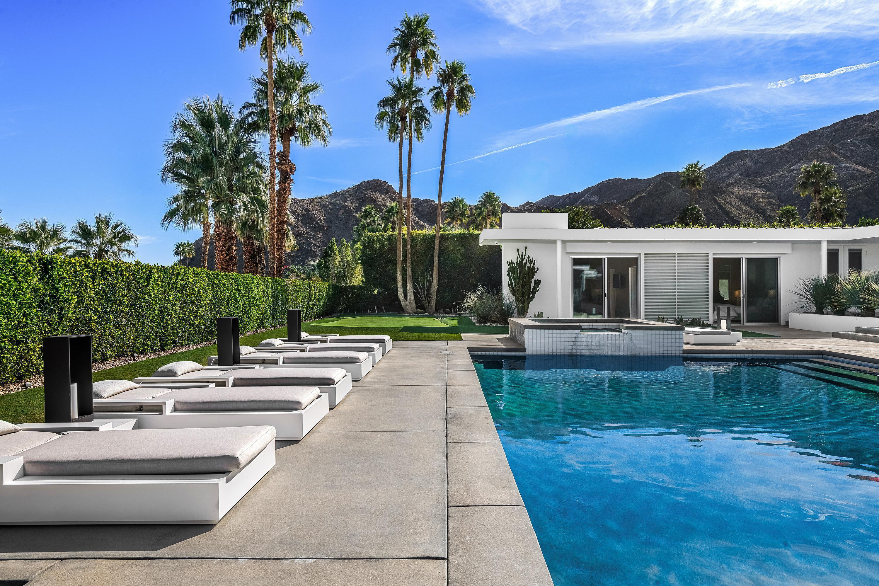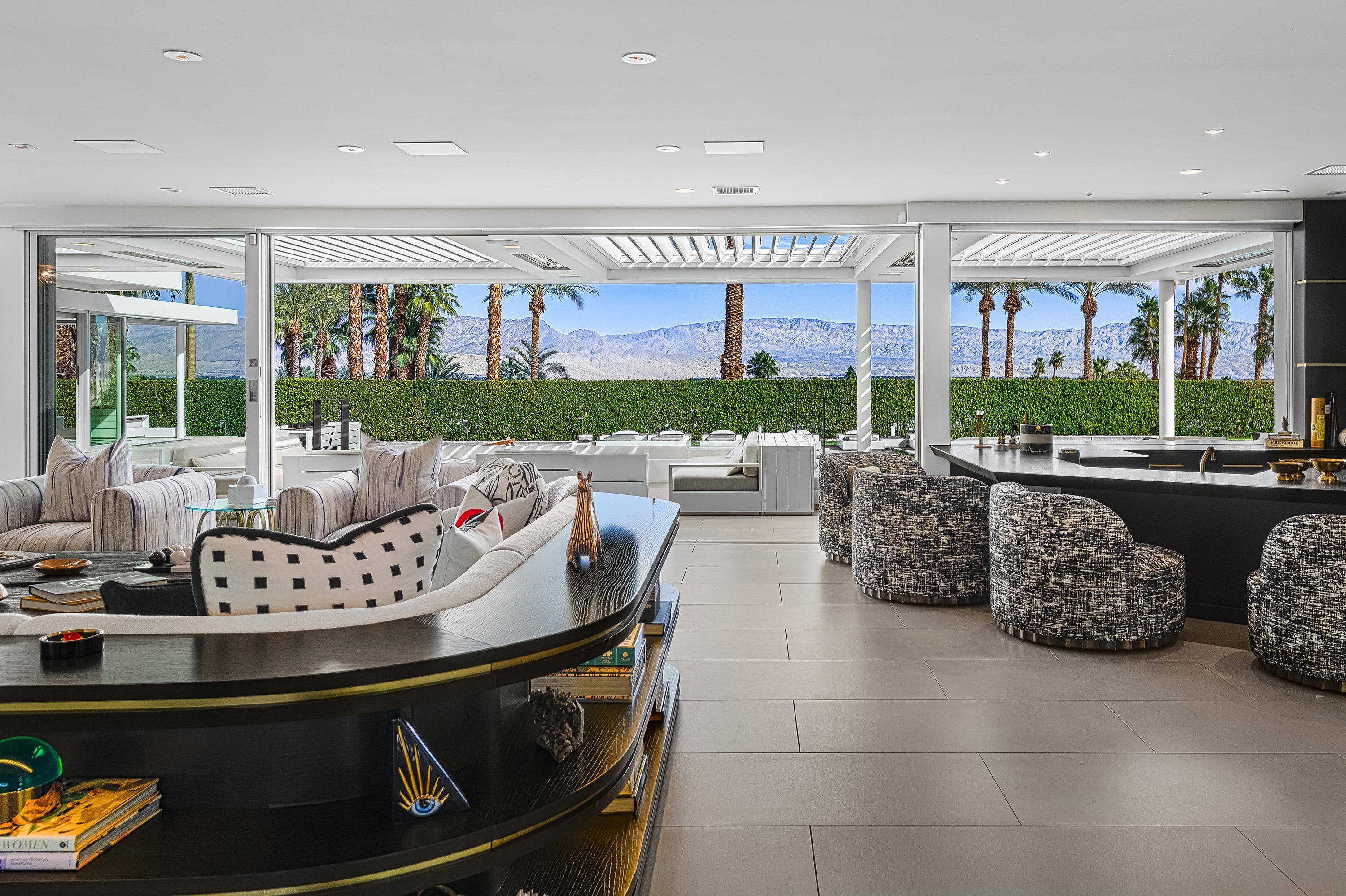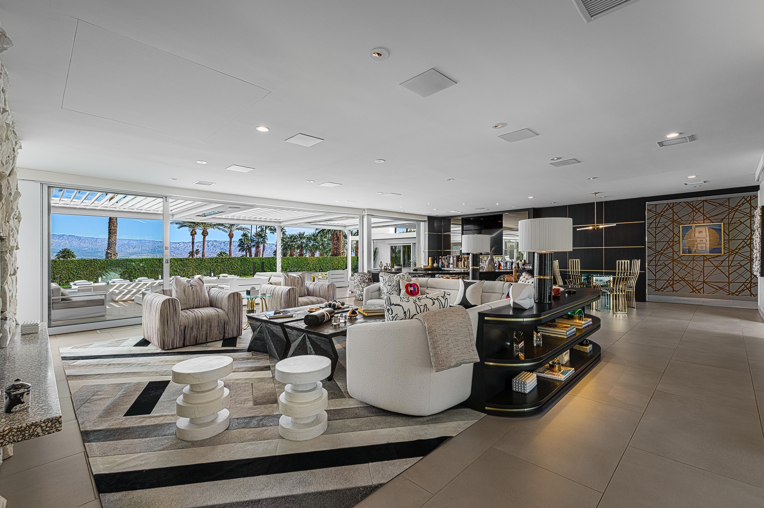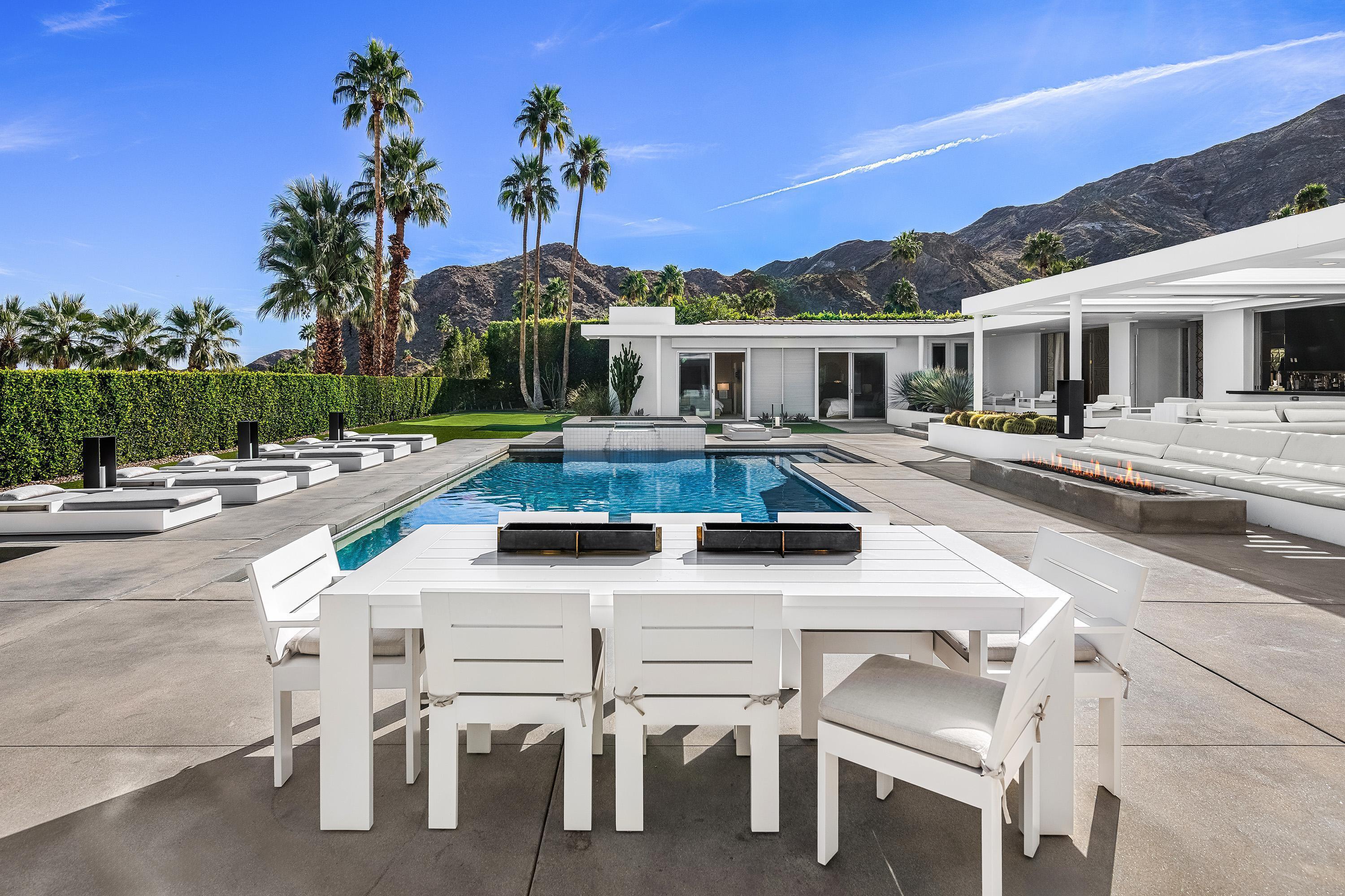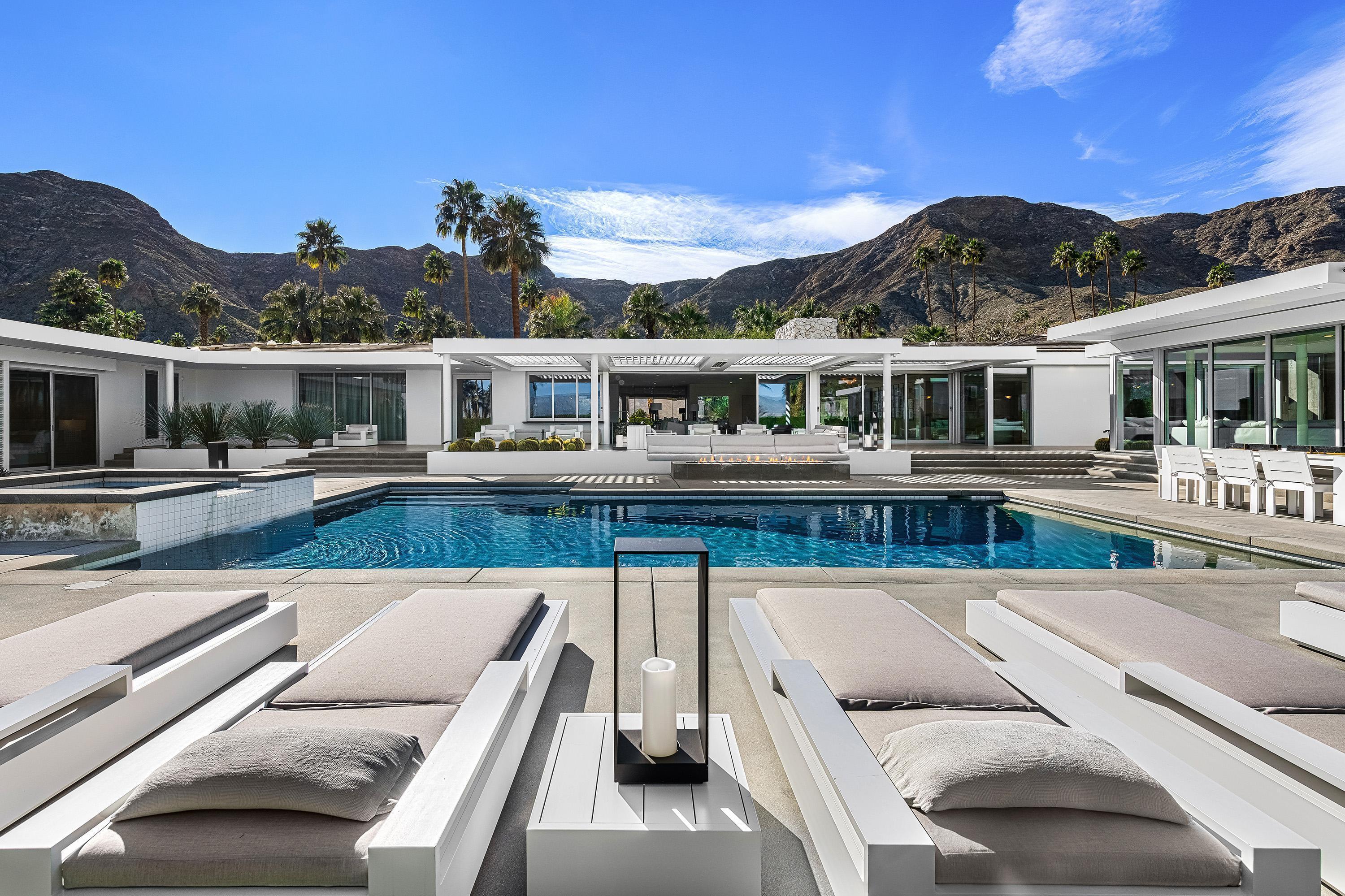 Perched high atop the exclusive Thunderbird Heights enclave, this extraordinary 6-bedroom, 7-bath residence offers 6,148 square feet of luxury living with a seamless blend of California ranch charm and mid-century modern sophistication. From the front, the home showcases its California ranch-style façade, while the rear opens into a private modern oasis—perfectly designed for indoor-outdoor living and entertaining. The home is fully renovated, every detail showcases the finest finishes, state-of-the-art appliances, smart home technology, and curated design. The expansive floor plan features multiple living and dining areas, a chef's kitchen, and generously sized bedrooms, each with an en-suite bath. Fleetwood doors and windows are integrated throughout—many retract fully to disappear into the architecture—blurring the line between indoors and outdoors, framing sweeping views, and flooding the home with natural light. The main living space is ideal for entertainers and sports enthusiasts. Four tastefully integrated televisions create the ultimate setting for game-day gatherings, movie nights, or multi-event viewing—all without compromising the home's elegant design. The property offers multiple outdoor spaces for relaxation and entertaining, including a well-appointed grilling and cooking area discreetly tucked away for seamless hosting. Whether enjoying al fresco dining or quiet moments poolside, the home's outdoor amenities elevate every occasion. Set within the historic Thunderbird Heights community, this property offers golf cart access to the legendary Thunderbird Country Club, while its elevated position provides privacy and panoramic vistas. This is desert luxury at its finest.
