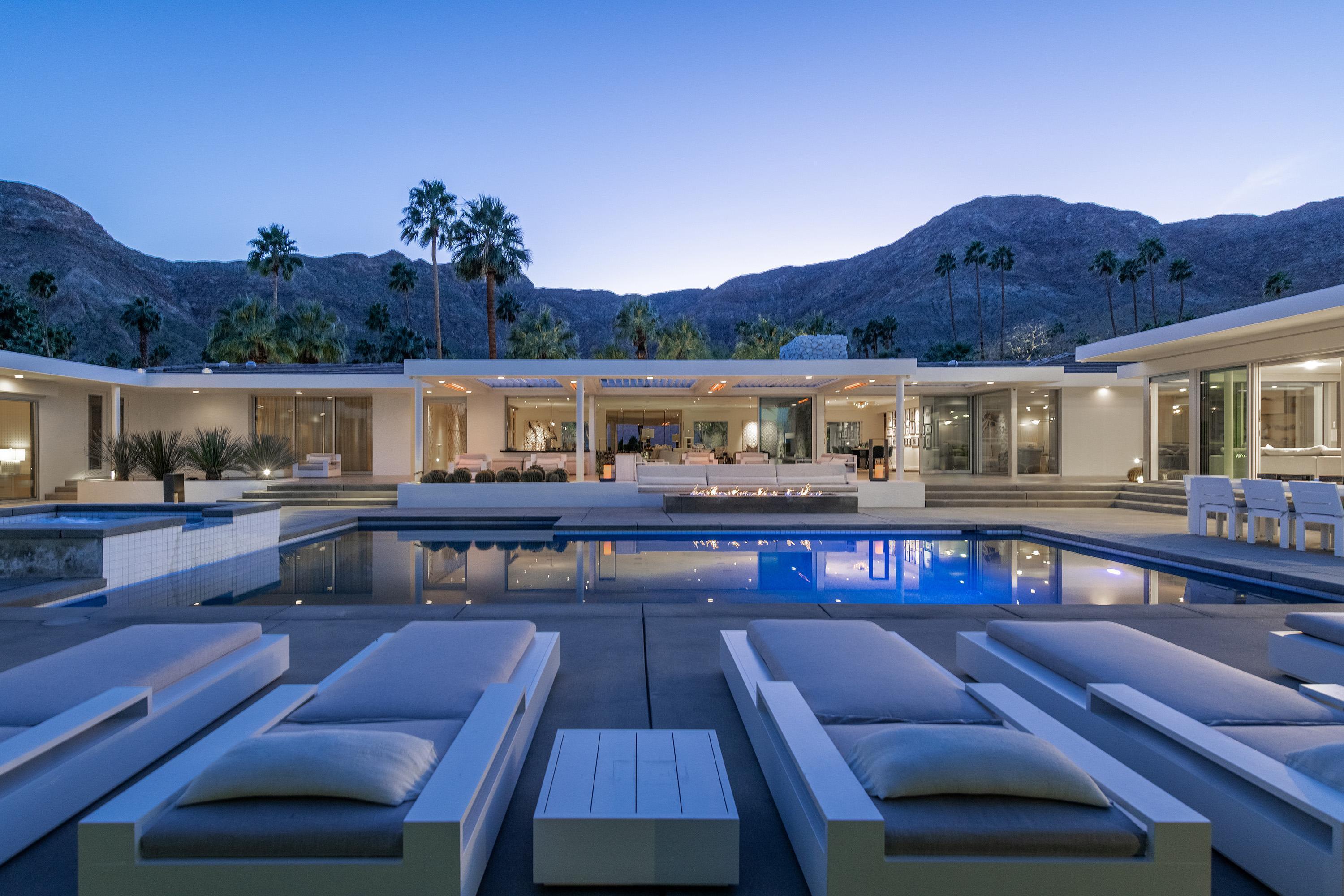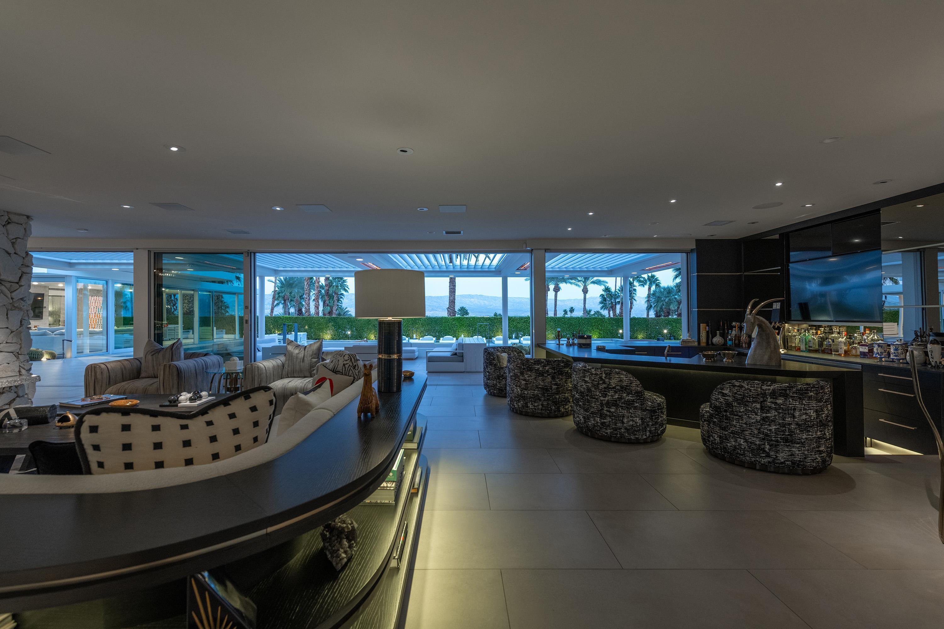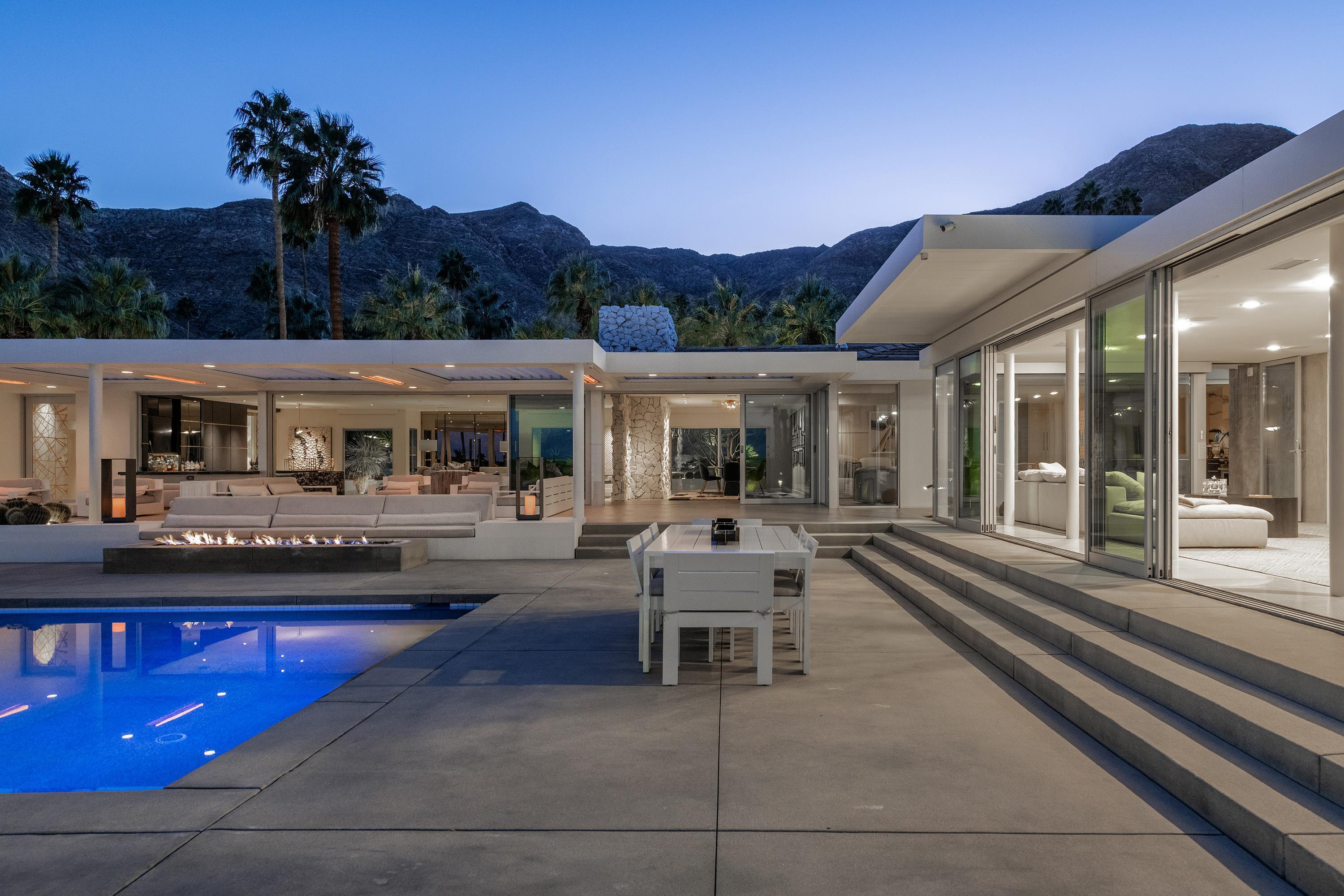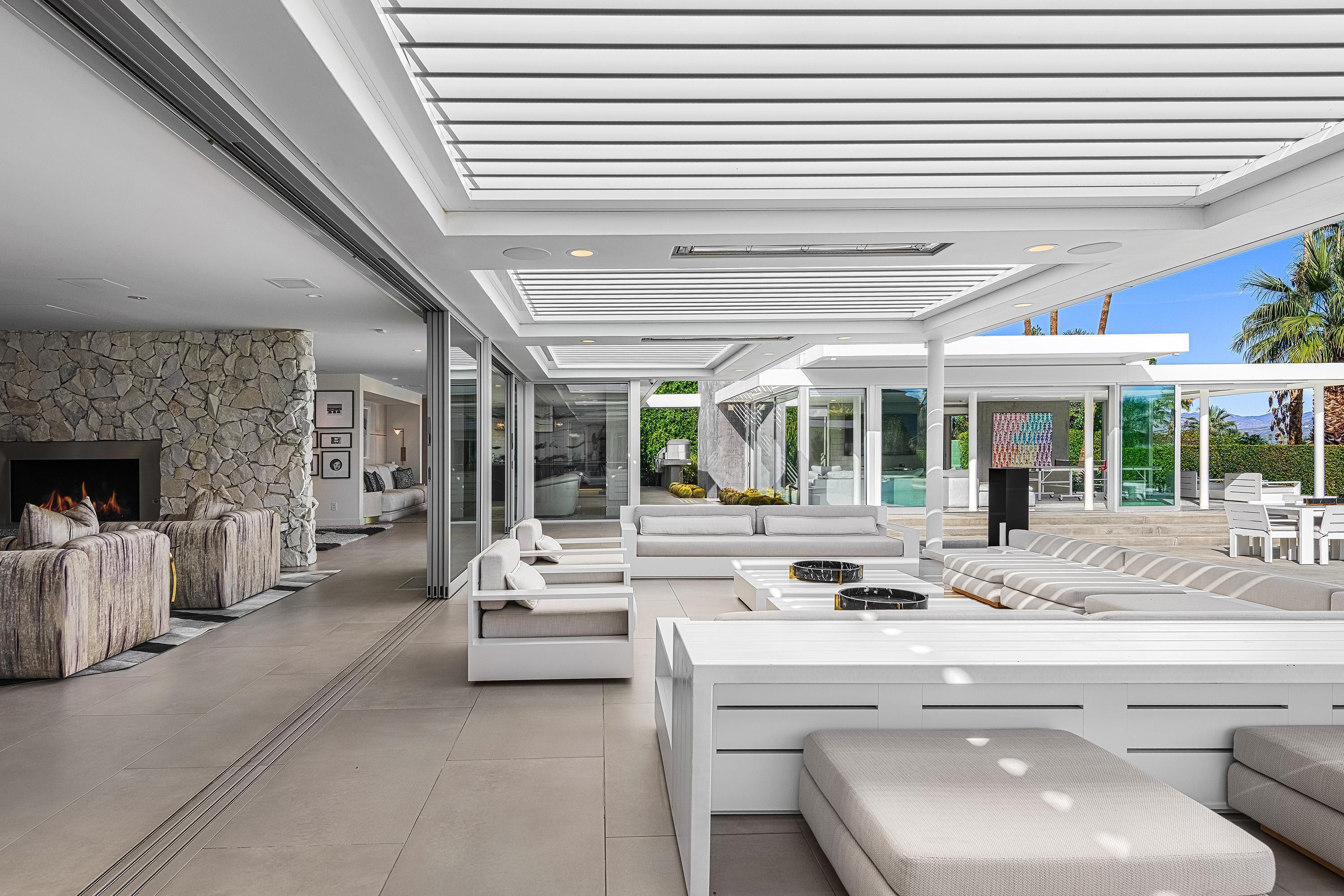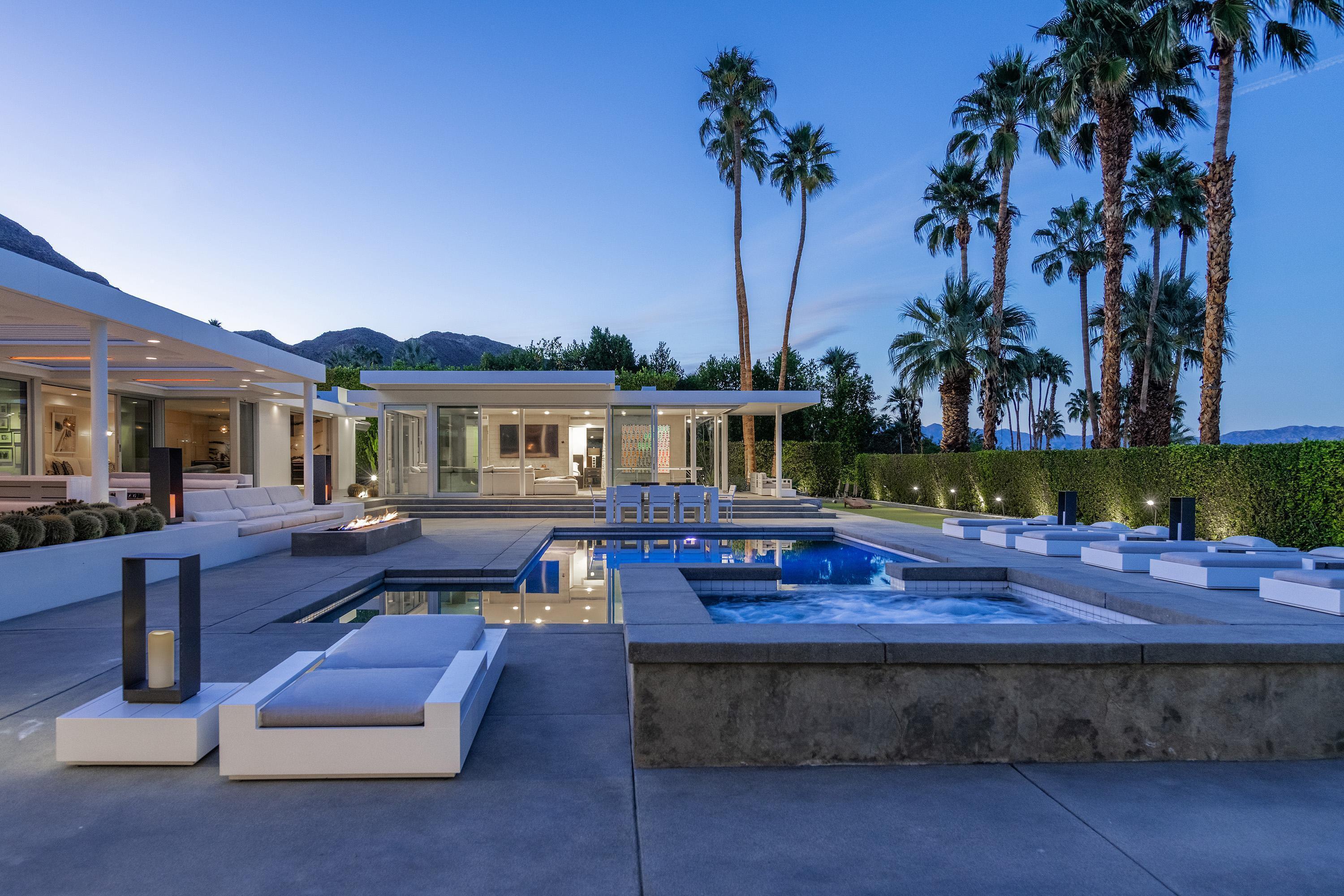 Perched high atop the exclusive Thunderbird Heights enclave, this extraordinary 6-bedroom, 7-bath residence offers 6,148 square feet of luxury living with a seamless blend of California ranch charm and mid-century modern sophistication. From the front, the home showcases its California ranch-style façade, while the rear opens into a private modern oasis—perfectly designed for indoor-outdoor living and entertaining. The home is fully renovated, every detail showcases the finest finishes, state-of-the-art appliances, smart home technology, and curated design. The expansive floor plan features multiple living and dining areas, a chef's kitchen, and generously sized bedrooms, each with an en-suite bath. Fleetwood doors and windows are integrated throughout—many retract fully to disappear into the architecture—blurring the line between indoors and outdoors, framing sweeping views, and flooding the home with natural light. The main living space is ideal for entertainers and sports enthusiasts. Four tastefully integrated televisions create the ultimate setting for game-day gatherings, movie nights, or multi-event viewing—all without compromising the home's elegant design. The property offers multiple outdoor spaces for relaxation and entertaining, including a well-appointed grilling and cooking area discreetly tucked away for seamless hosting. Whether enjoying al fresco dining or quiet moments poolside, the home's outdoor amenities elevate every occasion. Set within the historic Thunderbird Heights community, this property offers golf cart access to the legendary Thunderbird Country Club, while its elevated position provides privacy and panoramic vistas. This is desert luxury at its finest.