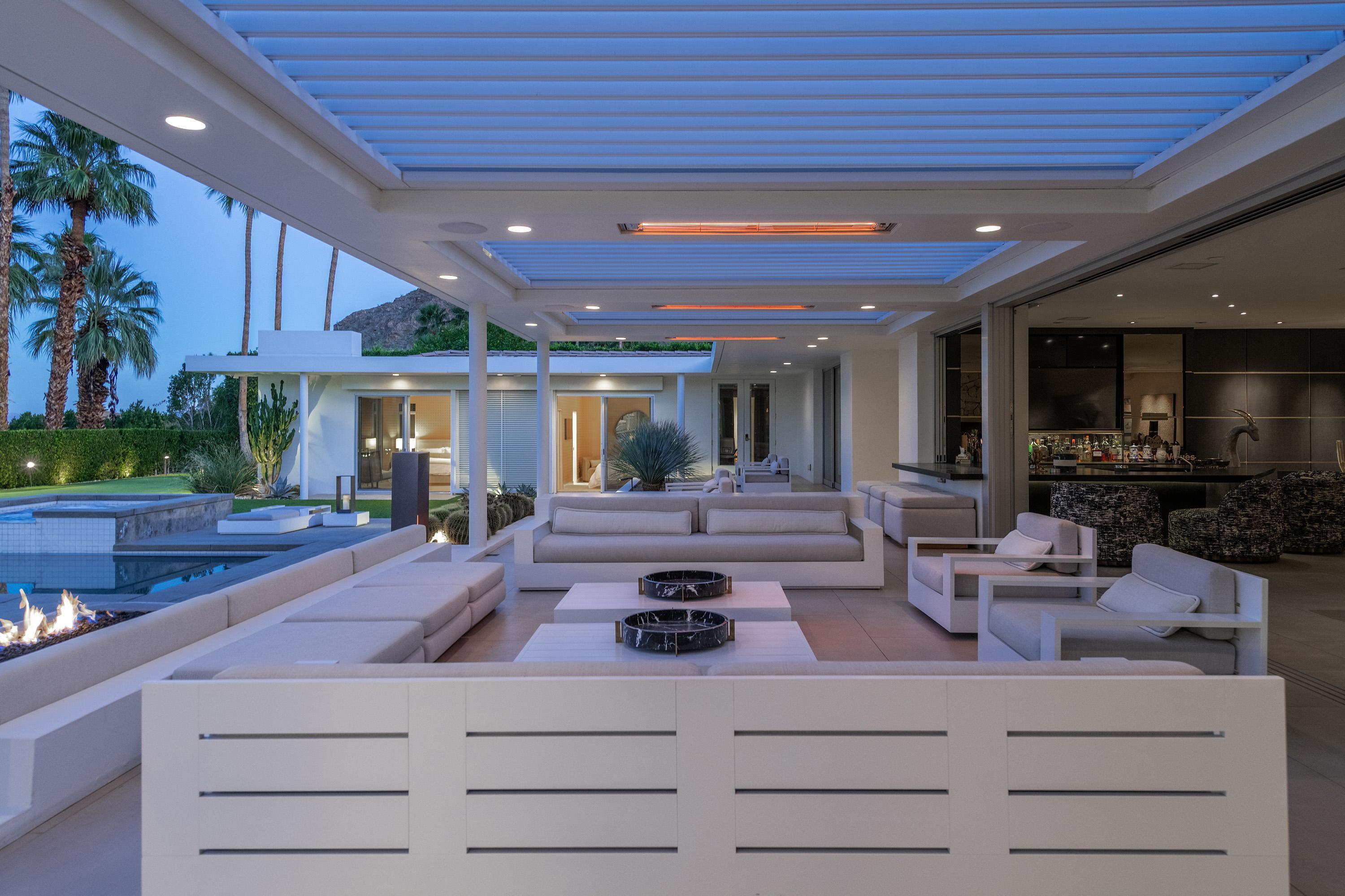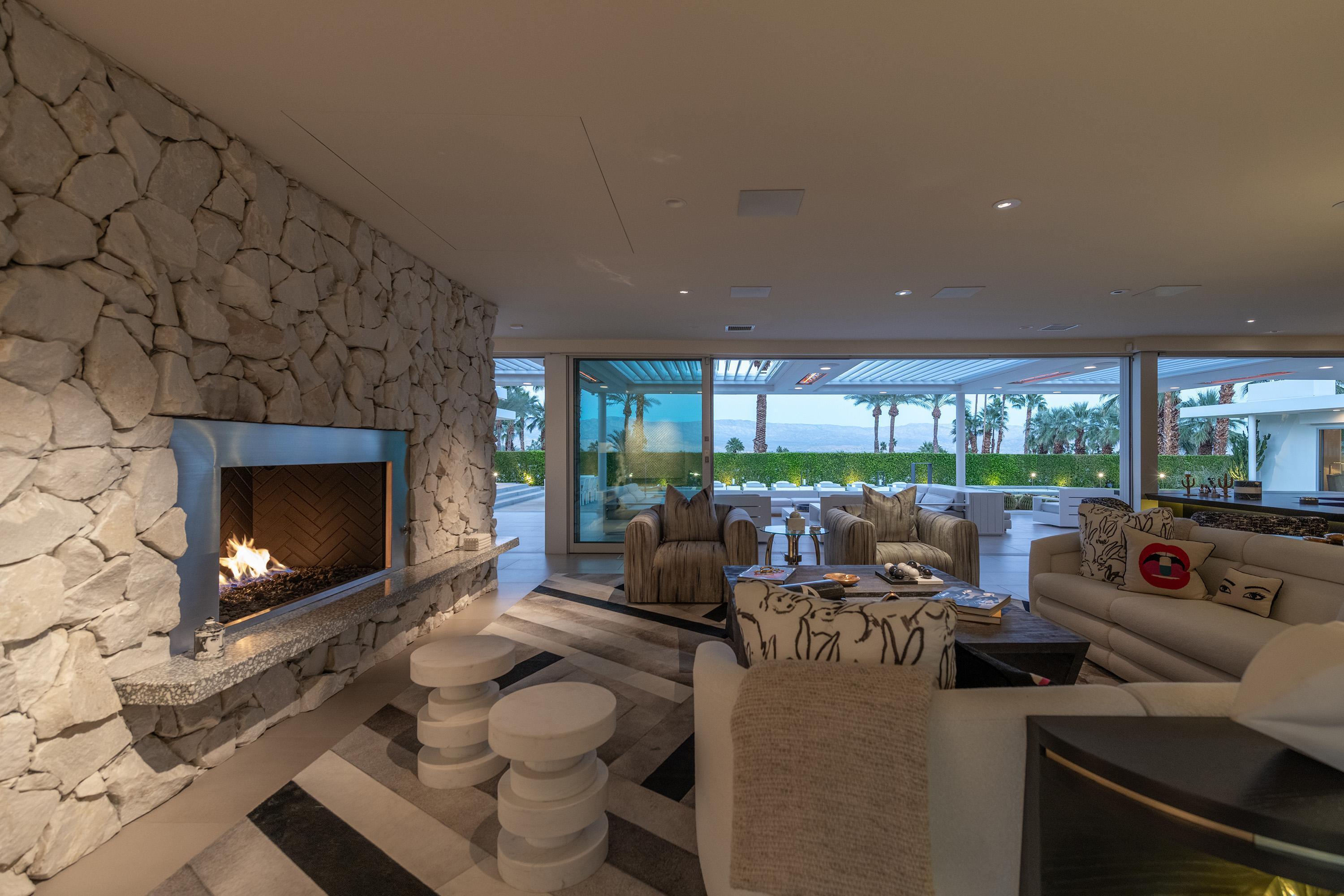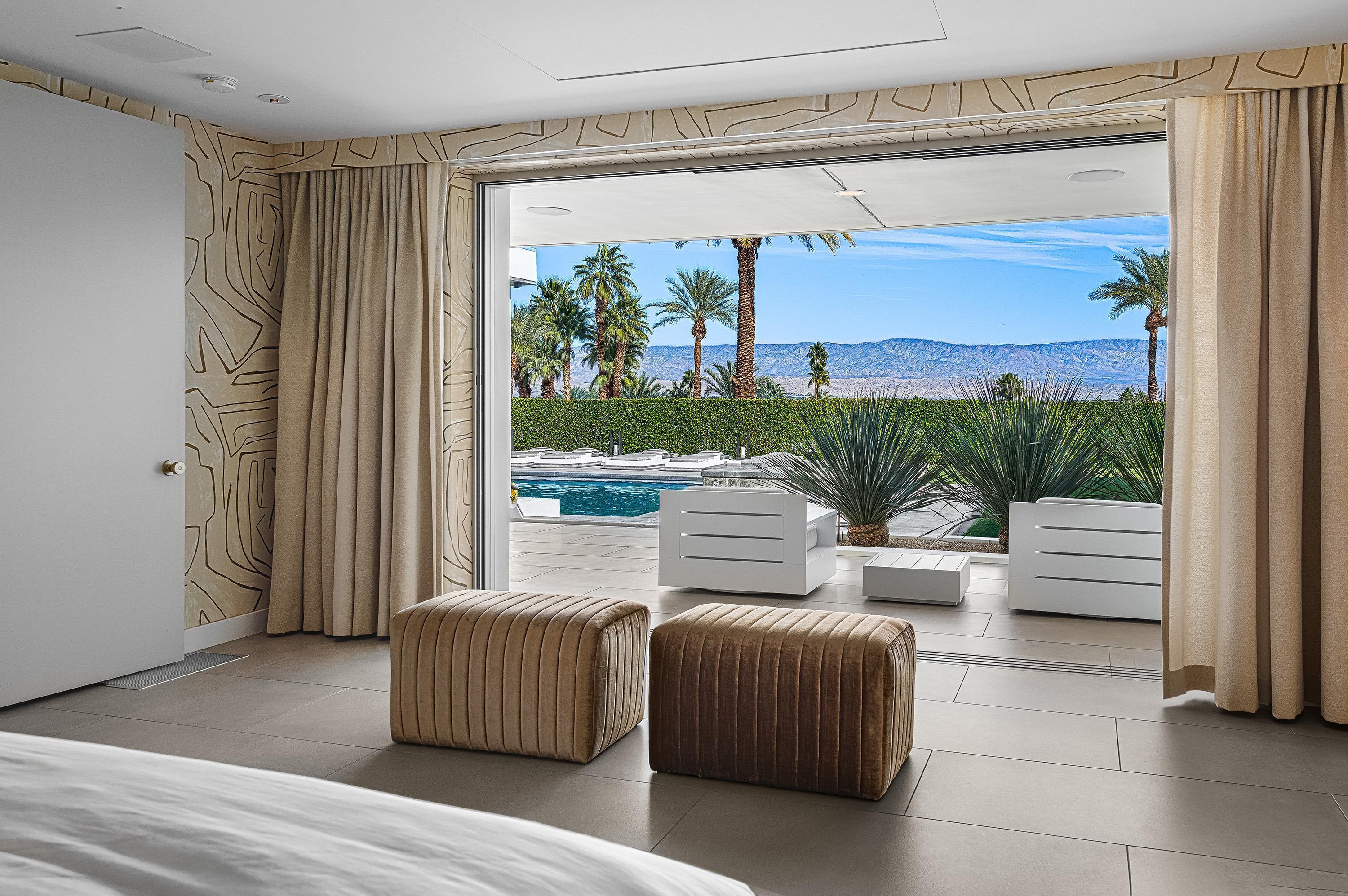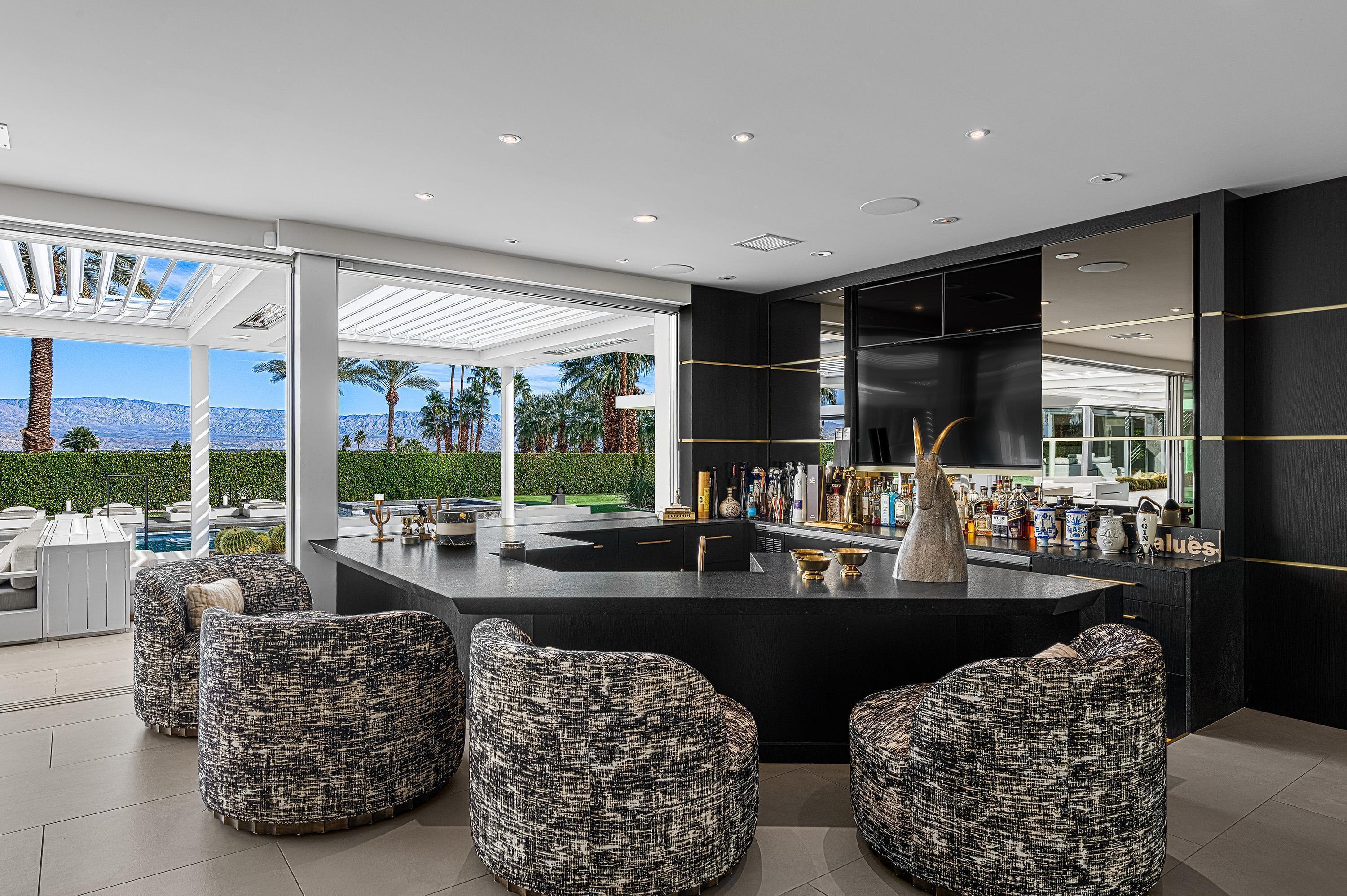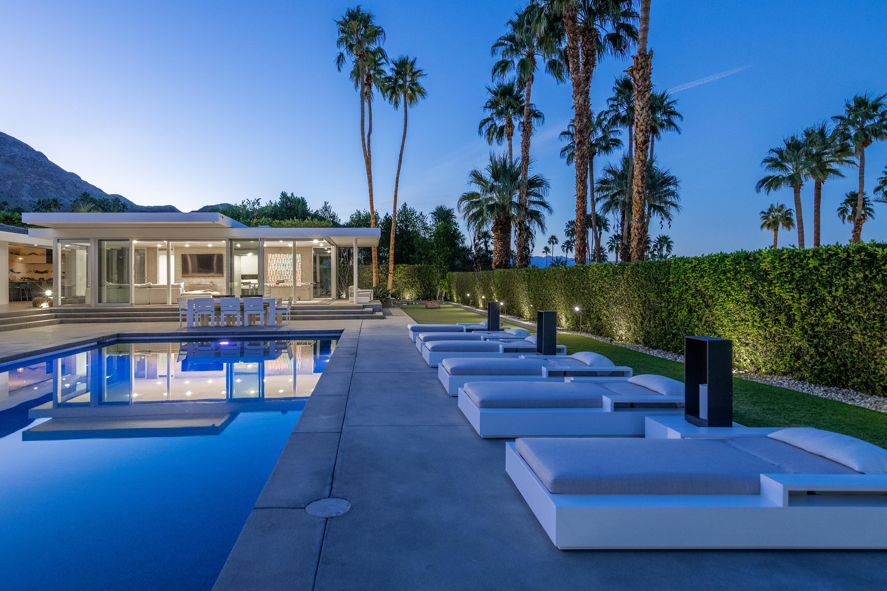 Perched high atop the exclusive Thunderbird Heights enclave, this extraordinary 6-bedroom, 7-bath residence offers 6,148 square feet of luxury living with a seamless blend of California ranch charm and mid-century modern sophistication. From the front, the home showcases its California ranch-style façade, while the rear opens into a private modern oasis—perfectly designed for indoor-outdoor living and entertaining. The home is fully renovated, every detail showcases the finest finishes, state-of-the-art appliances, smart home technology, and curated design. The expansive floor plan features multiple living and dining areas, a chef's kitchen, and generously sized bedrooms, each with an en-suite bath. Fleetwood doors and windows are integrated throughout—many retract fully to disappear into the architecture—blurring the line between indoors and outdoors, framing sweeping views, and flooding the home with natural light. The main living space is ideal for entertainers and sports enthusiasts. Four tastefully integrated televisions create the ultimate setting for game-day gatherings, movie nights, or multi-event viewing—all without compromising the home's elegant design. The property offers multiple outdoor spaces for relaxation and entertaining, including a well-appointed grilling and cooking area discreetly tucked away for seamless hosting. Whether enjoying al fresco dining or quiet moments poolside, the home's outdoor amenities elevate every occasion. Set within the historic Thunderbird Heights community, this property offers golf cart access to the legendary Thunderbird Country Club, while its elevated position provides privacy and panoramic vistas. This is desert luxury at its finest.
