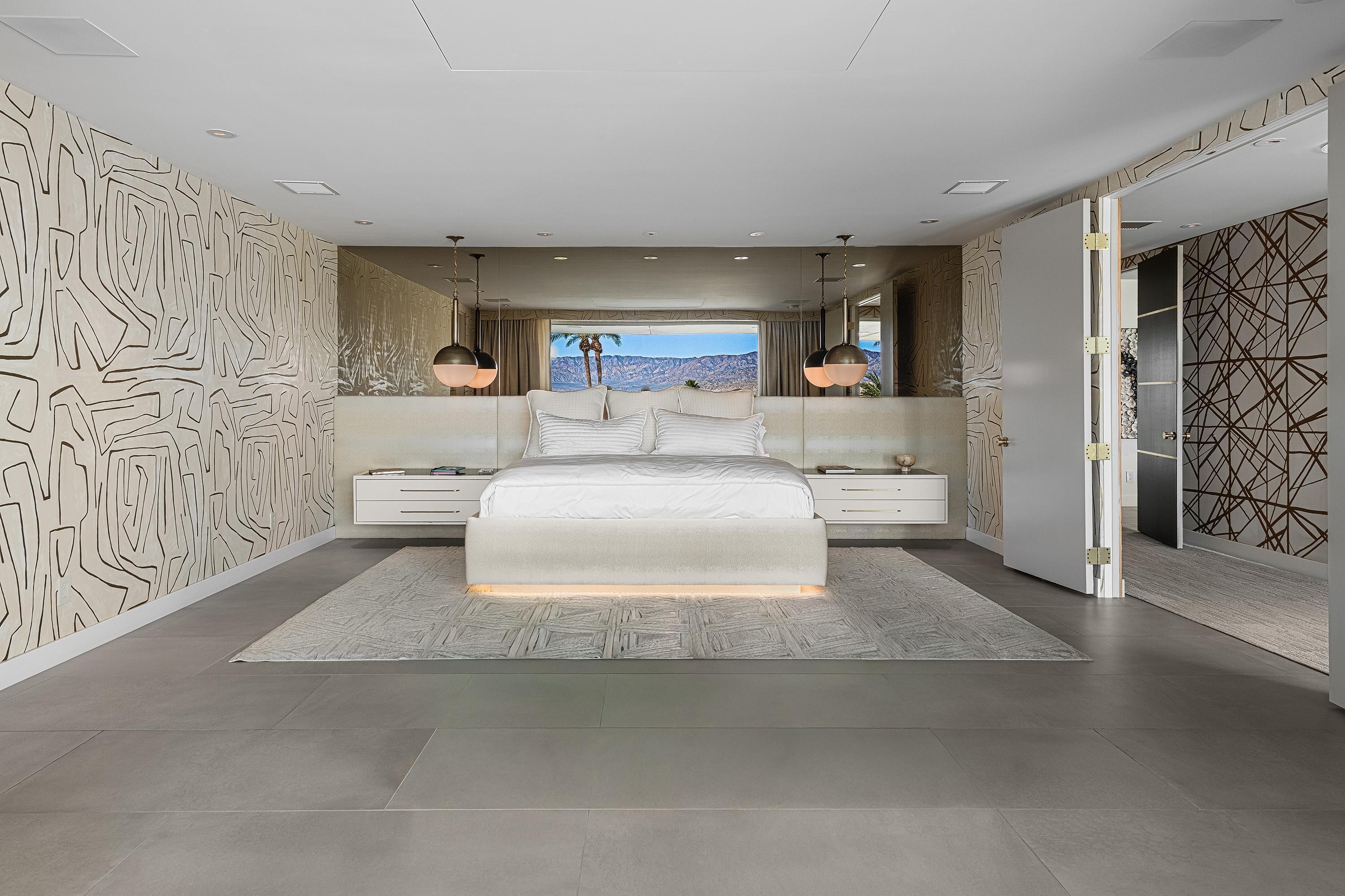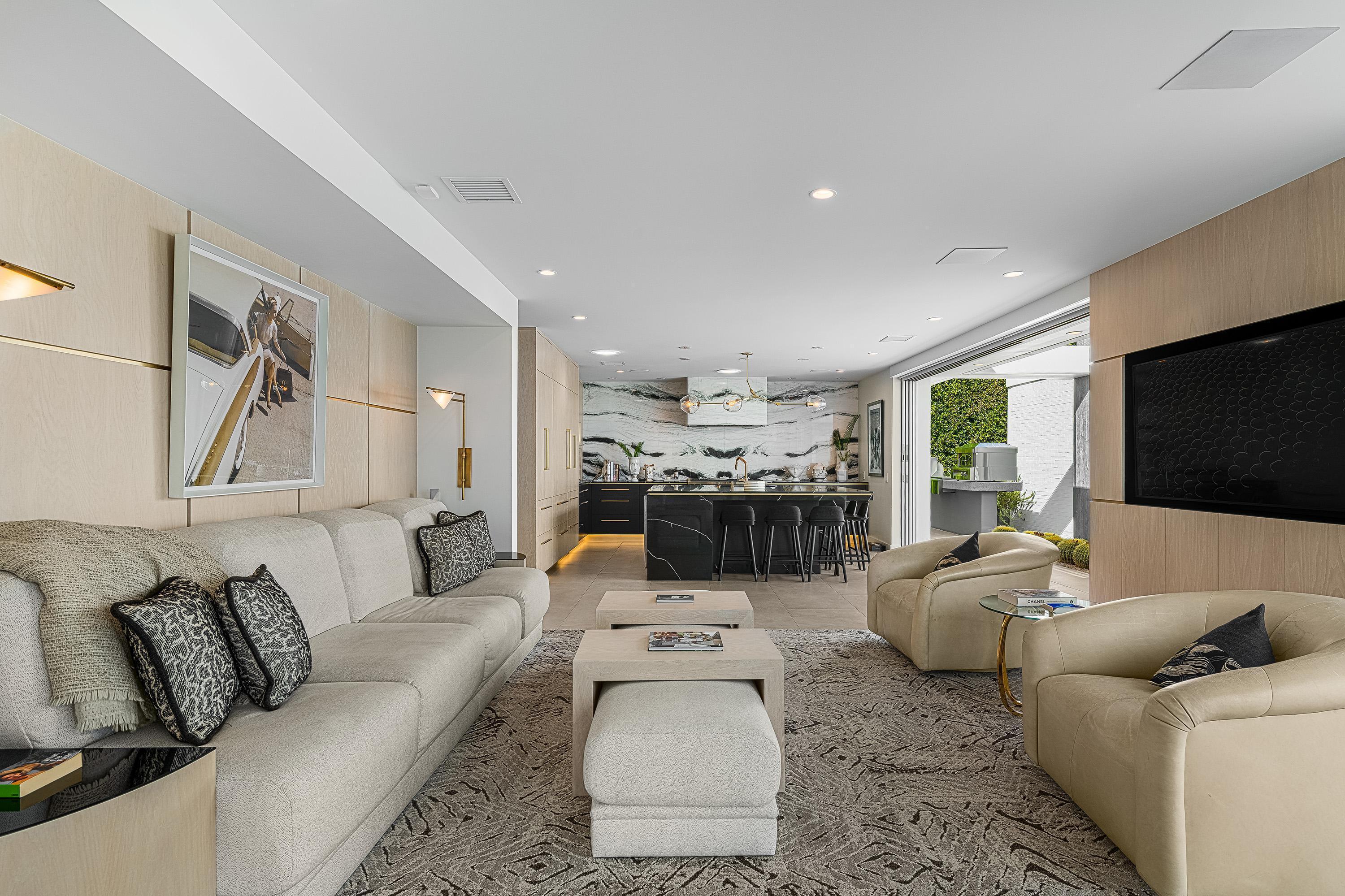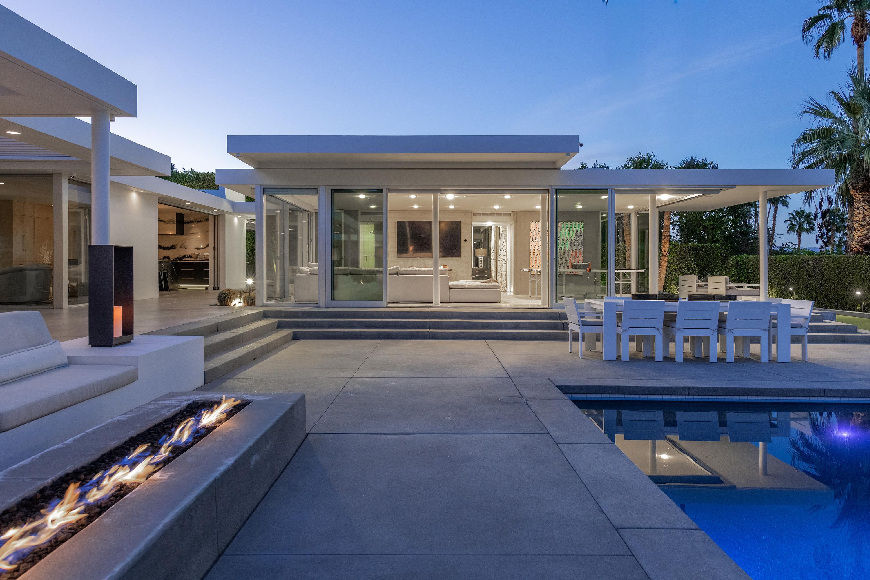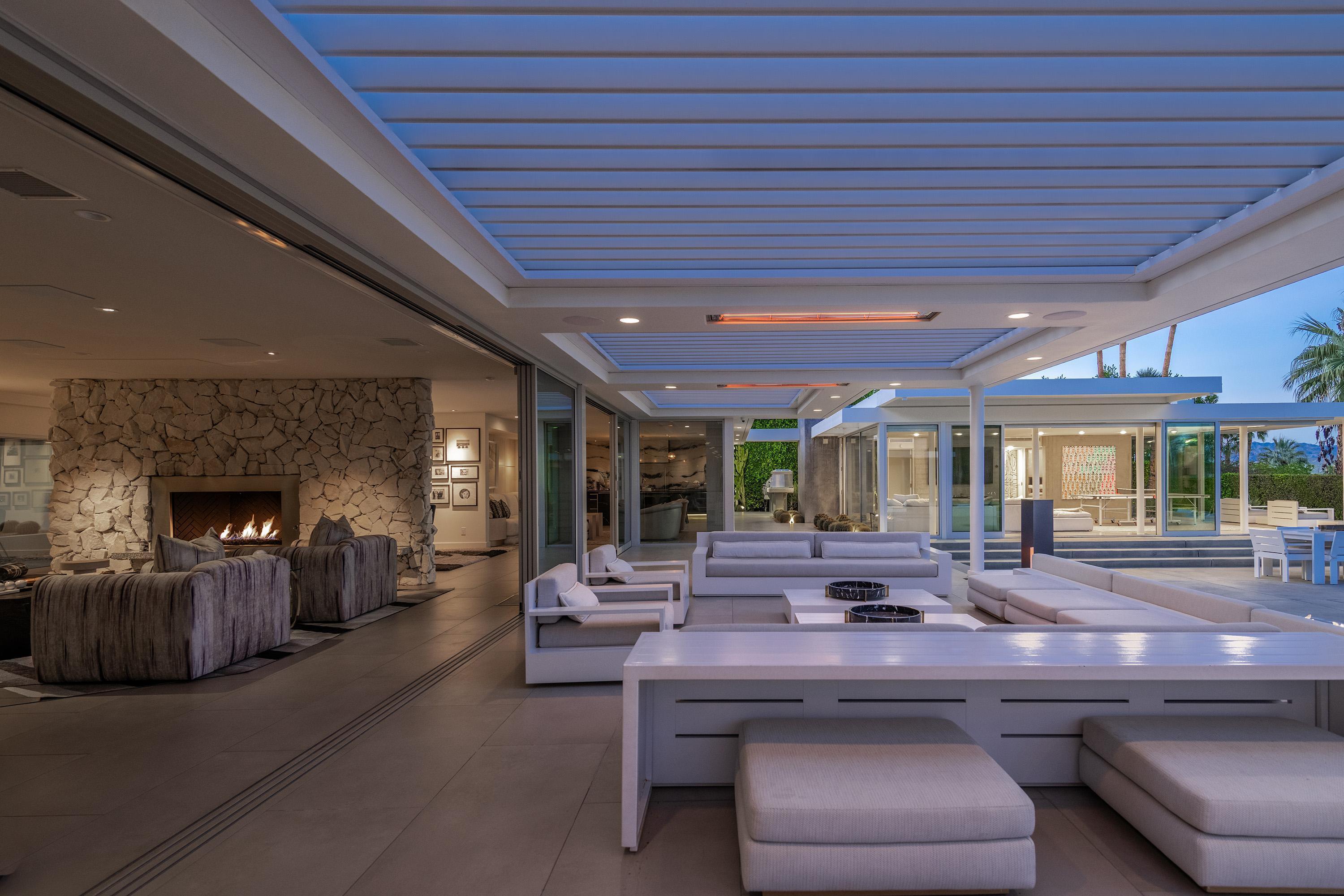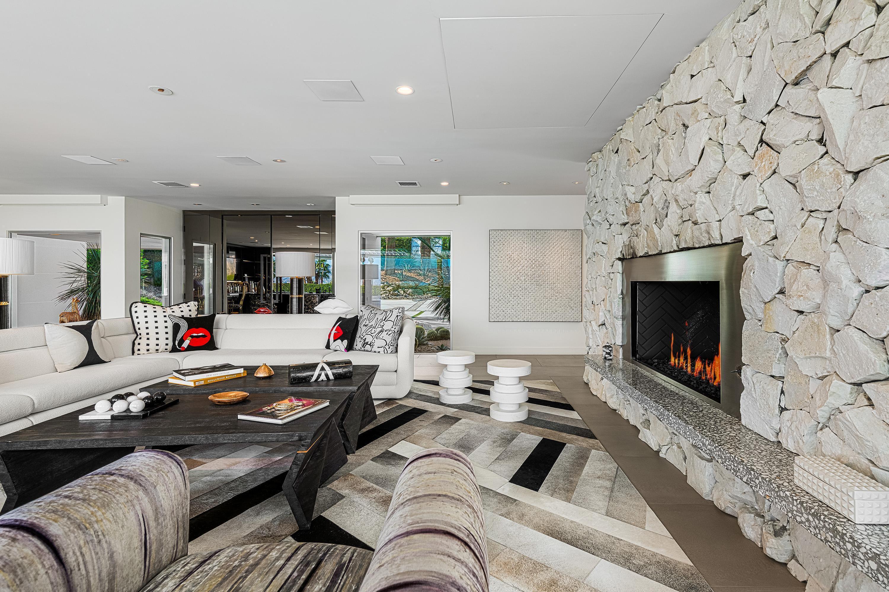 Perched high atop the exclusive Thunderbird Heights enclave, this extraordinary 6-bedroom, 7-bath residence offers 6,148 square feet of luxury living with a seamless blend of California ranch charm and mid-century modern sophistication. From the front, the home showcases its California ranch-style façade, while the rear opens into a private modern oasis—perfectly designed for indoor-outdoor living and entertaining. The home is fully renovated, every detail showcases the finest finishes, state-of-the-art appliances, smart home technology, and curated design. The expansive floor plan features multiple living and dining areas, a chef's kitchen, and generously sized bedrooms, each with an en-suite bath. Fleetwood doors and windows are integrated throughout—many retract fully to disappear into the architecture—blurring the line between indoors and outdoors, framing sweeping views, and flooding the home with natural light. The main living space is ideal for entertainers and sports enthusiasts. Four tastefully integrated televisions create the ultimate setting for game-day gatherings, movie nights, or multi-event viewing—all without compromising the home's elegant design. The property offers multiple outdoor spaces for relaxation and entertaining, including a well-appointed grilling and cooking area discreetly tucked away for seamless hosting. Whether enjoying al fresco dining or quiet moments poolside, the home's outdoor amenities elevate every occasion. Set within the historic Thunderbird Heights community, this property offers golf cart access to the legendary Thunderbird Country Club, while its elevated position provides privacy and panoramic vistas. This is desert luxury at its finest.